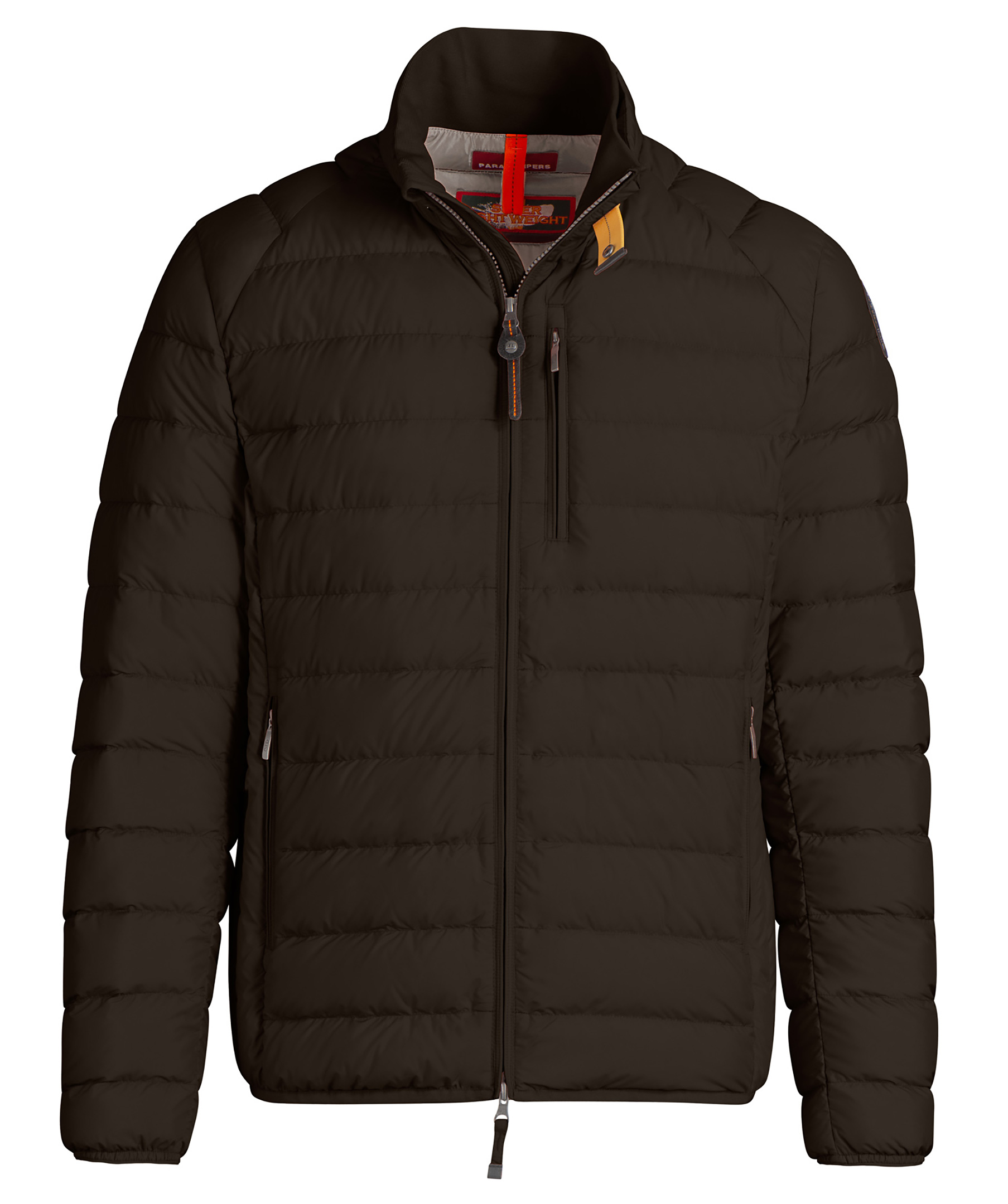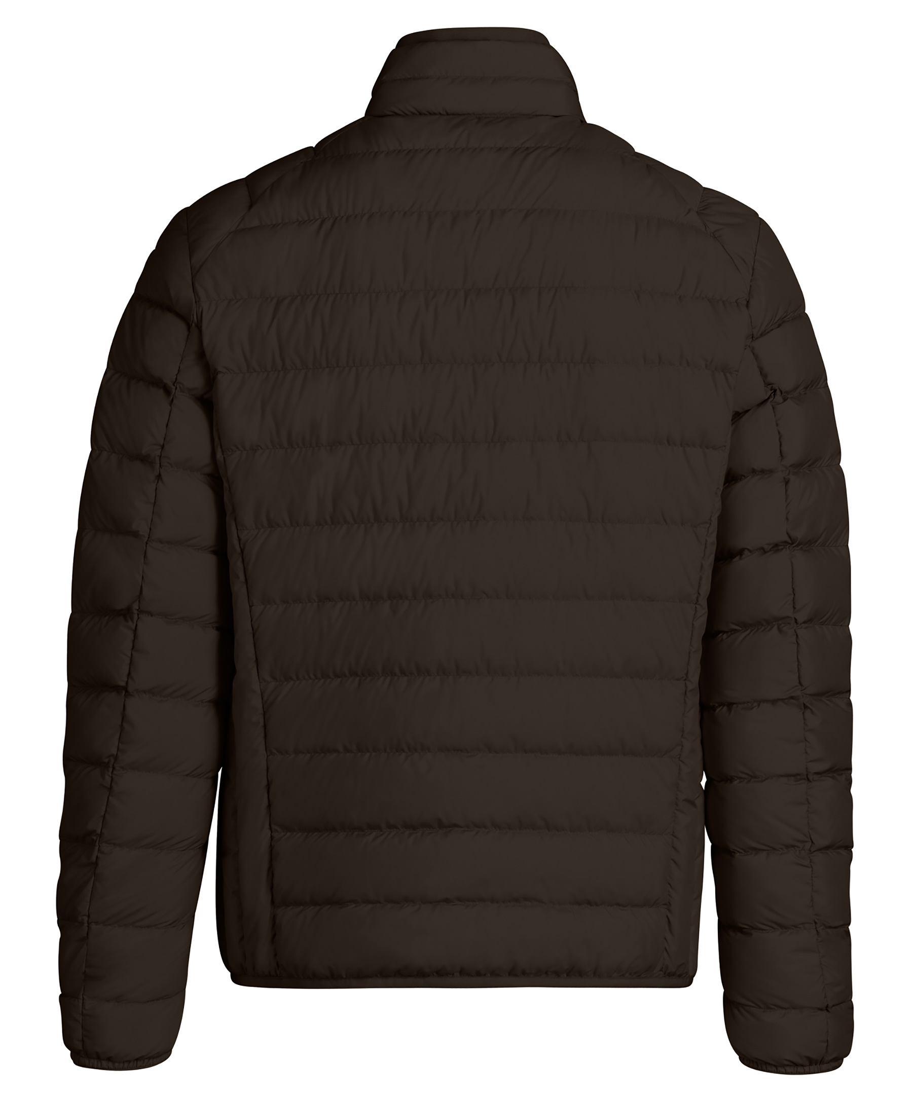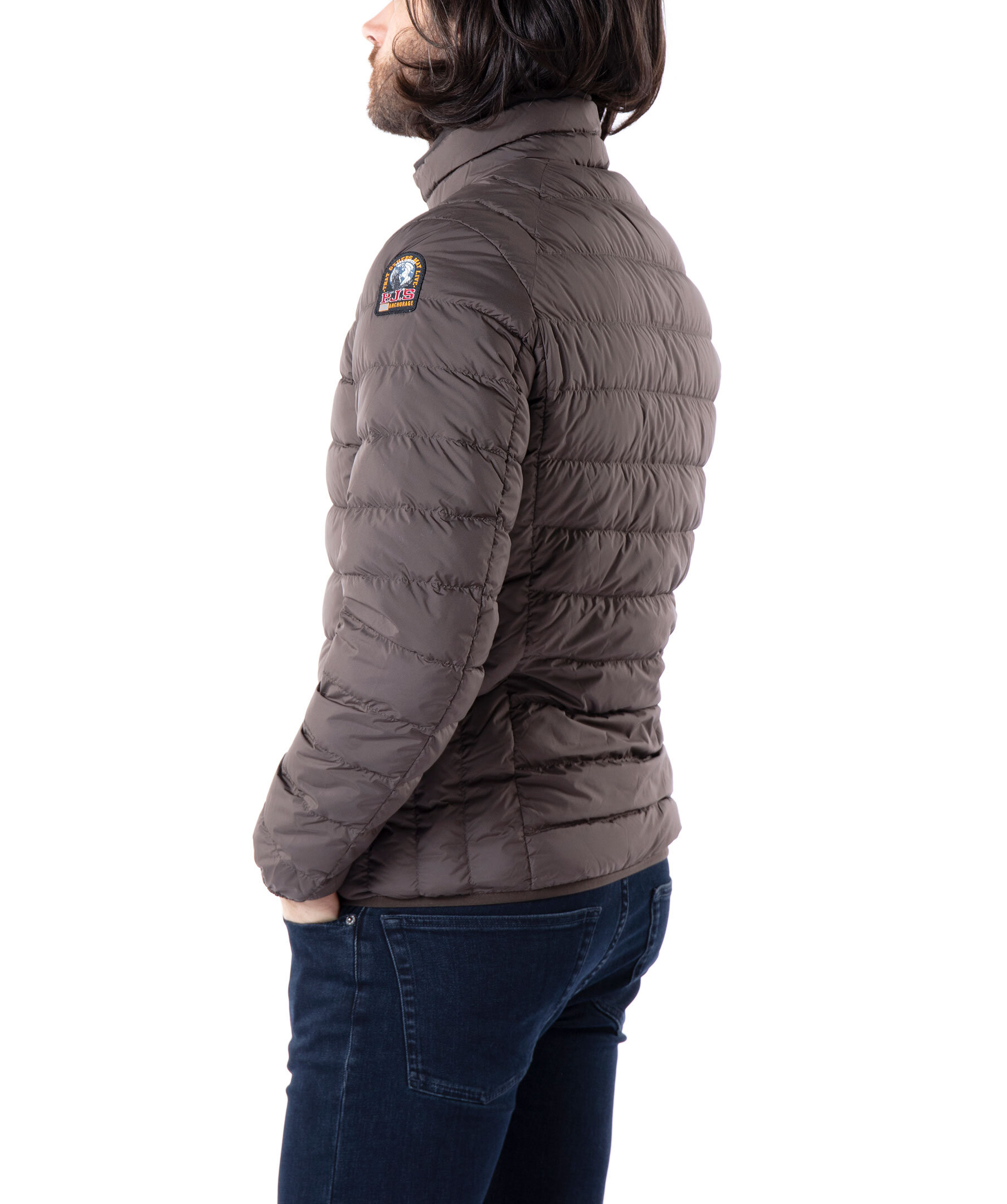 Brun lättviktsdunjacka från Parajumpers. Kort modell med en hög krage. Broderad logotyp på vänstra ärmens axel. Två fickor nedtill och en ficka upptill vid bröstet. Både jackan och fickorna stängs med dragkedja. Modellen är 185cm lång och har på sig storlek M.