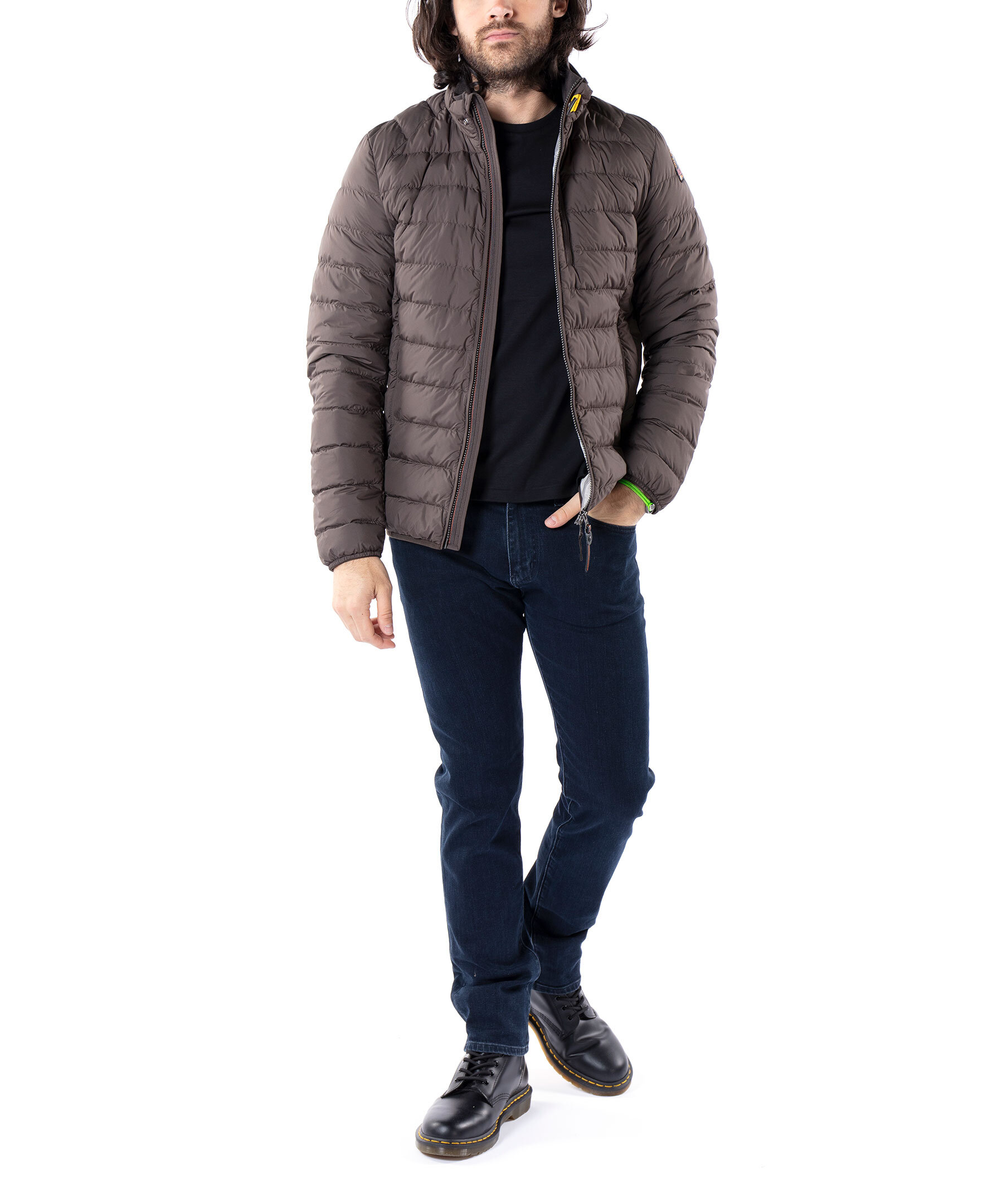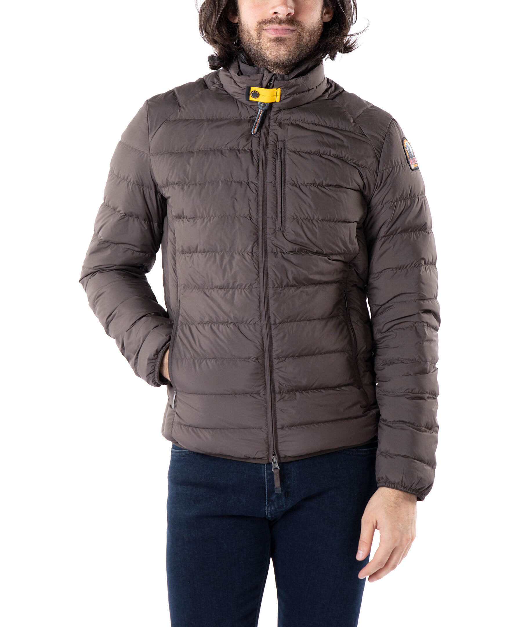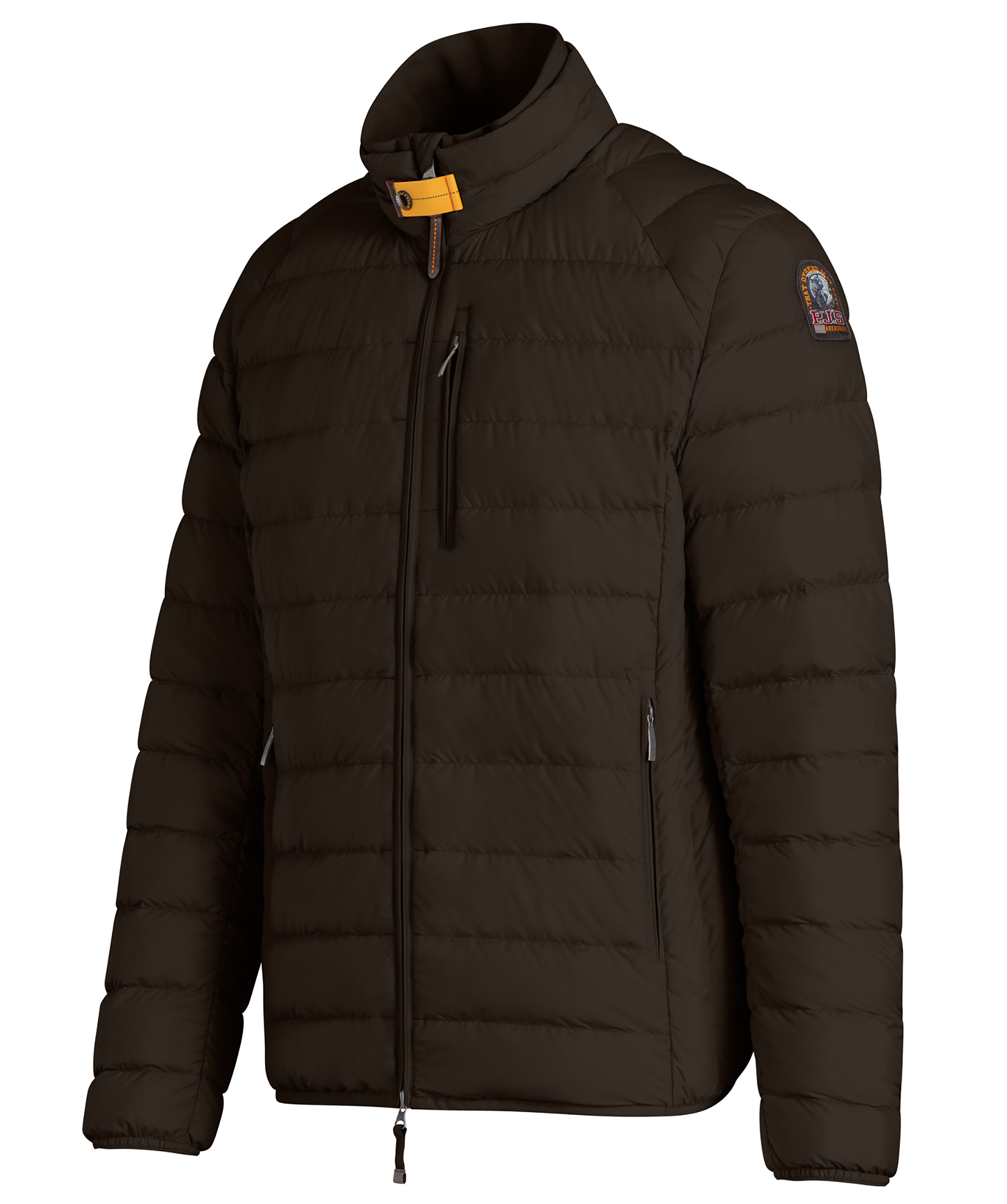 Brun lättviktsdunjacka från Parajumpers. Kort modell med en hög krage. Broderad logotyp på vänstra ärmens axel. Två fickor nedtill och en ficka upptill vid bröstet. Både jackan och fickorna stängs med dragkedja. Modellen är 185cm lång och har på sig storlek M.