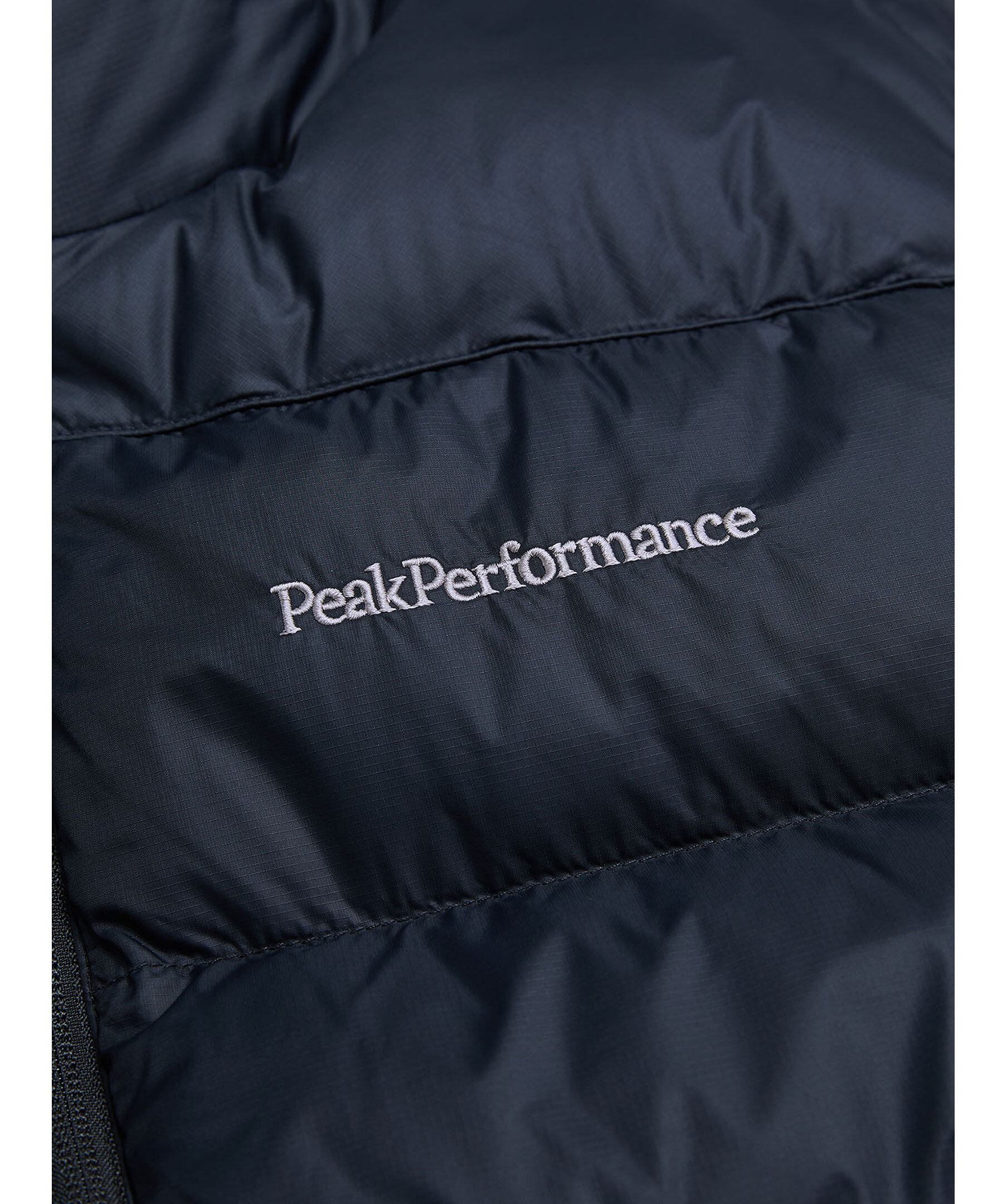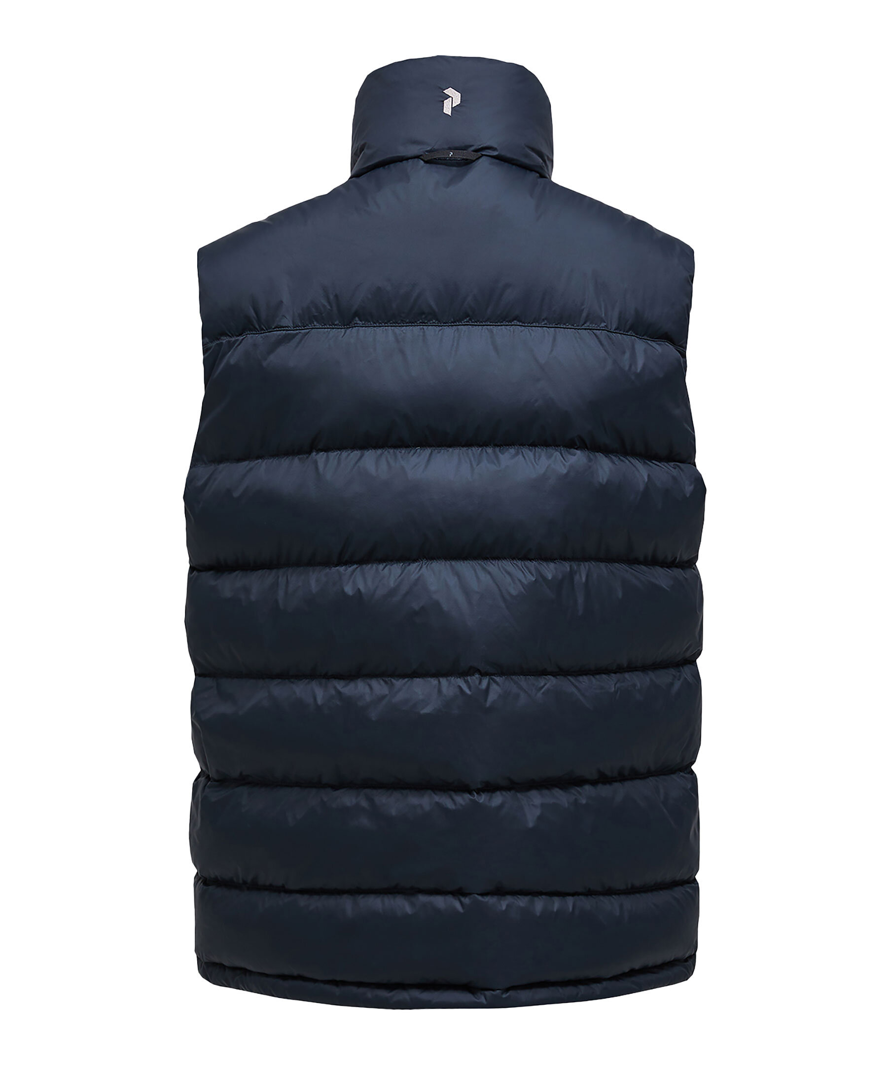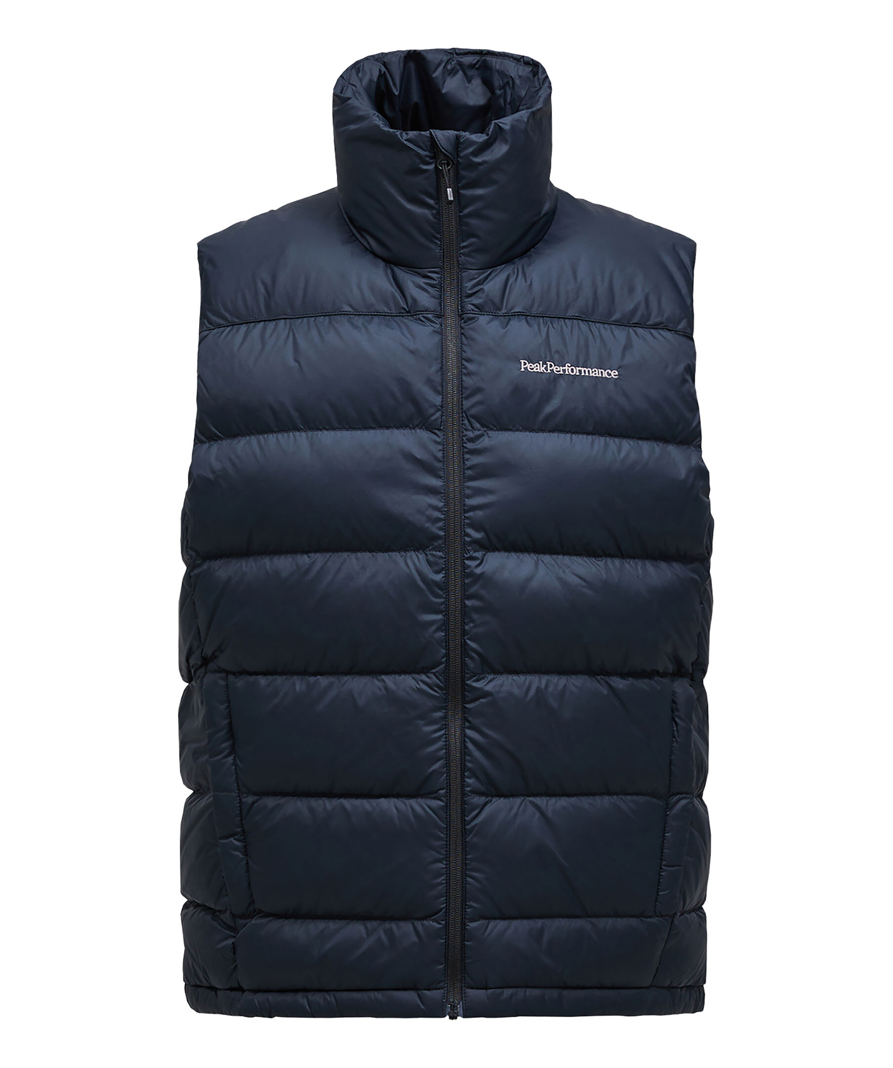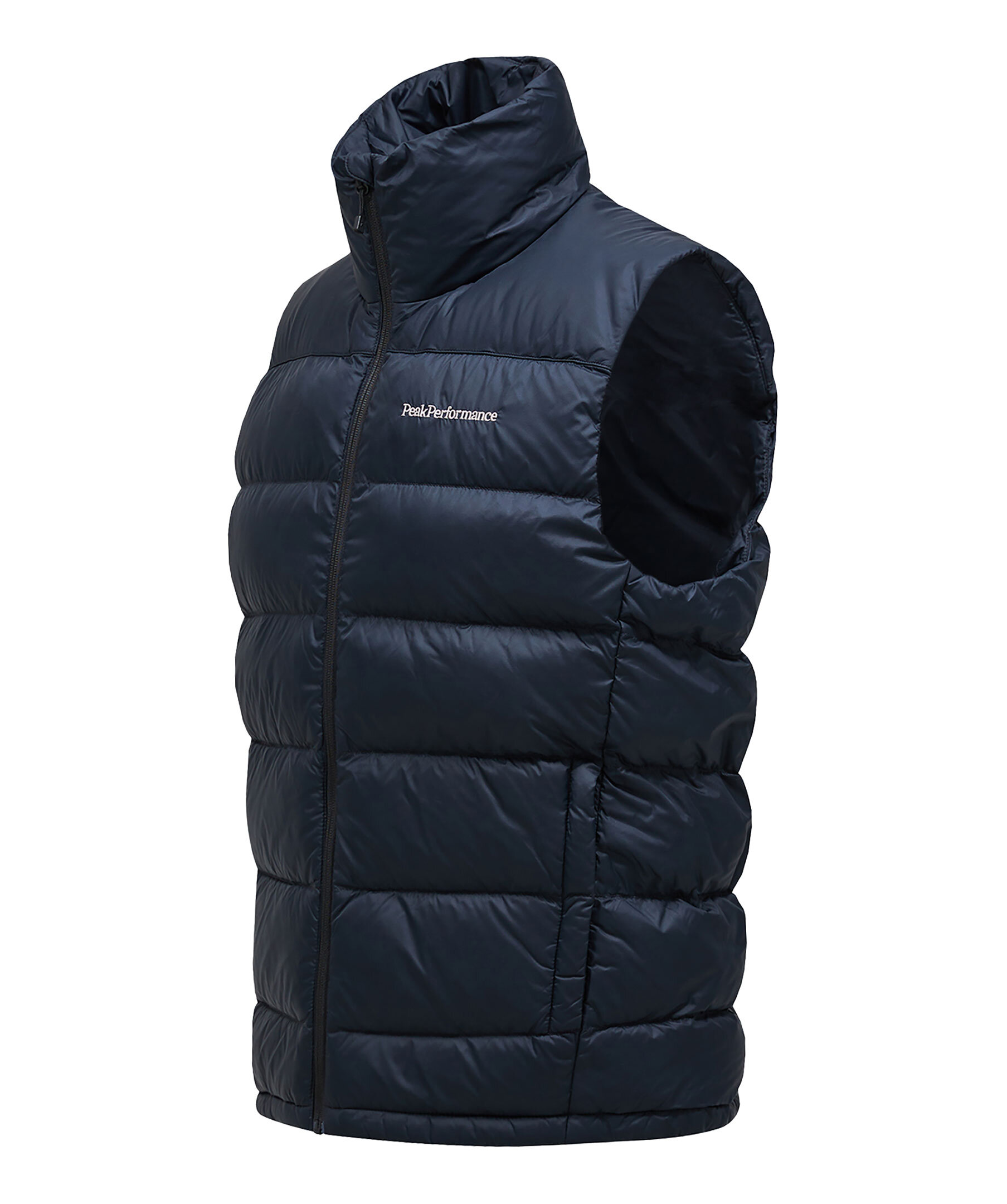 Blåsvart dunväst i en modern puffer-silhuett kombinerar värme och mjukhet med lätt vikt. Den är tillverkad av återvunnen polyamid och är fylld med förstklassigt 90/10 ankdun/fjädrar för exceptionell värme.