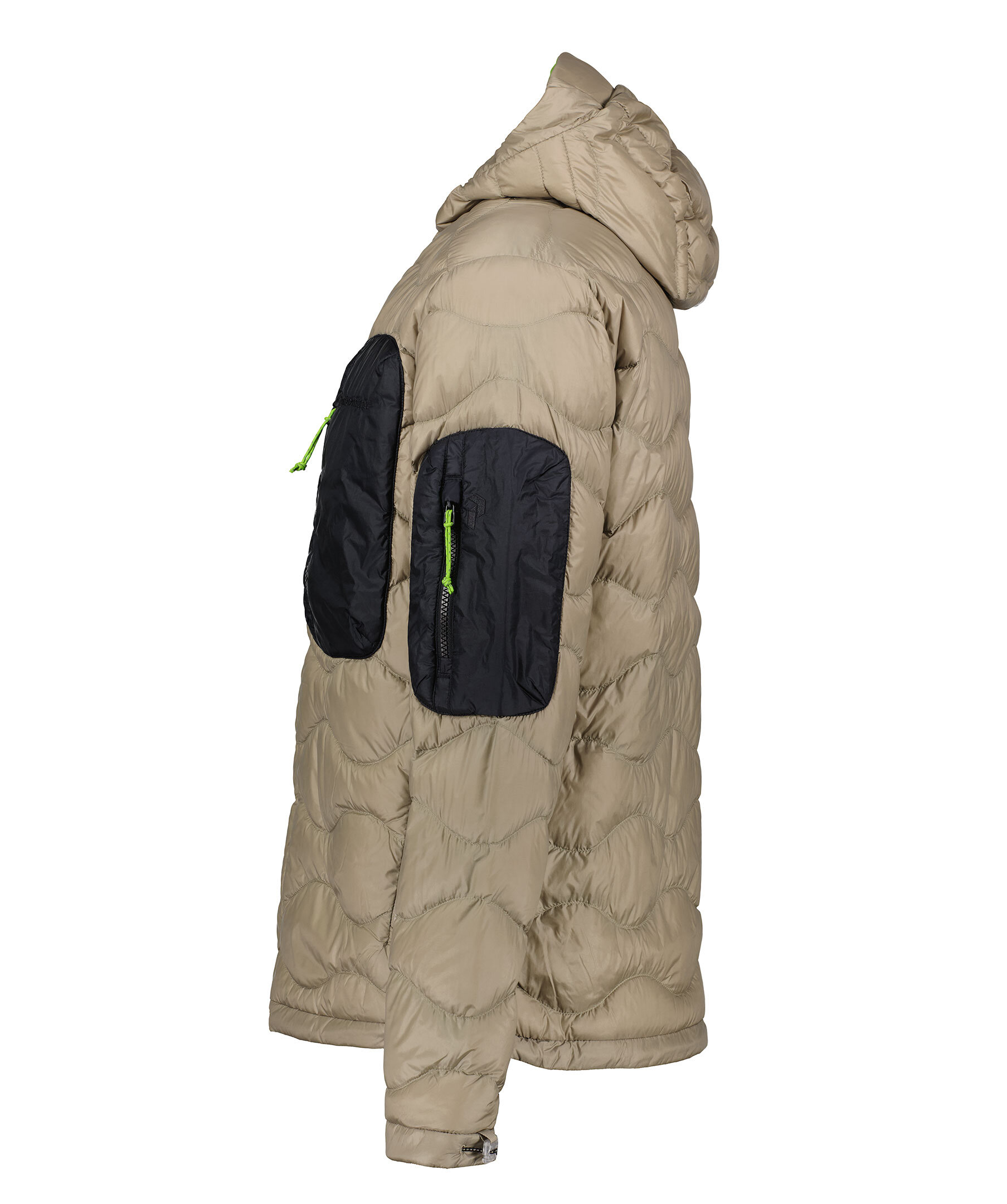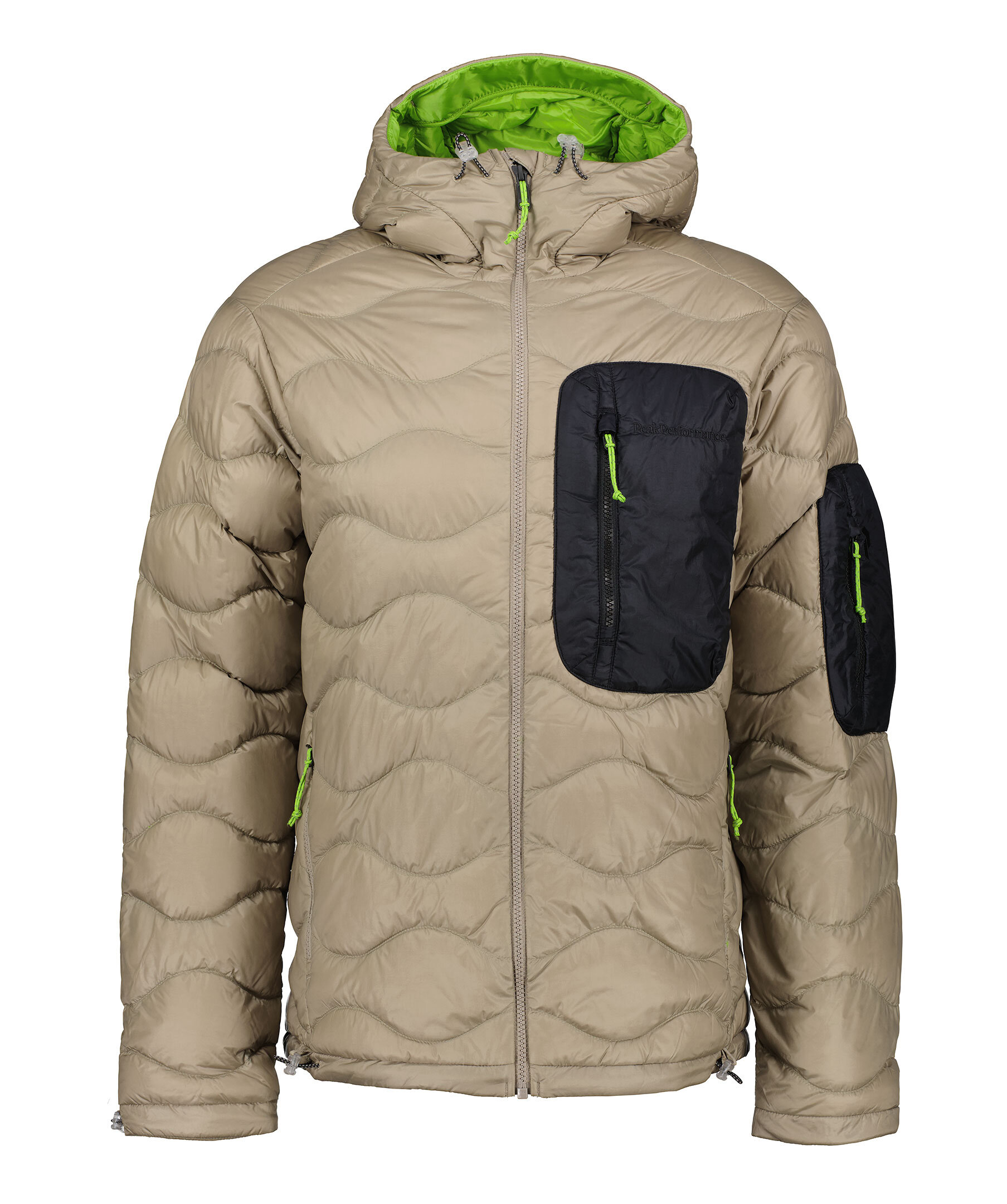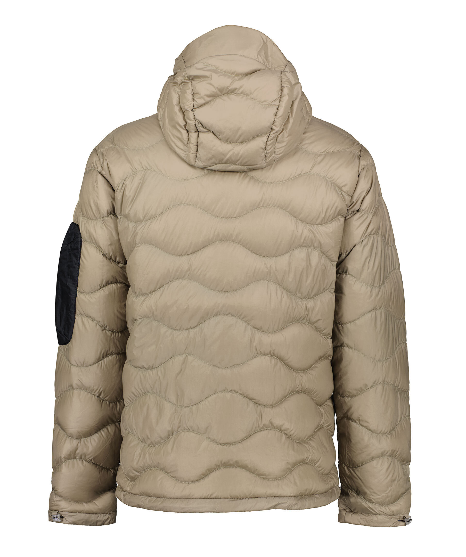 Beige jacka med huva från Peak Performance ikoniska Helium-serie med det ikoniska Helium-mönstret. Jackan har två sidfickor, en bröstficka samt en ficka på ärmen, alla med dragkedja. Justerbart ärmslut och nederkant med dragsko. Grön insida. Peak Performance-brodyr på bröstet samt P-logotyp brodyr på ärmen. Ett vind- och vattenavvisande skal tillsammans med högkvalitativ 90/10-dunvaddering gör den perfekt för alla friluftsäventyr. Använd den som ett ytterlager eller under en skaljacka för extra värme.