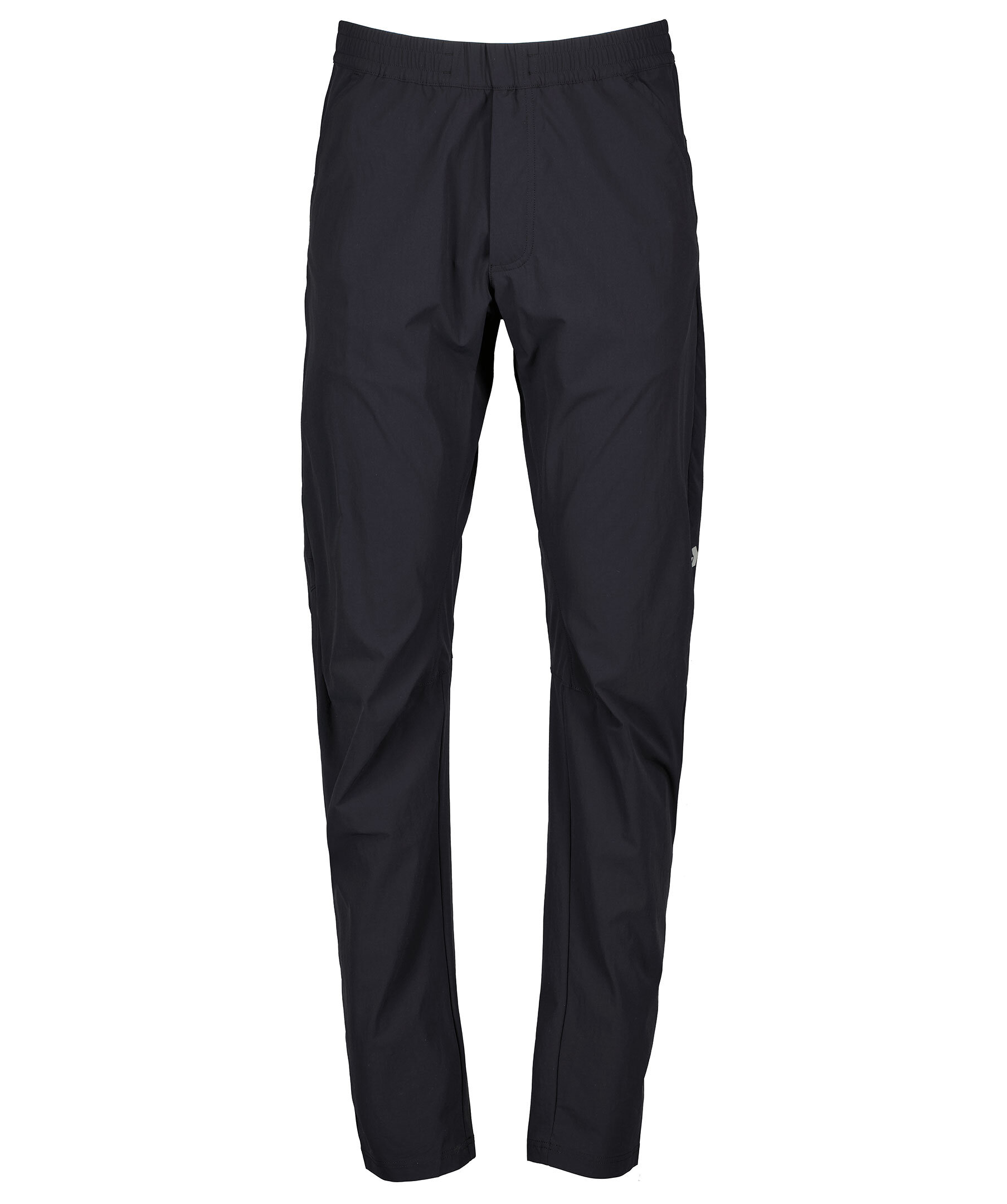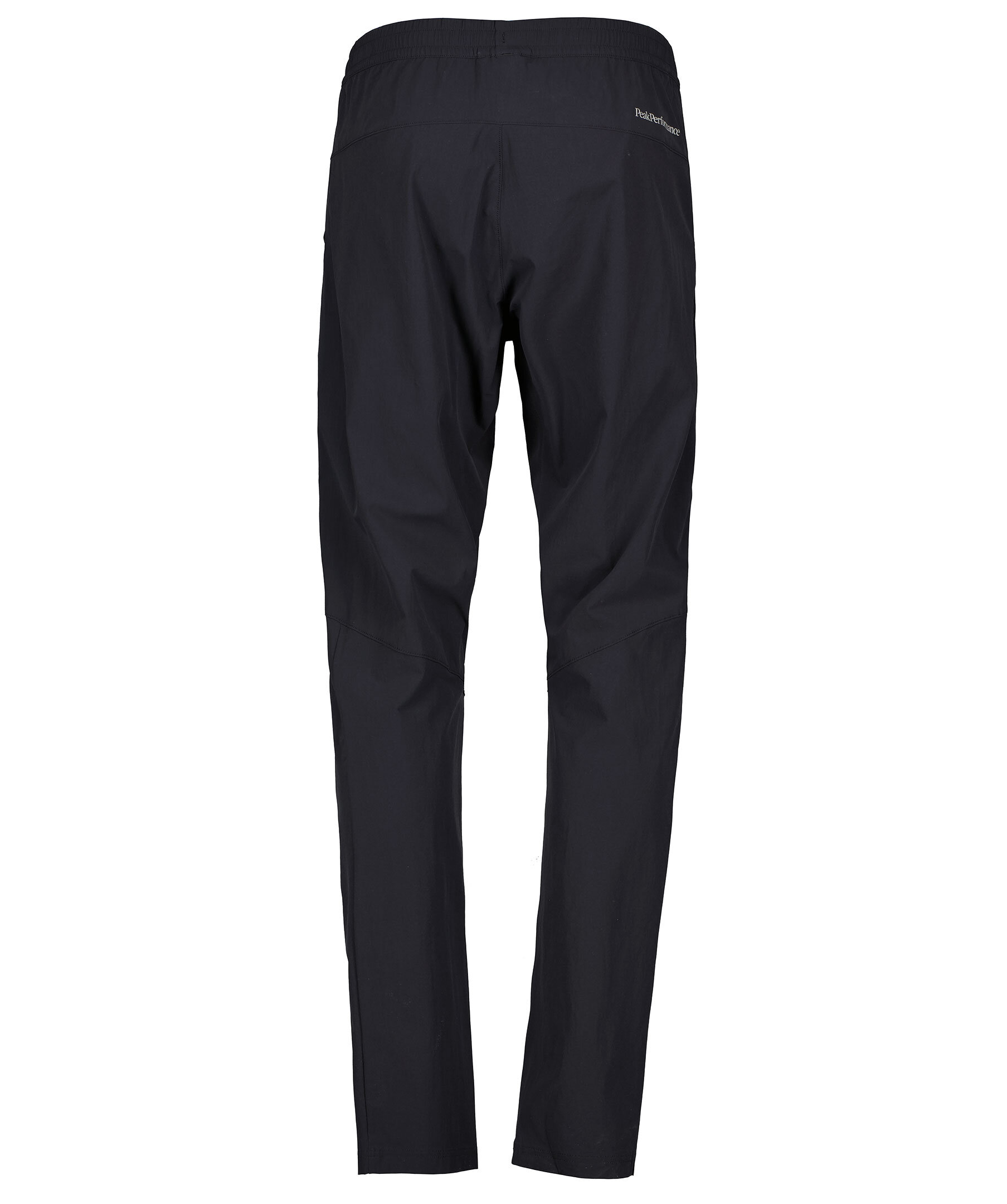 Svarta funktionsbyxor från Peak Performance. Fickor i sidorna, mudd i midjan med snörning som knyts på insidan och logotyp tryckt vid midjan bak på höger sida samt på vänster ben fram. Tillverkade i stretchig polyamid som skyddar mot regn och vind.