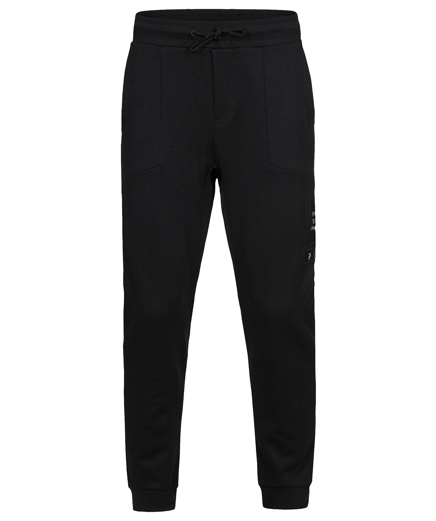 Svarta mjukisbyxor från Peak Performance. Tillverkade i bomullsmix. Dragsko i midjan, två snedställda fickor fram, en bakficka, logotyp på vänster byxben.
