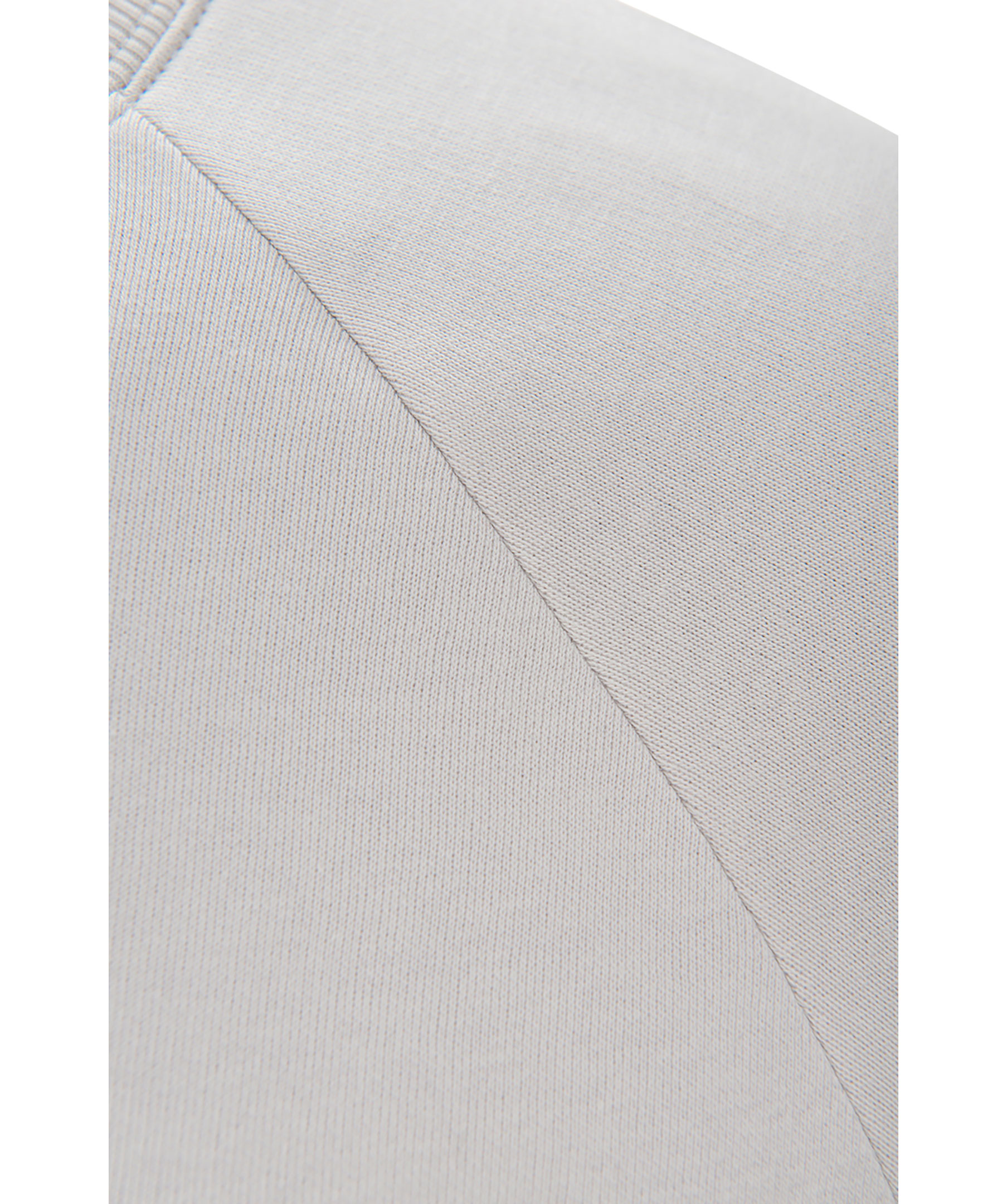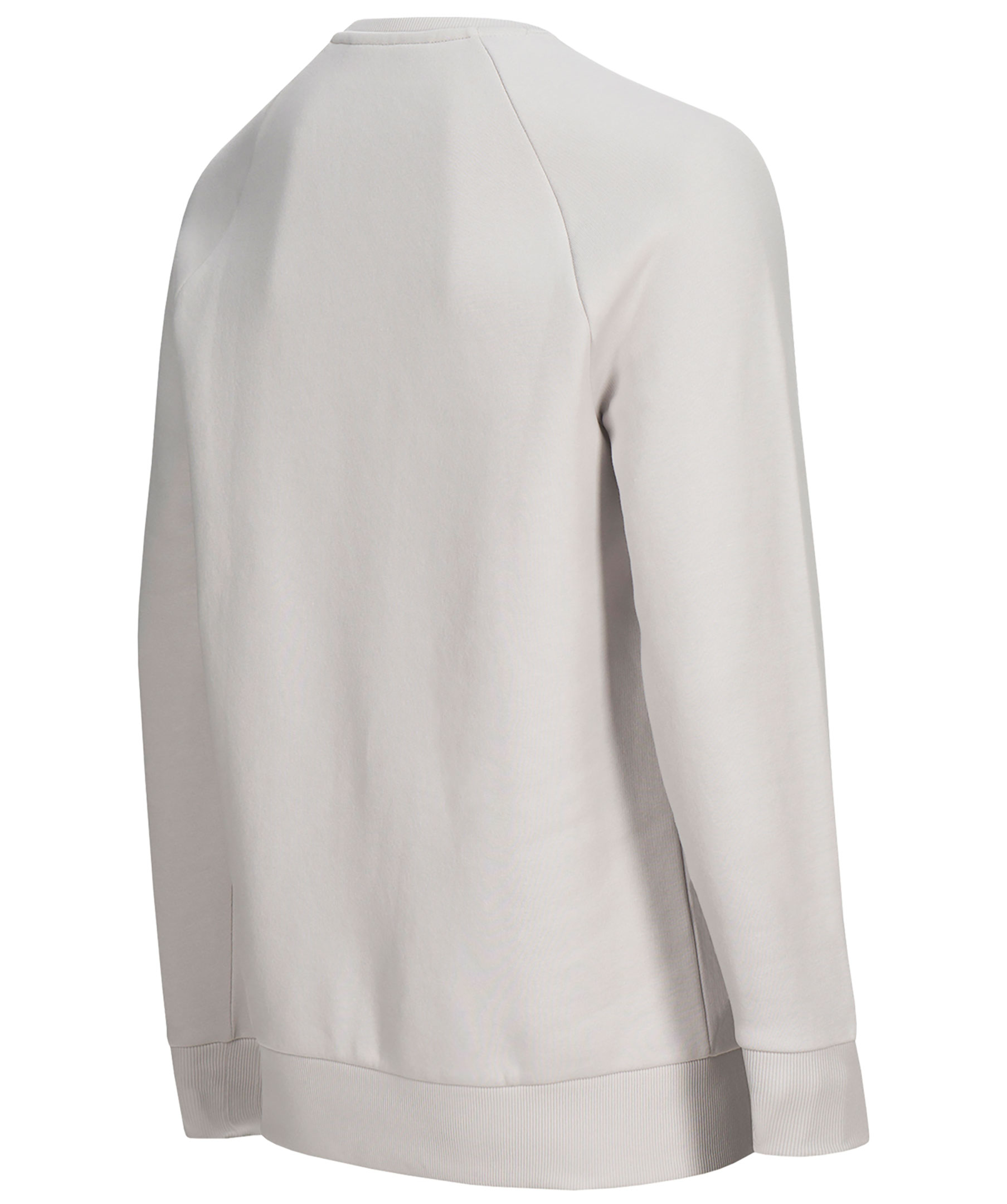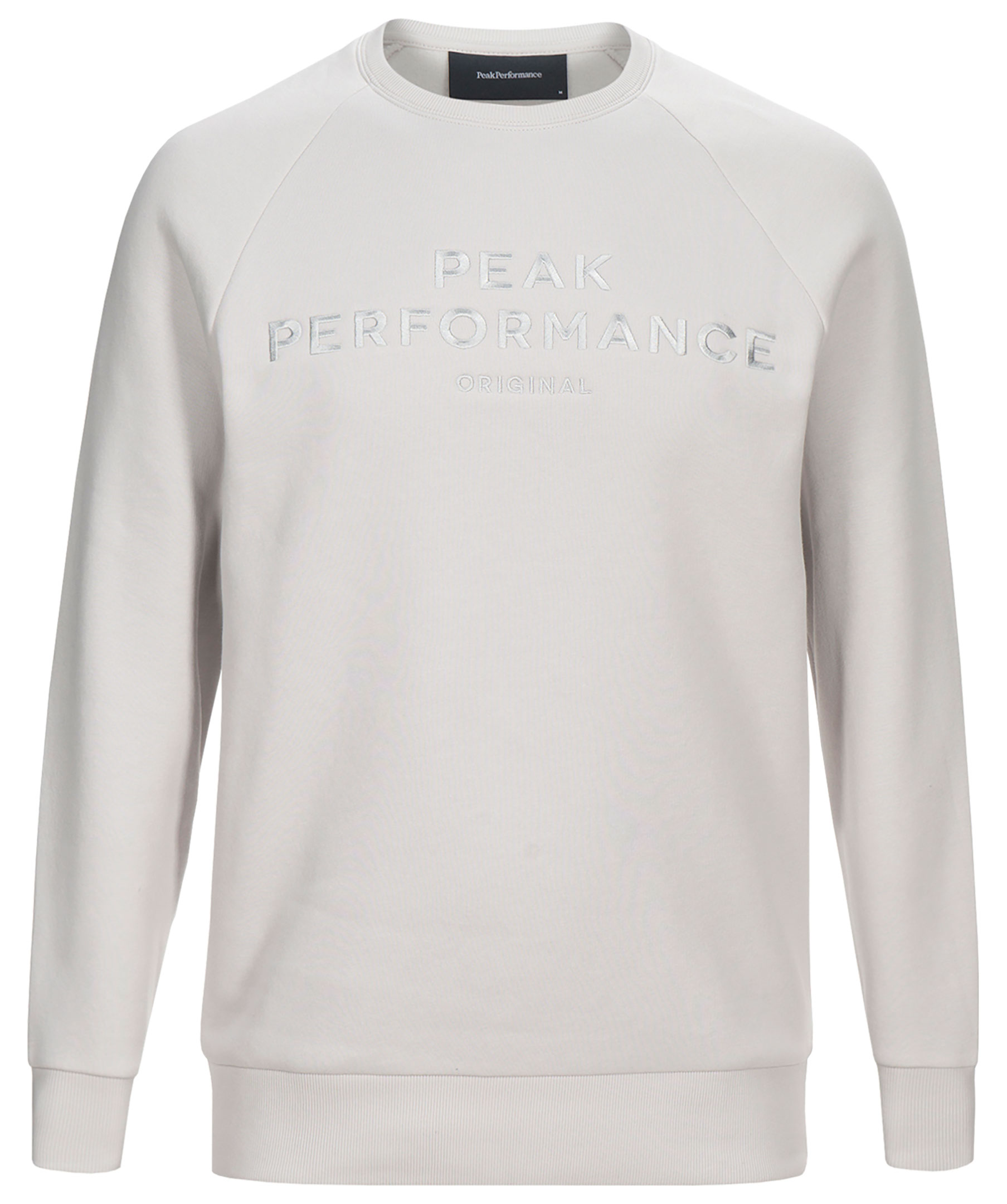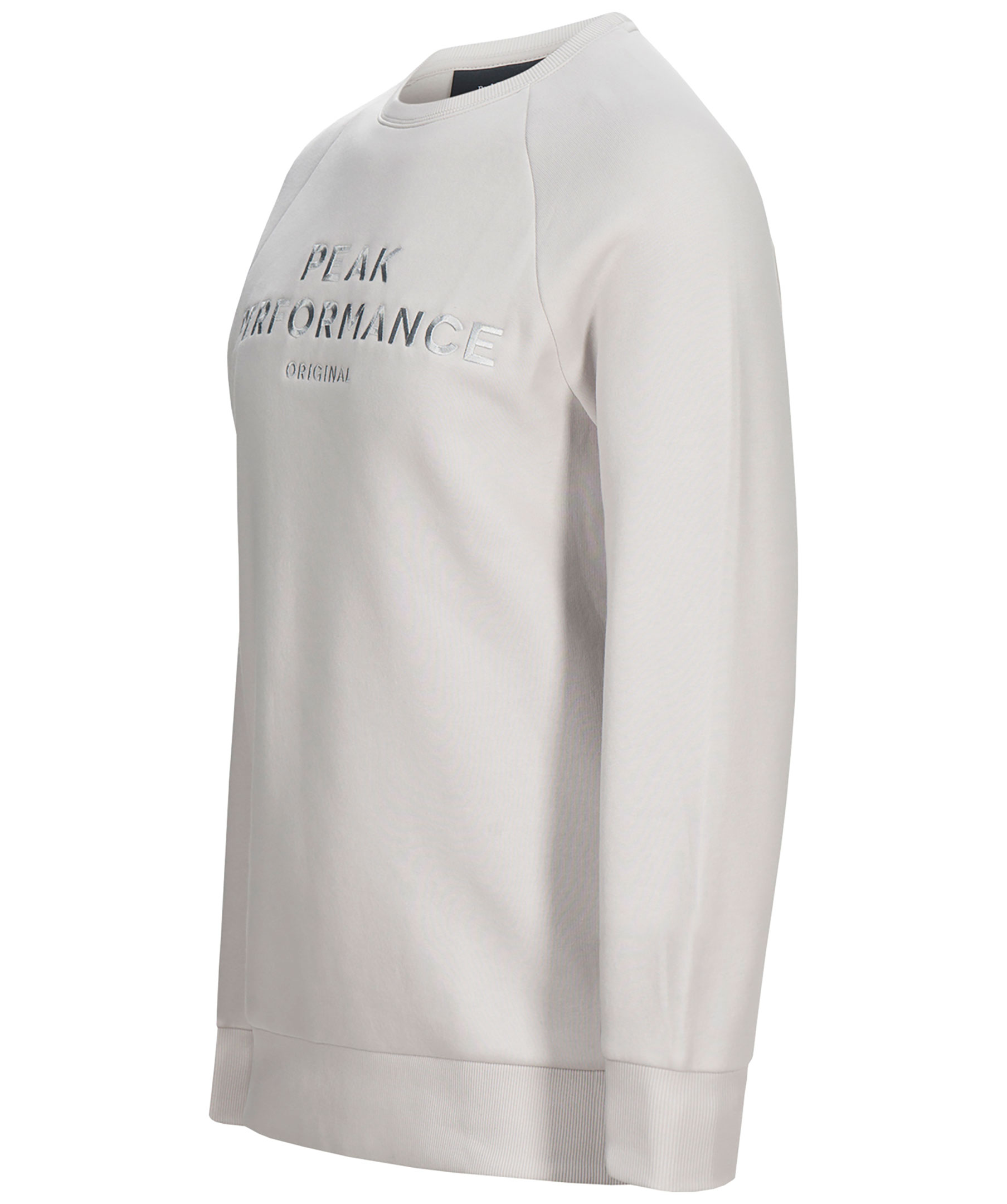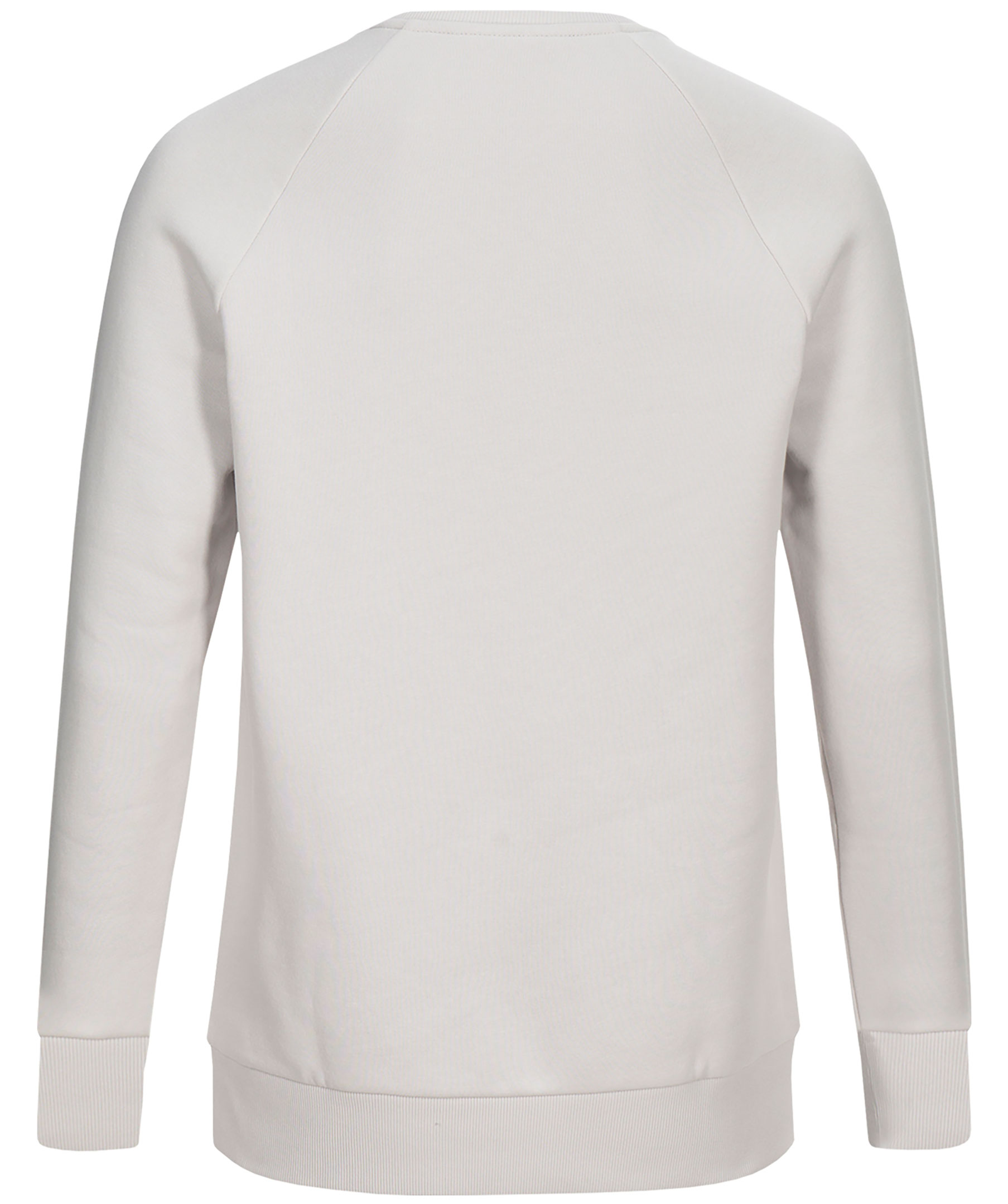 Grå/beige tröja från svenska Peak Performance med broderad logotext på bröstet. Ribbstickad mudd vid ärmslut, nederkant och halsringning.