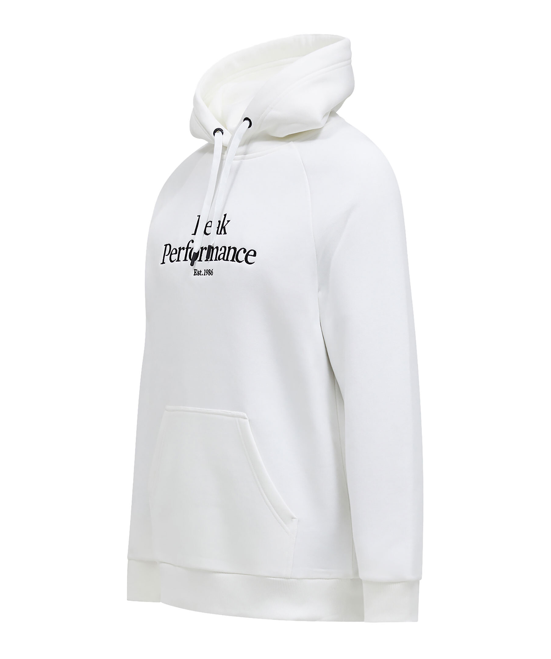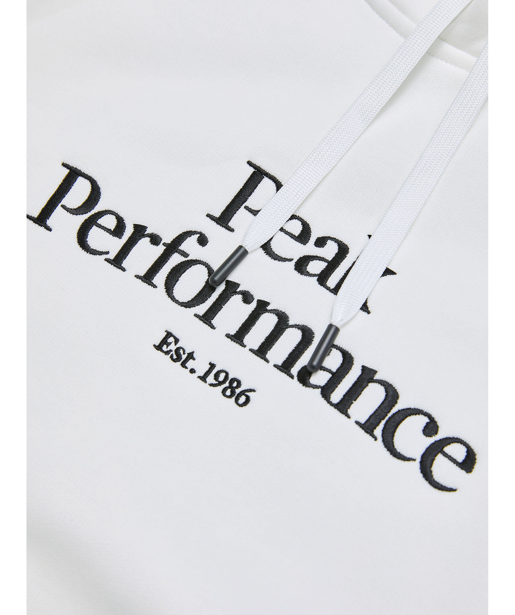 Vit hoodie med huva från Peak Performance. Svart broderad logotyp på bröstet. Känguruficka på magen. Snörning i huvan. Ribbade muddar vid ärm- och plaggslut. Tilvlerkad i en bomull- och polyesterblandning. Normal passform.
