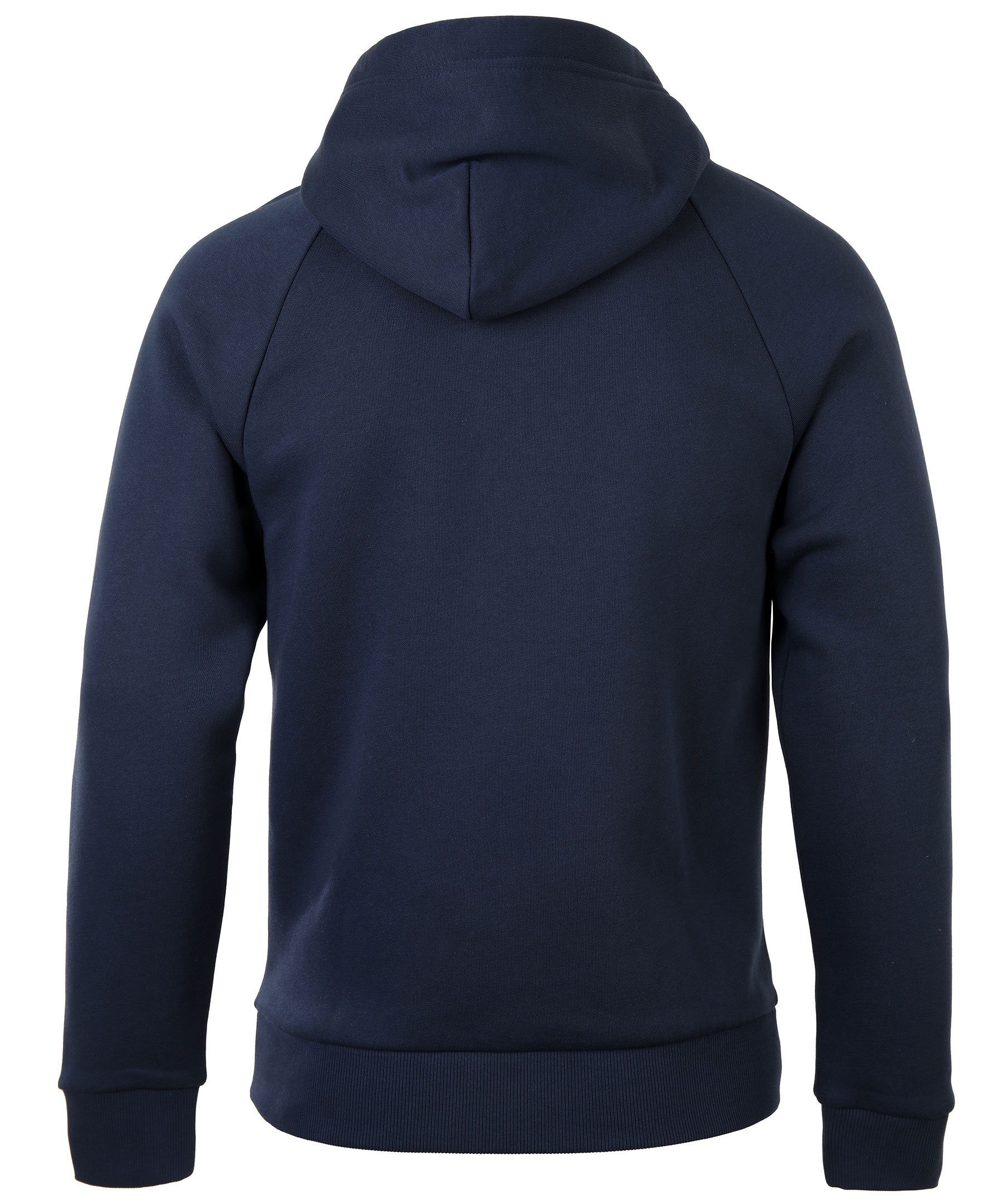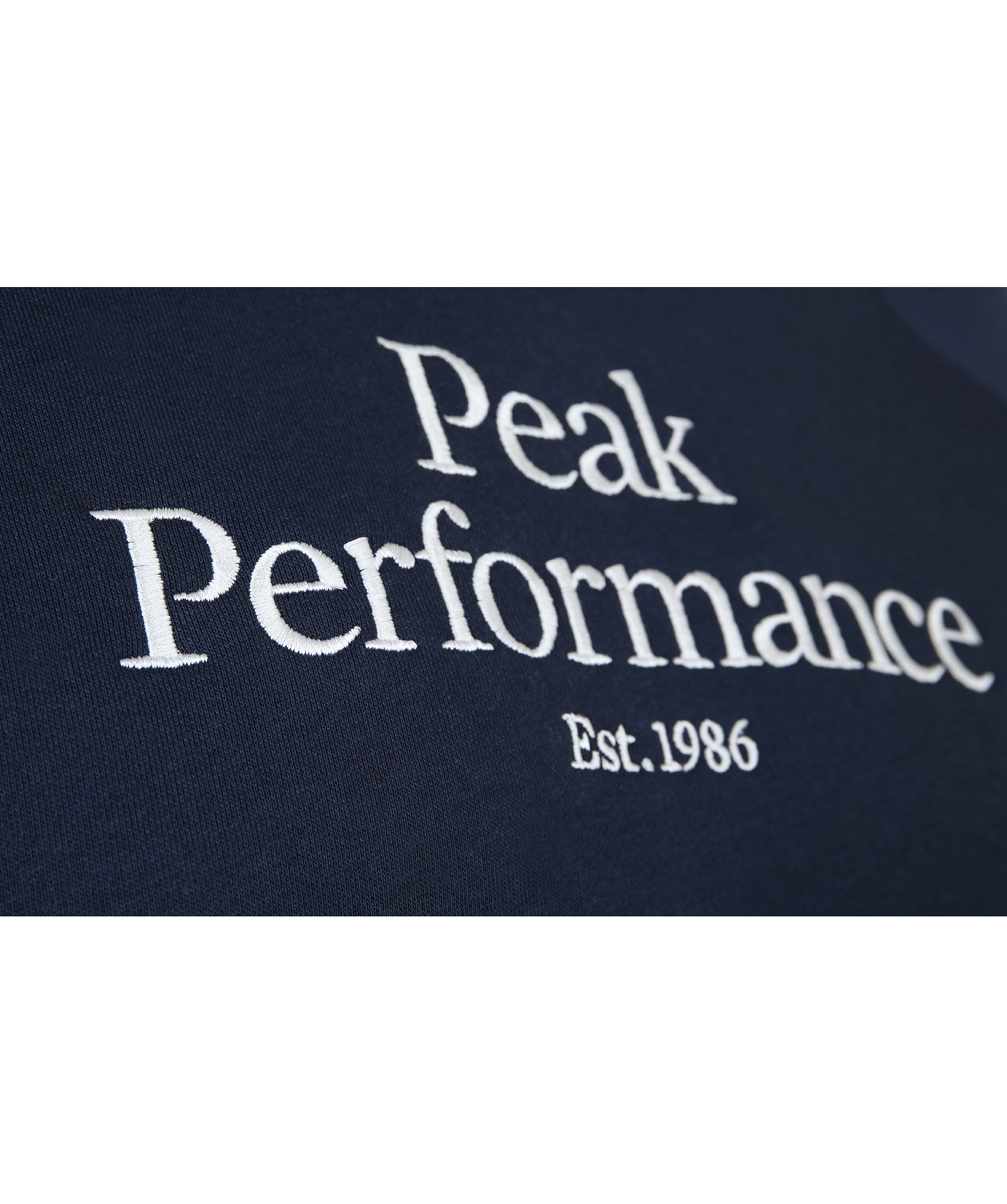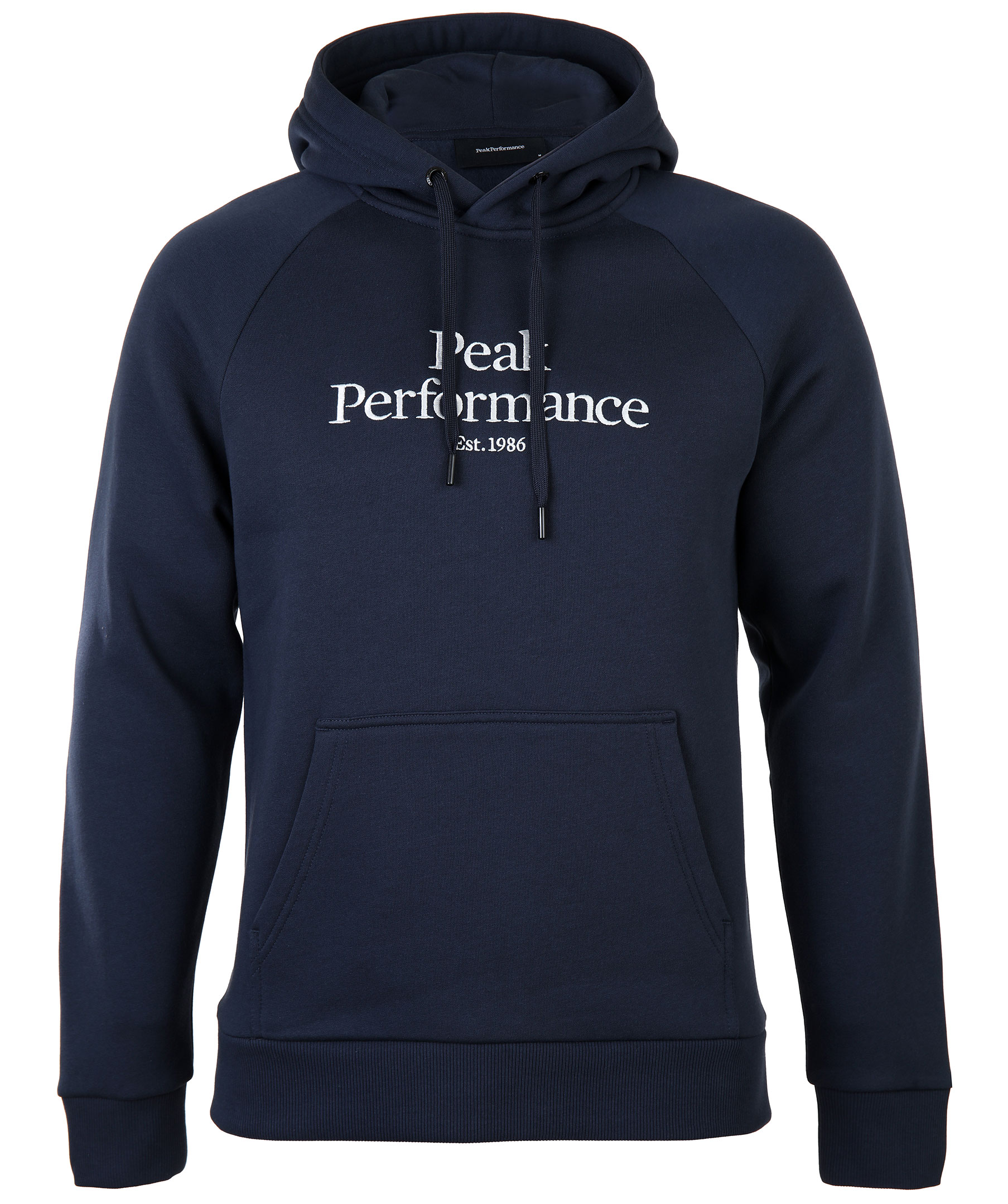 Marinblå hoodie från Peak Performance. Tillverkad i 100% bomull, dragsko i luva och stor broderad logotyp på bröstet.