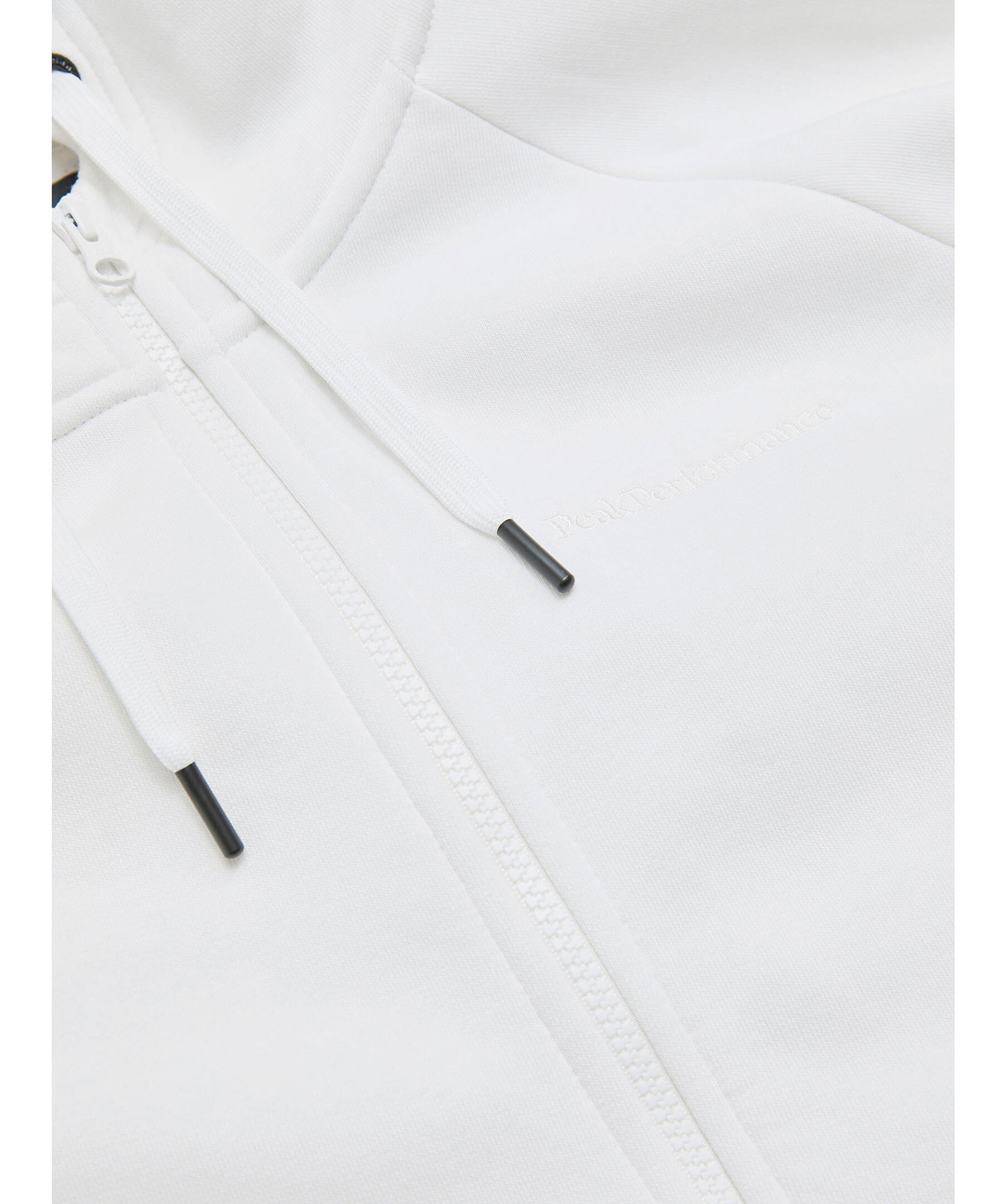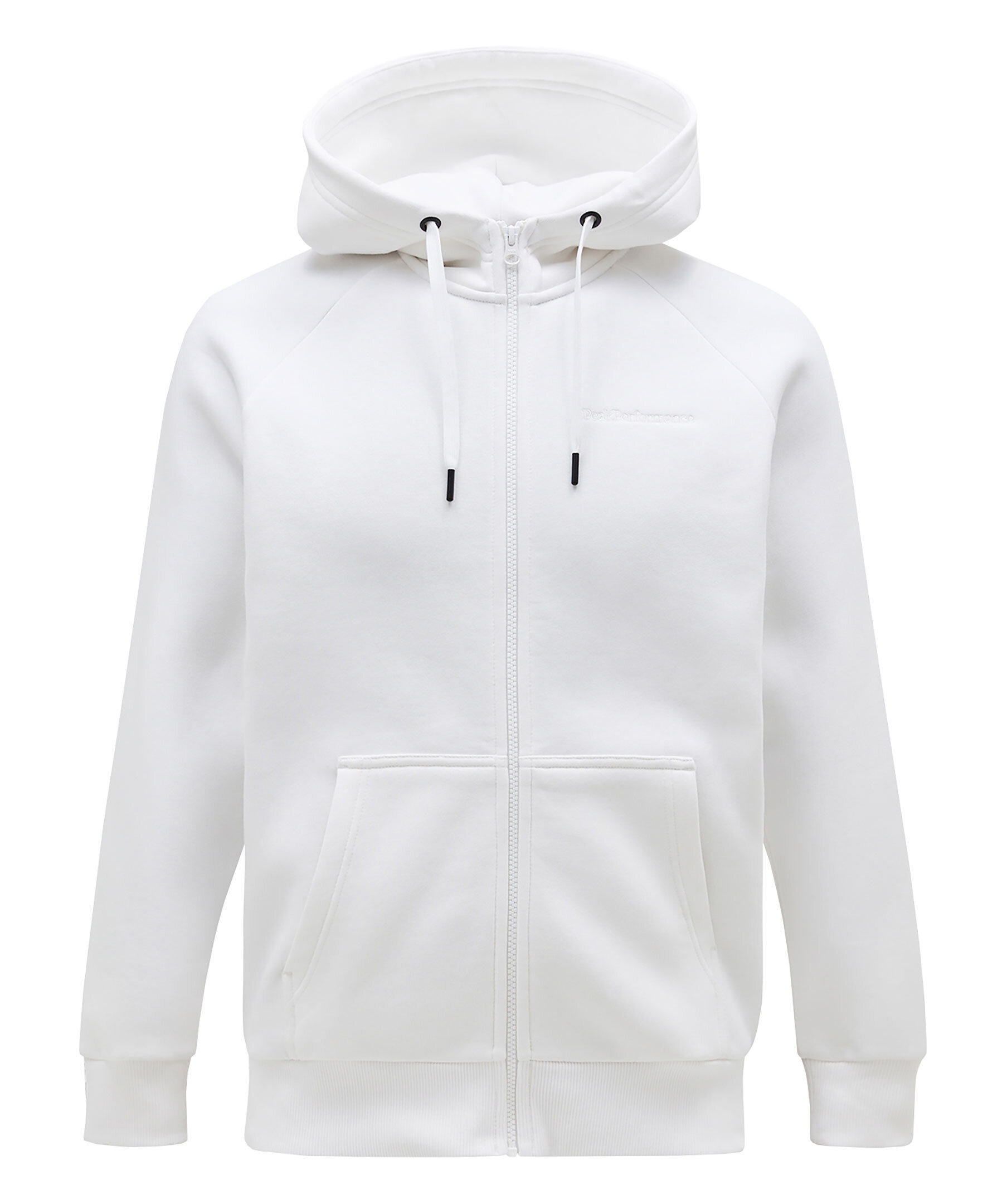 Vit klassisk hoodie med dragkedja från Peak Performance. Tillverkad i bomullsjerseyblandning, som är 100% ekologisk. Mjuk och borstad insida och tyget har färgats med AVITERA® SE-färger, som är mycket mer hållbara än vanliga färgningstekniker. Peak Performance-brodyr på bröstet, luva i dubbla lager med snörning och mudd i nederkant och ärmslut. Känguruficka och hellång YKK Vislon®-dragkedja fram.