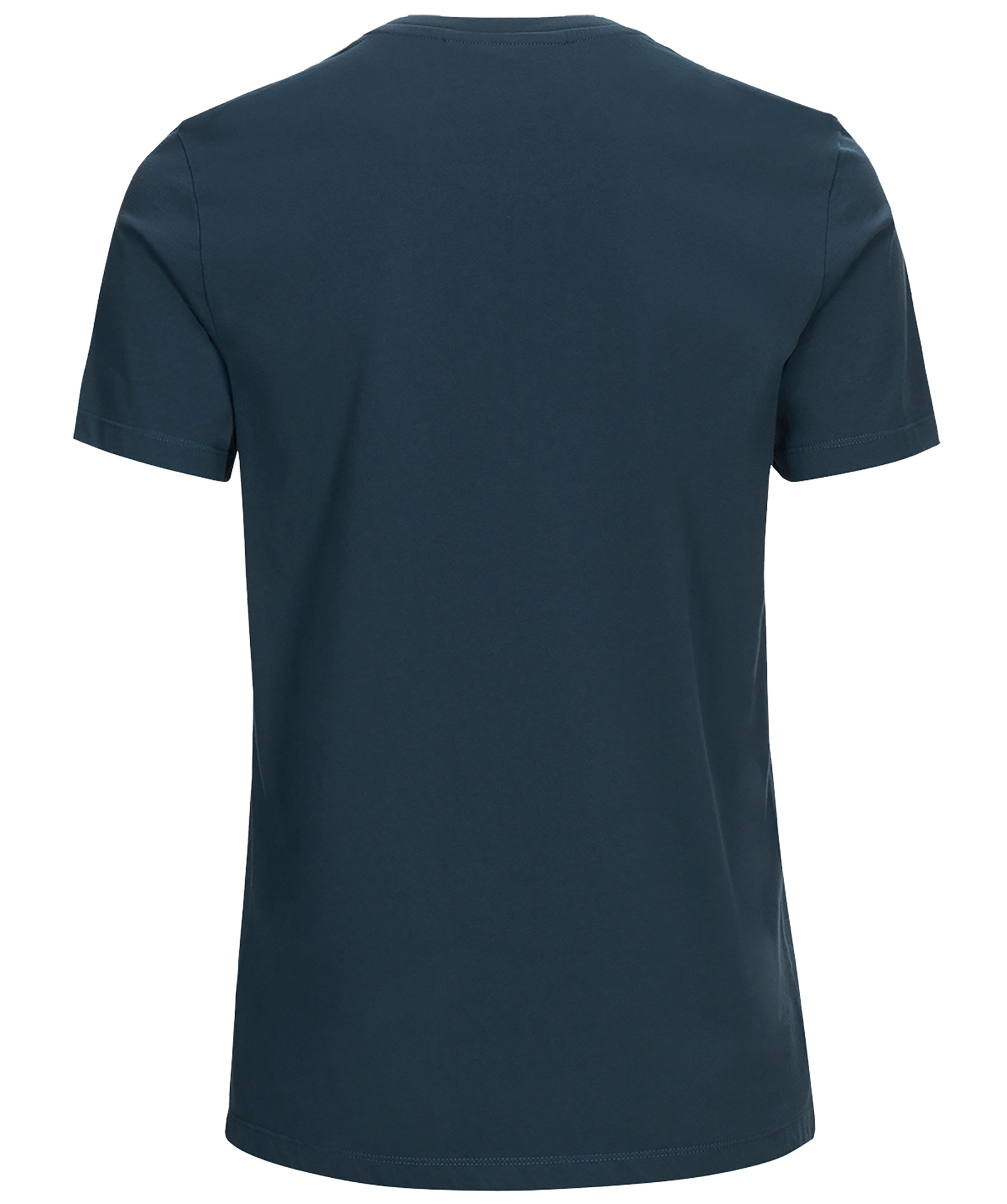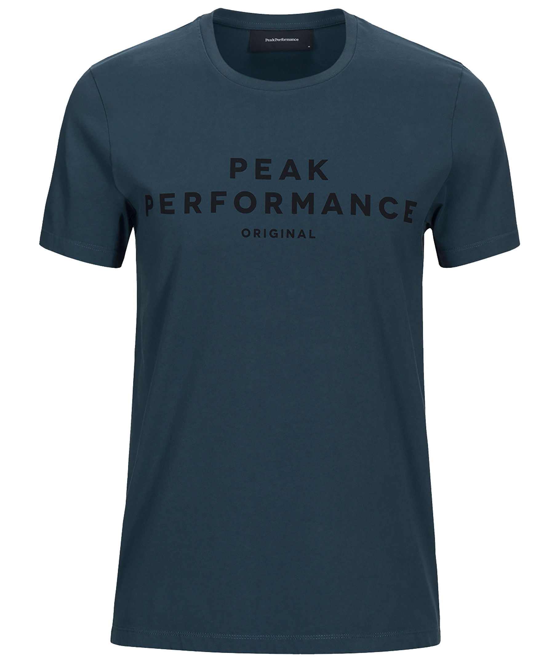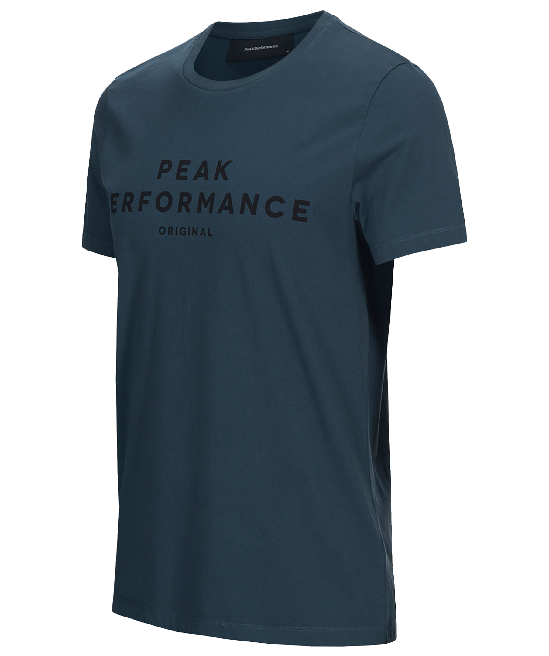 Marinblå t-shirt från svenska Peak Performance med logotryck i svart på bröstet. Rundad halsringning.