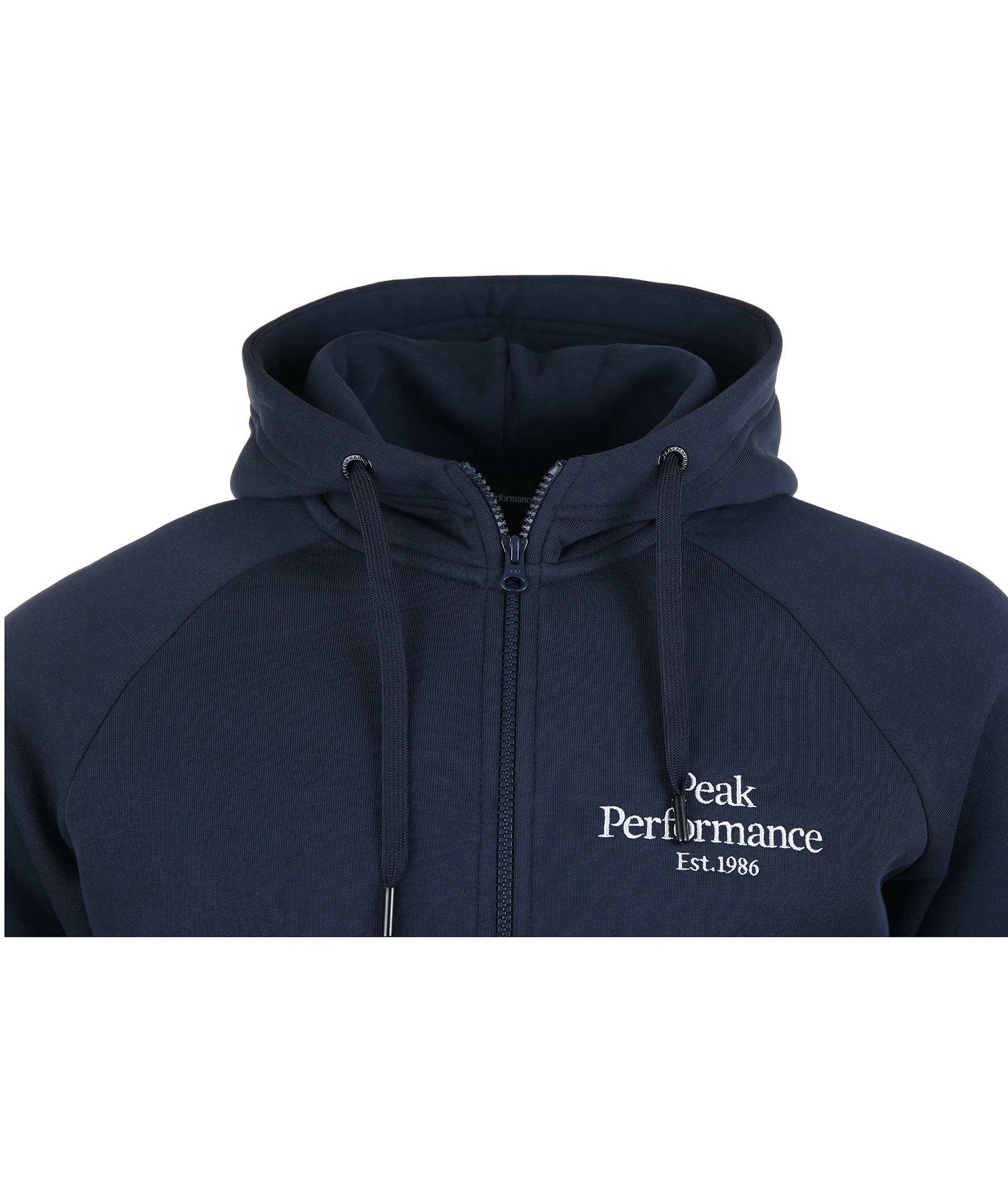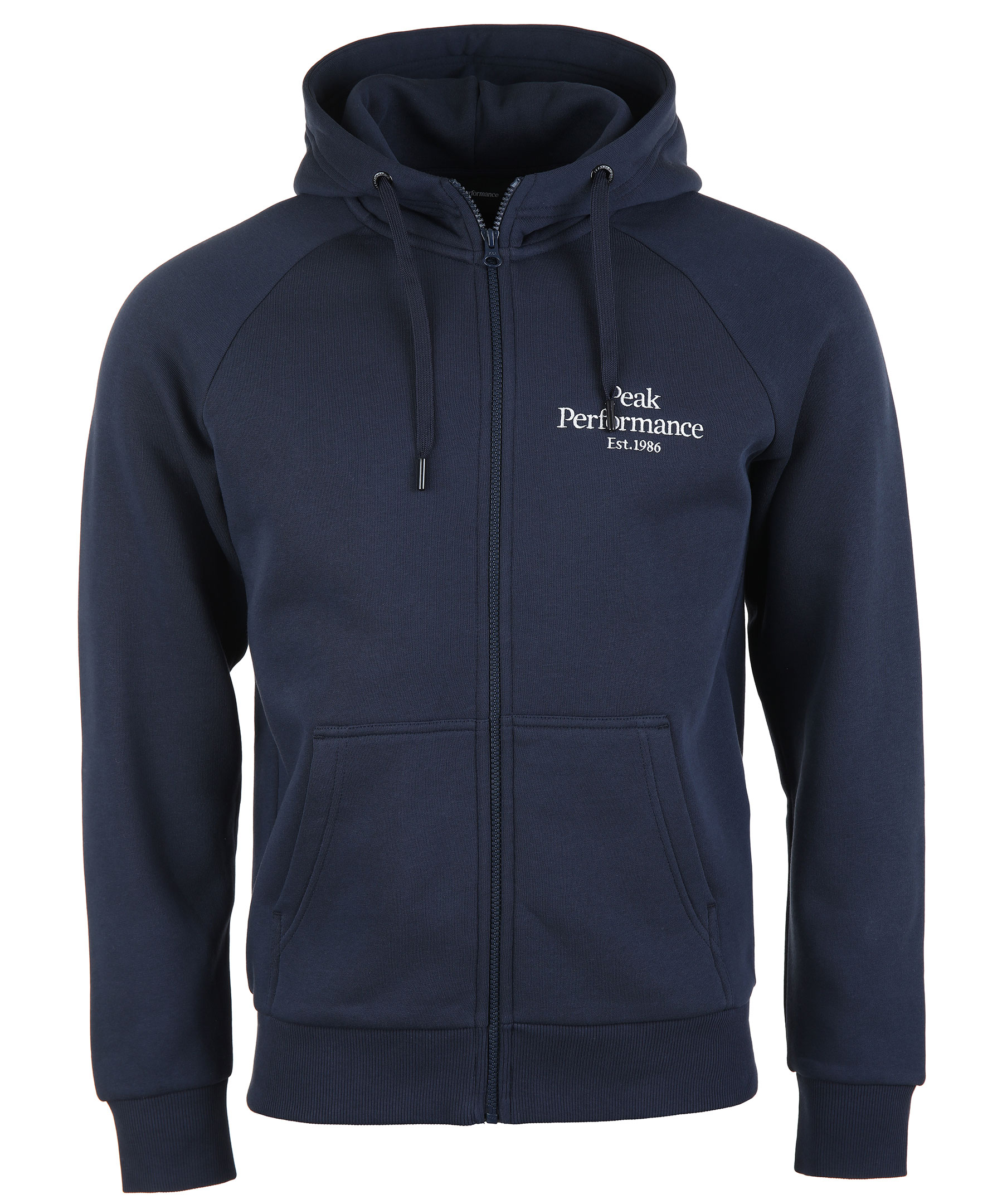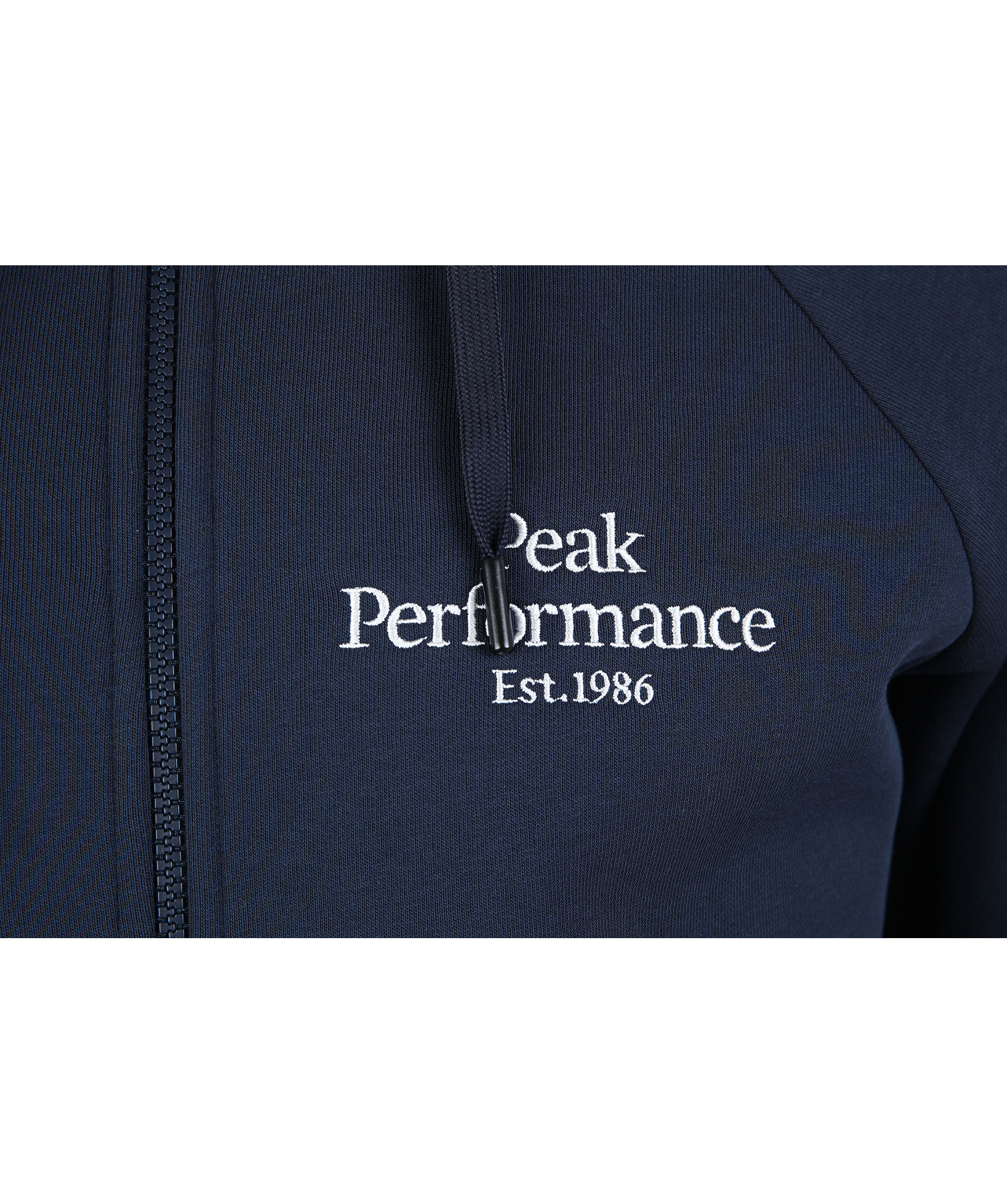 Marinblå hoodie från Peak Performance. Broderad textlogga på vänster sida av bröstet. Platta snören med metallcylindrar i luvan. Borstad insida, ribbade muddar i ärmslut och plaggslut och två fickor på magen. Tillverkad i bomullsblandning.