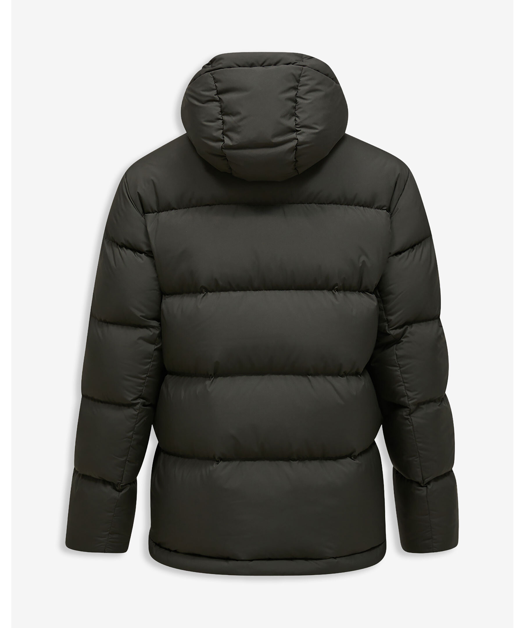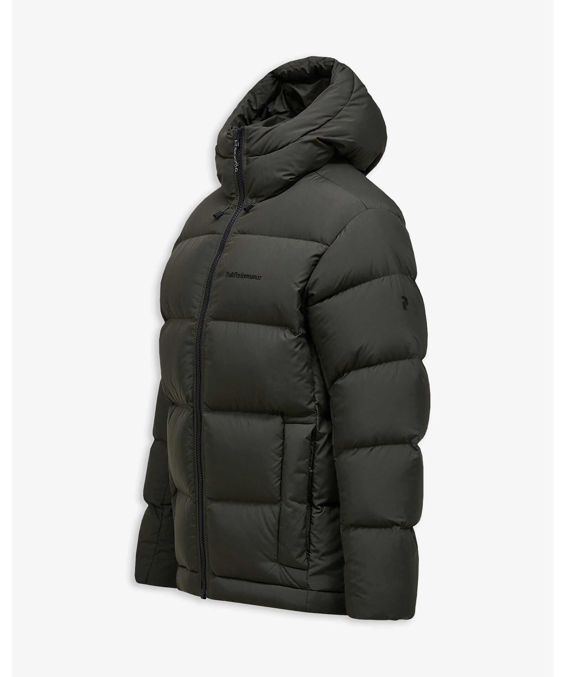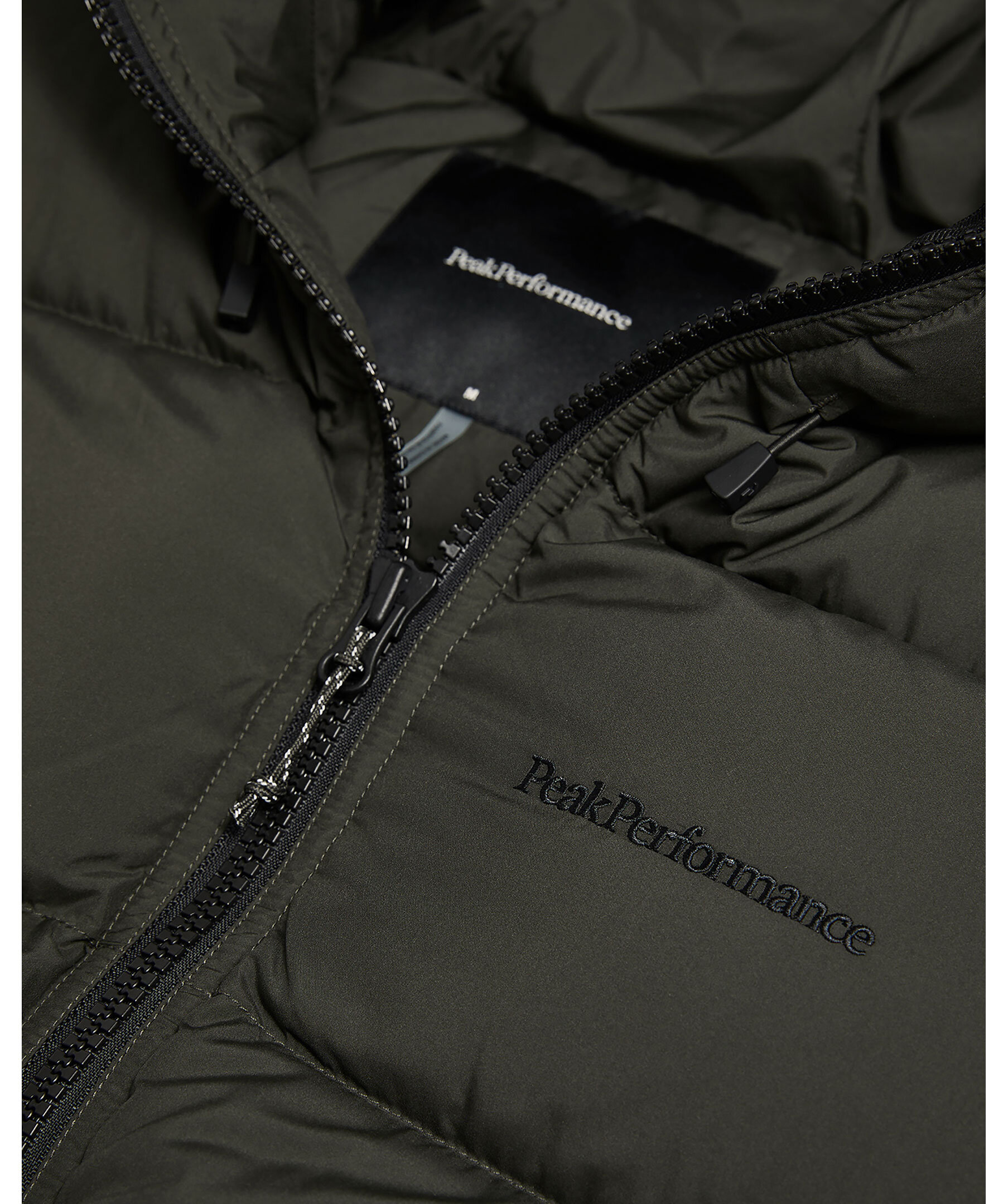 En lätt och funktionell dunjacka designad för kalla dagar från Peak Performance. Tillverkad i återvunnen polyester med en fyllning bestående av 80 % dun och 20 % fjäder (600 fill power). Jackan har en normal passform och är utrustad med en fast huva, två framfickor med dragkedja, en innerficka, ribbade muddar vid ärmsluten samt en dragsko i nederkanten för justerbar passform. Yttertyget är vattenavvisande och vindtåligt, vilket ger extra skydd mot väder och vind. En broderad logotyp pryder bröstet och ena ärmen.