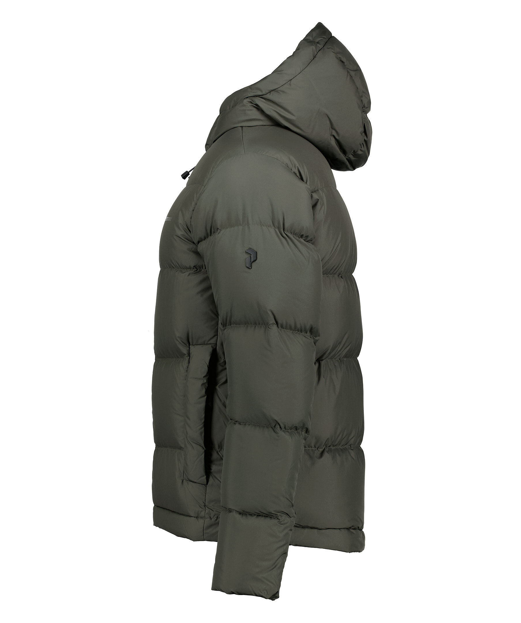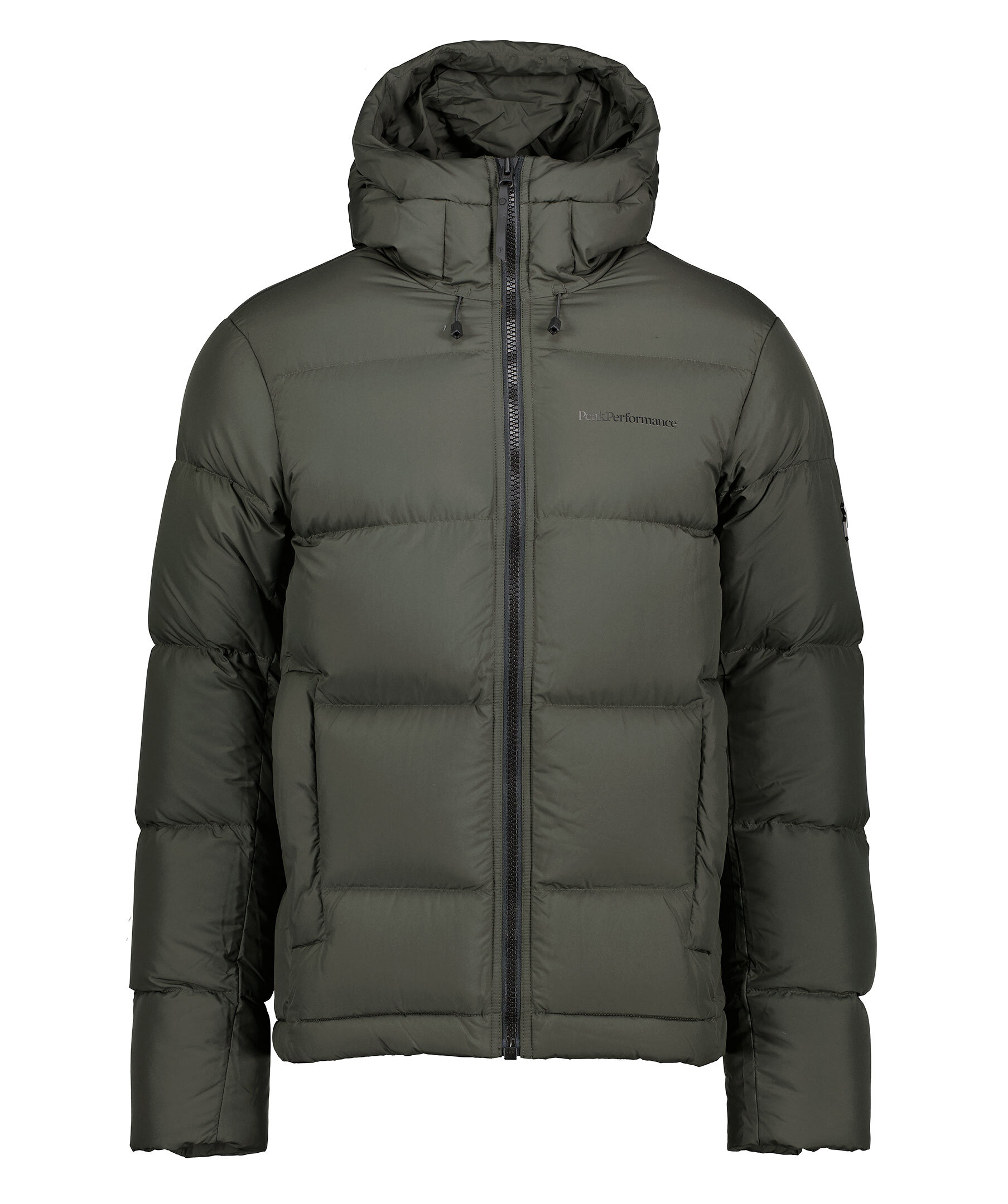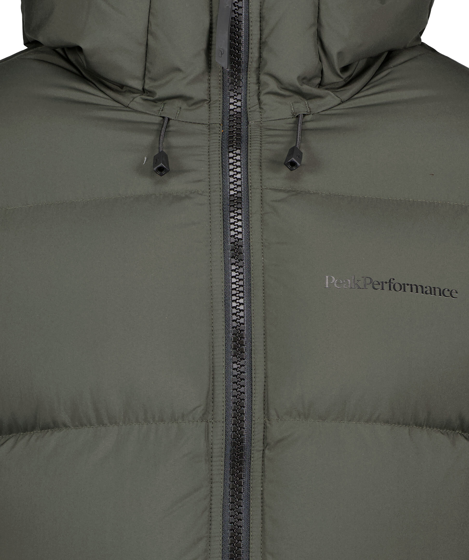 Skogsgrön quiltad dunjacka från Peak Performance. Stängs framtill med dragkedja. Tryckt logotyp på vänster bröst. Två fickor framtill som stängs med dragkedja. Innerficka som stängs med dragkedja. Logotyp i metall på vänster ärm. Ribbstickad mudd vid ärmslut. Luva med dragsko. Dragsko vid jackslut. Jackan är tillverkad i ett vatten avstötande och vindtätt material.
