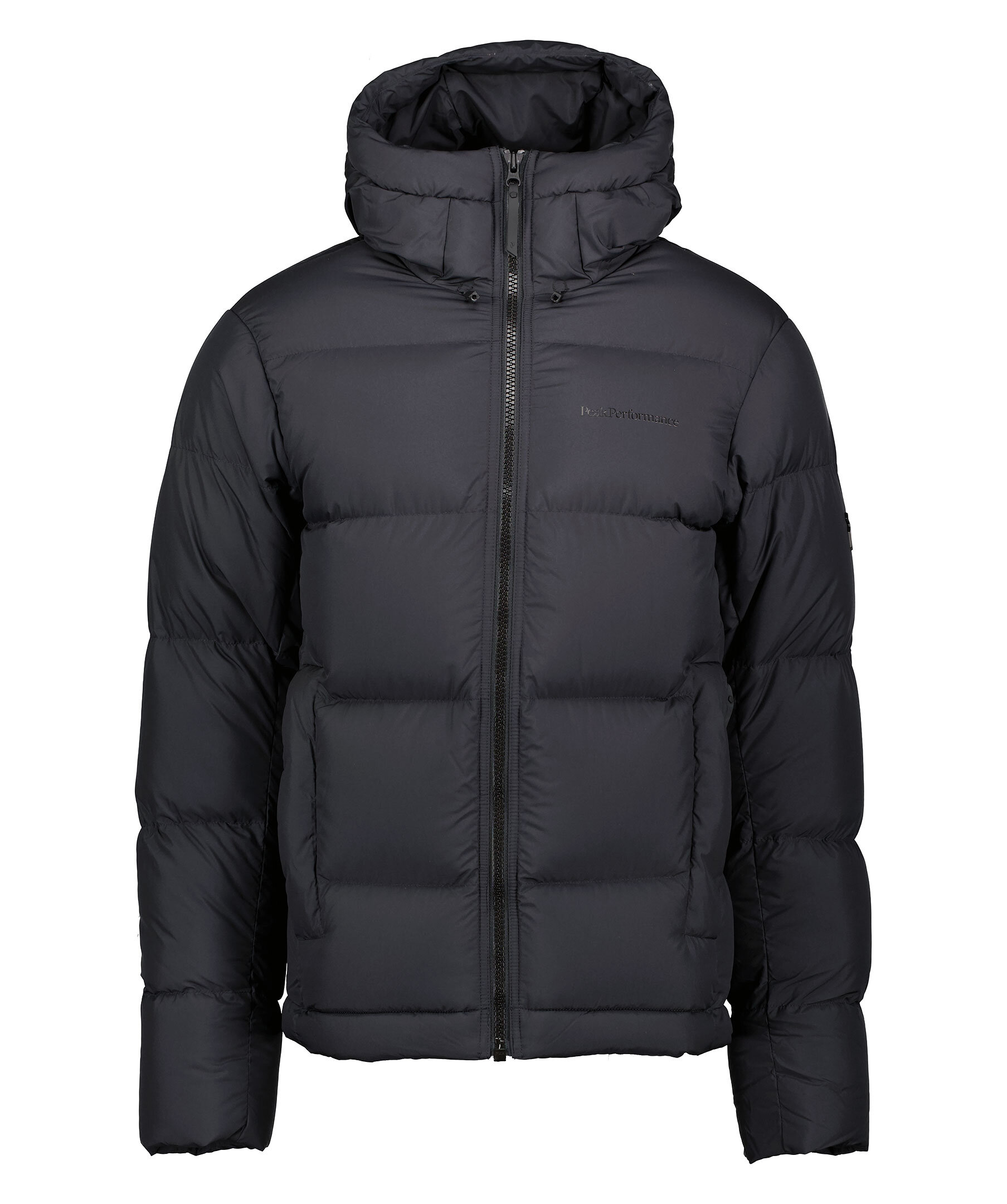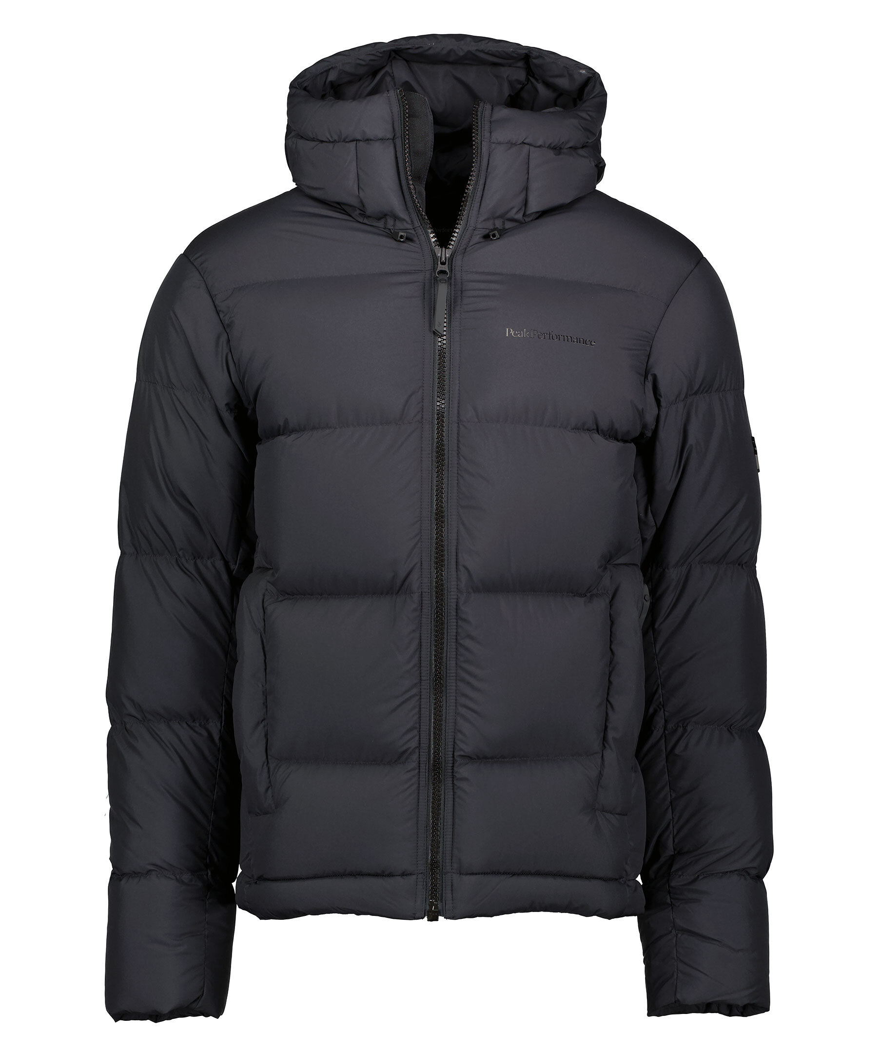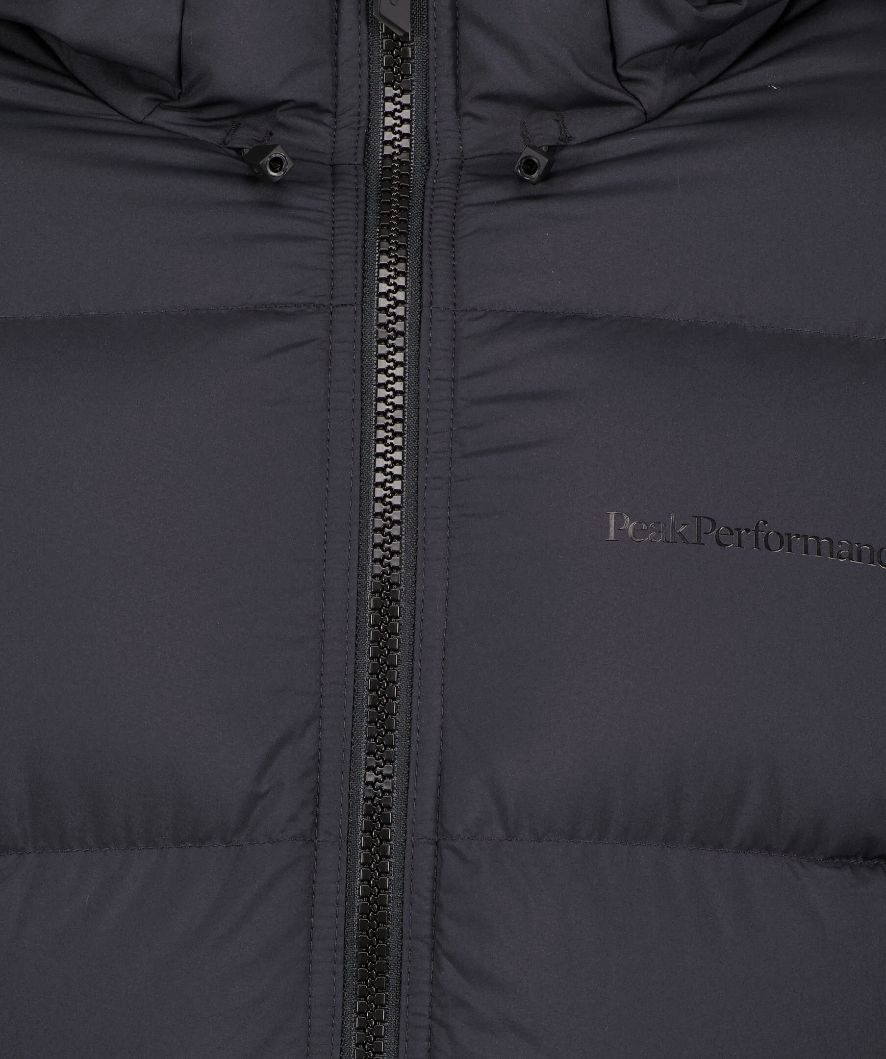 Svart pufferjacka med dunfyllning från Peak Performance. Jackan är tillverkad av återvunnen polyester, Flourocarbon-fri DWR impregnering och vaddering av ansvarsfullt producerat dun. Två framfickor som stängs med dragkedja, logotyp i metall på ena ärmen och en tryck logotyp på bröstet. En innerficka med dragkedja, dragsko i luva och vid plaggslut. Ribbade muddar inuti ärmslut.