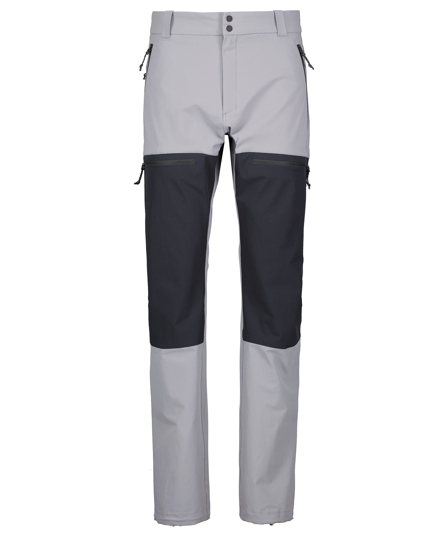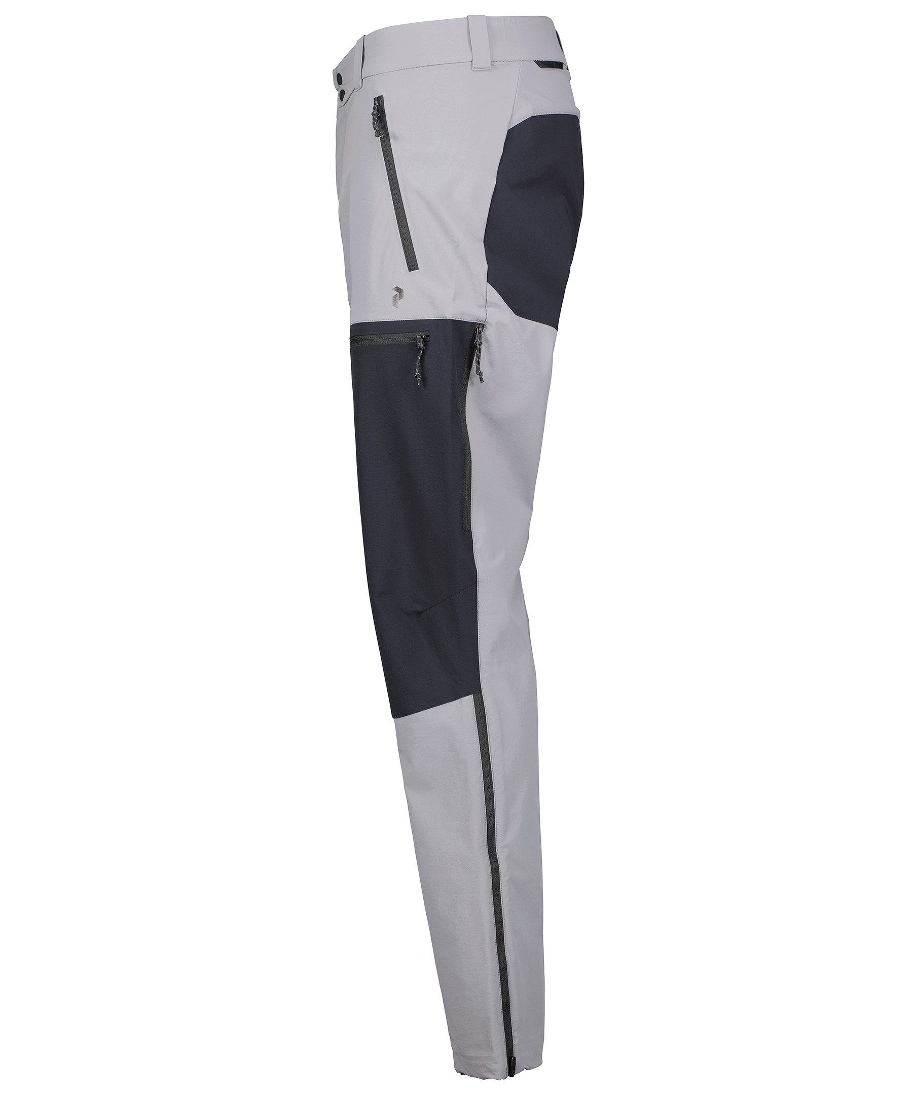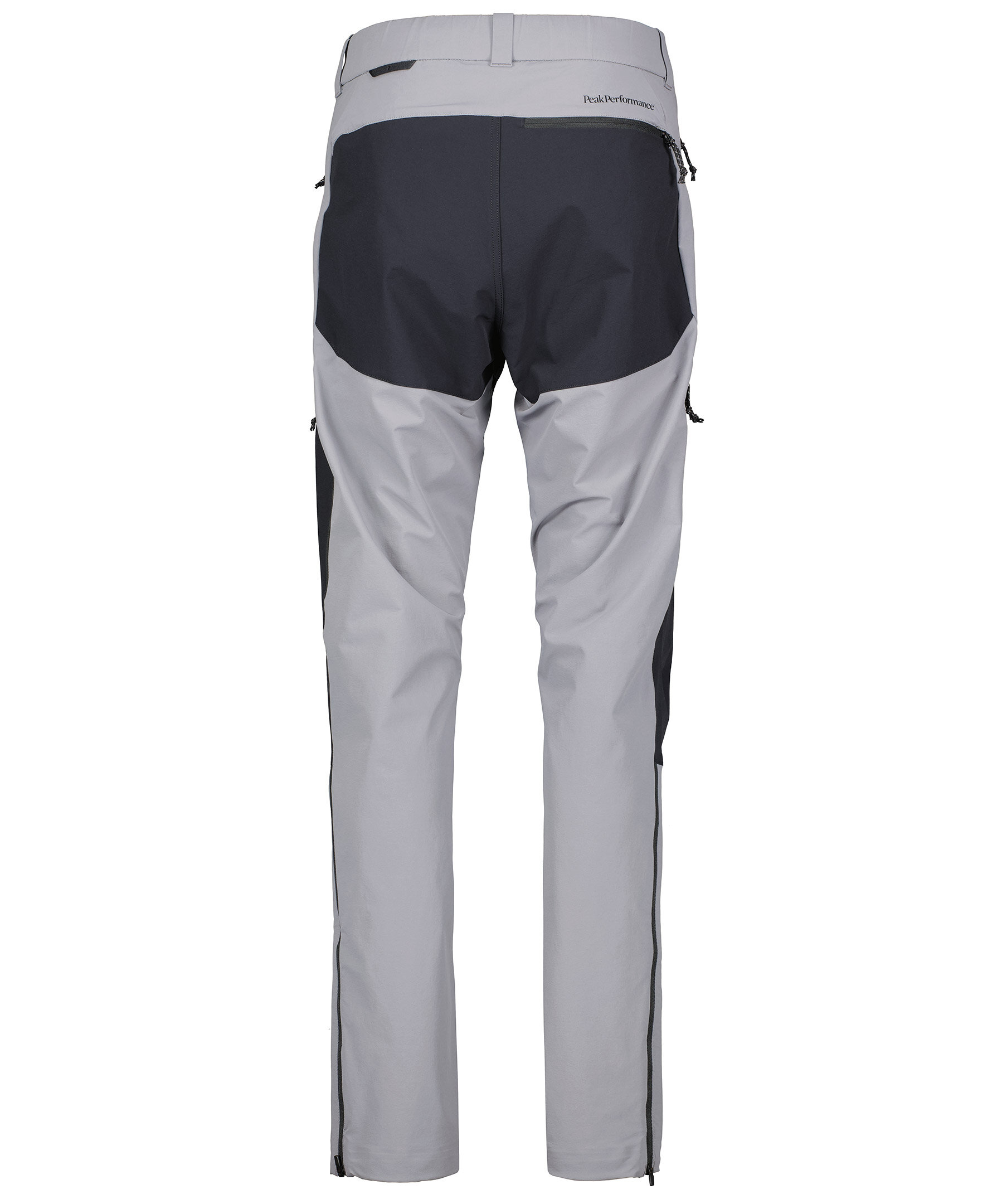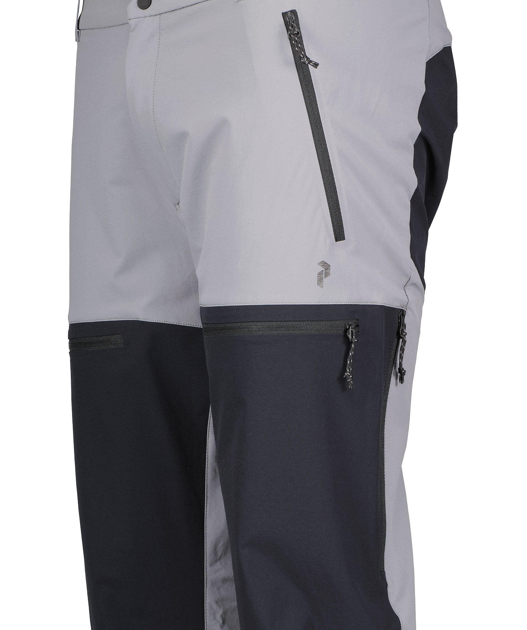 Grå och svarta softshell byxor från Peak Performance. Vatten och vindavvisande. Justerbart benslut med blixtlås och kil. Hake för kängor. Resår i midjan med hällor för bälte. Fyra fickor framtill som stängs med dragkedja. två fickor baktill som stängs med dragkedja. Tryckt logotyp på byxans framsida och baksida.