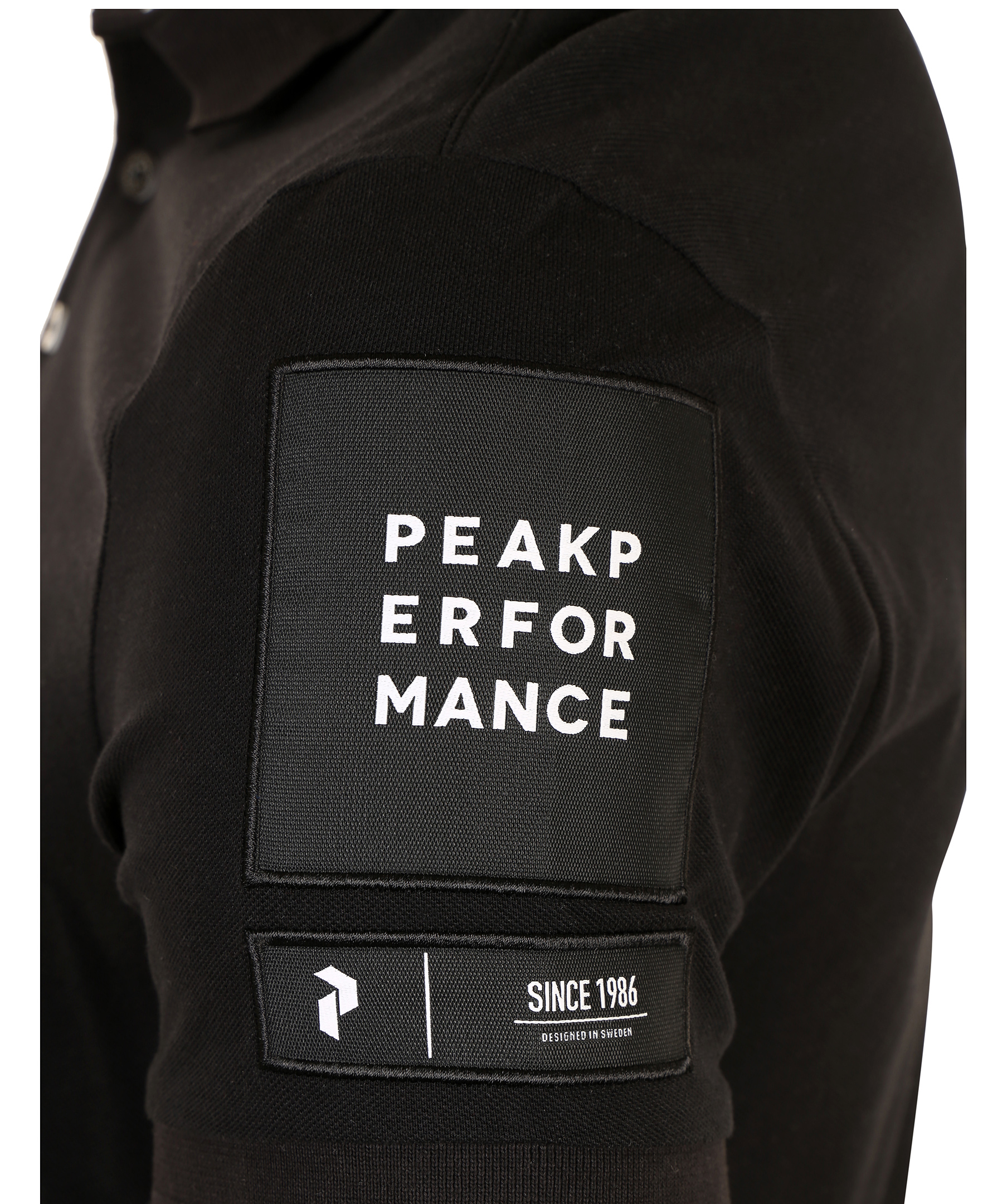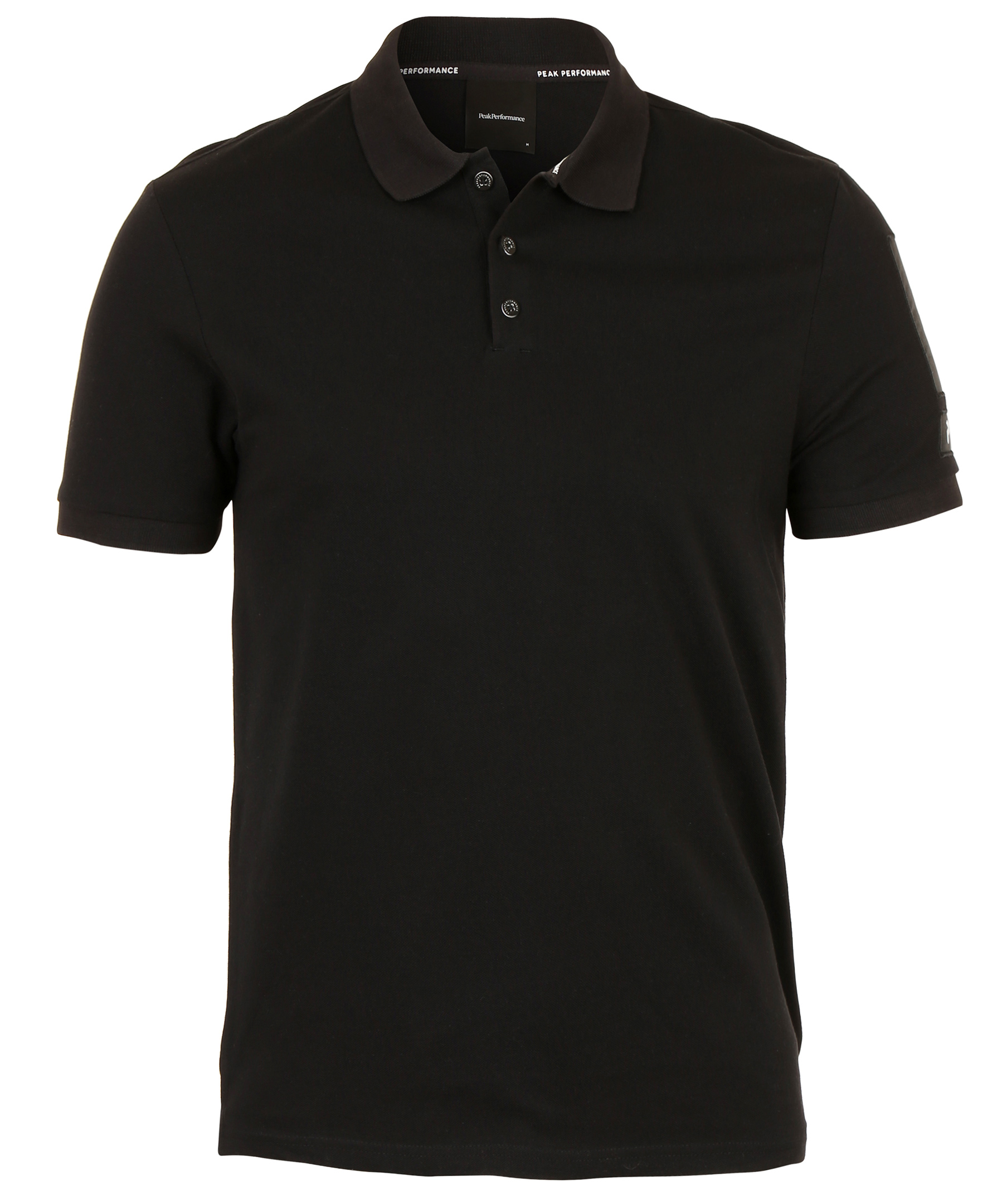 Svart pikétröja från Peak Performance. Klassisk ribbstickad krage och knappslå med tre knappar. Broderad logotyp på vänster ärm. Normal i passformen.