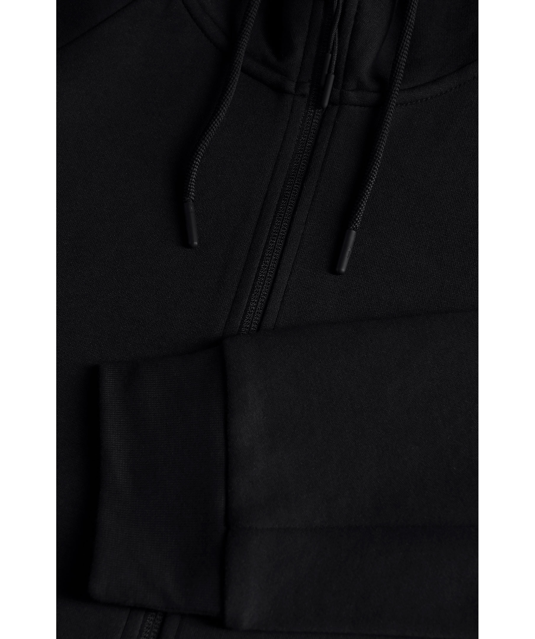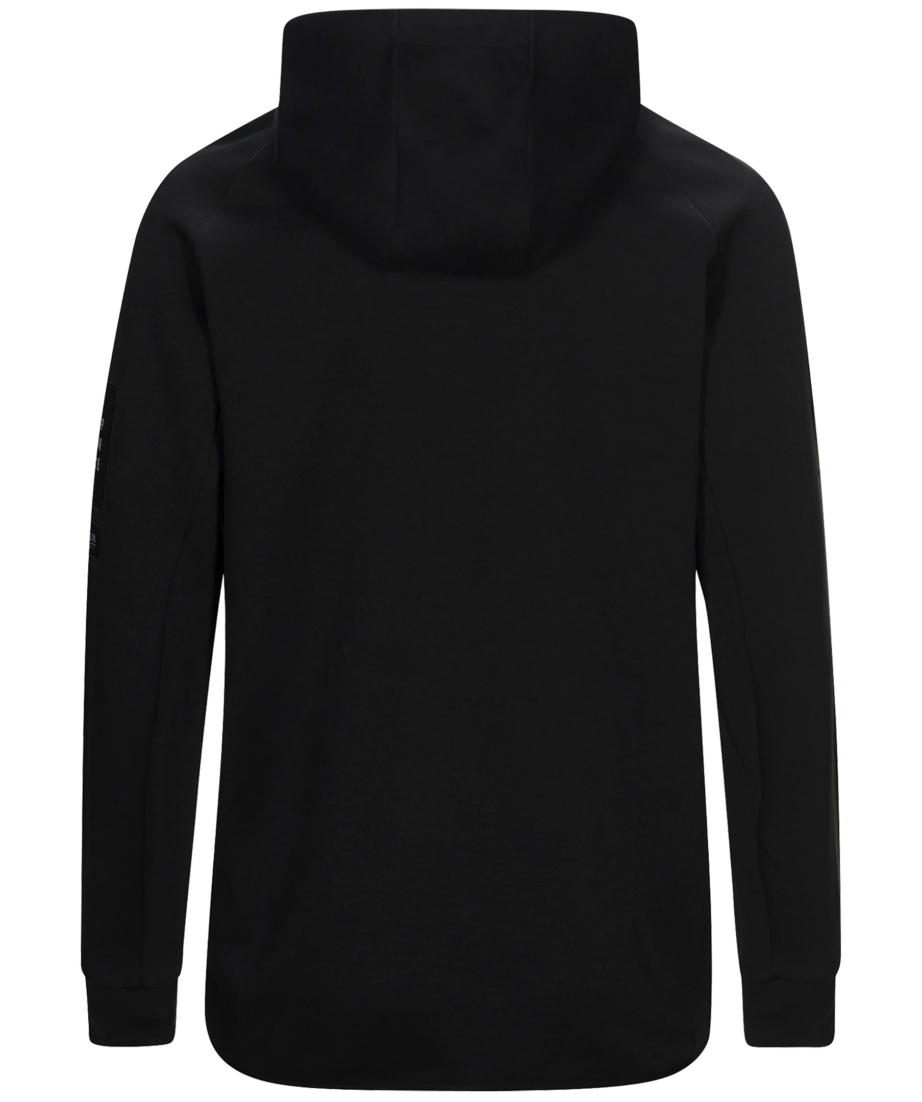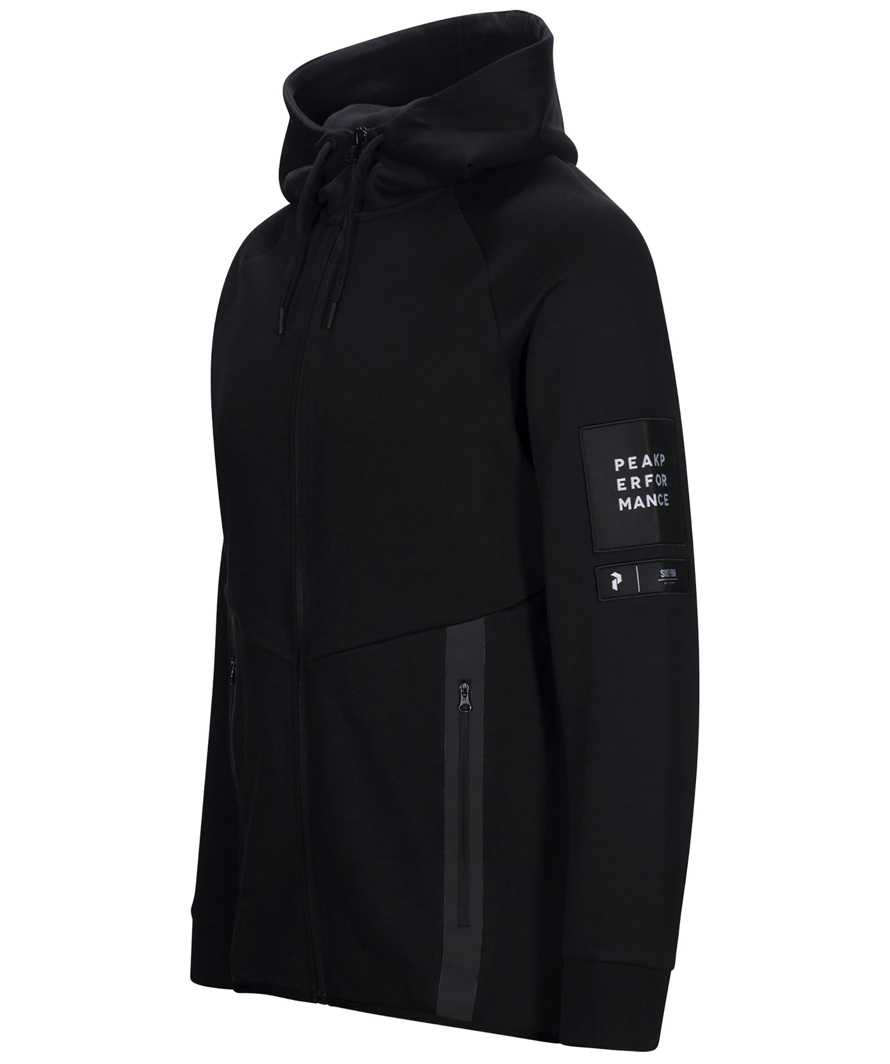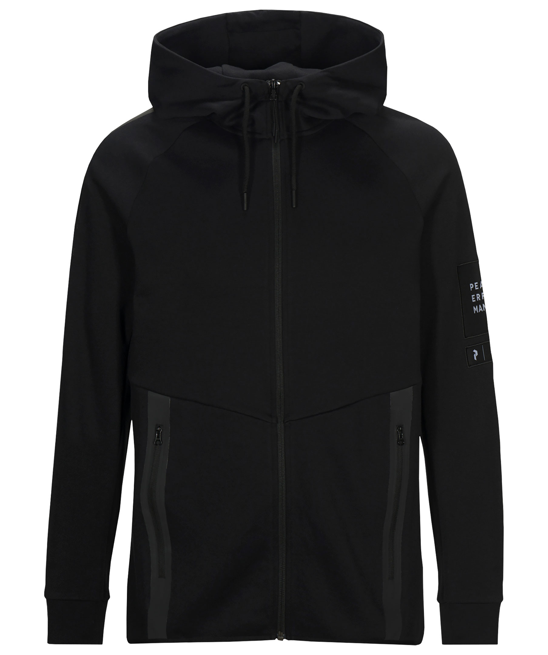 Svart hoodie från Peak Performance. Tillverkad i mjuk bomullsmix. Två fickor fram med dragkedja och dragsko i luvan. Stängs med dragkedja och har tyckt svart revär längs vänsterärm och broderade logotyper på höger ärm.