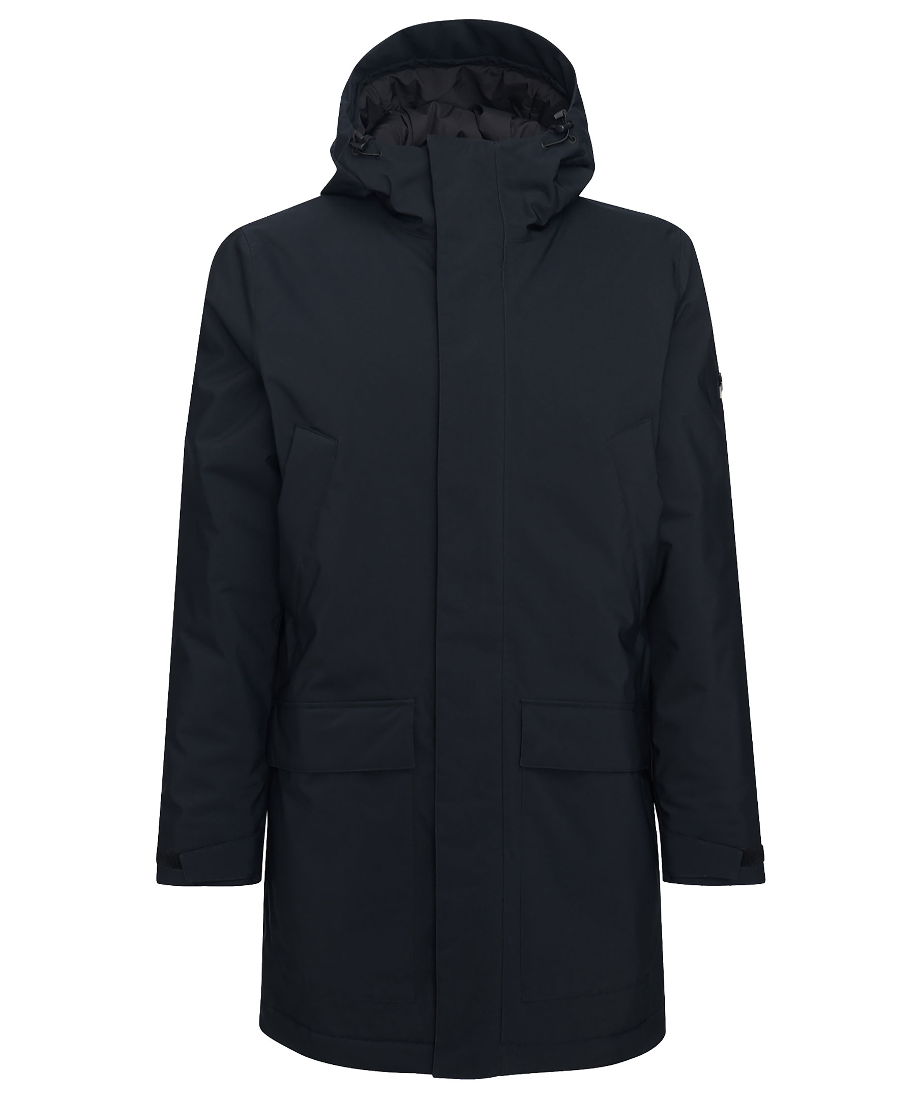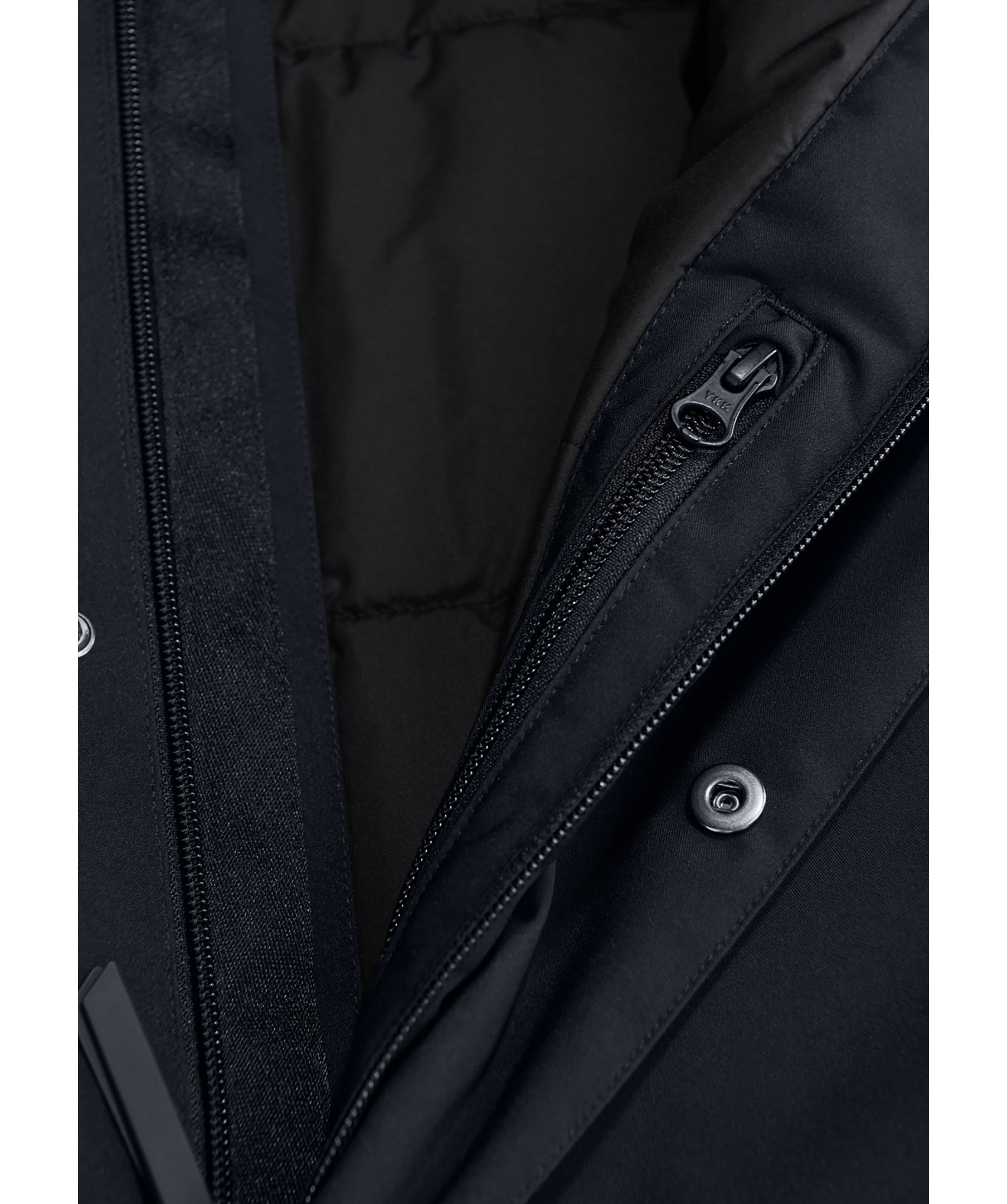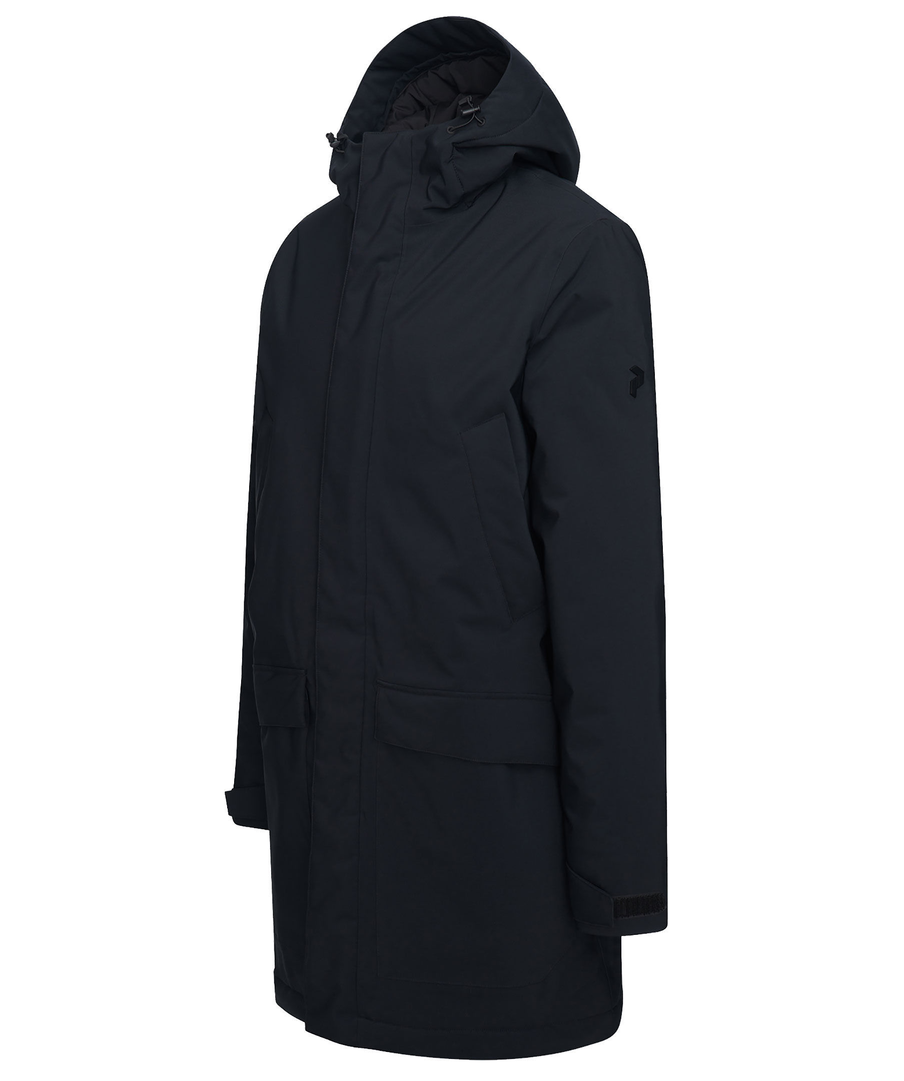 Svart polyesterfodrad parkas från Peak Performance. Jackan är vadderad och har ett quiltat foder. Två framfickor med ficklock och två bröstfickor. Reglerbart kardborreband vid ärmslutet. Logotyp på vänster överärm.