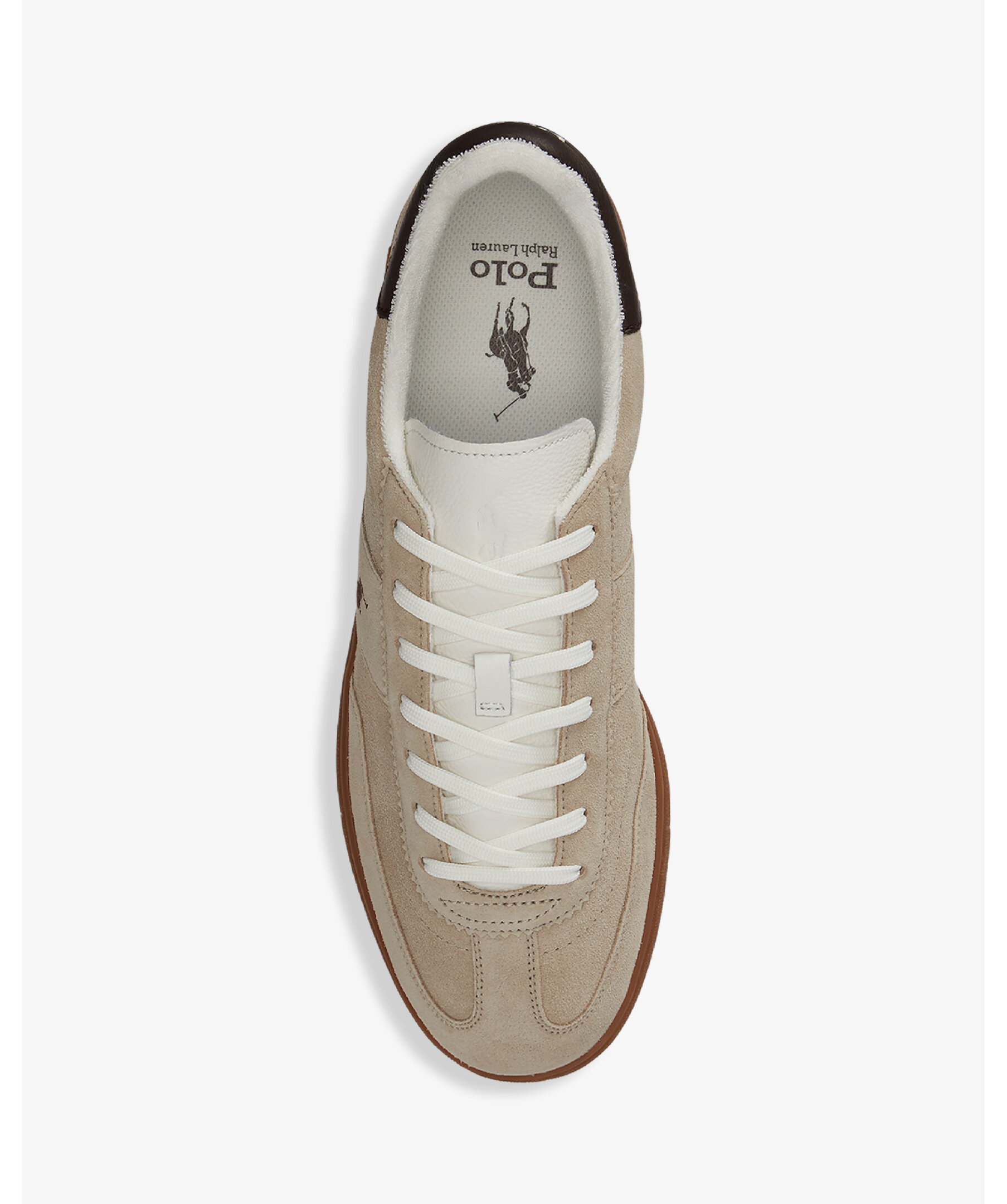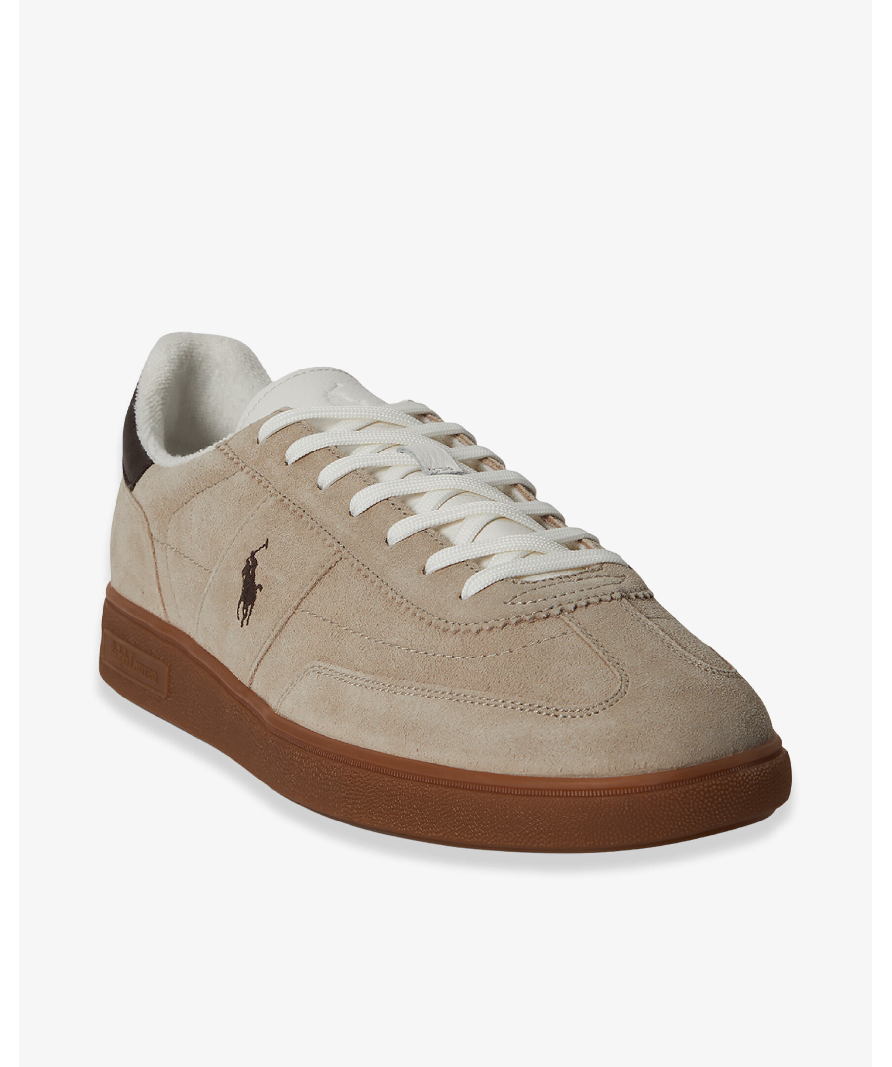 Retro‑inspirerade sneakers från Polo Ralph Lauren i färgen Dirty Buck/Deckwash White med lågt snitt, rund tå och snörning fram. Skorna har en 80‑tals‑tennislook i semsket mockaläder med kontrasterande detaljer och en slitstark gummisuldesign.