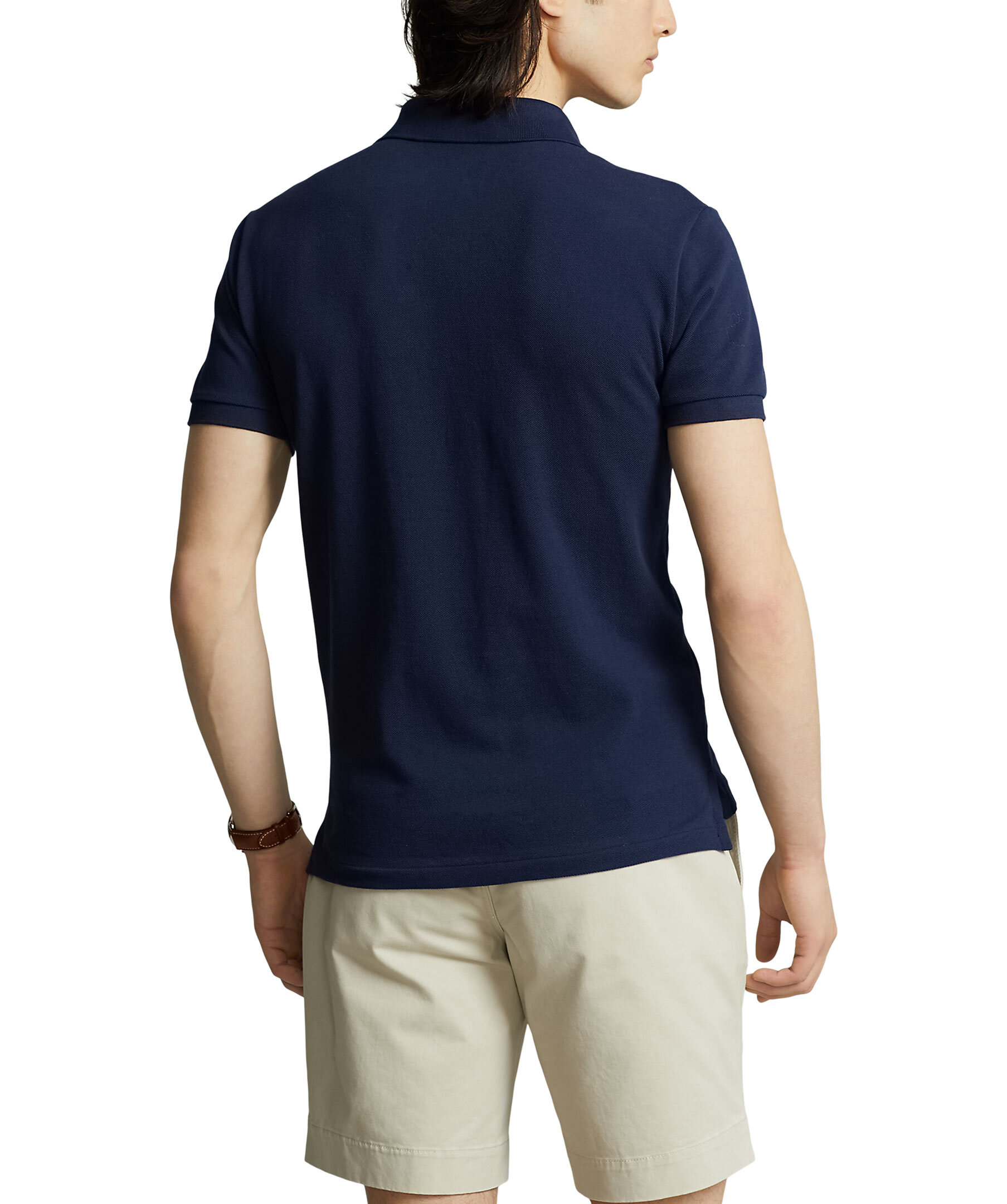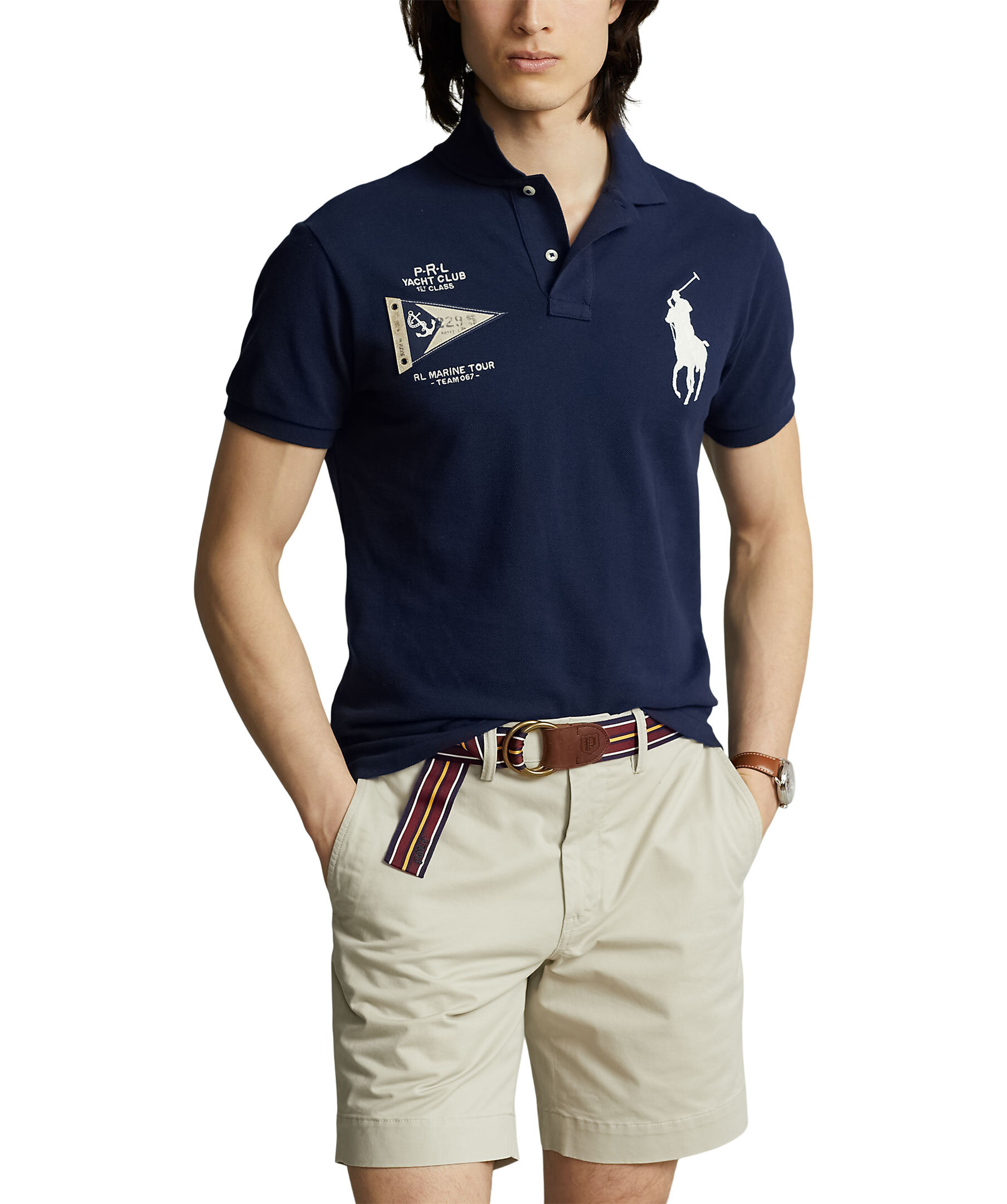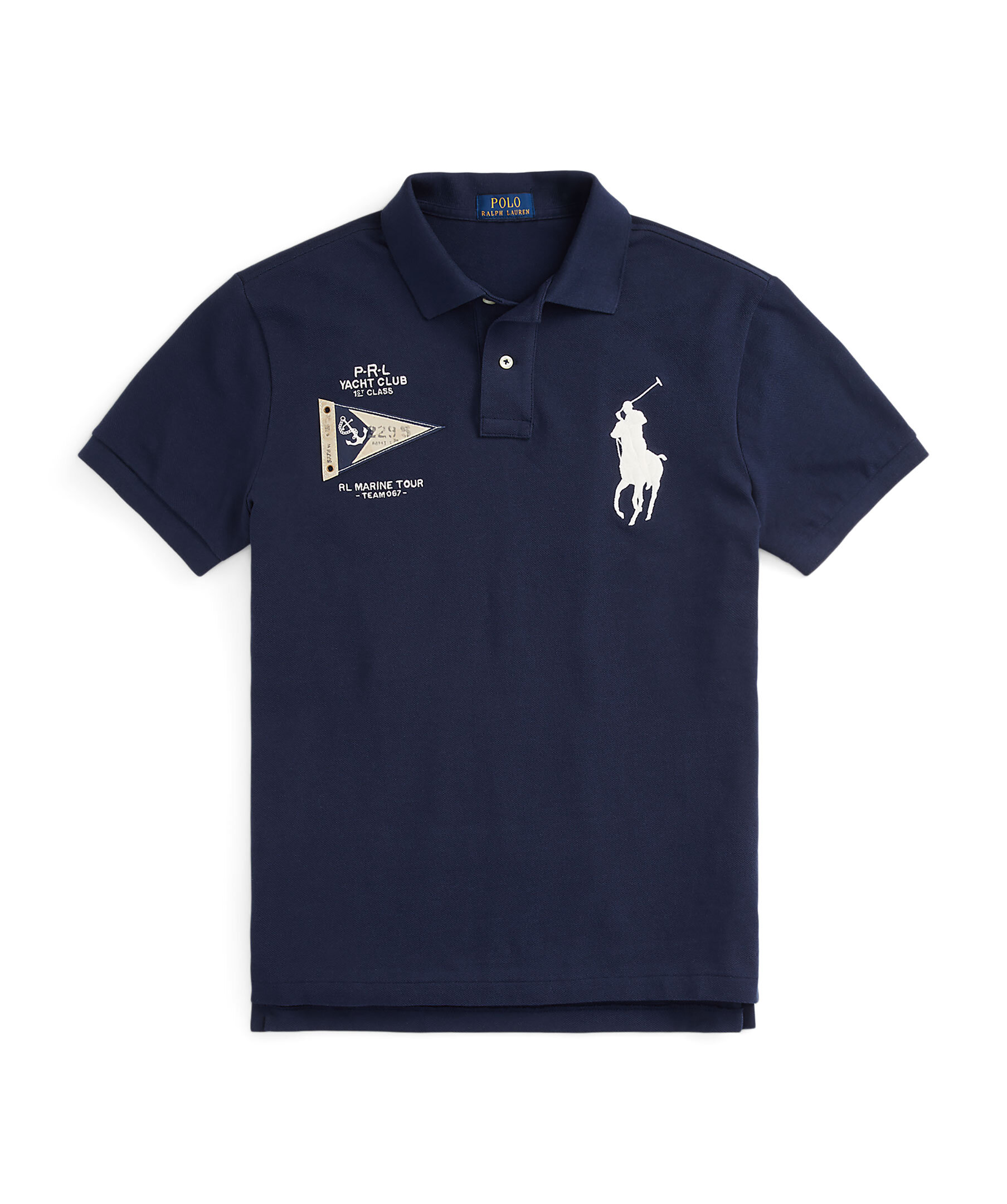 Marinblå pikétröja från Polo Ralph Lauren. Stor broderad logotyphäst på vänster sida av bröstet samt broderad text. Framsidan har även en patch-flagga sydd på högra sidan. Tillverkad av 100% bomull.
