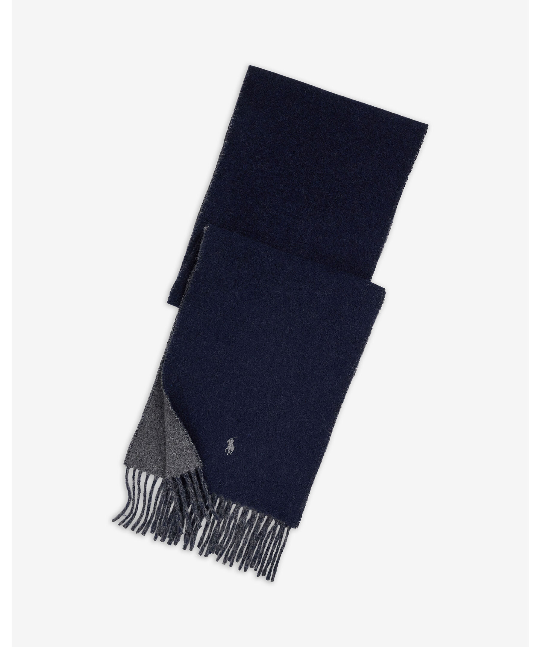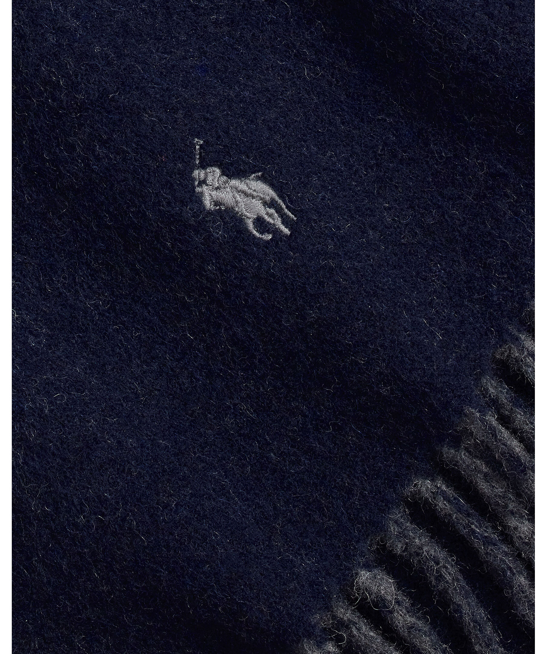 Mörkblå och grå halsduk från Polo Ralph Lauren. Halsduken har en mörkblå sida och en grå sida samt broderad logotyp och fransar i nederkant. Tillverkad i en mjuk ullblandning. Mått: 182,9 cm x 25,4 cm.