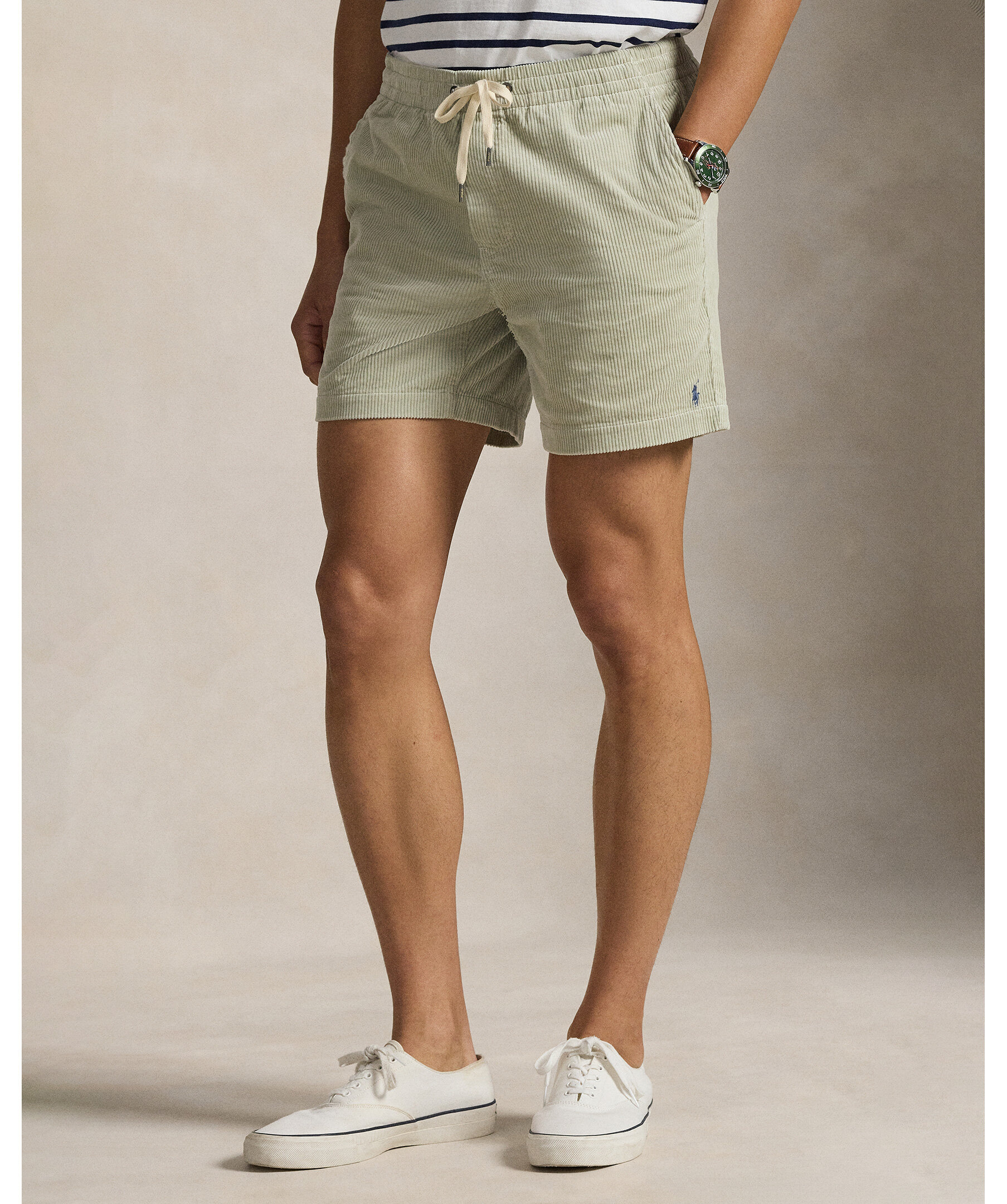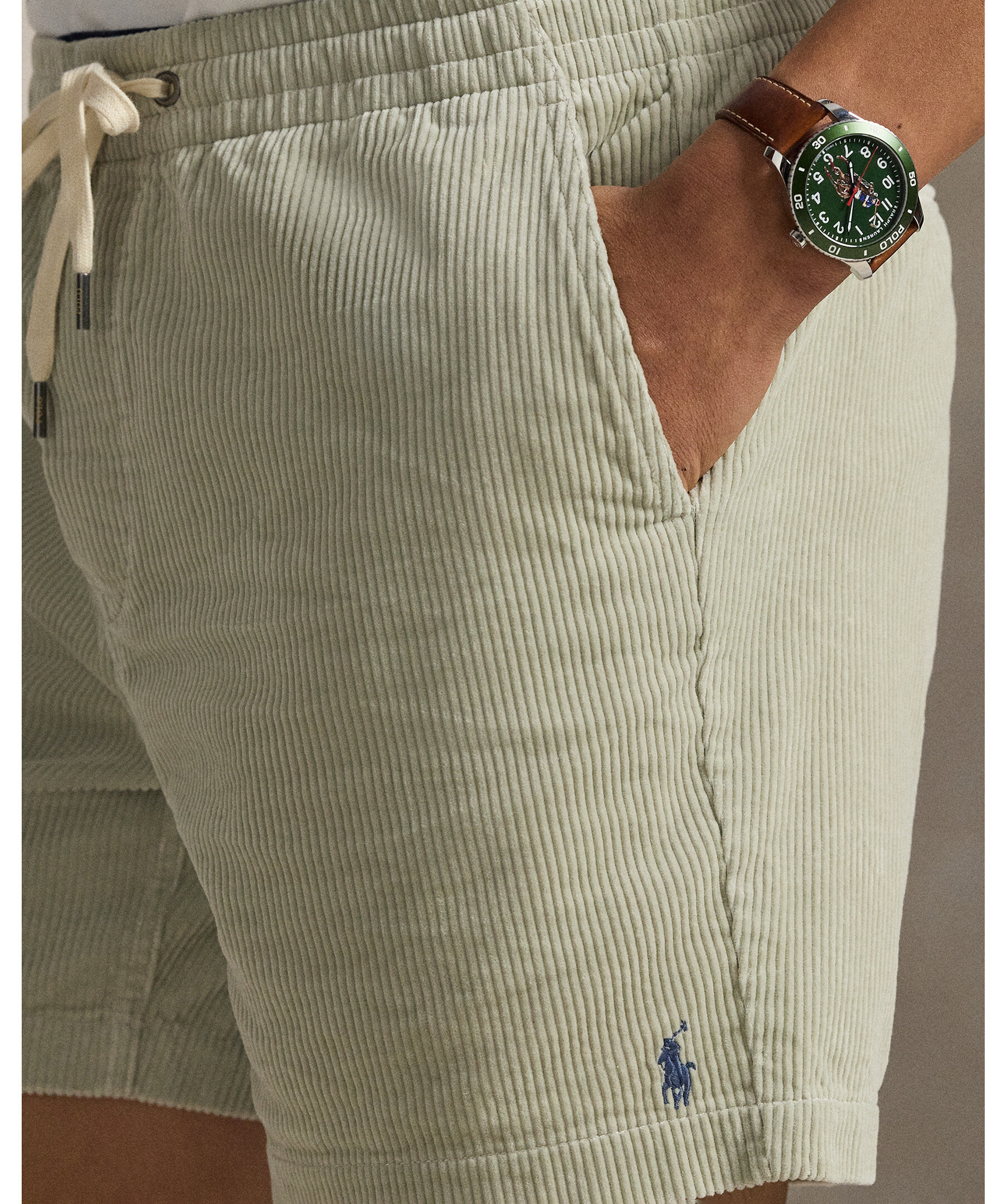 Gröna shorts från Polo Ralph Lauren. 15 cm innerbenslängd och med en bekväm dragsko i midjan. Det här paret är tillverkat av mjuk, bred manchester för en klassisk look.