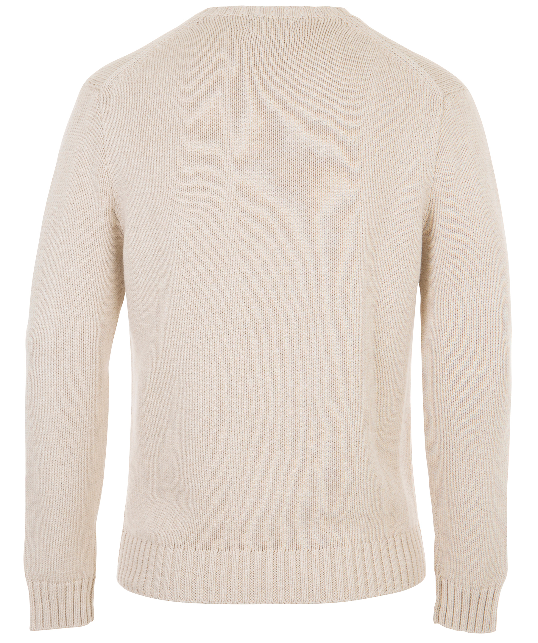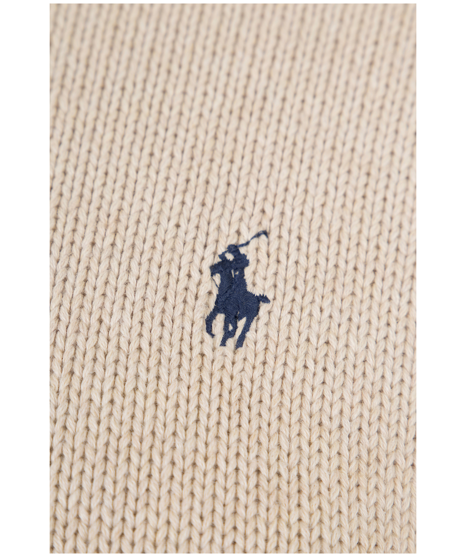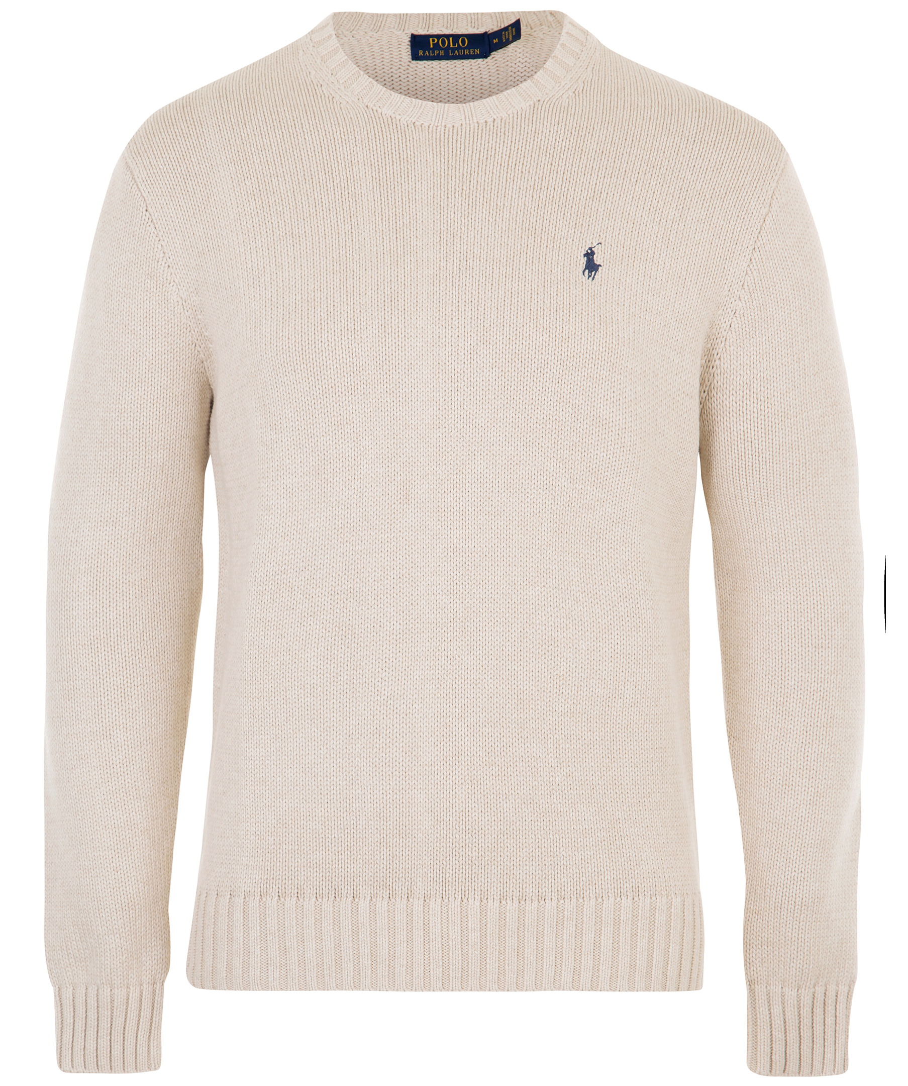 Beige stickad tröja , från Polo Ralph Lauren. Rundad halsringning, broderad logotyp på bröstet samr ribbstickade muddar i ärm- och plaggslut . Gjord i 100% bomull