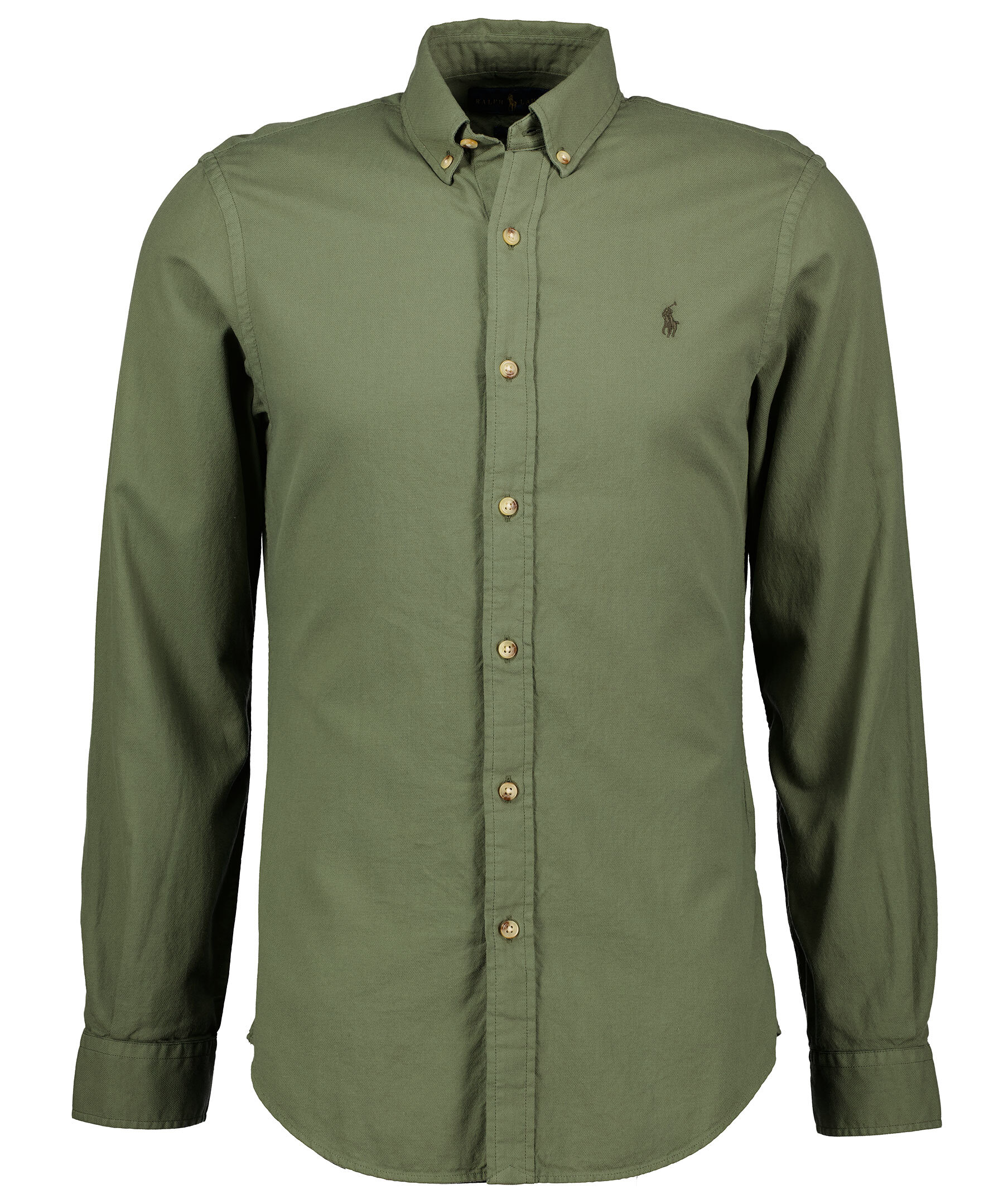Khakigrön skjorta från Ralph Lauren i slim fit modell. Tillverkad i tunt bomullsmaterial. Button down-krage, sköldpaddsfärgade knappar fram, på kragen och i ärmslut samt broderad logotyp i ton-i-ton på bröstet.