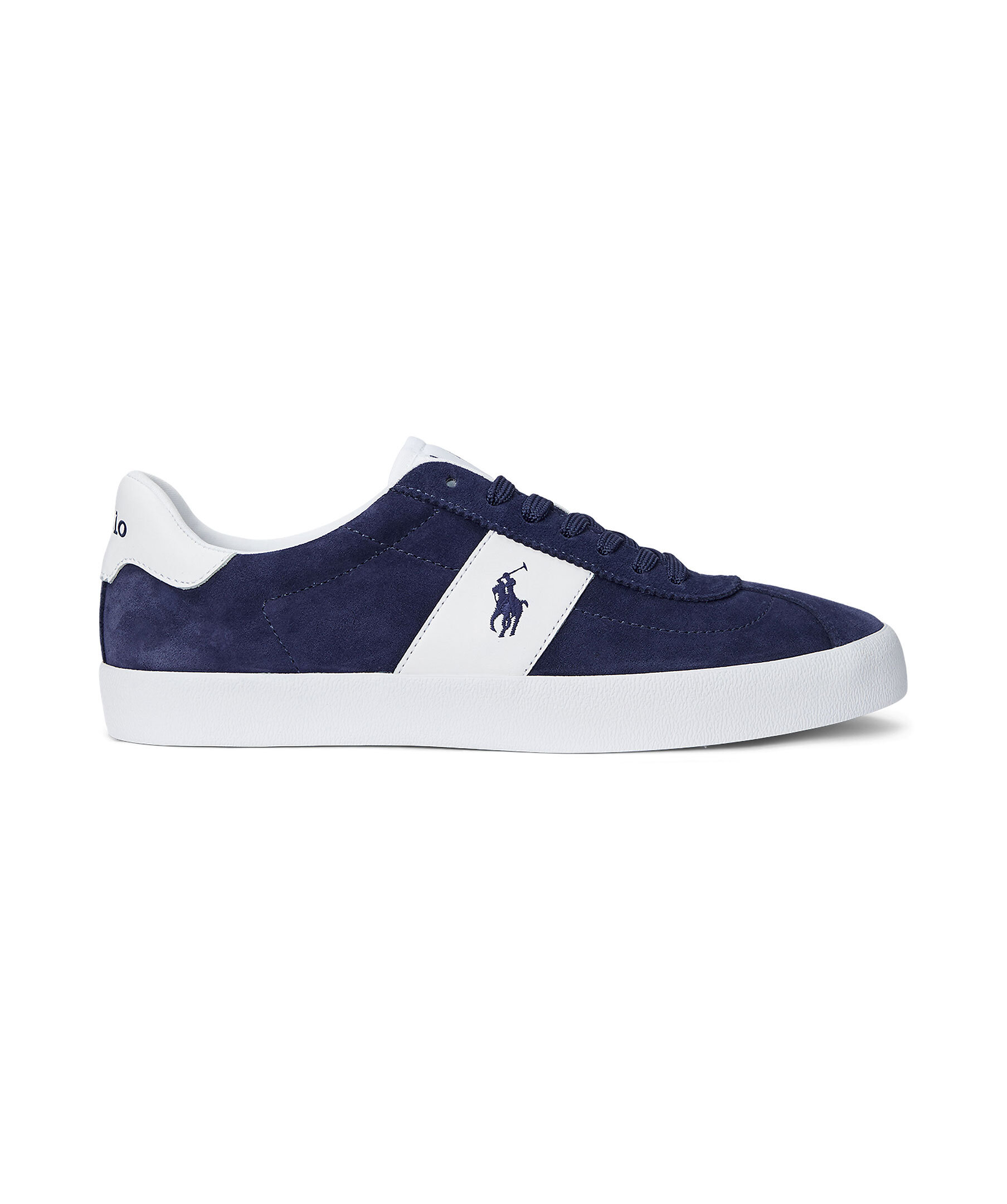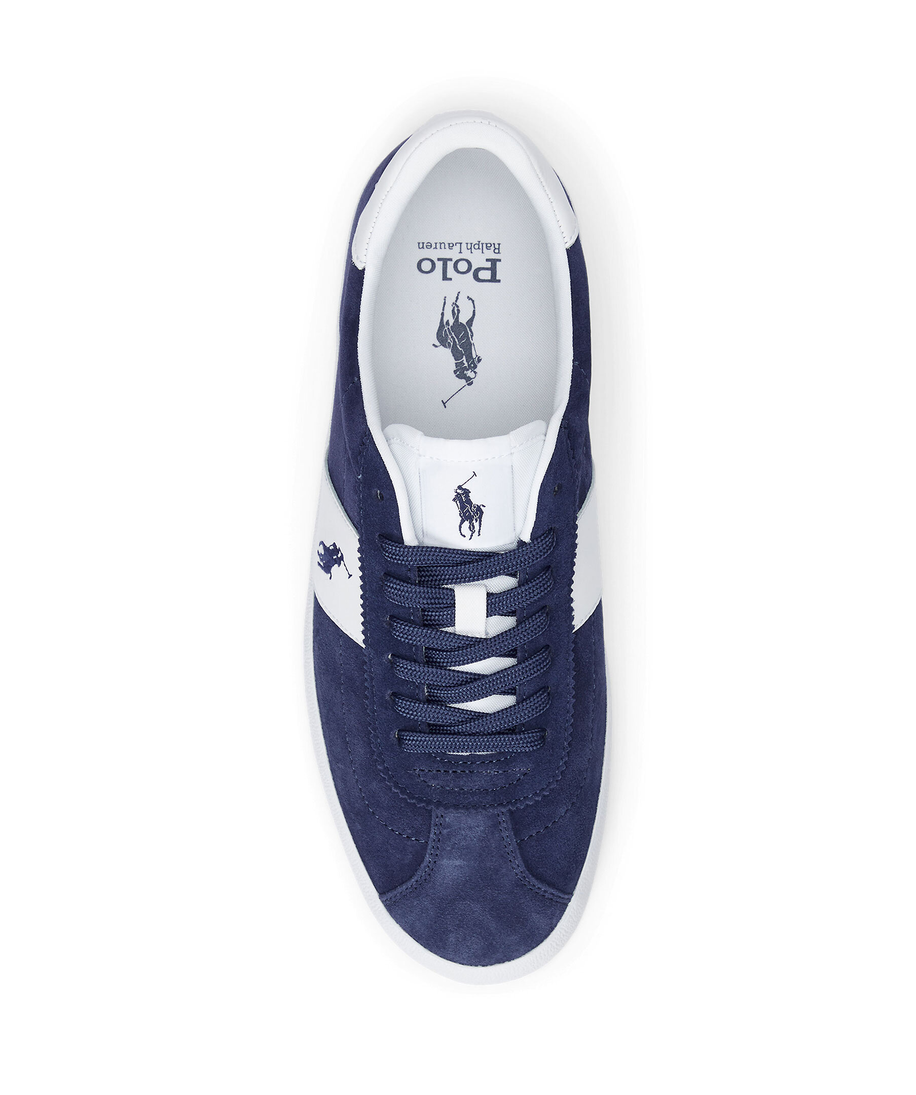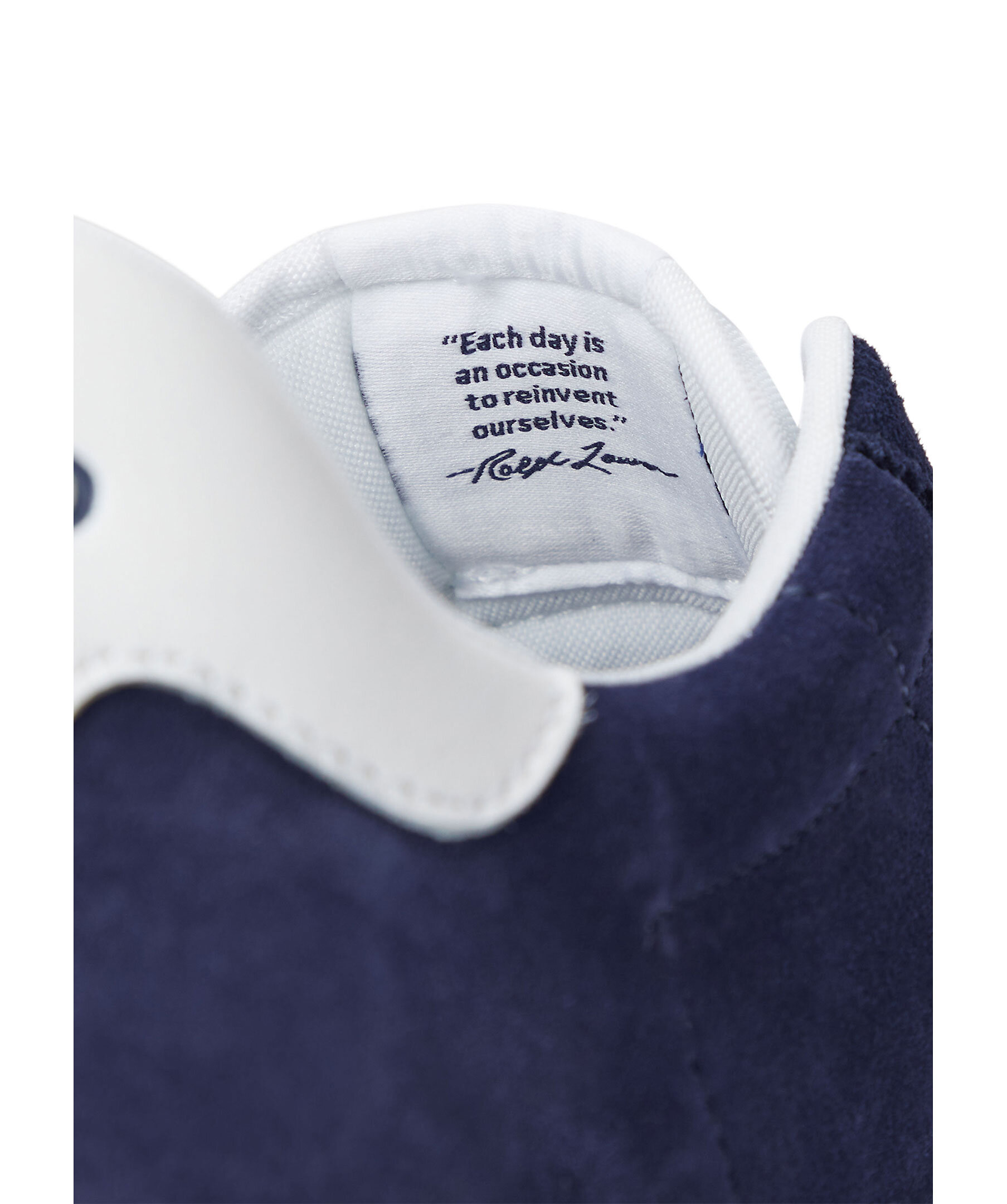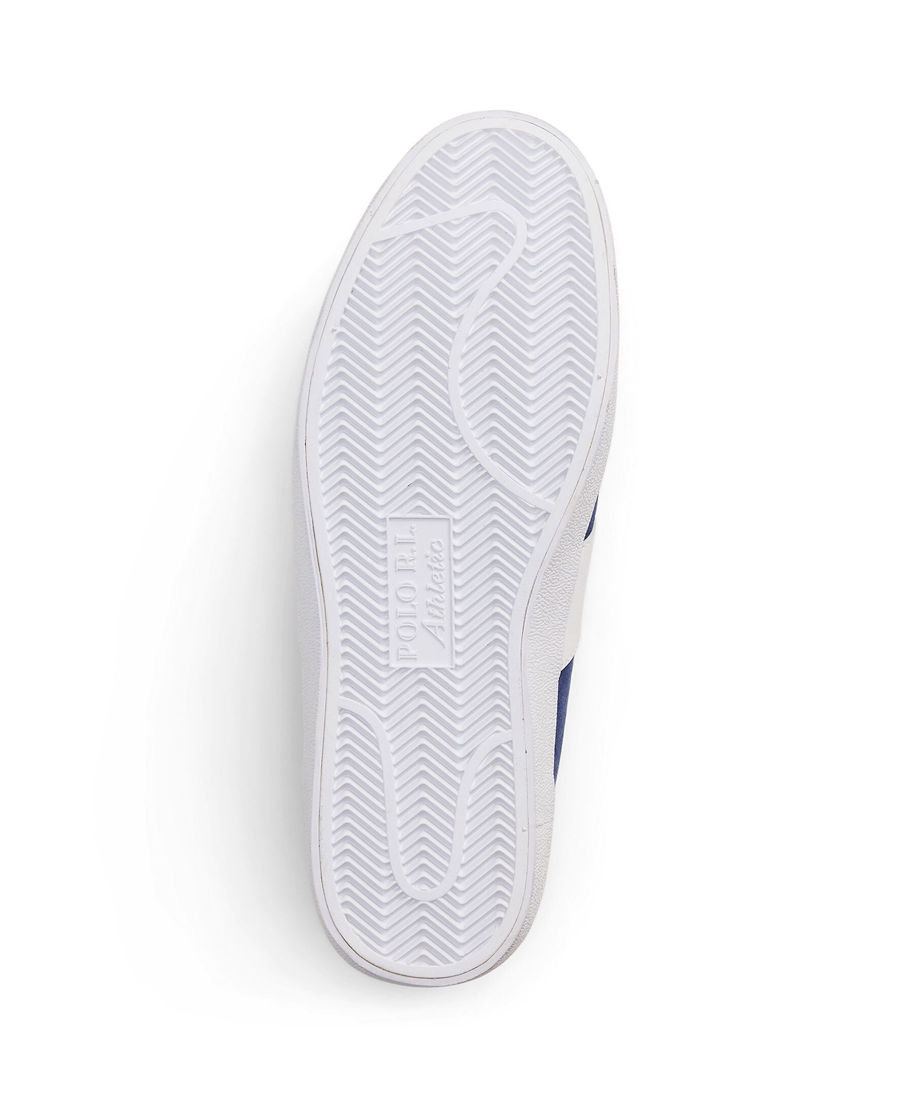 Vita och blåa sneakers från Polo Ralph Lauren. Skorna har en vit sula samt logotyp på hälen, plösen och utsidan. Blåa detaljer i mocka. Tillverkade i läder.