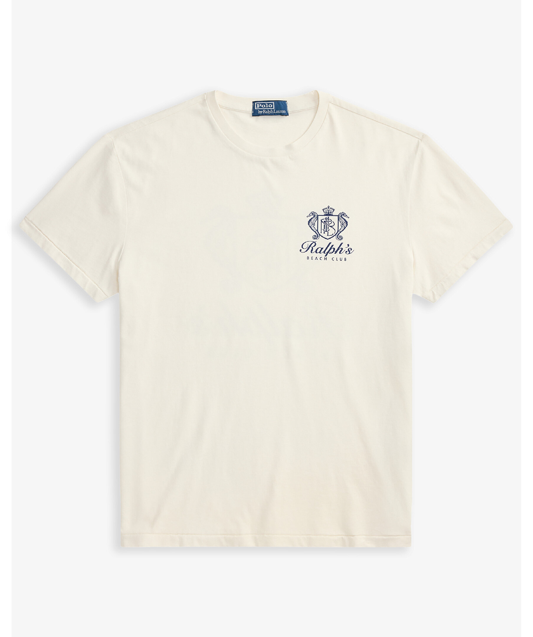 Krämvit t-shirt från Polo Ralph Lauren. Denna bomulls-T-shirt är en del av säsongens kollektion inspirerad av det kristallklara vattnet och de livfulla solnedgångarna i Karibien och har ett signaturtryck med sjöhästar som "Ralph's Beach Club".