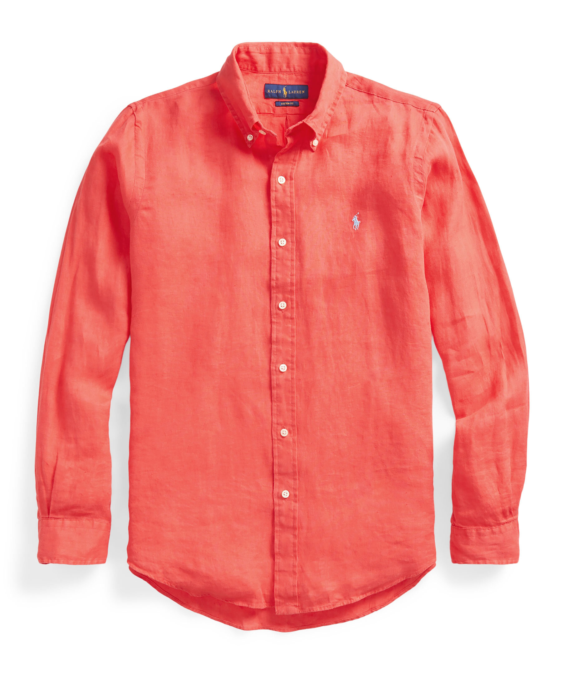 Korallröd skjorta från Polo Ralph Lauren. Tillverkad i 100% linne. Custom fit, button down krage, broderad logotyp på bröstet.