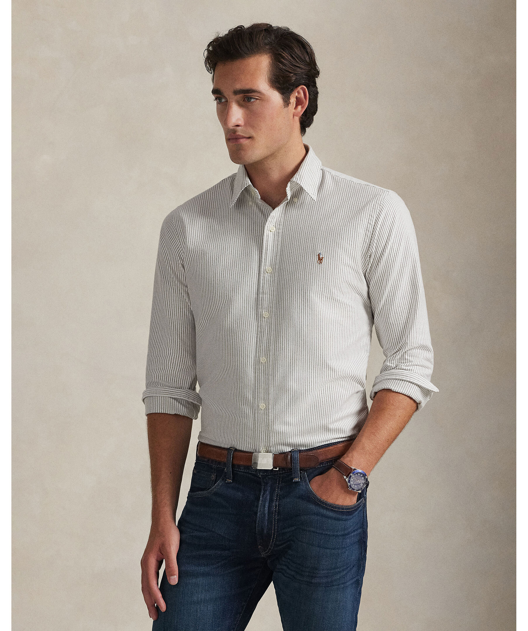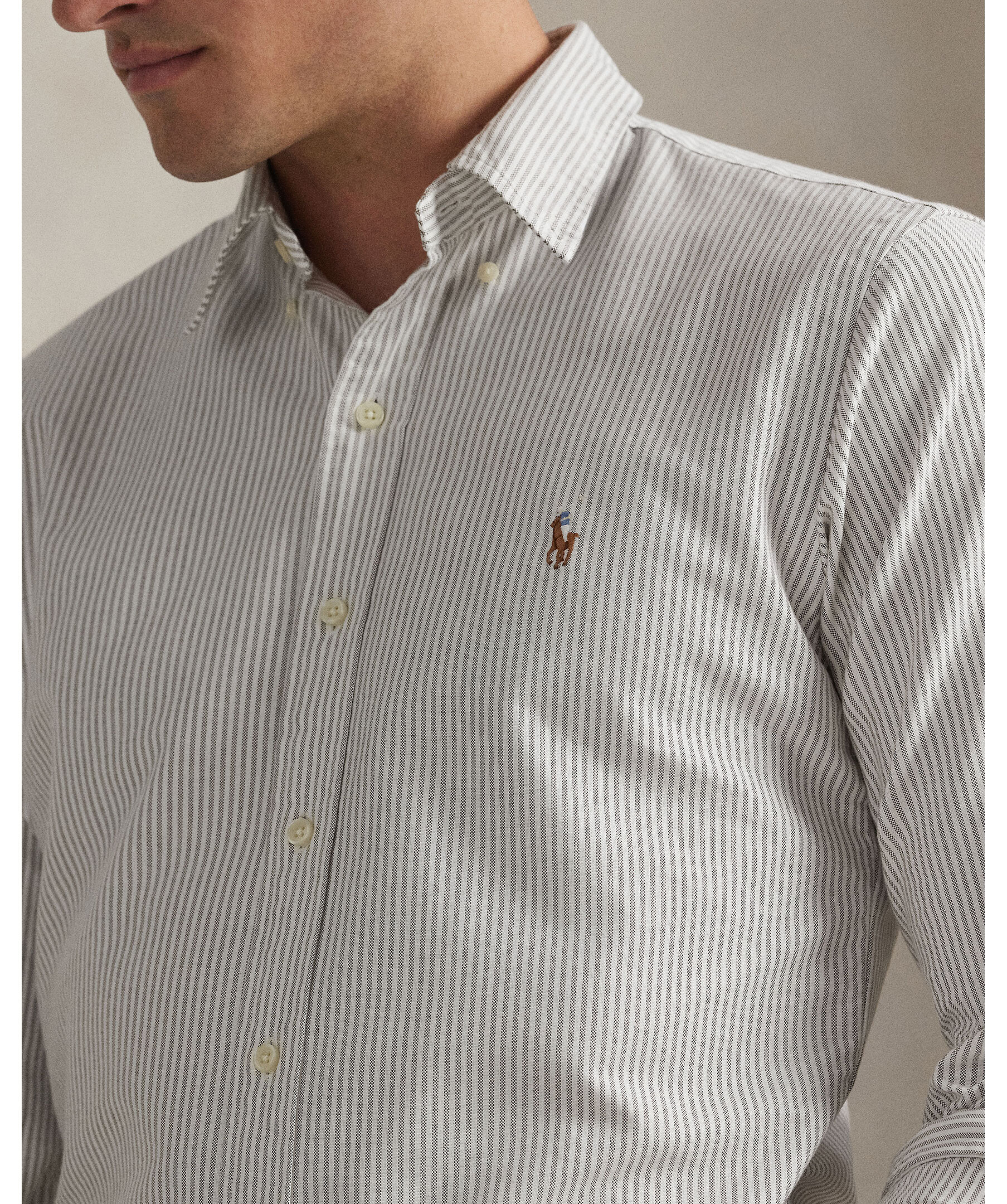 En klassisk oxfordskjorta i smalare “custom fit”-passform med randigt mönster från Polo Ralph Lauren. Tillverkad i bomulls-oxford, med knappkrage och klockren preppy känsla — perfekt både till kontoret och i fritidsstilen.