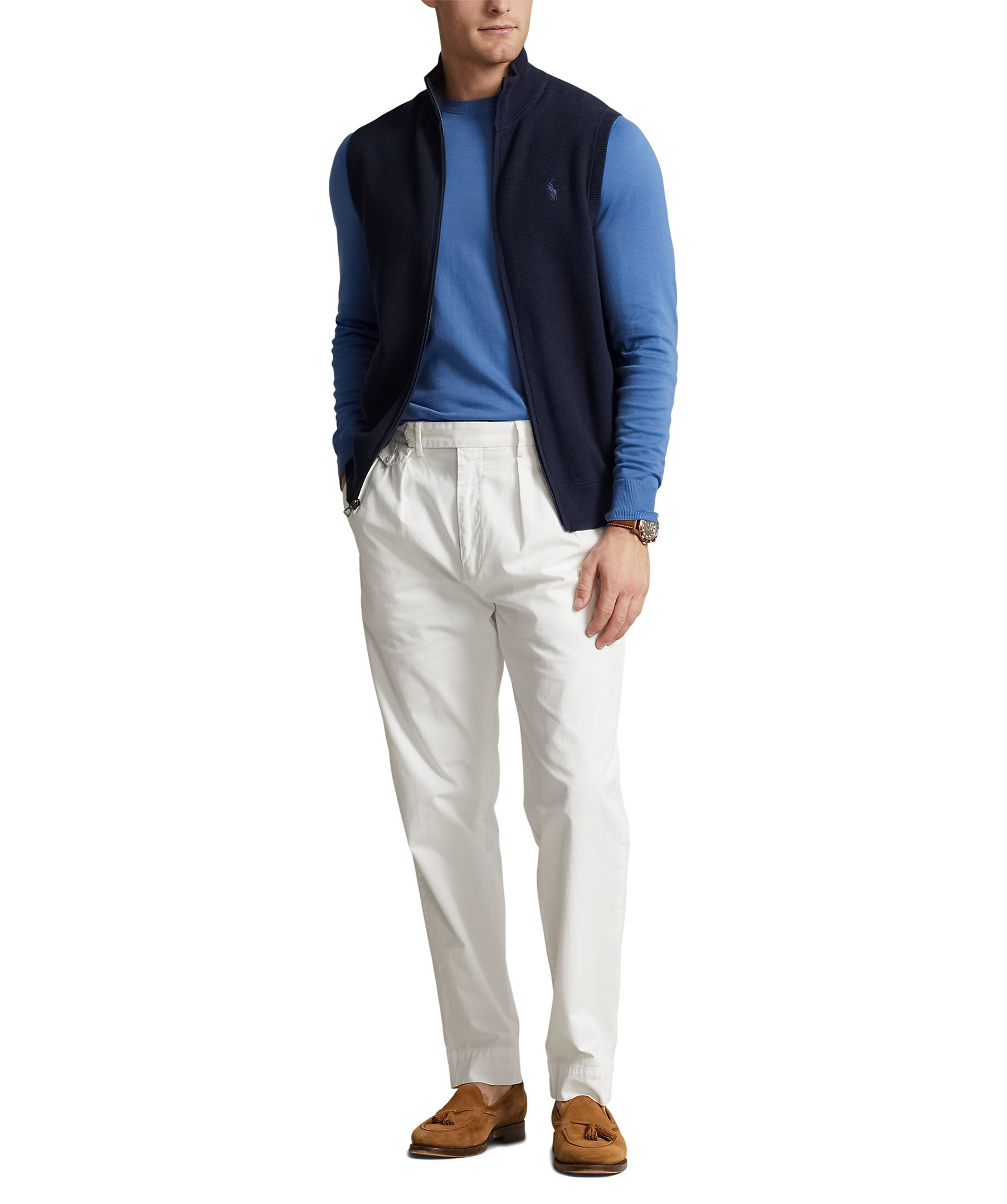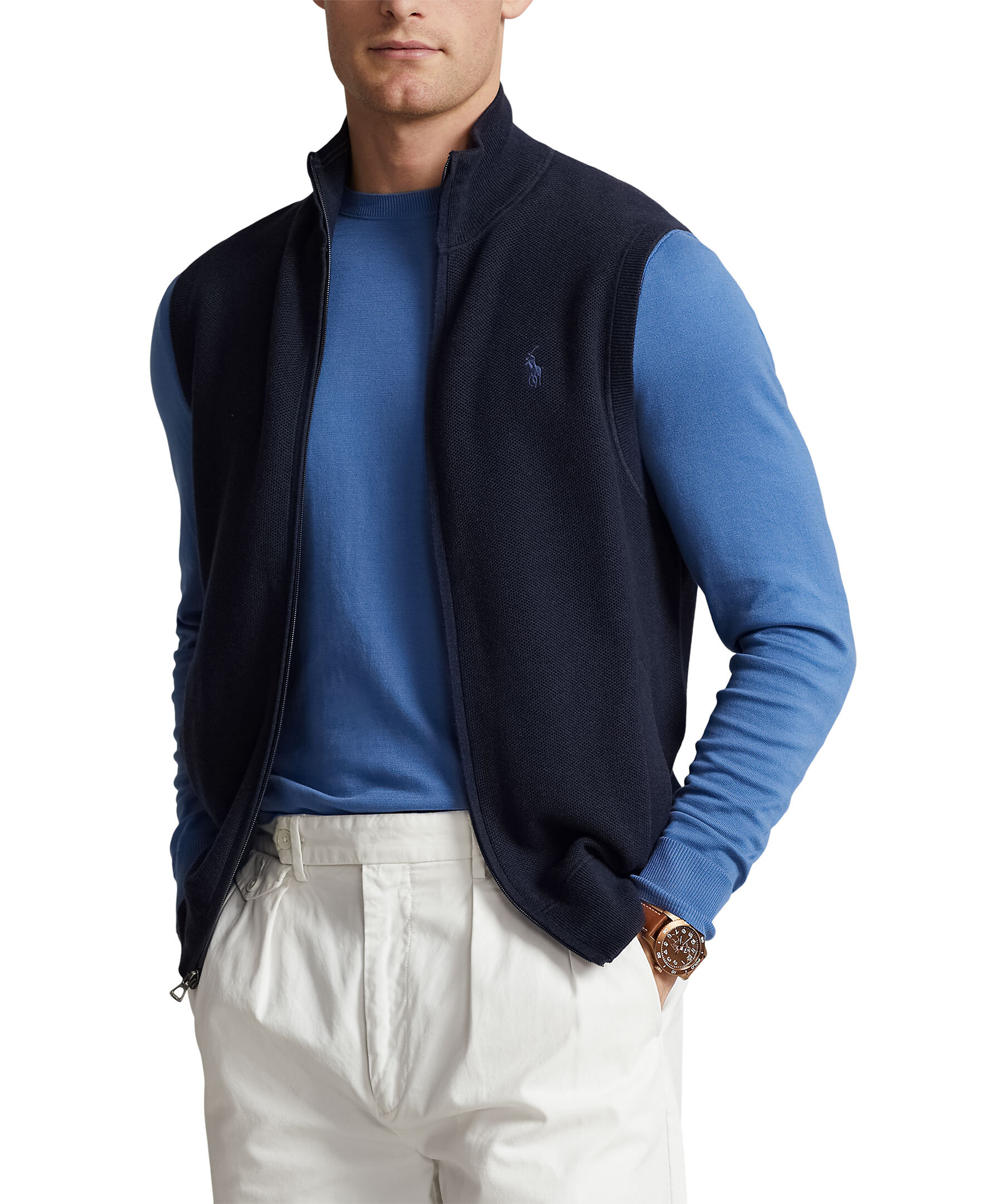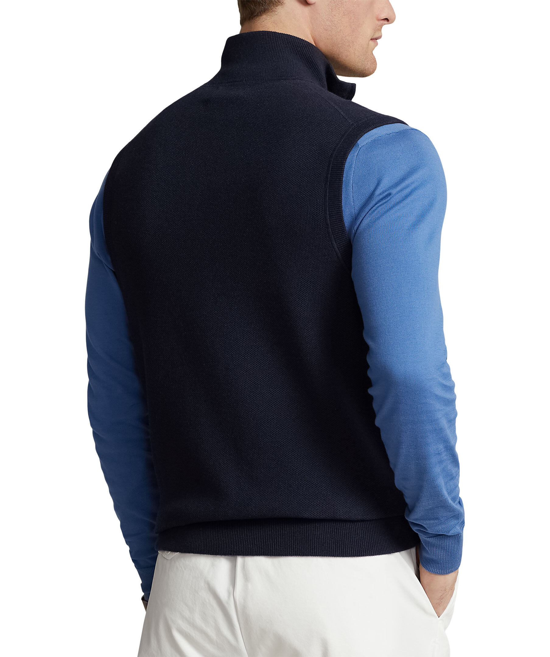 Marinblå väst från Polo Ralph Lauren. Stängs med heldragkedja och har två sidfickor. Ribbstickad mockneck, fåll och ärmhål. Broderad signaturpony på vänster bröst. Normal passform. Tillverkad i bomull.