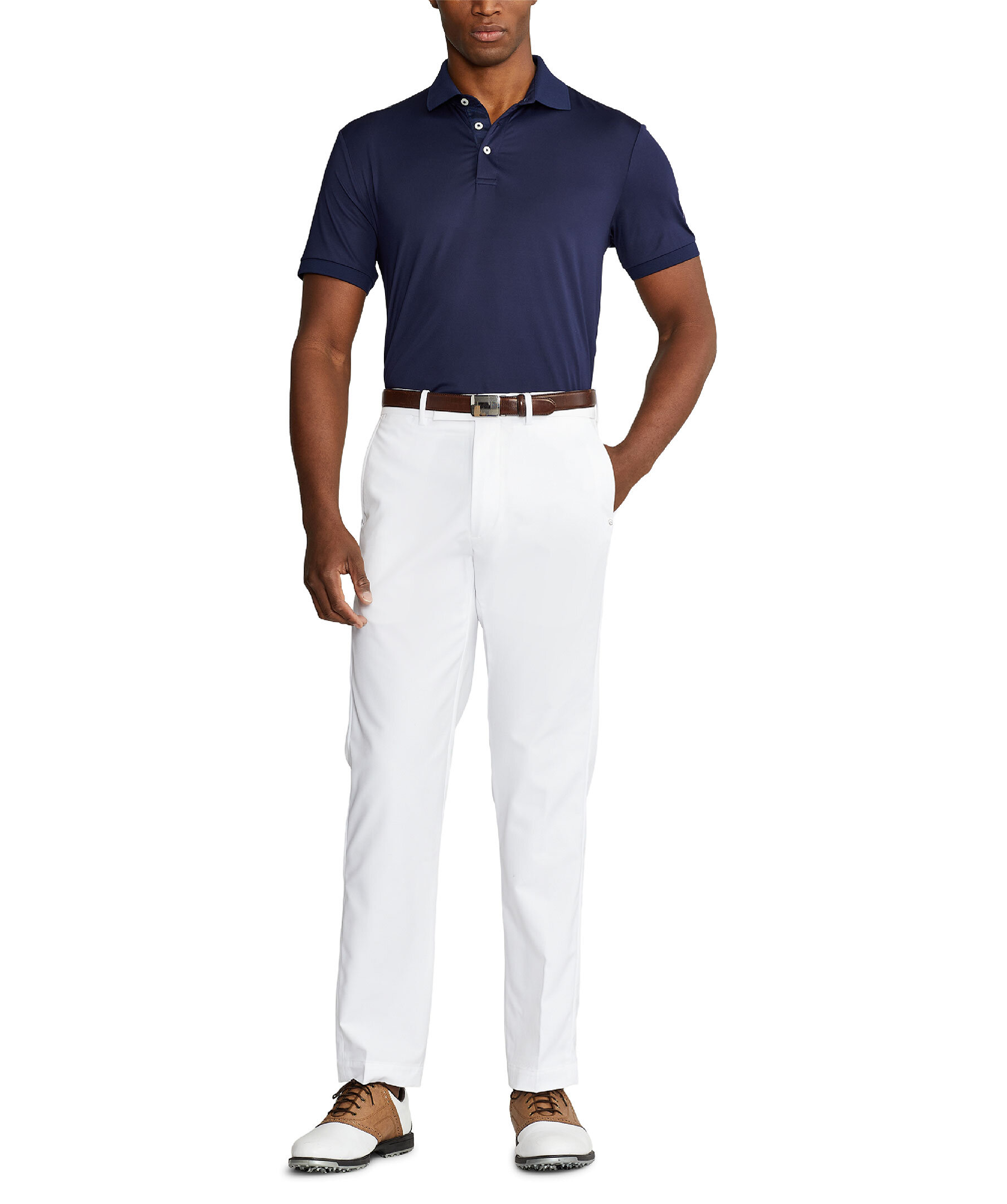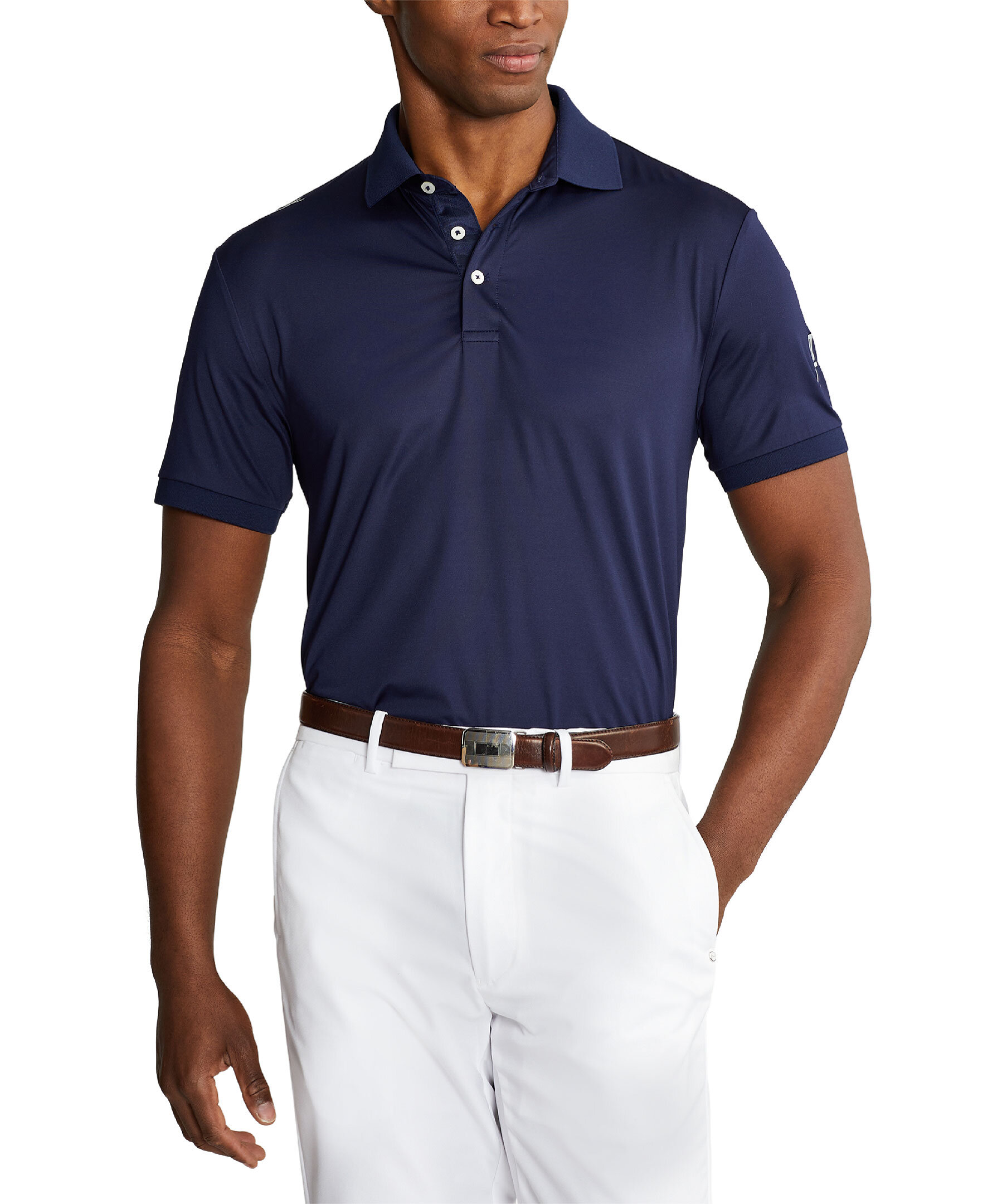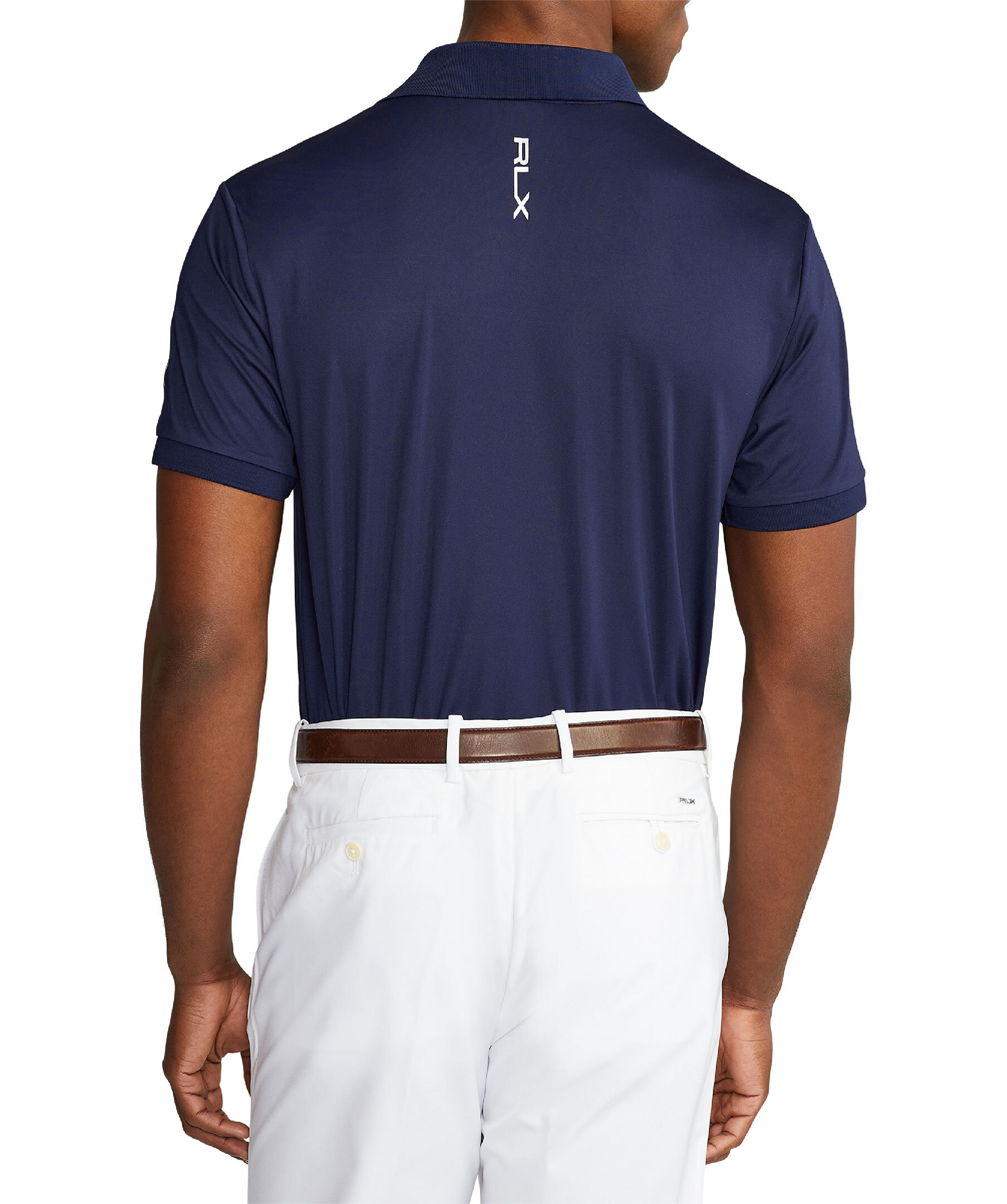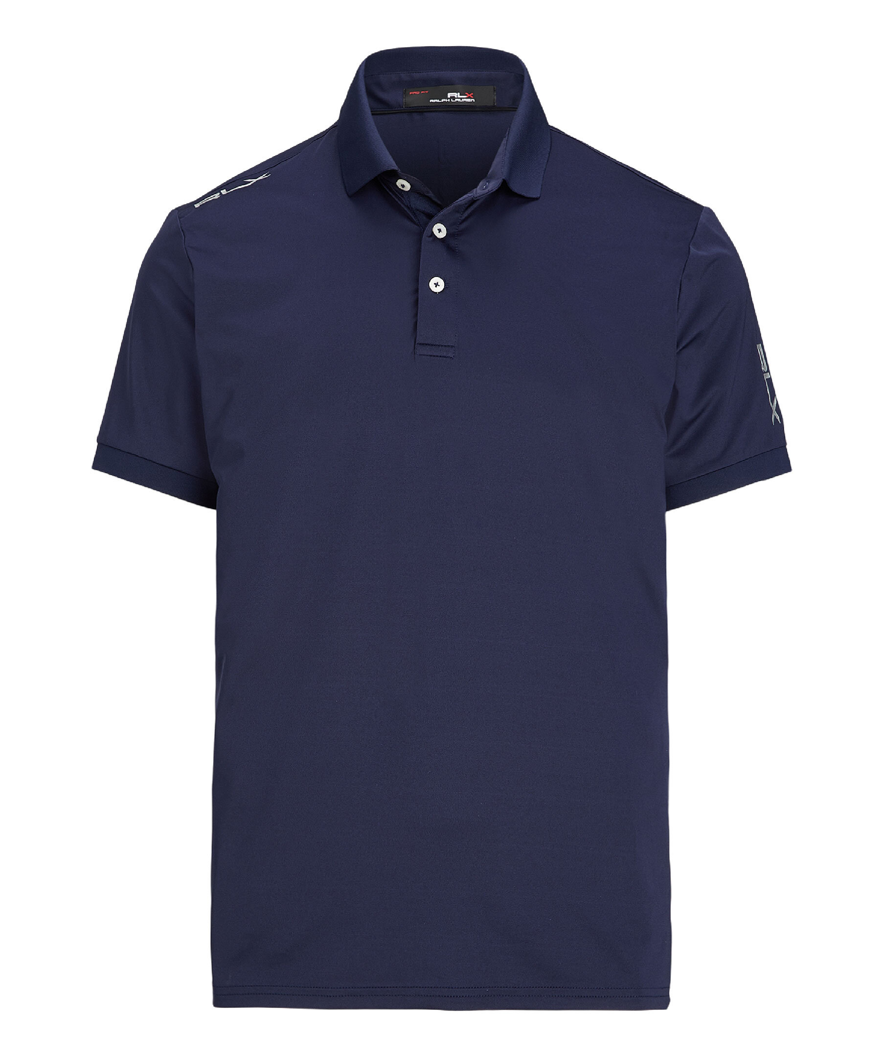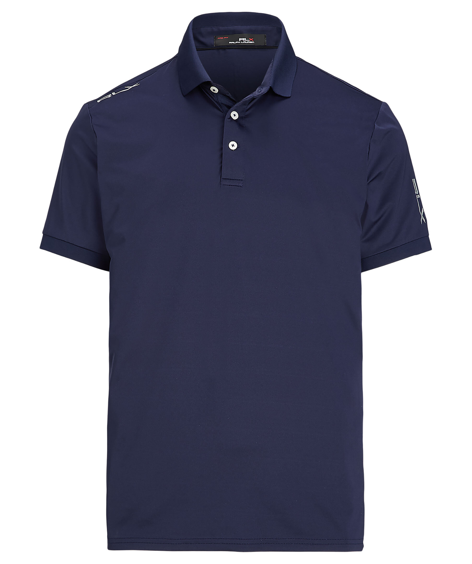 Marinblå lätt golf-pikétröja från Polo Ralph Lauren RLX. Den har fukttransporterande egenskaper för att hålla dig sval och bekväm på banan. Ribbstickad polokrage. Knappslå med tre knappar. "RLX" broderad och tryckt på höger axel, vänster ärm och nacken bak. Dess andningsbara stretchtröja är tillverkad av återvunnen polyester, vilket förstärker Ralph Laurens mål att skapa produkter av högsta kvalitet med minimal skada på miljön.