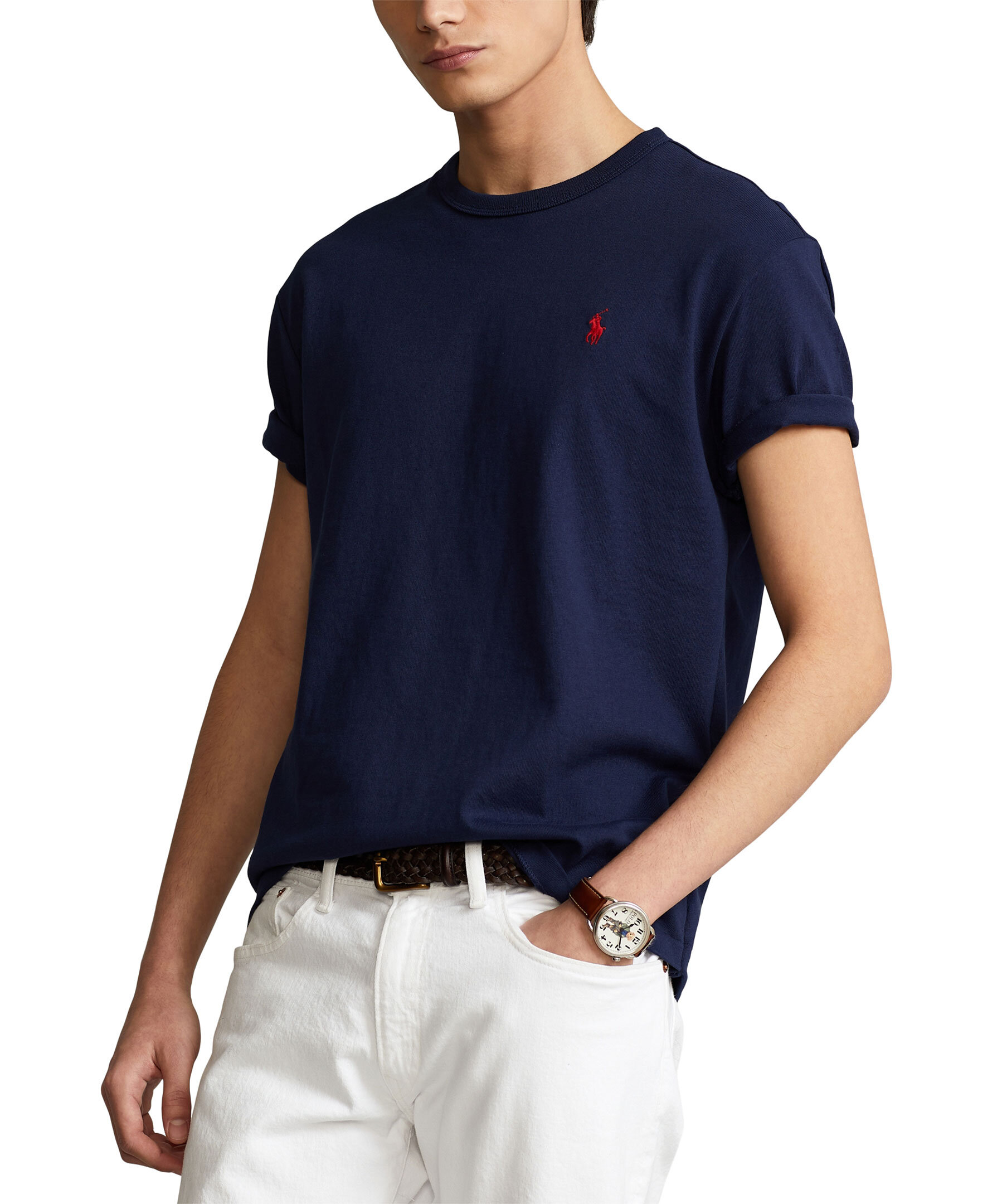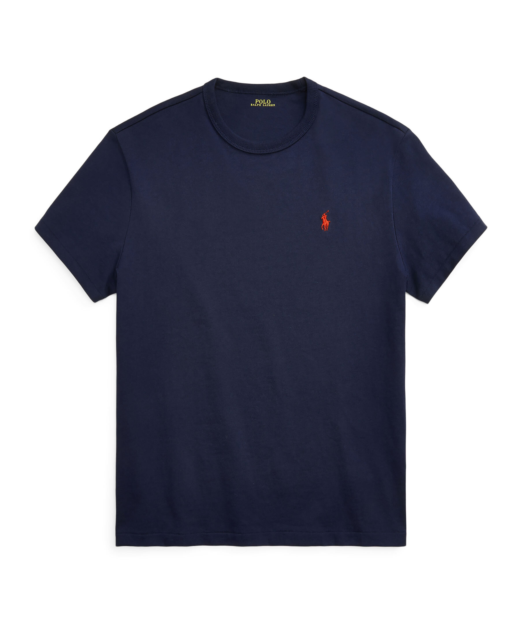 Marinblå t-shirt från Polo Ralph Lauren. Rundad ribbad halsringning, en broderad logga på vänster bröst och har en klassisk passform. Tillverkad i 100% Bomull.