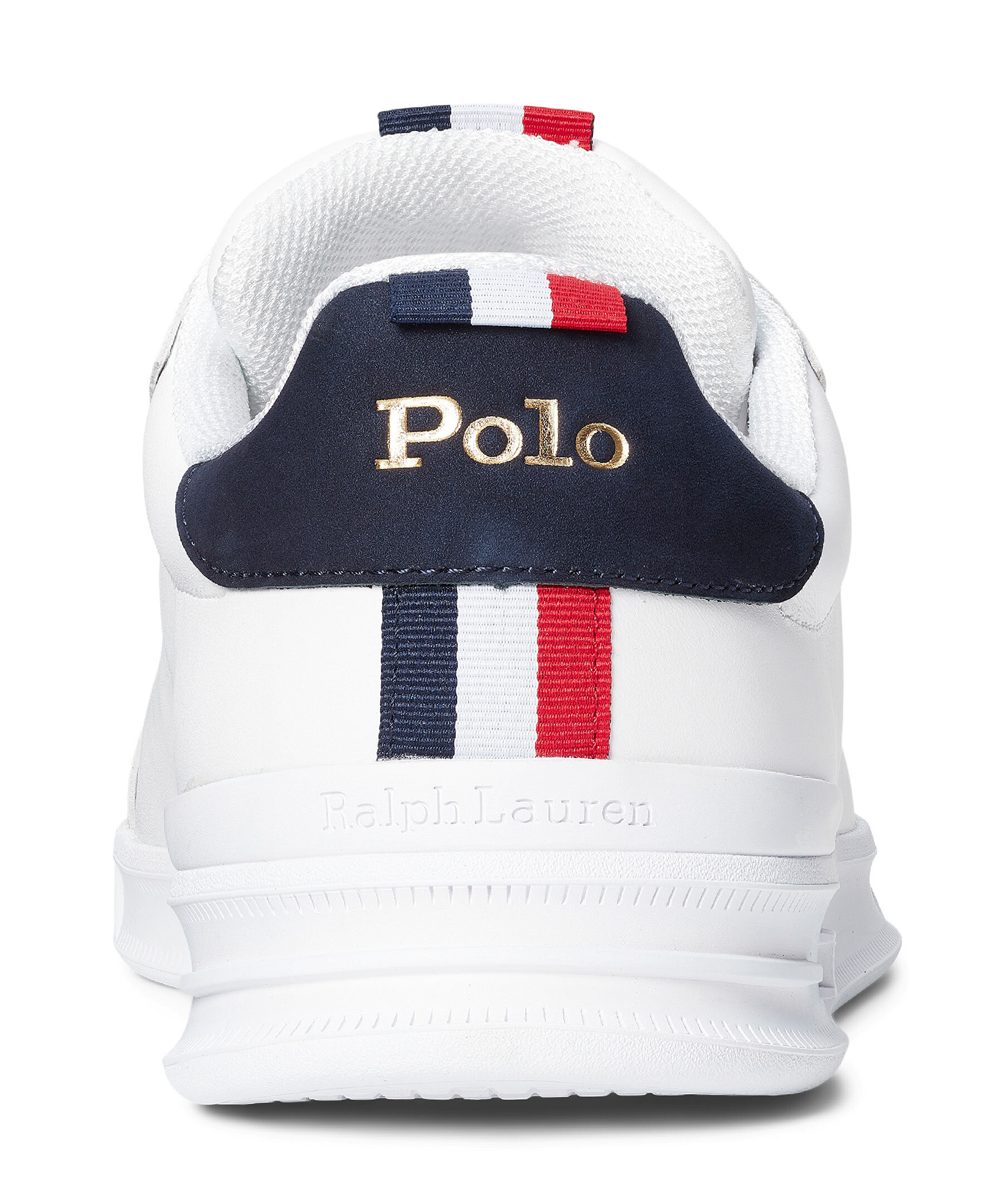 Vita sneakers i läder från Polo Ralph Lauren. Klassisk och mångsidig lågsko med en enkel design och guldfärgad logotyp på plösen och präglad logga på sidorna av sulan. Vita skosnören och vit sula i gummi samt marinblå logotyp på yttersidan samt marinblå detalj bak på hälen och tre ränder i vit, marinblått och rött på hälen.