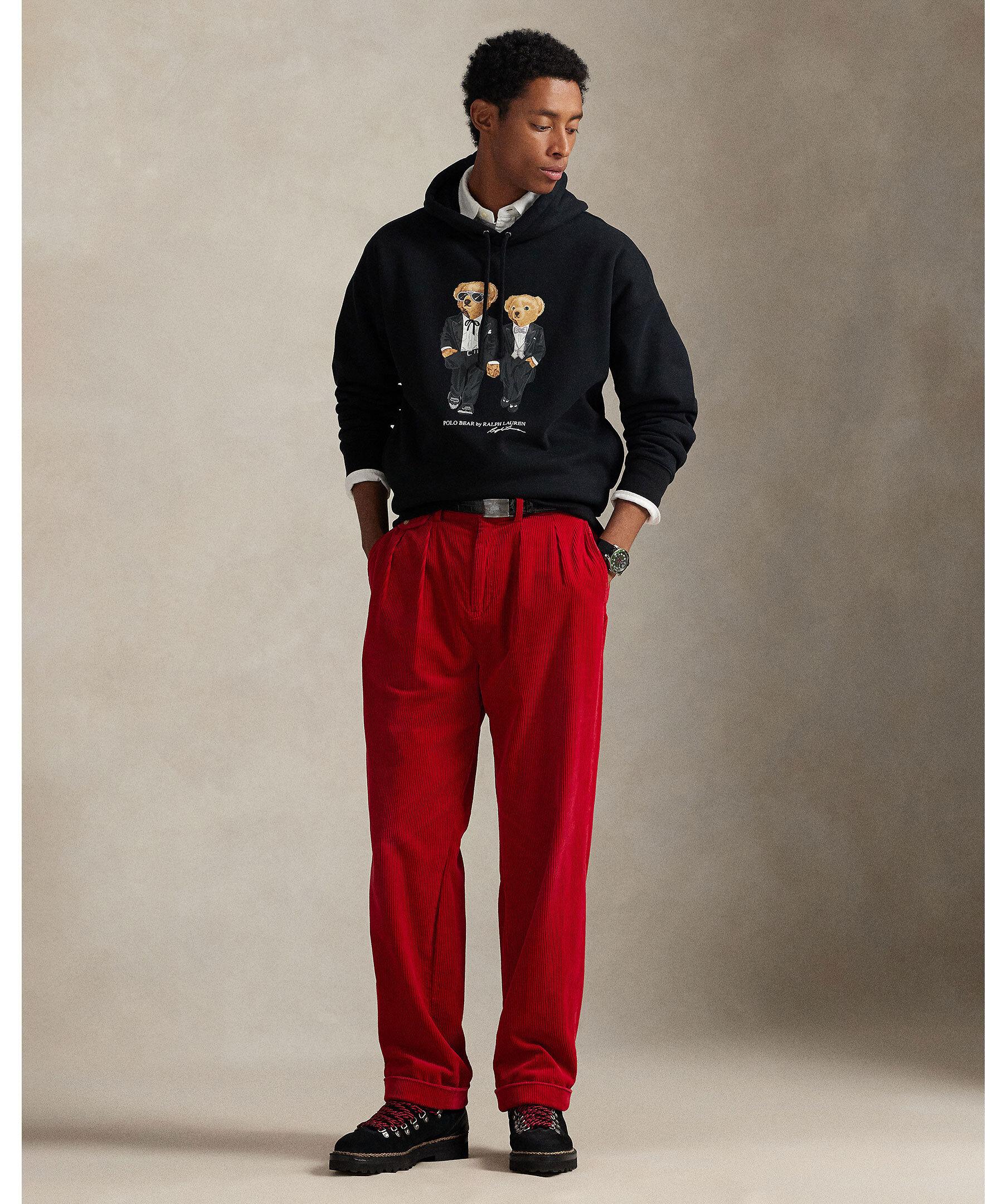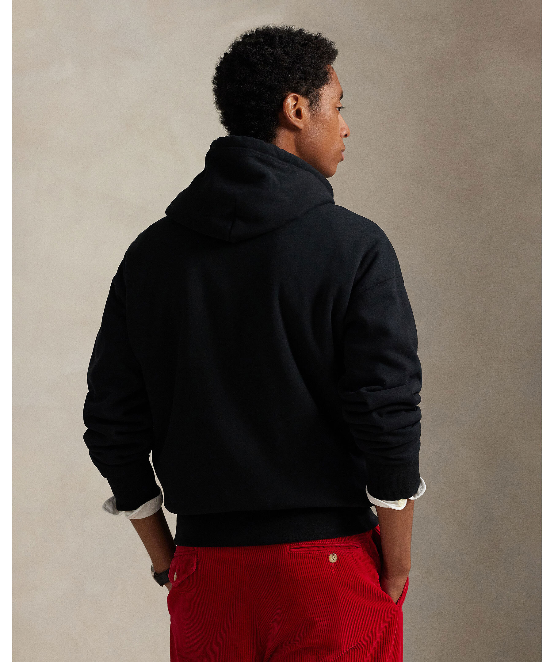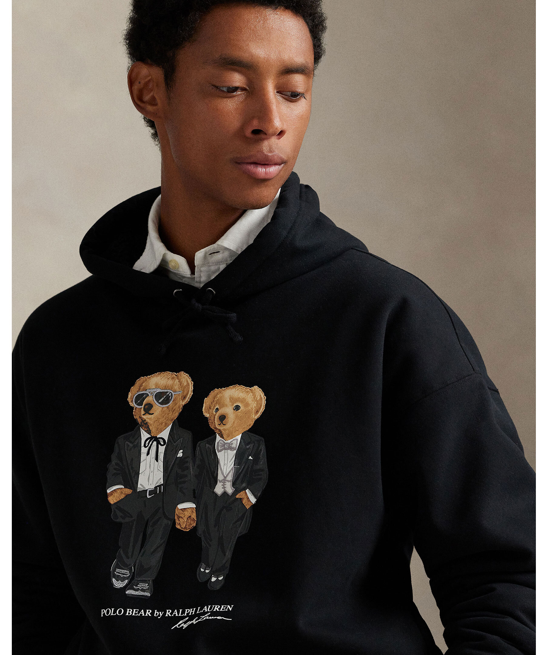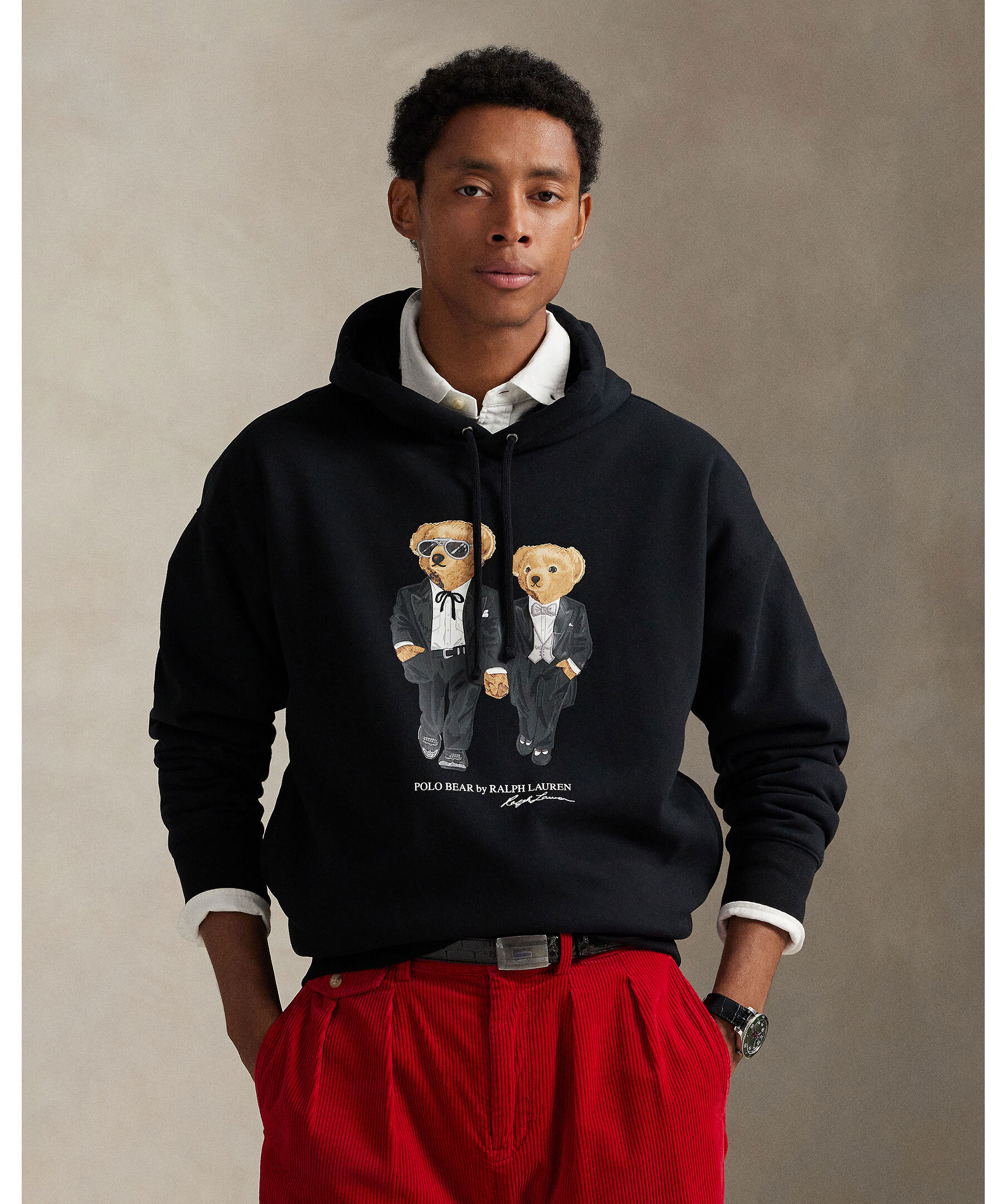Svart hoodie från Polo Ralph Lauren. Mjukt foder och klassisk dragsko vid huvan. Framtill pryds den av två ikoniska Polo Bears klädda i smoking, vilket ger en lekfull men stilfull look. Ribbstickade muddar och fåll för en bekväm passform.