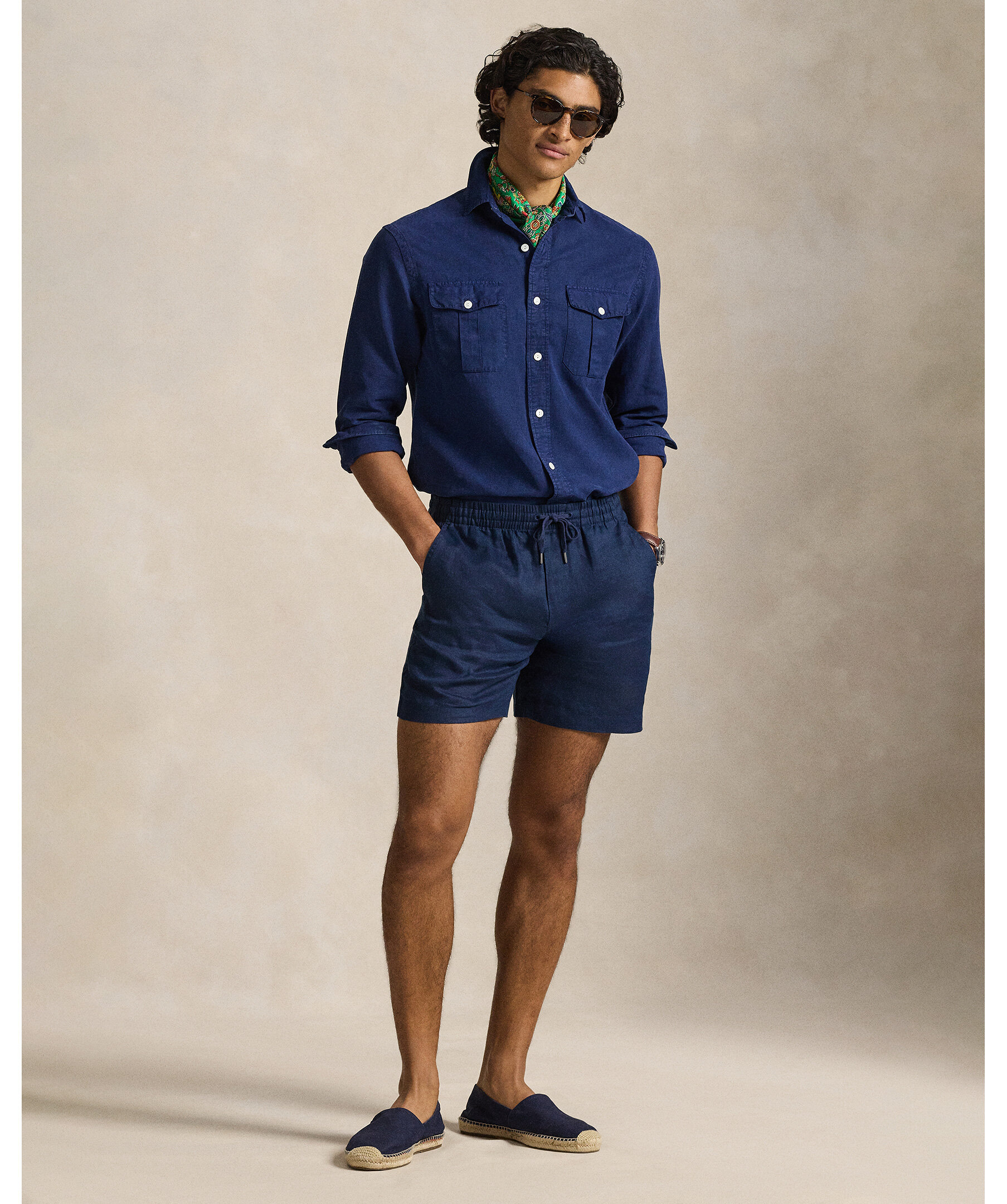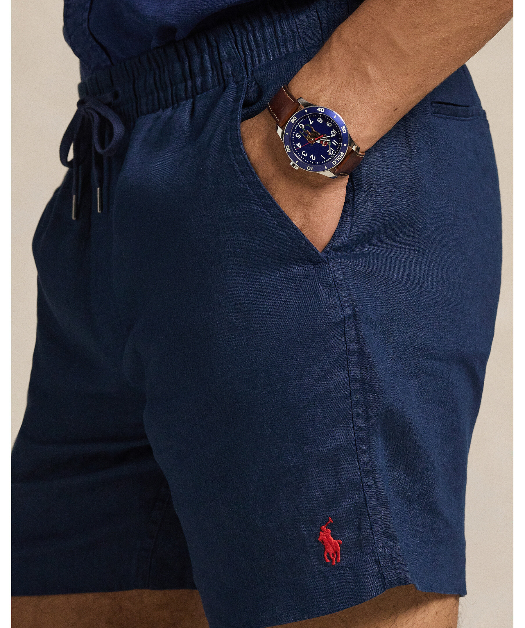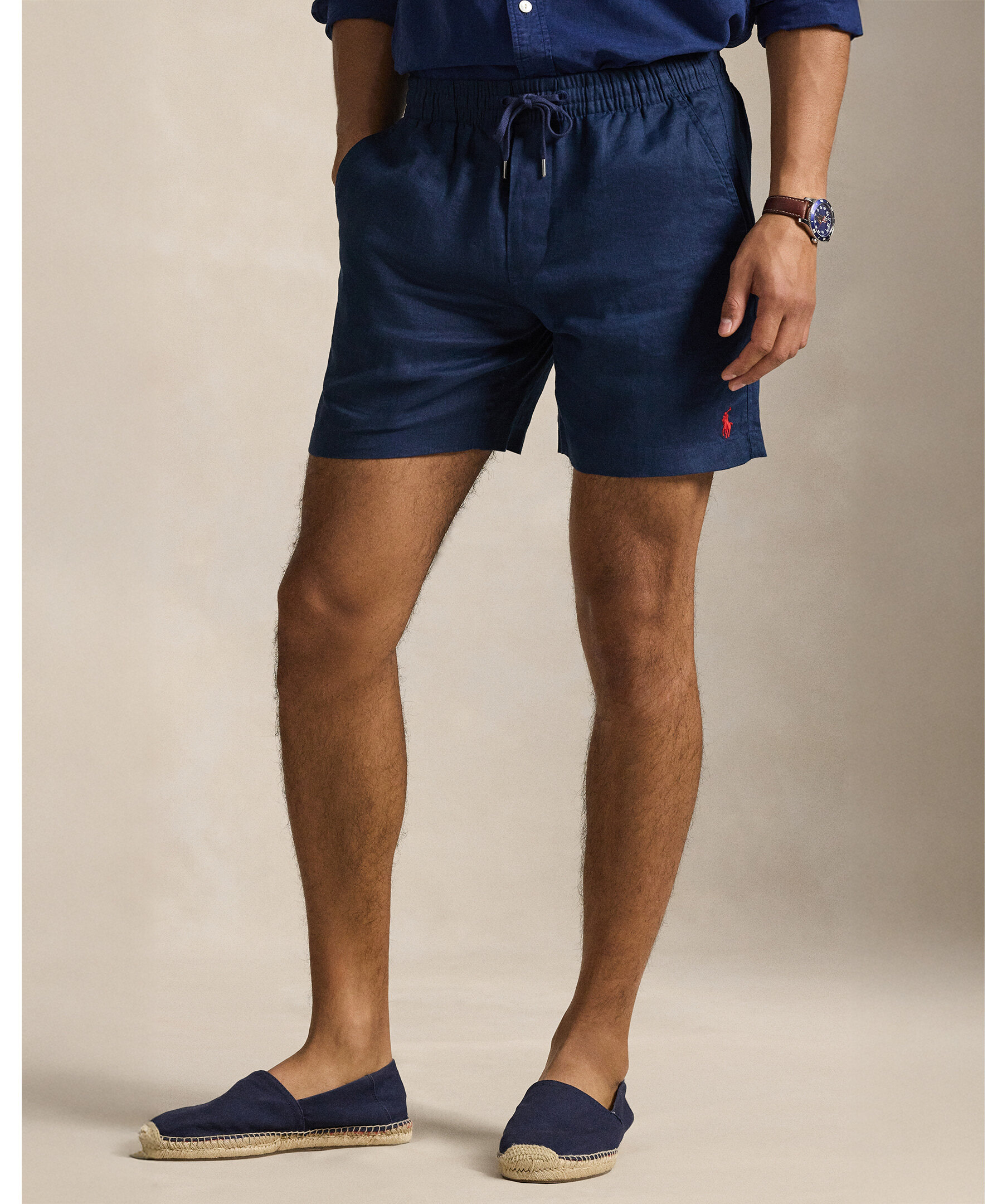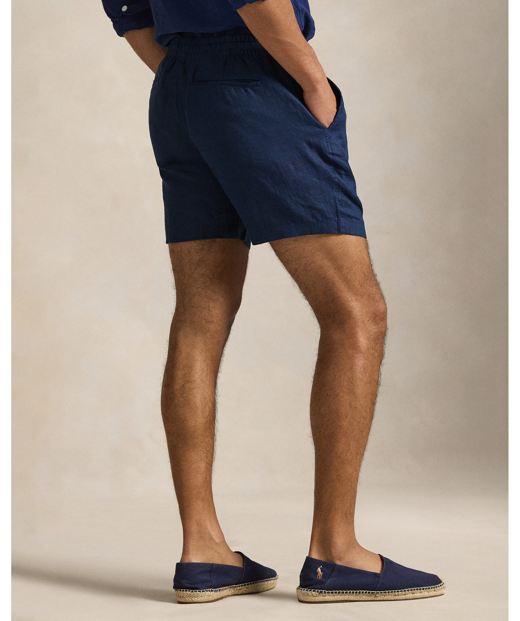 Mörkblå linneshorts shorts med 15 cm innerbenslängd med dragsko i midjan från Polo Ralph Lauren.
