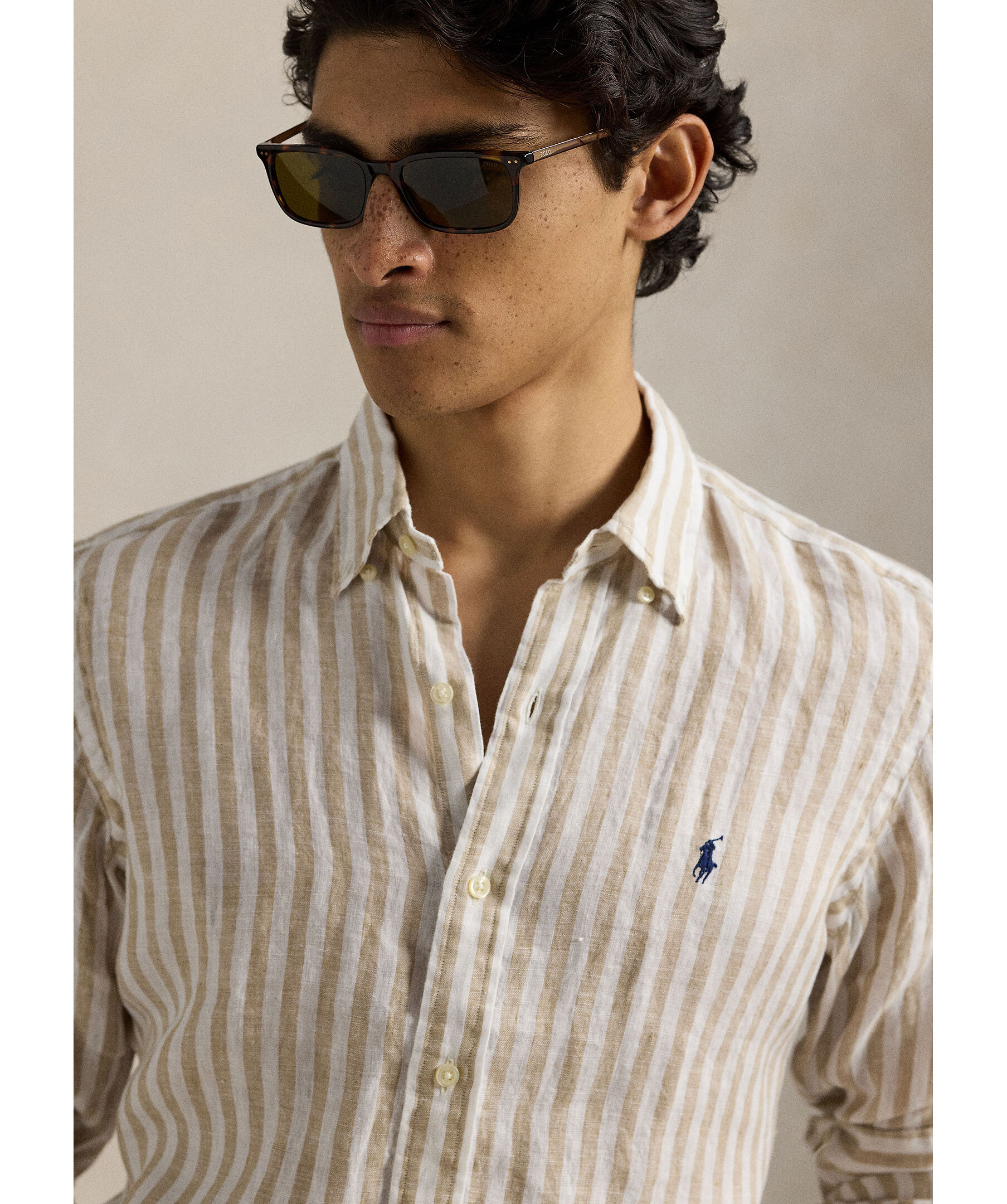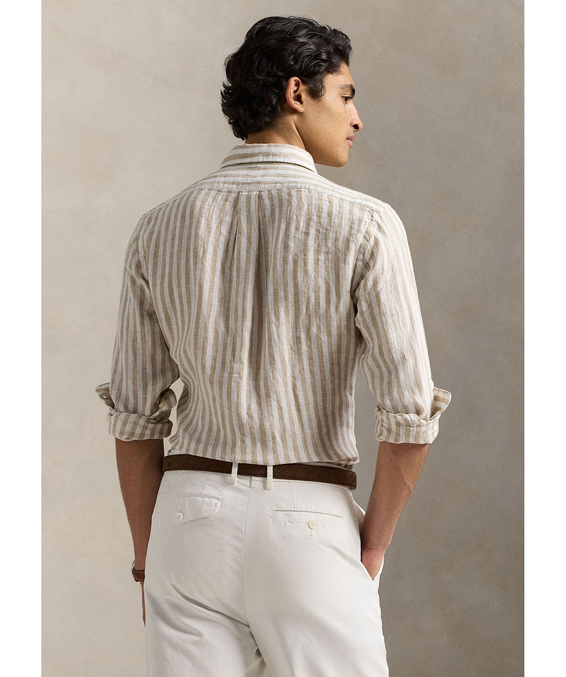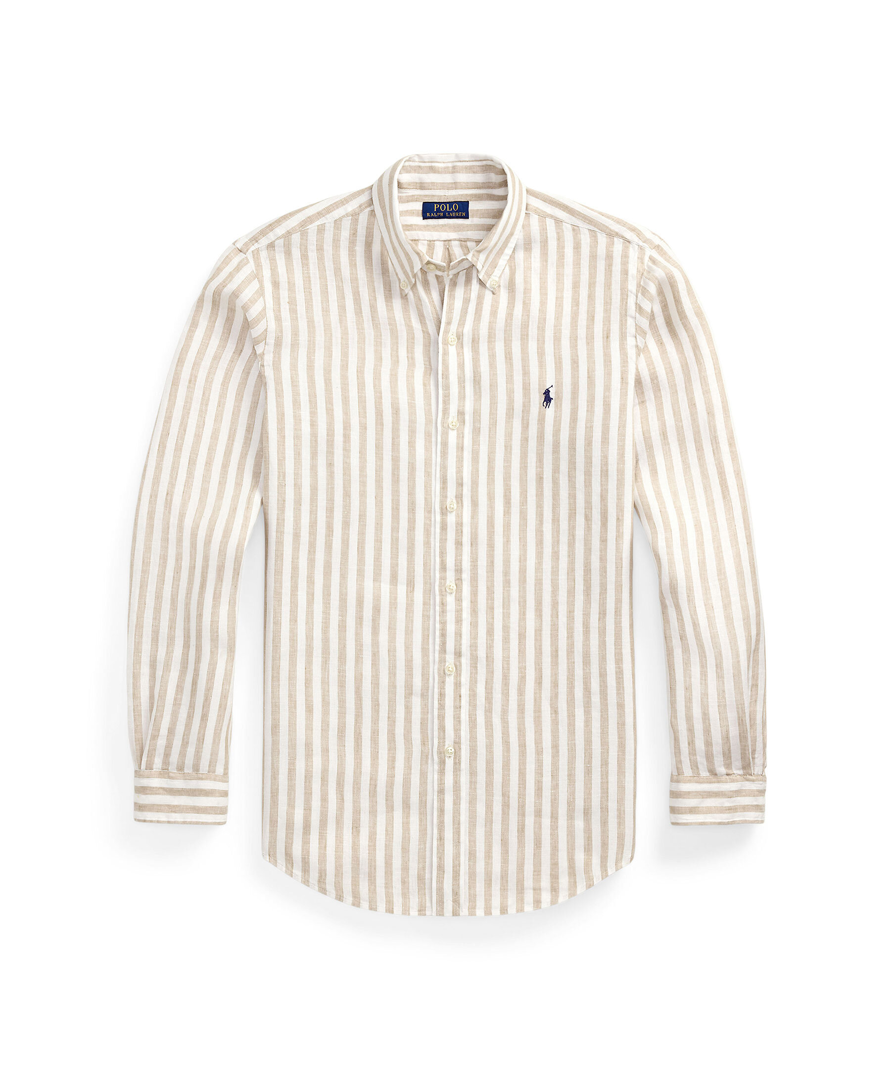 Beigerandig linne skjorta från Polo Ralph Lauren. Skjortan har button down-krage och rundade avslut. Broderad liten logotyp på bröstet. Tillverkad av linne.