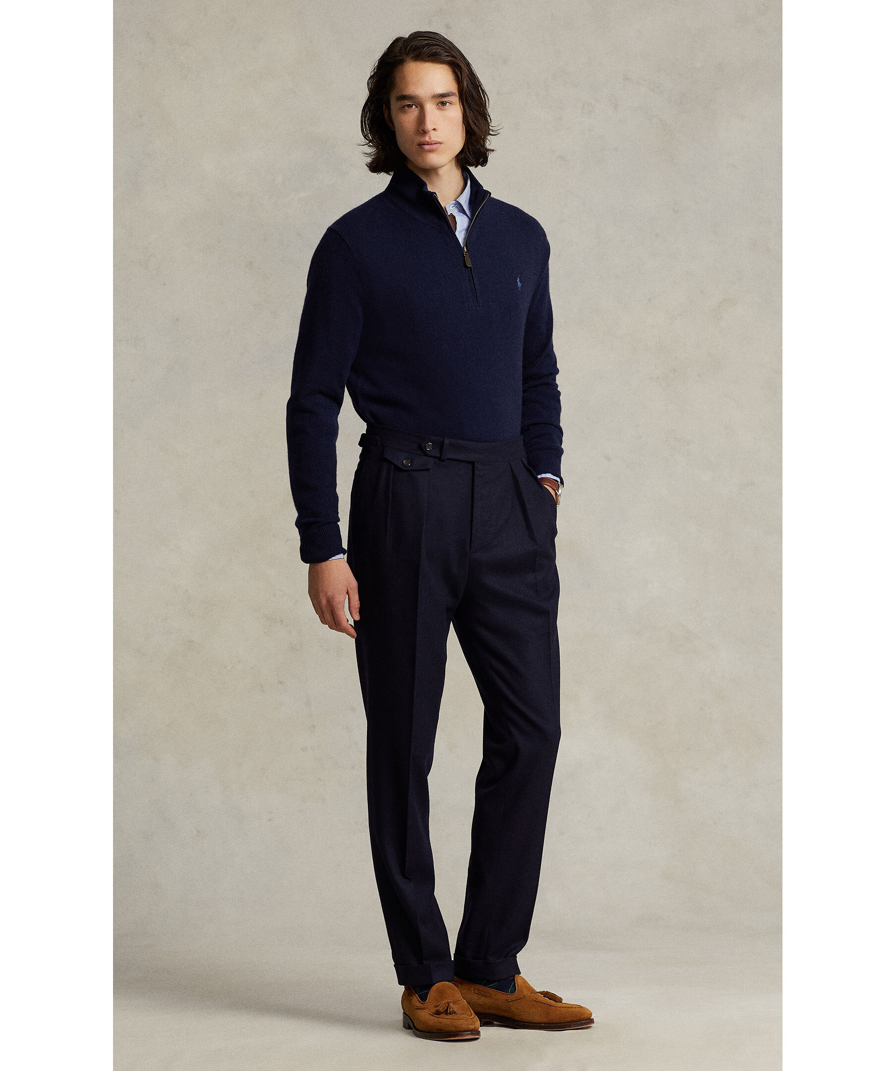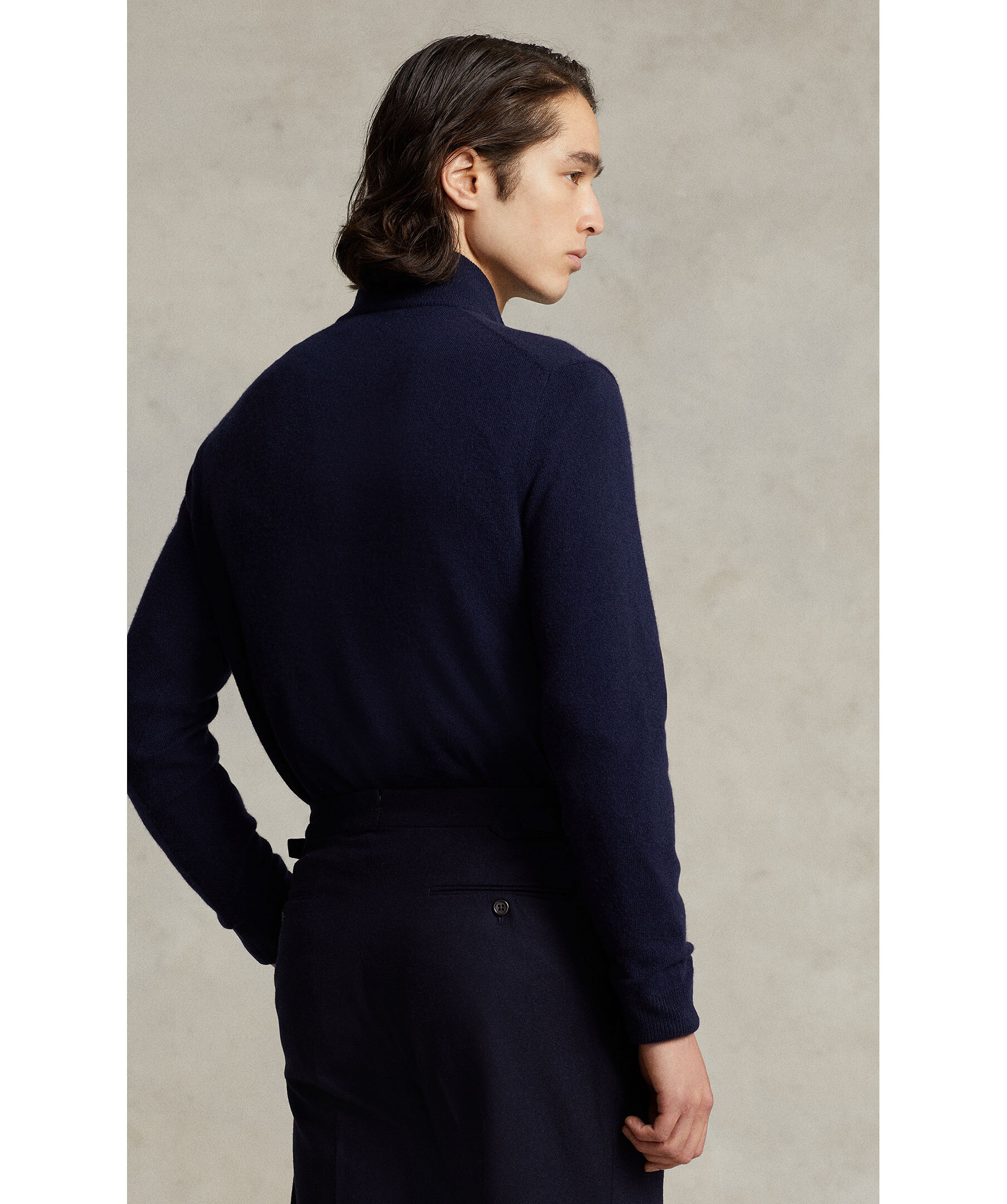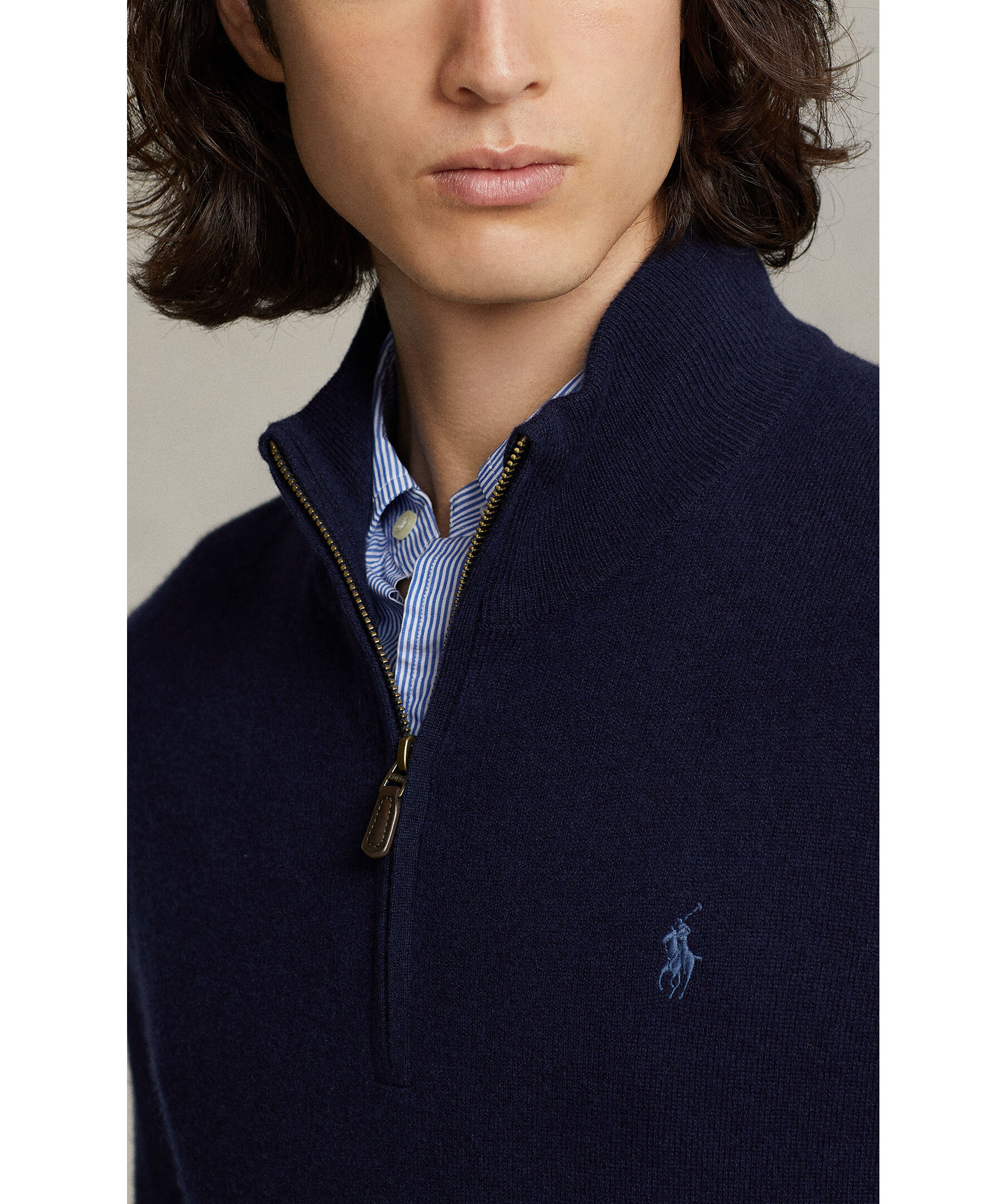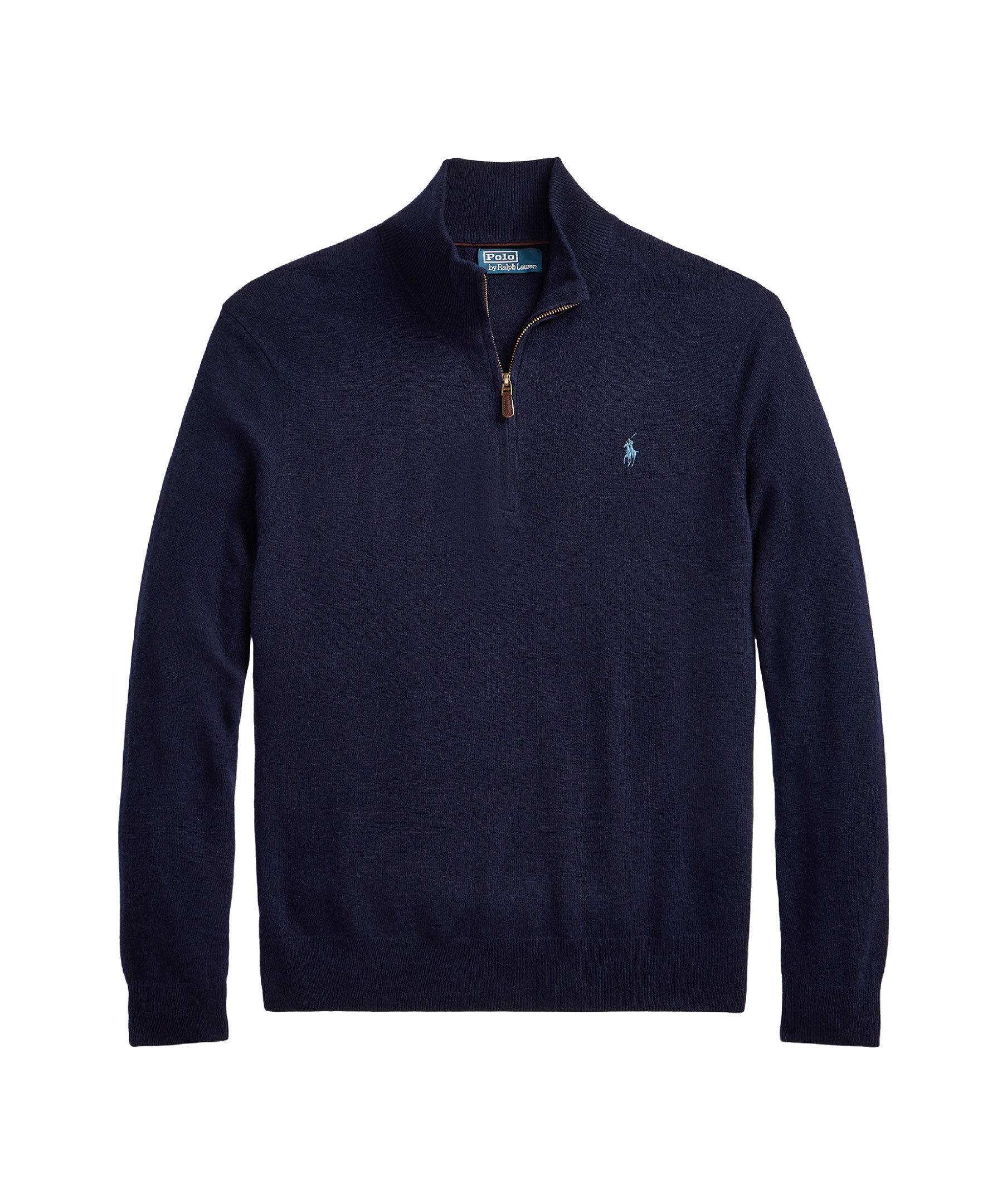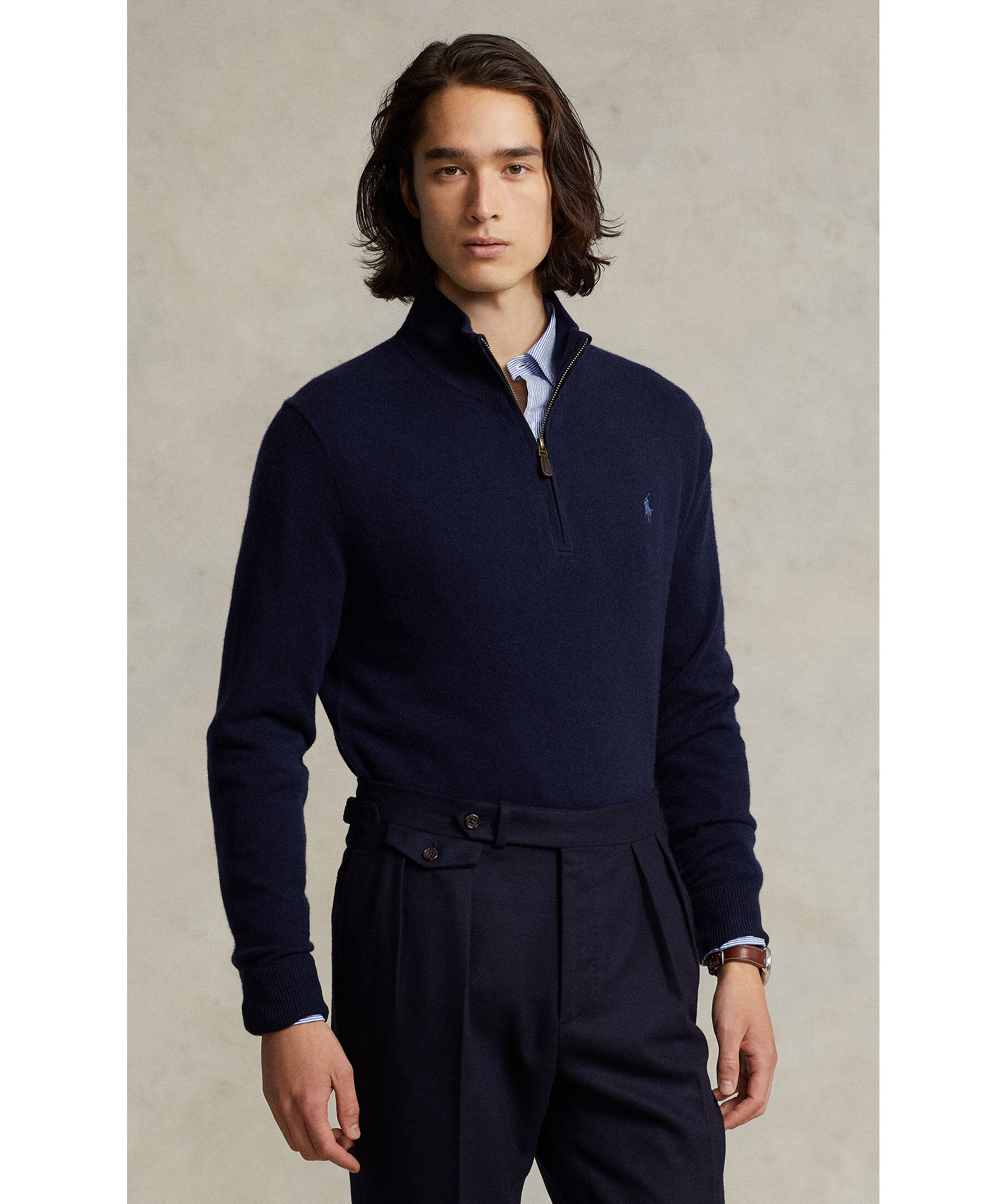 Marinblå half zip-tröja från Polo Ralph Lauren. Tillverkad av lyxig italiensk ull, vilket ger både värme och komfort. Den har en stilren design med en broderad polohäst på bröstet. Perfekt för både avslappnade och mer uppklädda tillfällen. Modellen är 185cm lång och har på sig strl M.