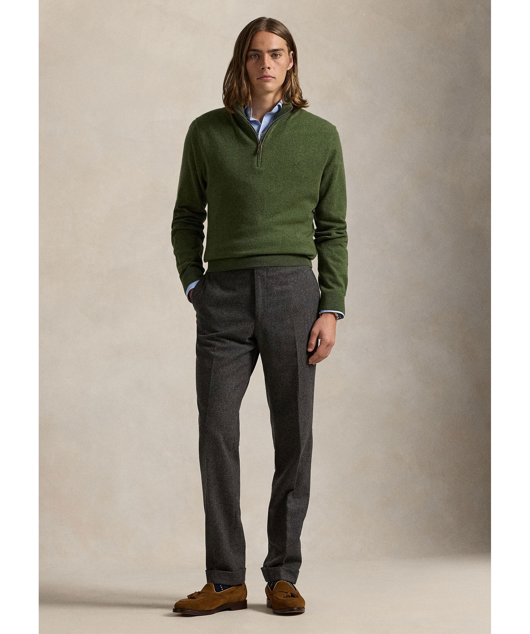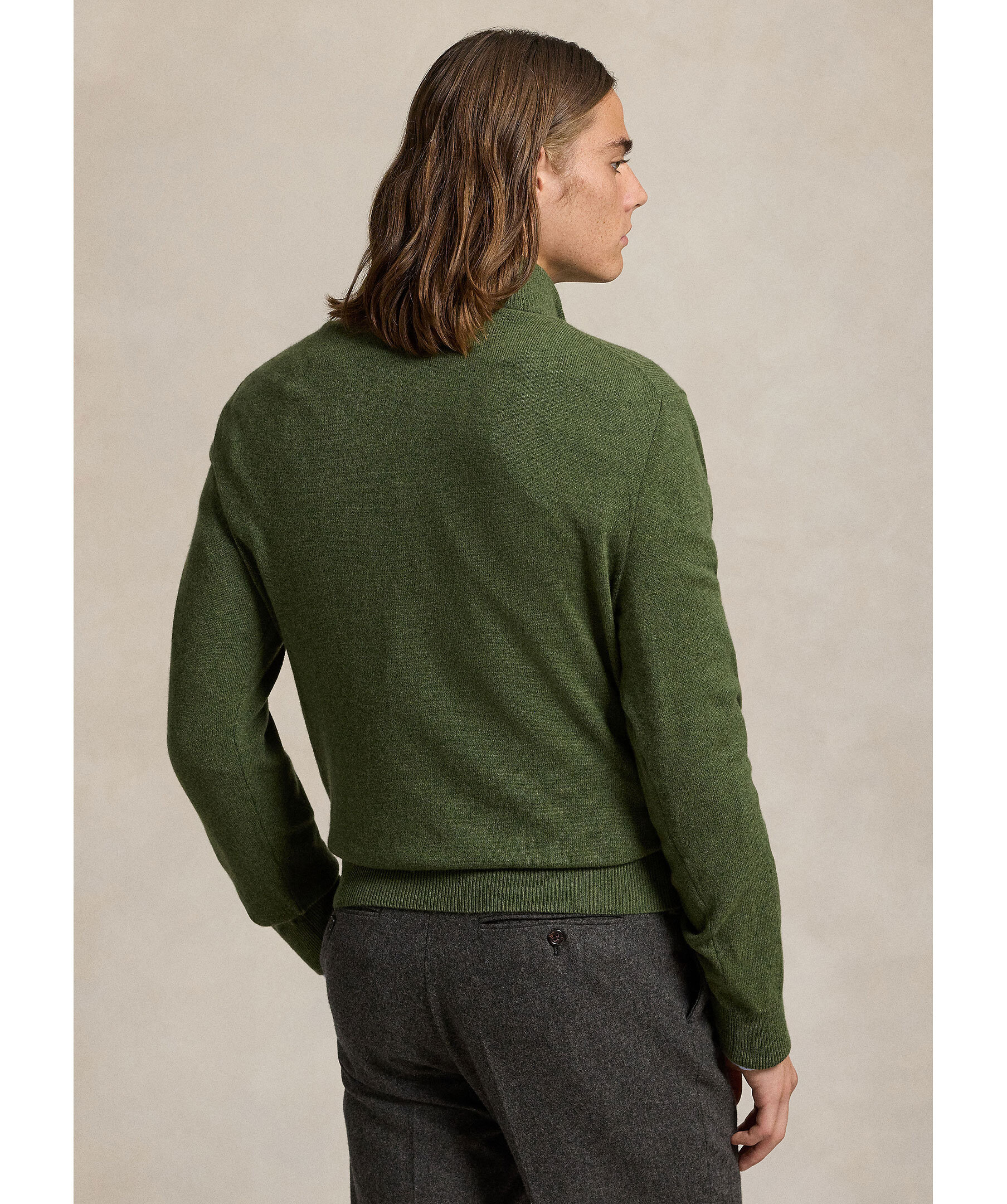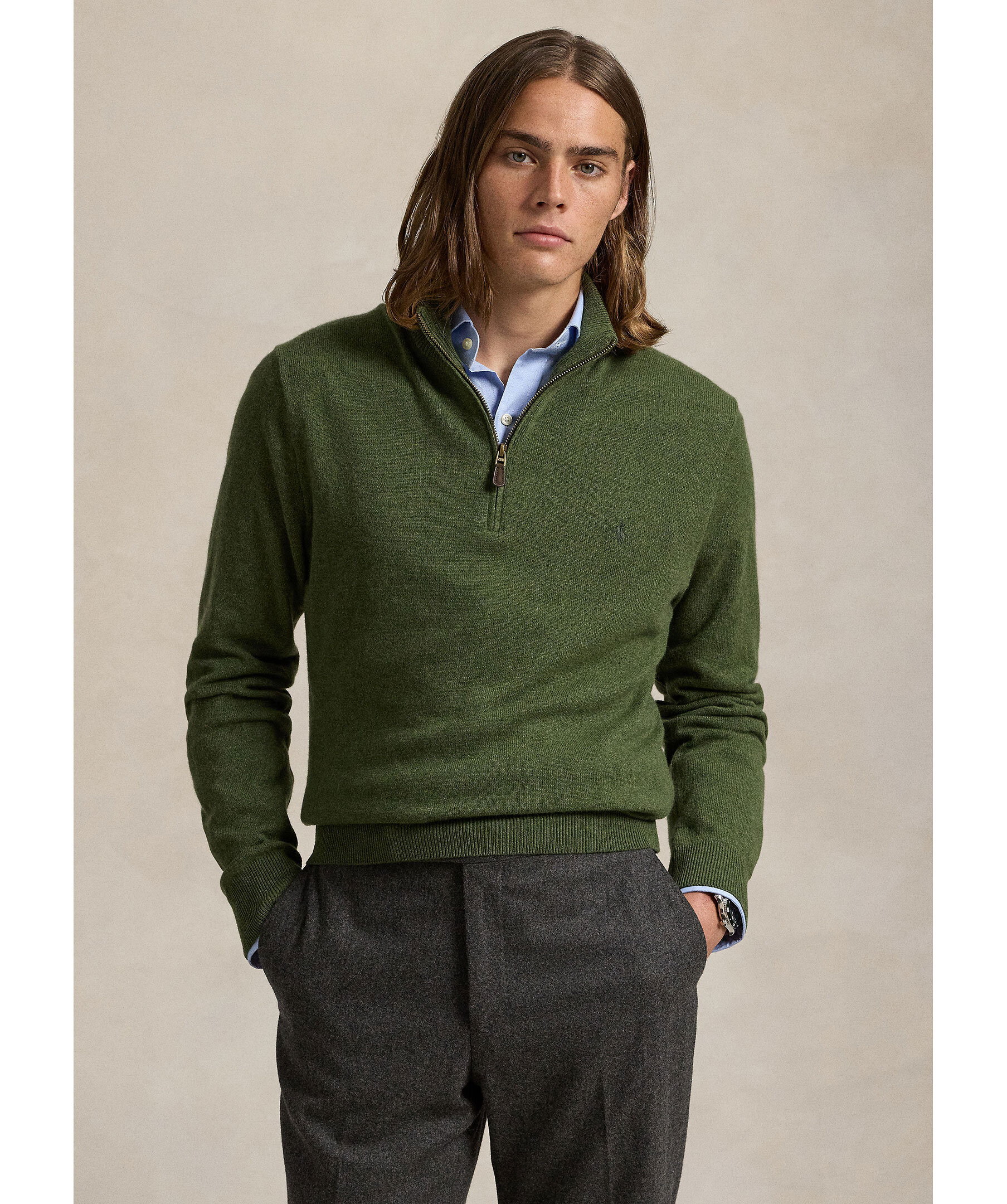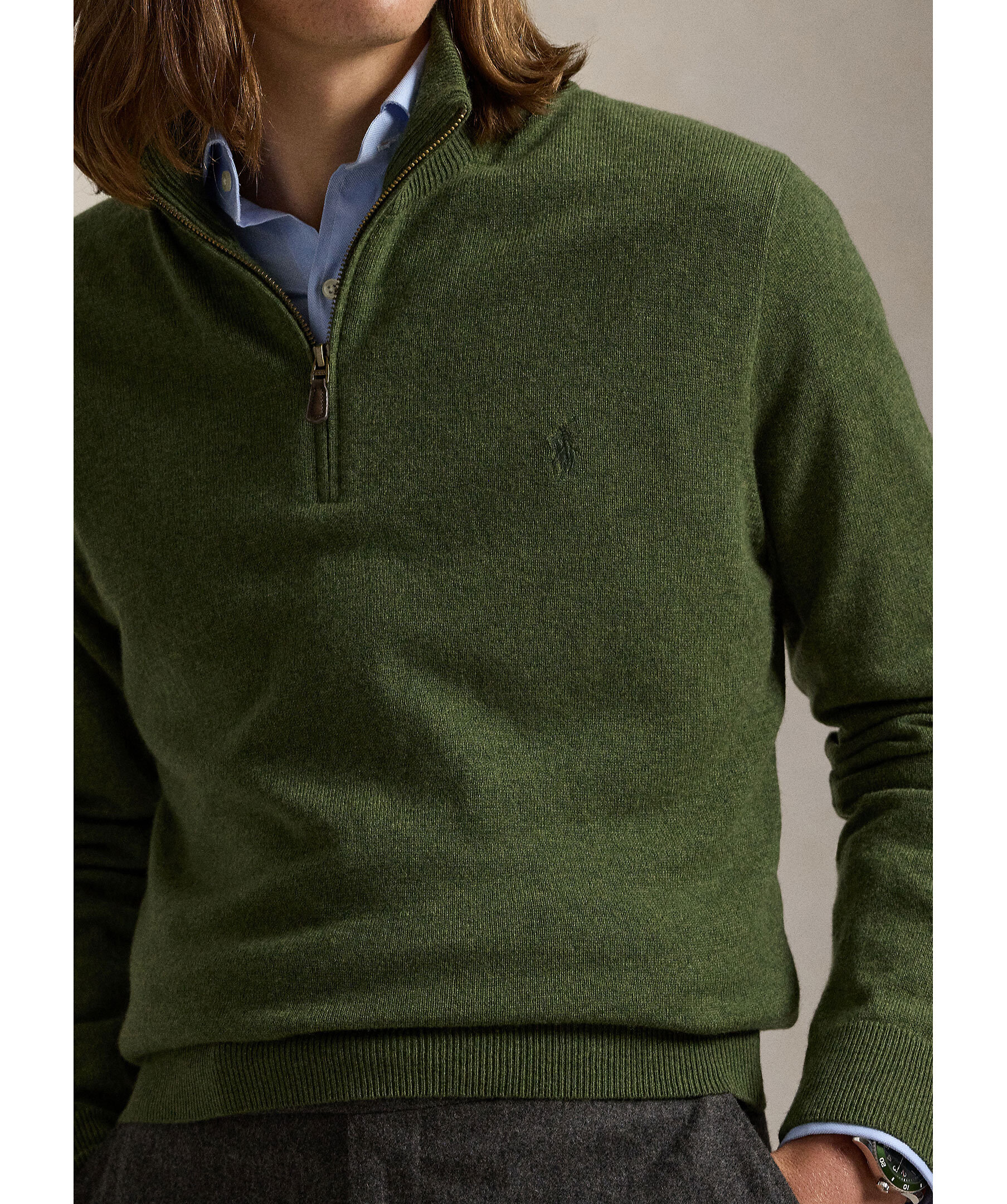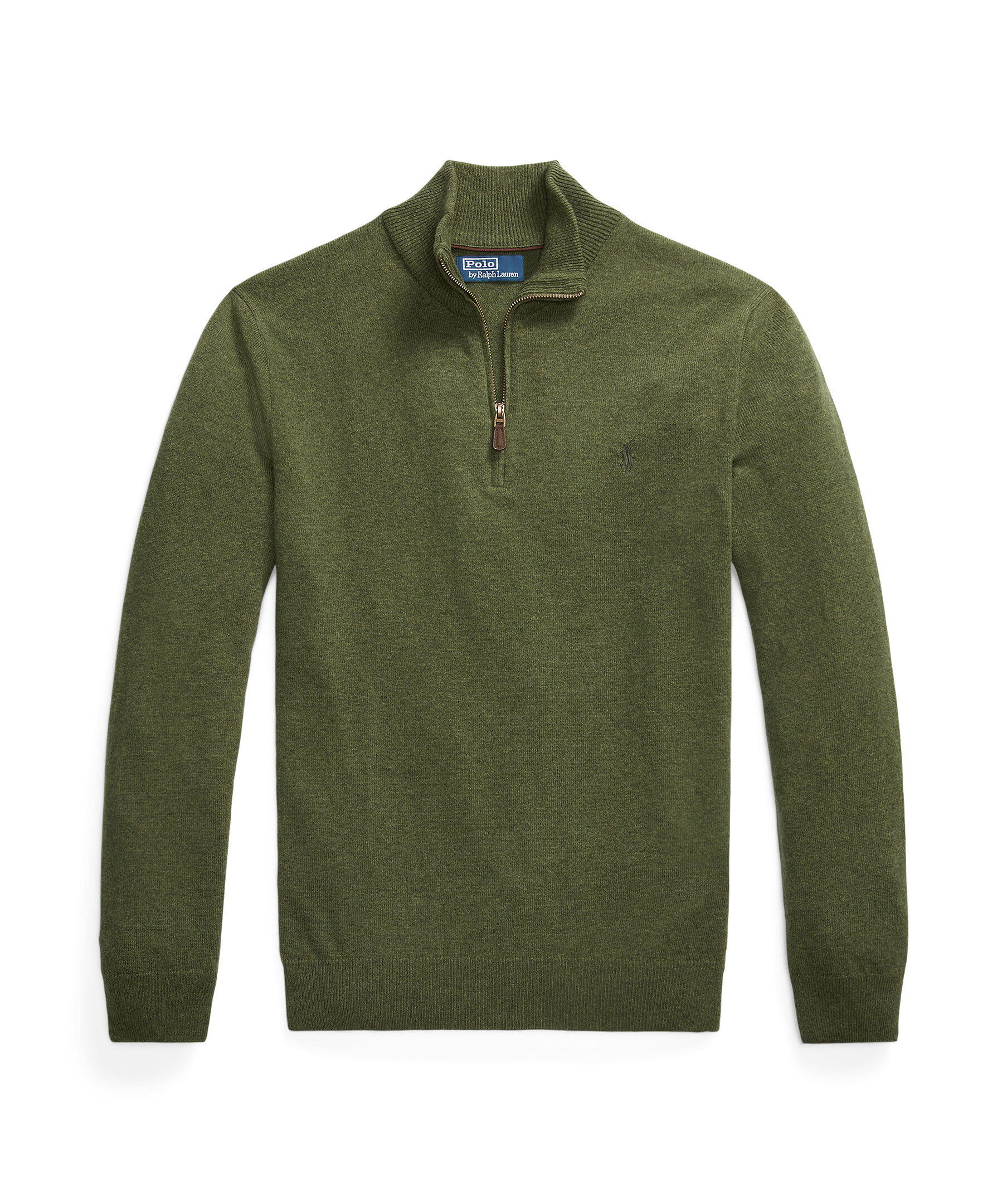 Olivgrön half zip-tröja från Polo Ralph Lauren. Tillverkad av lyxig italiensk ull, vilket ger både värme och komfort. Den har en stilren design med en broderad polohäst på bröstet. Perfekt för både avslappnade och mer uppklädda tillfällen.