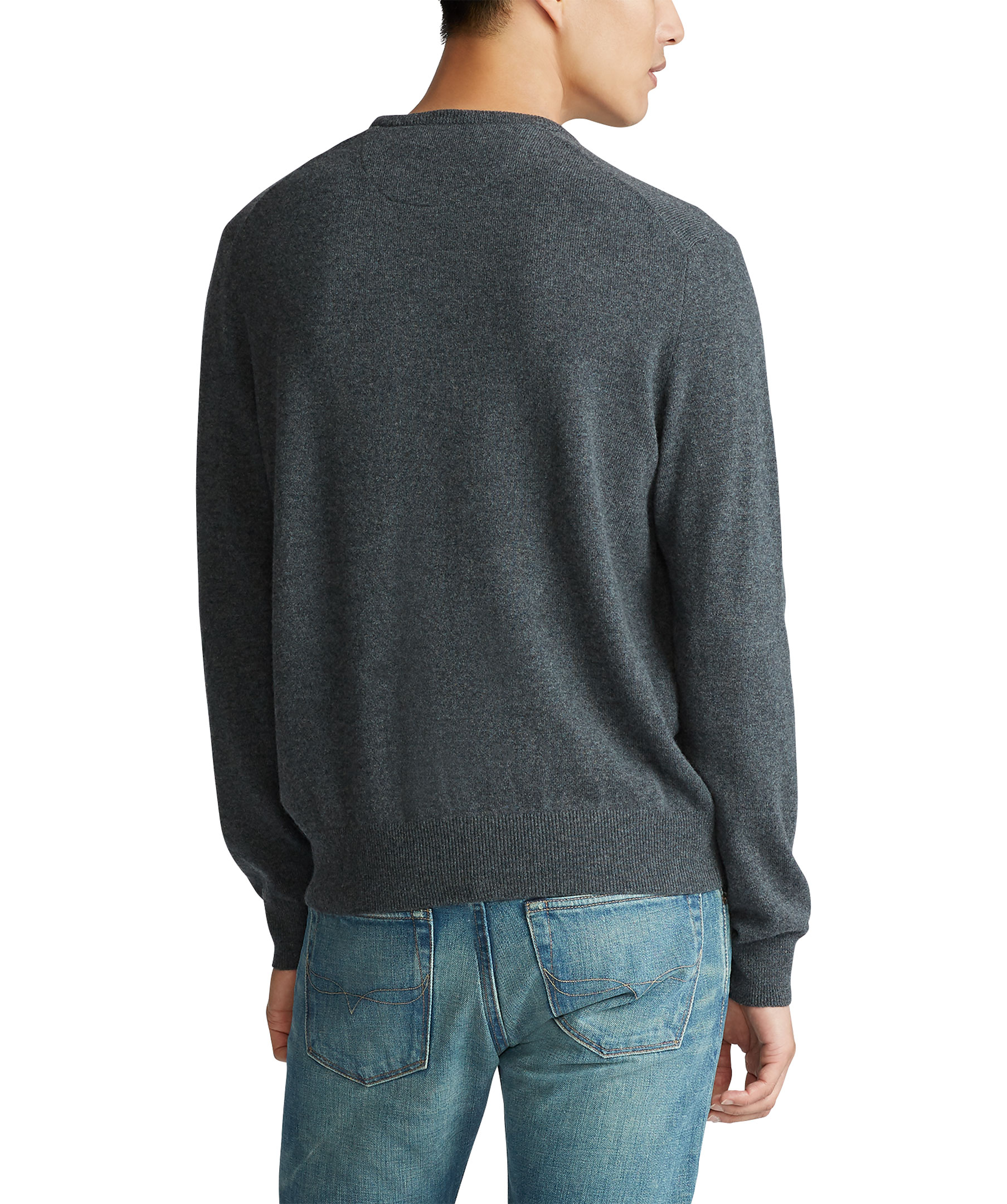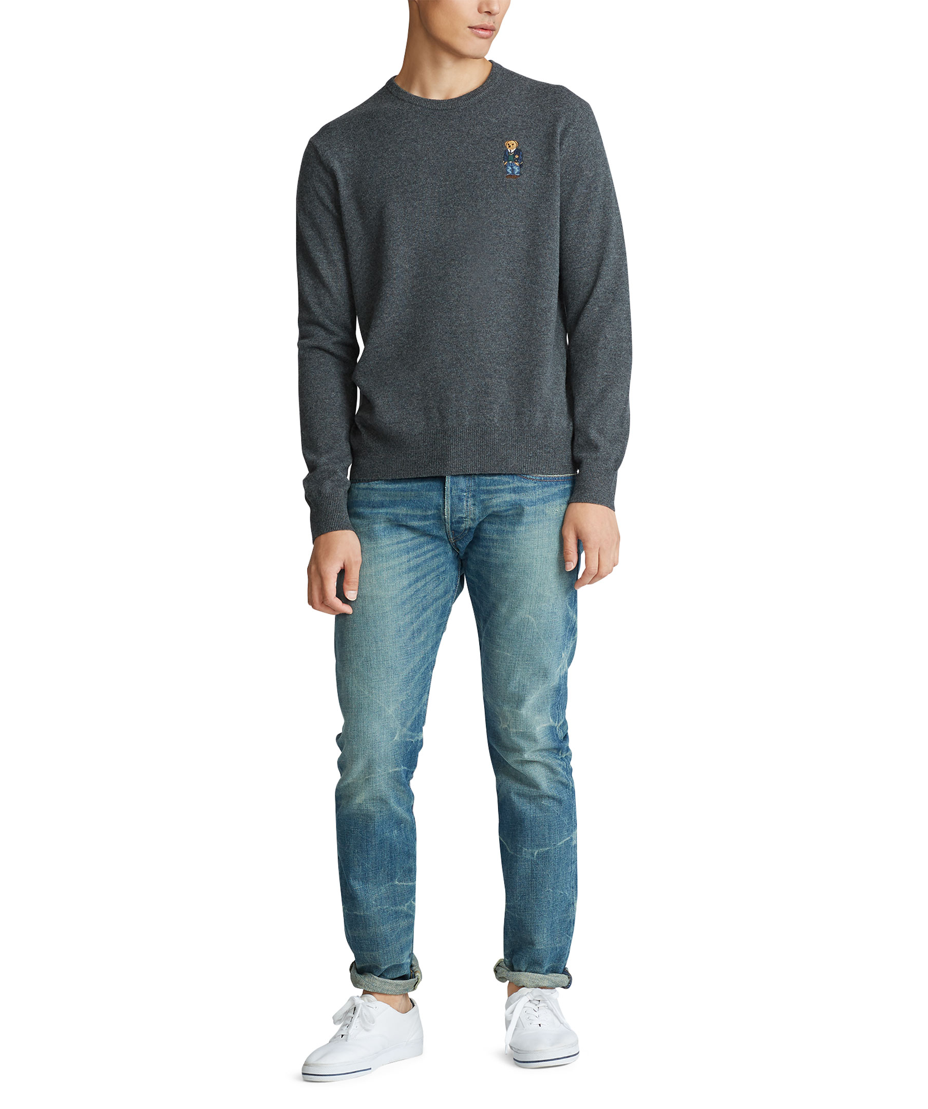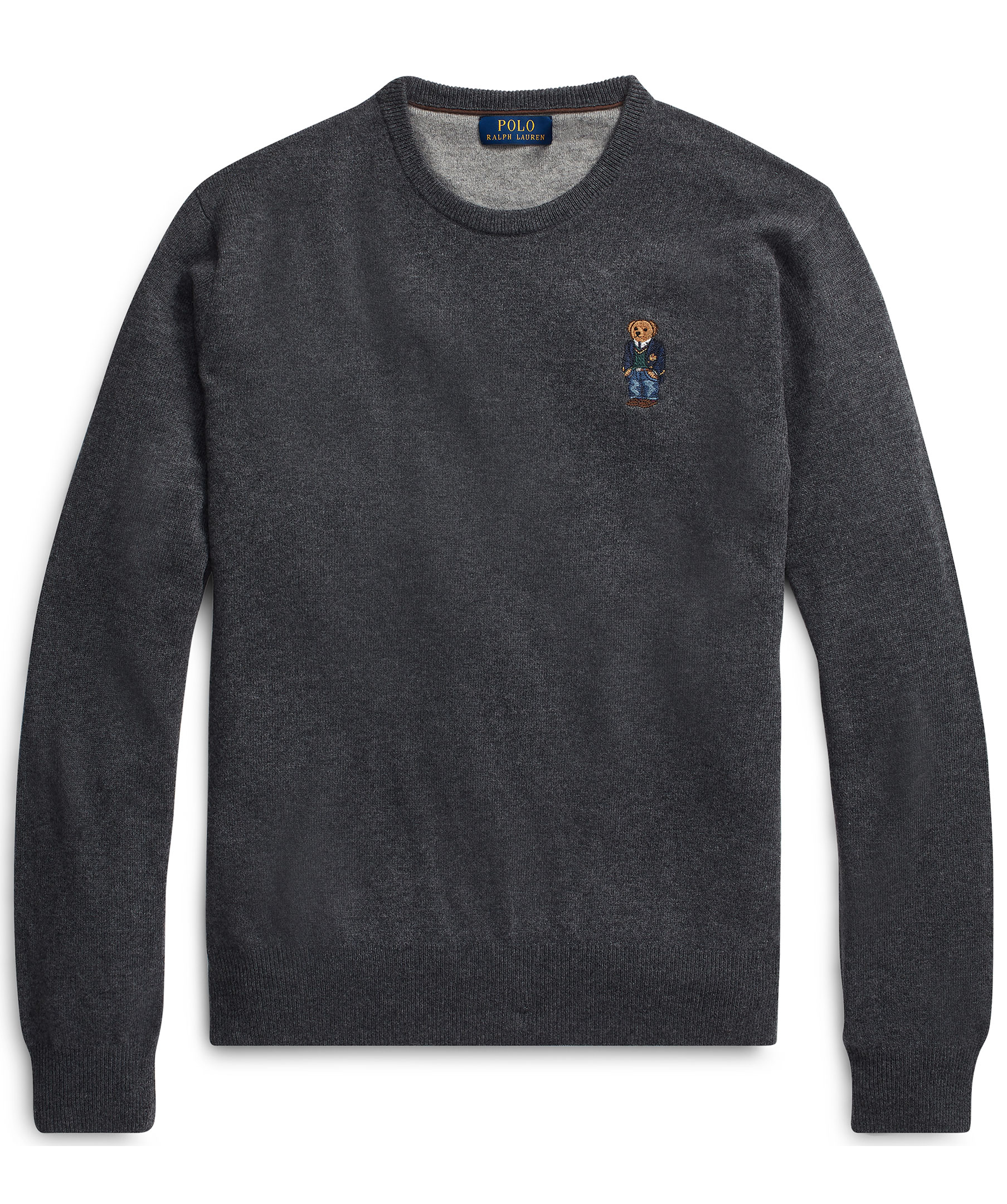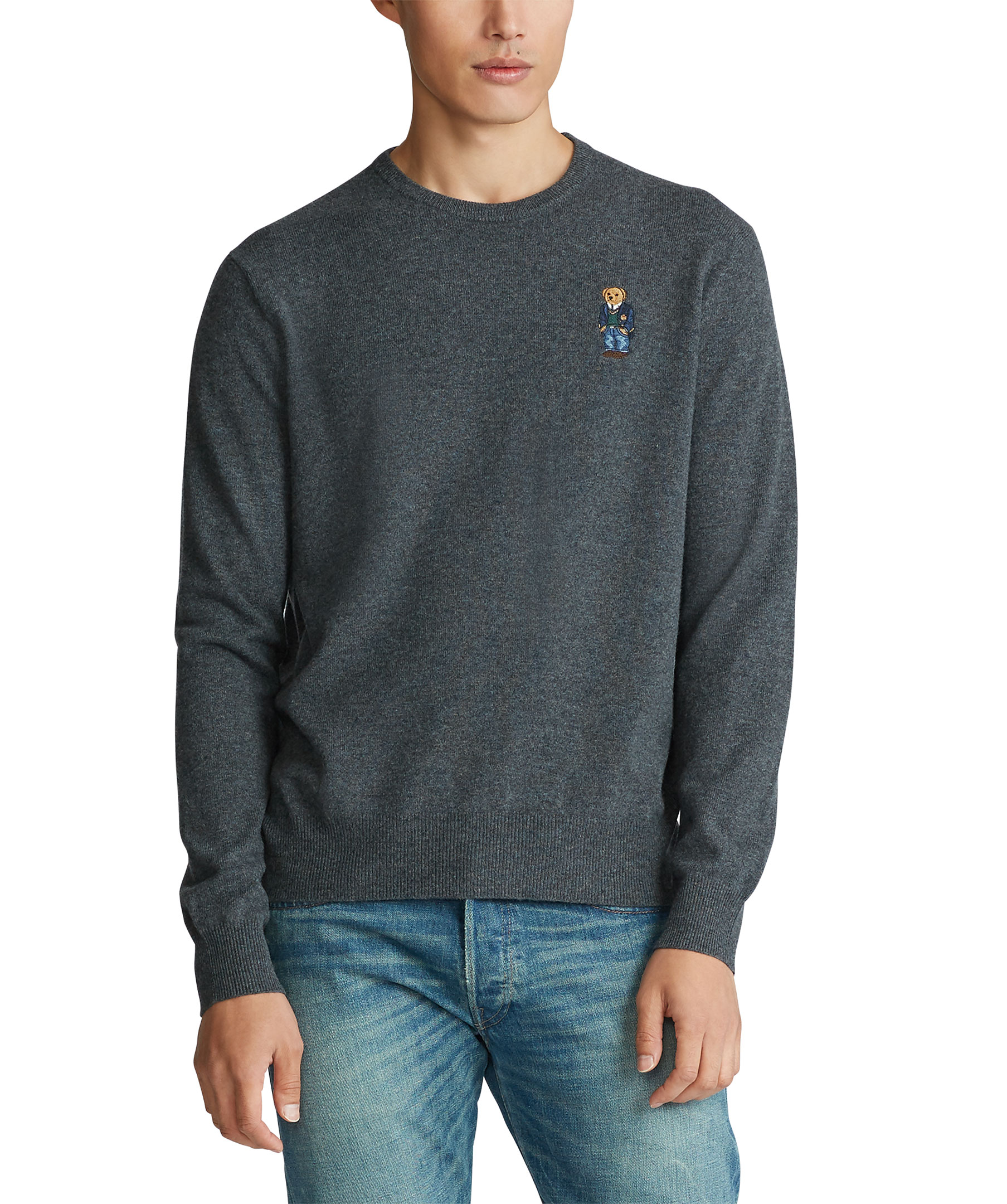 Grå finstickad pullover från Polo Ralph Lauren. Tillverkad i merinoull. Rundad hals, broderad Polo Bear på bröstet.