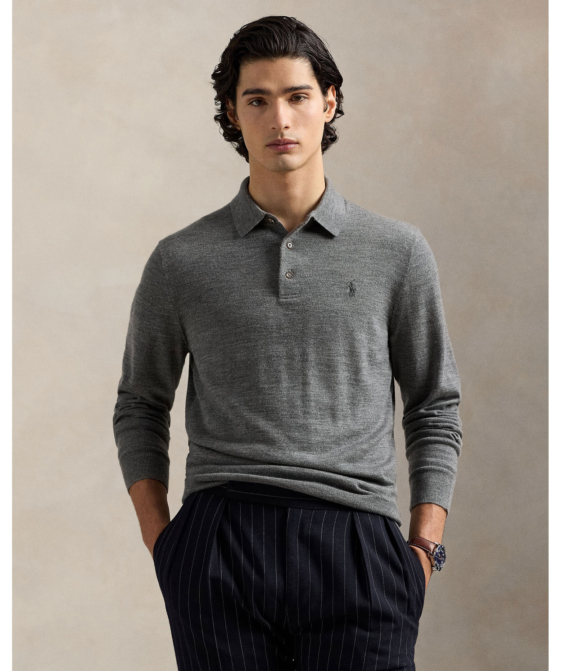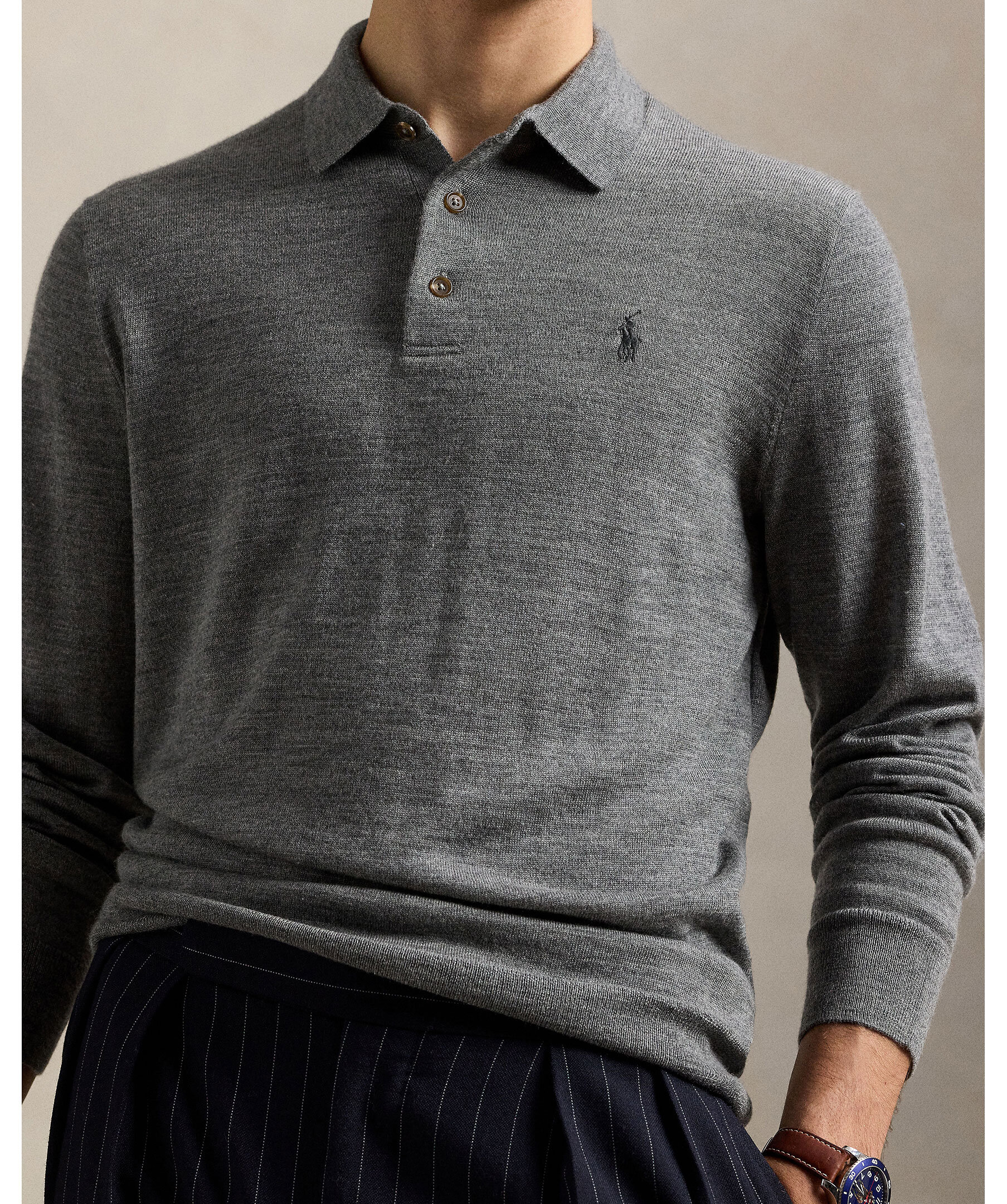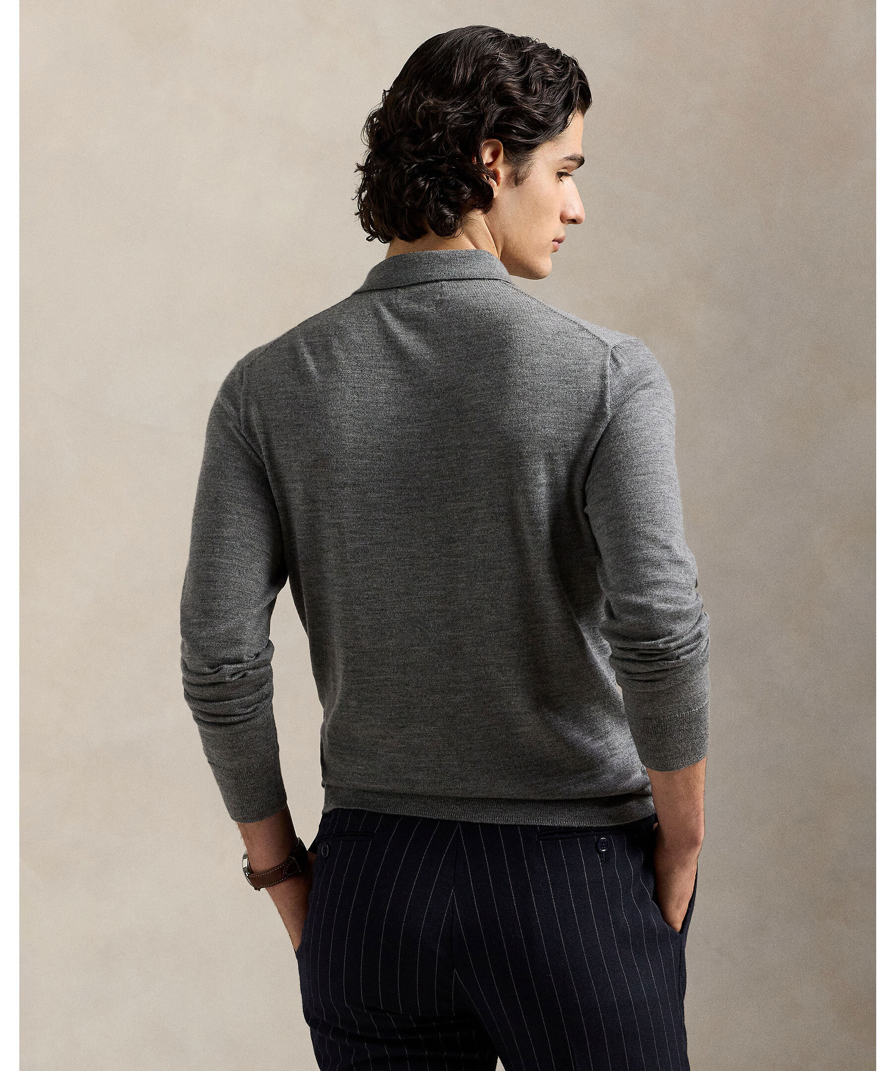 Grå, finstickad tröja i ull från Polo Ralph Lauren. Inspirerad av den ikoniska Polo-skjortan. Utrustad med ribbstickad polo-krage och knappslå, och prydd med den subtila men klassiska Pony-broderingen på bröstet.