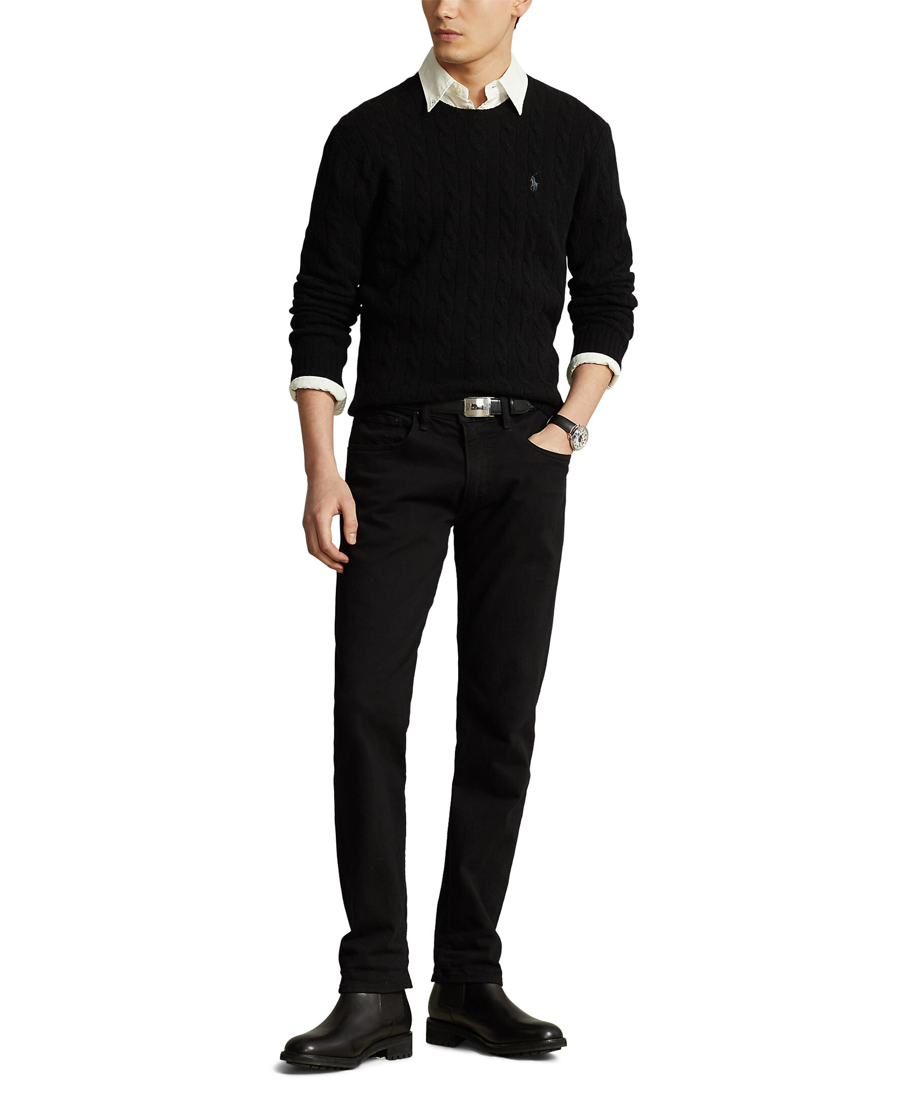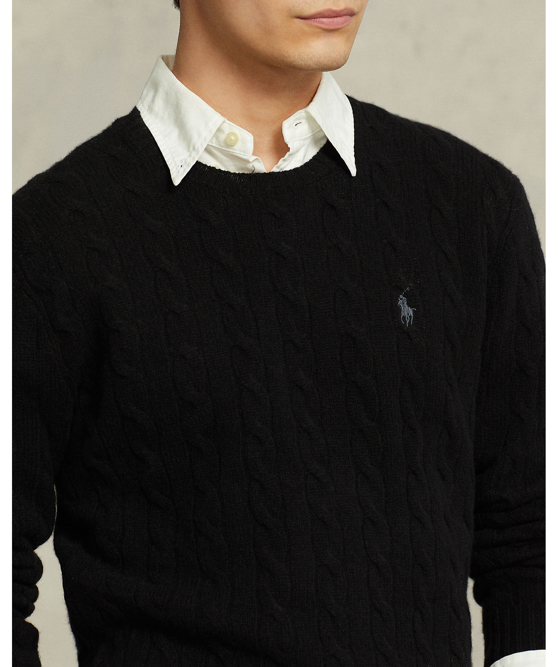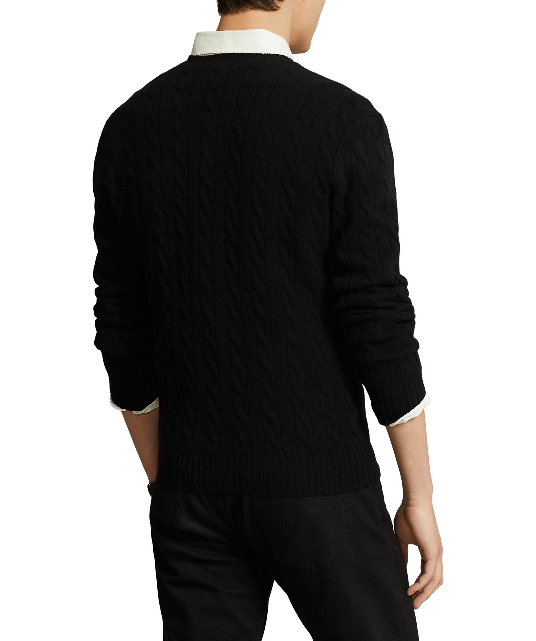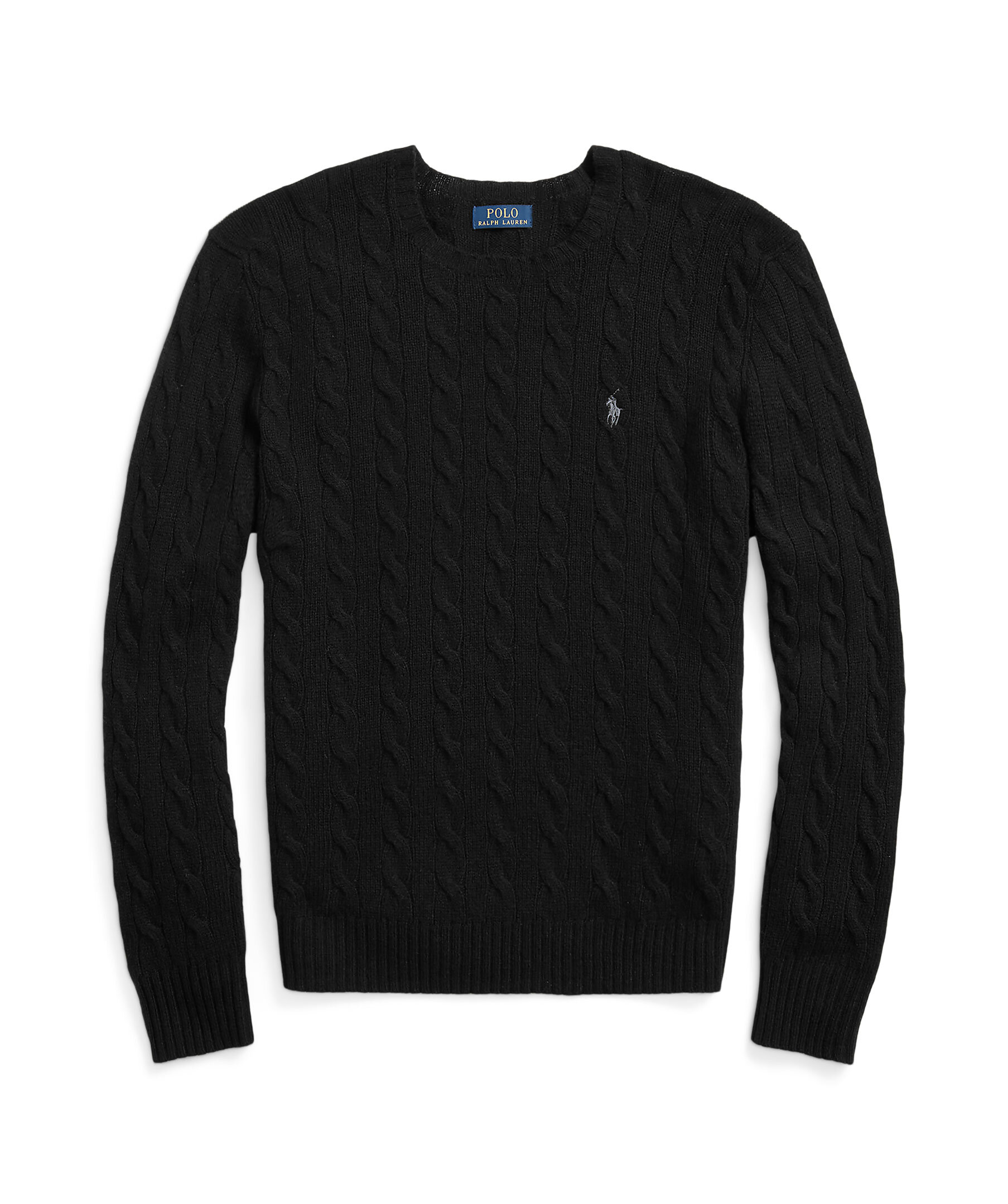 Svart, kabelstickad tröja från Polo Ralph Lauren. Denna tolkning av deras ikoniska kabelstickade tröja är gjord av italienskt garn som är spunnet med ull och kashmir. Långa ärmar med ribbstickade muddar samt ribbstickad fåll. Signaturbroderad ponny på vänster bröst. Normal passform.