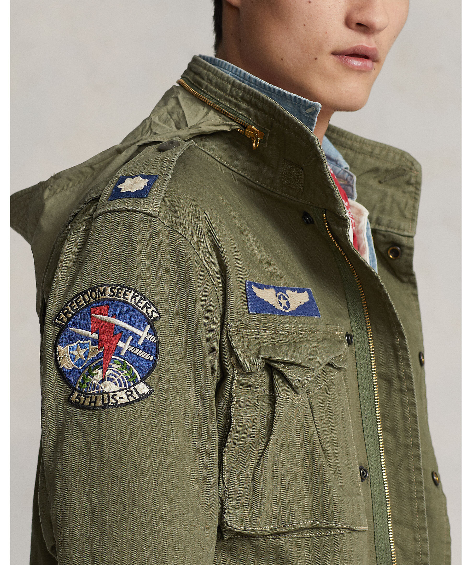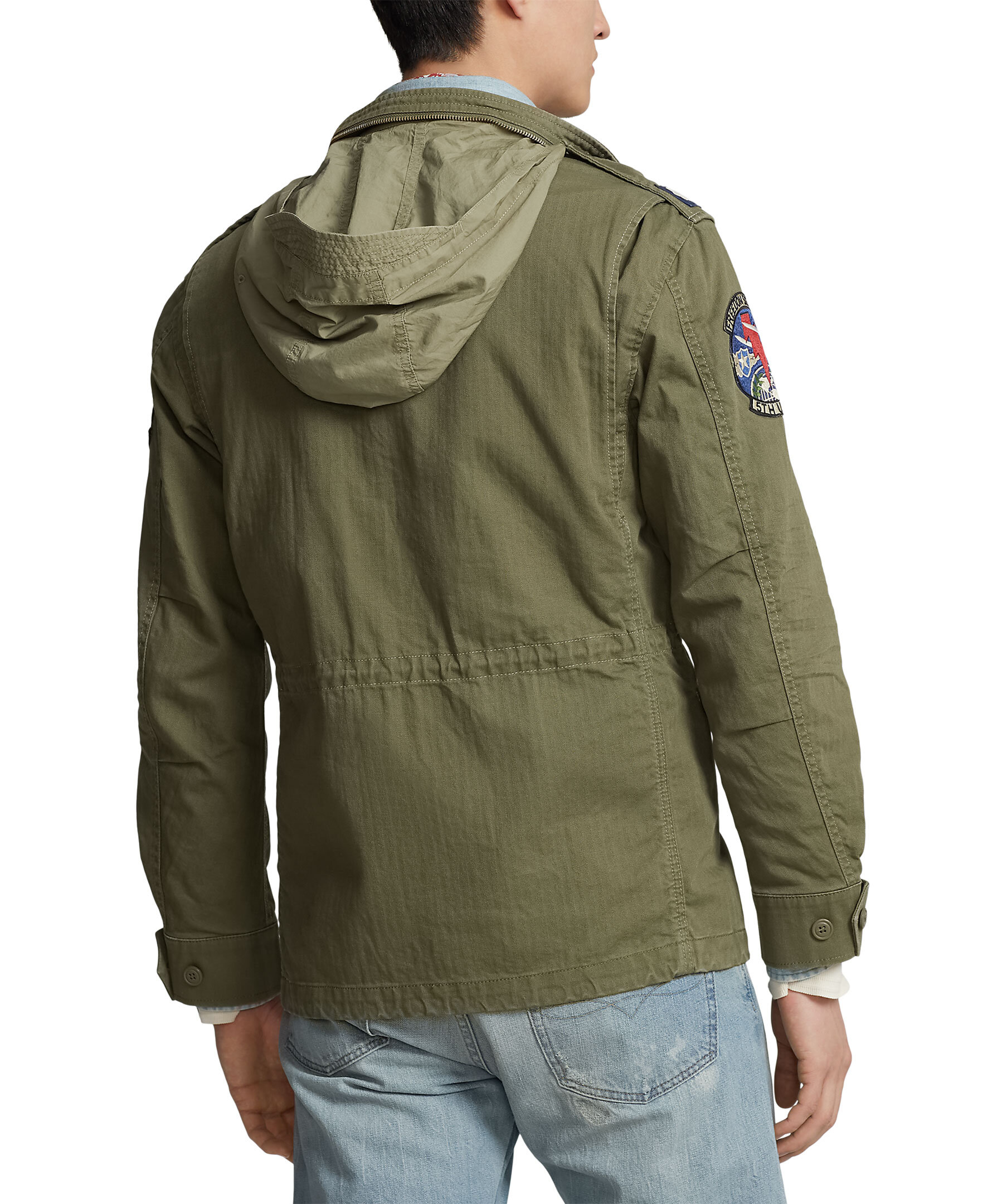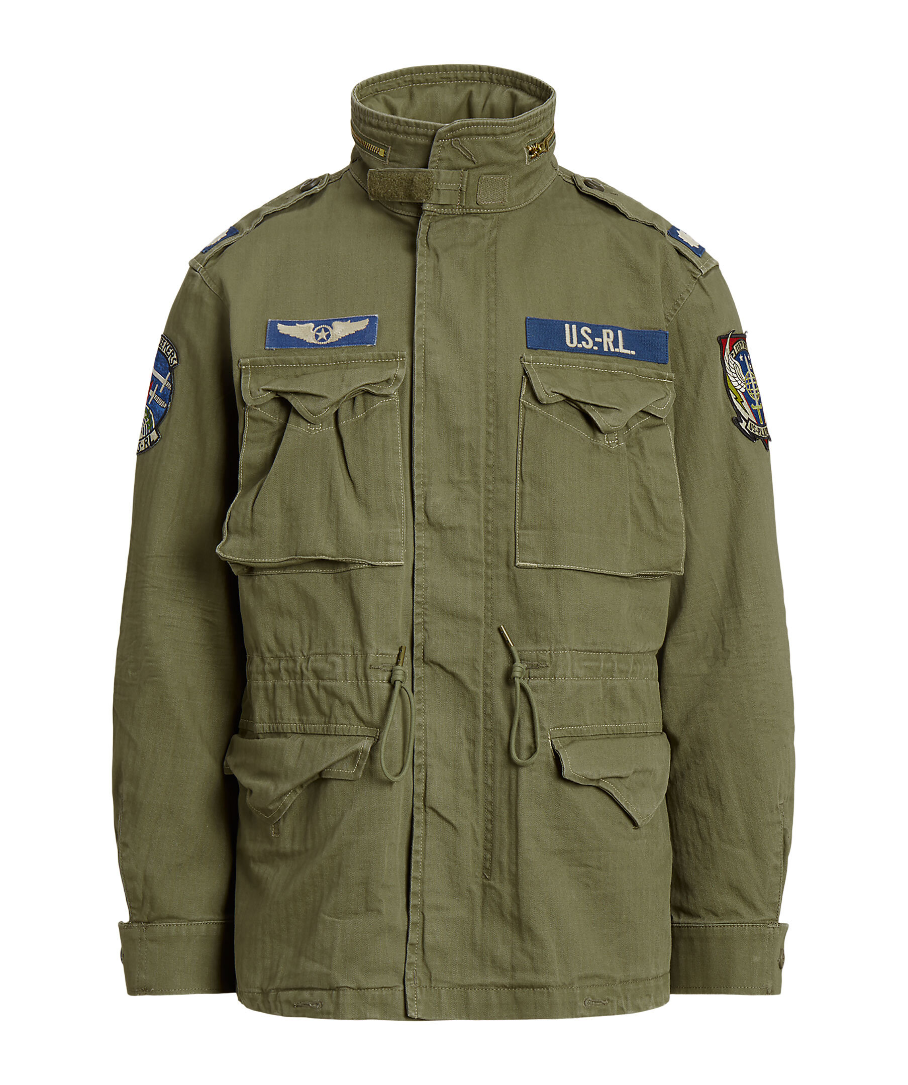 Grön militärinspirerad jacka från Polo Ralph Lauren. En omtolkning av den ikoniska fältjackan kombinerar en modern passform med autentiska detaljer och signaturlappar. Hel dragkedja fram. Långa ärmar med manschetter med knäppning. Knäppta axelepaletter med blomlappar. Ventilerande broderade öljetter på armhålorna. Mockneck med en kardborreflik framtill. Skyddad huva med broderade öljetter och inbyggd brätte. Två bröstfickor med knäppning. Två fickor med knäppning i midjan framtill. Invändig vänster bröstficka. "U.S.-R.L." plåster på vänster bröst. Bevingad stjärnlapp på höger bröst. "Freedom Seekers 5th US-RL"-lapp på höger ärm. "118th Div. US-RL Air Sq." lapp på vänster ärm. Dragsko i midjan. Helfodrad.