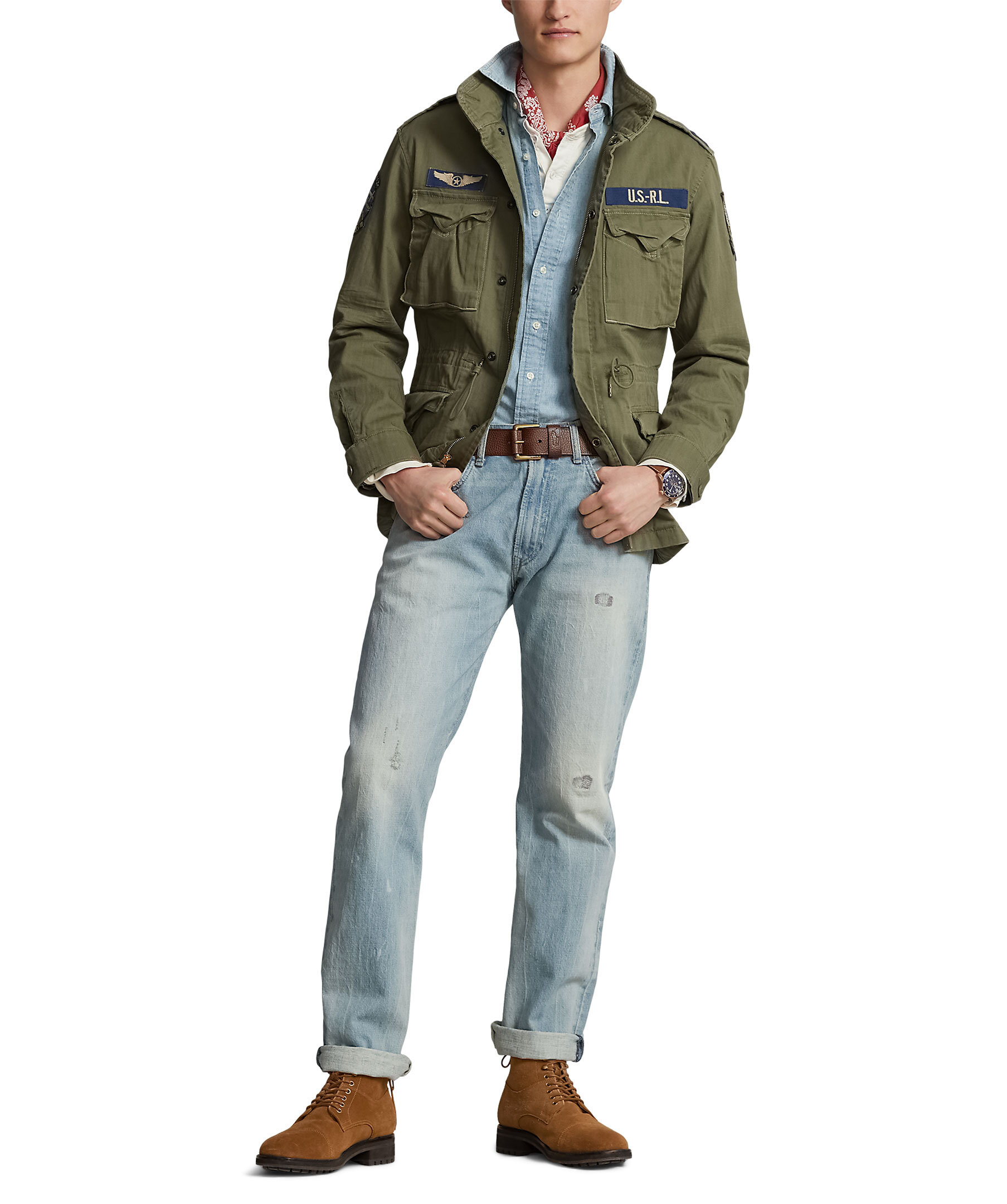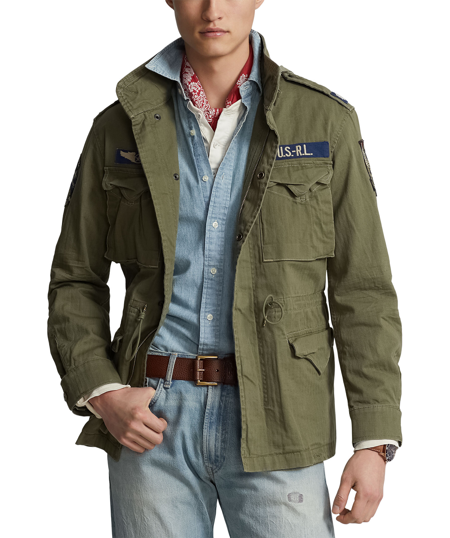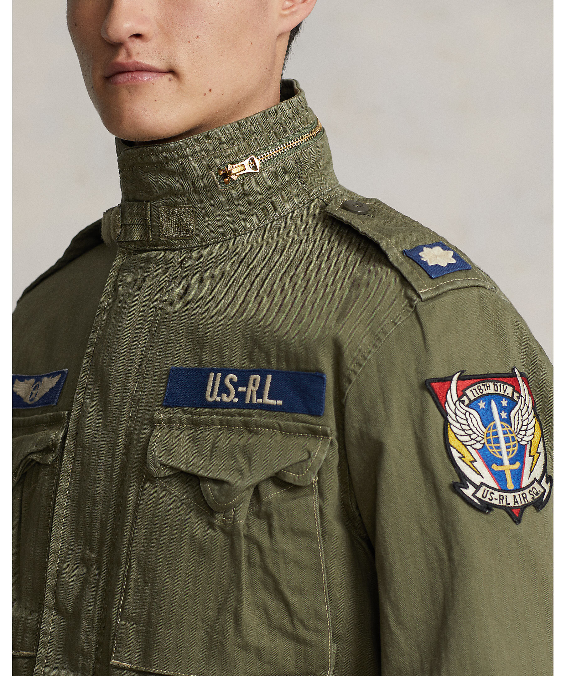 Grön militärinspirerad jacka från Polo Ralph Lauren. En omtolkning av den ikoniska fältjackan kombinerar en modern passform med autentiska detaljer och signaturlappar. Hel dragkedja fram. Långa ärmar med manschetter med knäppning. Knäppta axelepaletter med blomlappar. Ventilerande broderade öljetter på armhålorna. Mockneck med en kardborreflik framtill. Skyddad huva med broderade öljetter och inbyggd brätte. Två bröstfickor med knäppning. Två fickor med knäppning i midjan framtill. Invändig vänster bröstficka. "U.S.-R.L." plåster på vänster bröst. Bevingad stjärnlapp på höger bröst. "Freedom Seekers 5th US-RL"-lapp på höger ärm. "118th Div. US-RL Air Sq." lapp på vänster ärm. Dragsko i midjan. Helfodrad.