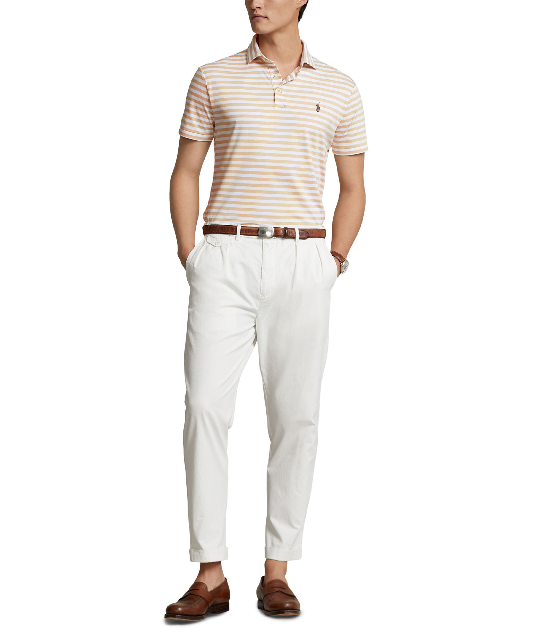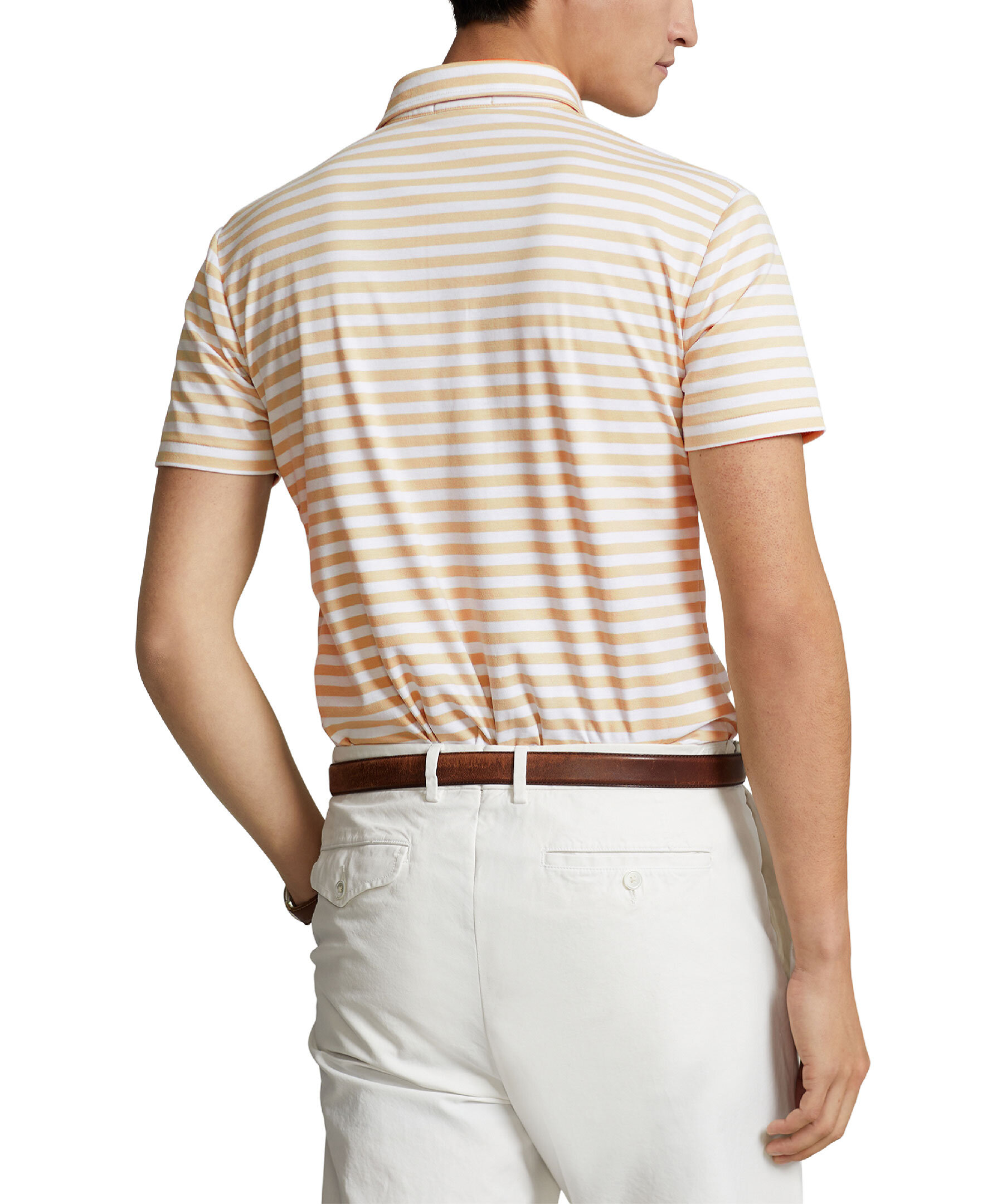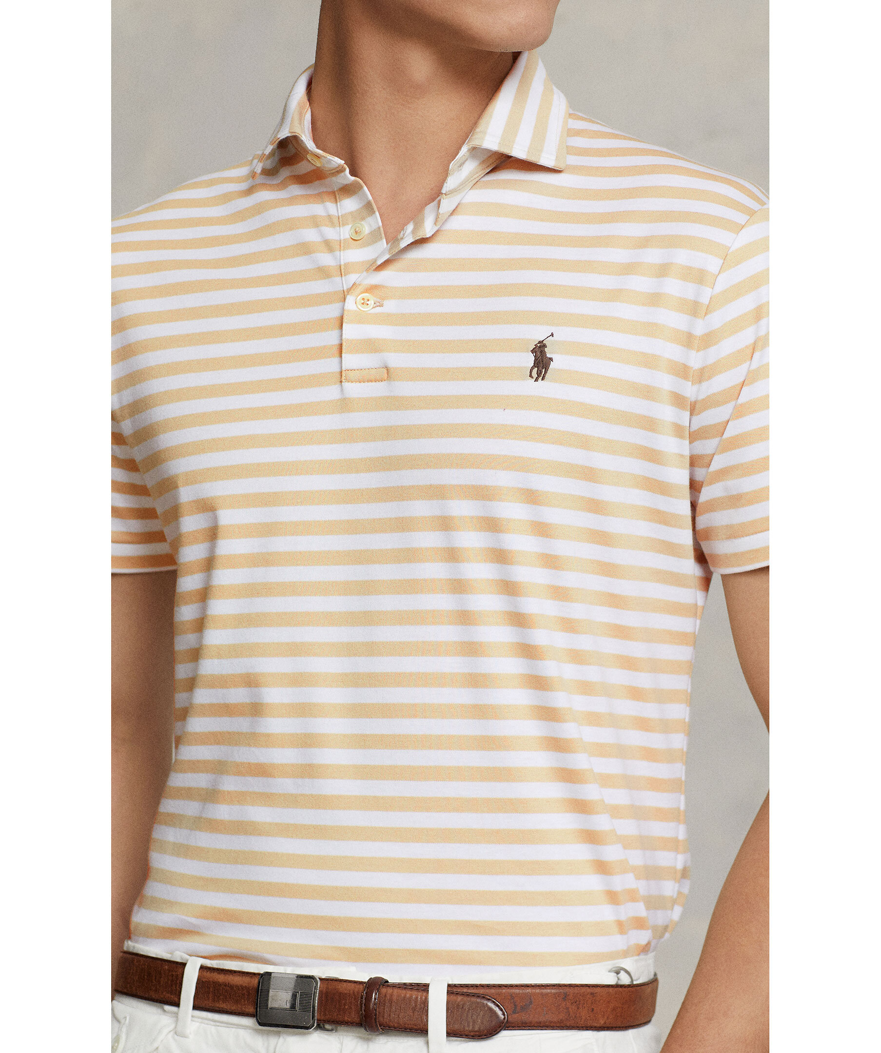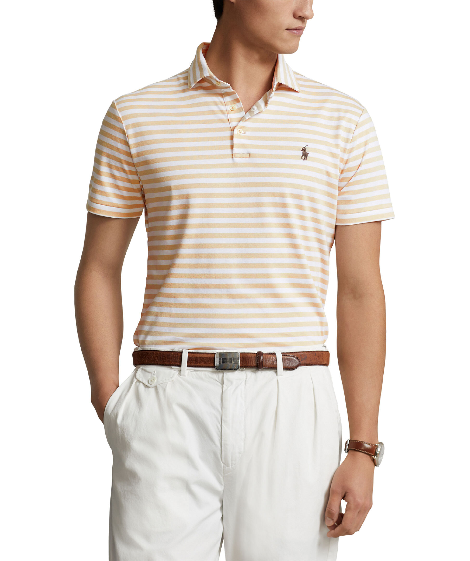 Vit och beige-randig, kortärmad piké från Polo Ralph Lauren. Krage. och tre vita knappar fram. Tillverkad i ett lyxigt och mjuk bomullsmaterial. Broderad polohäst på bröstet och korta slitsar i sidorna. Custom slim fit passform.