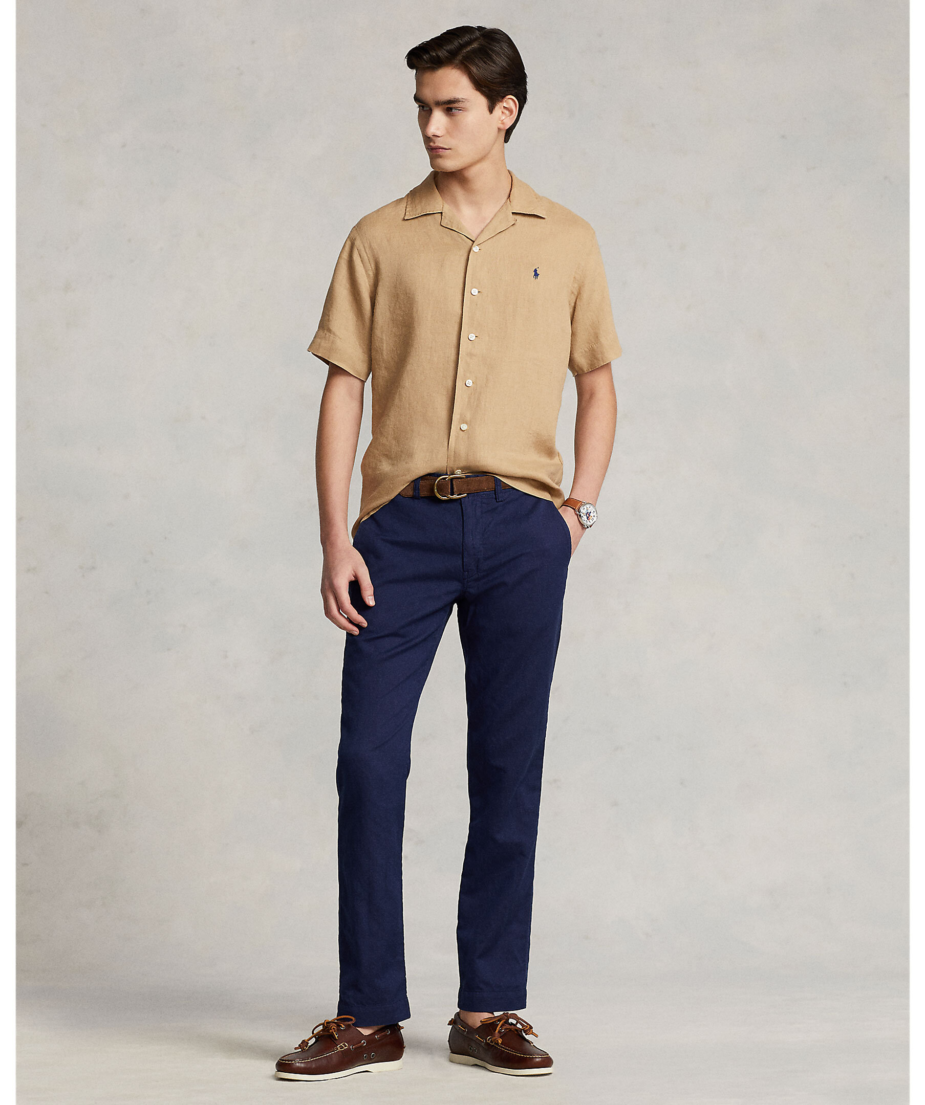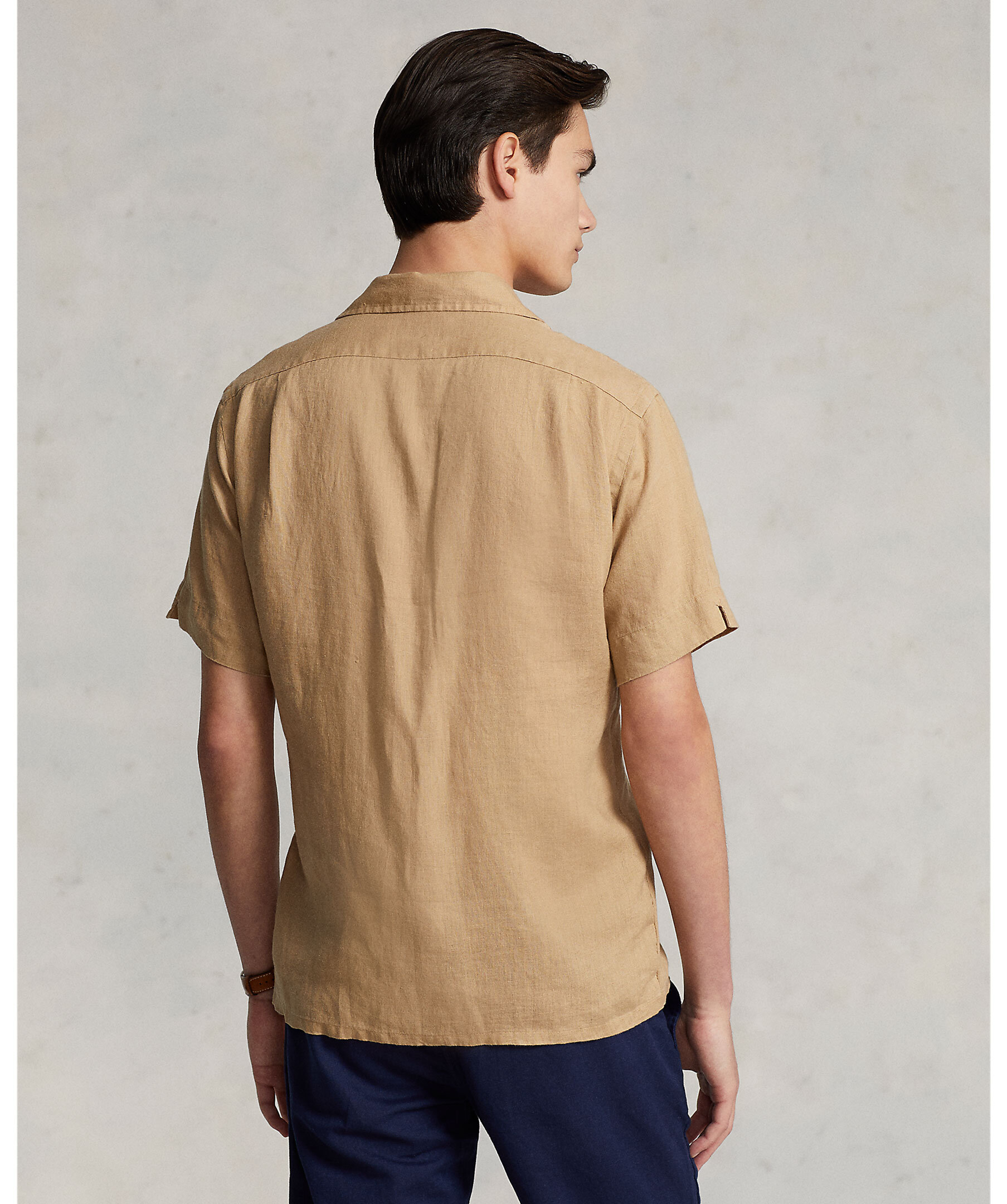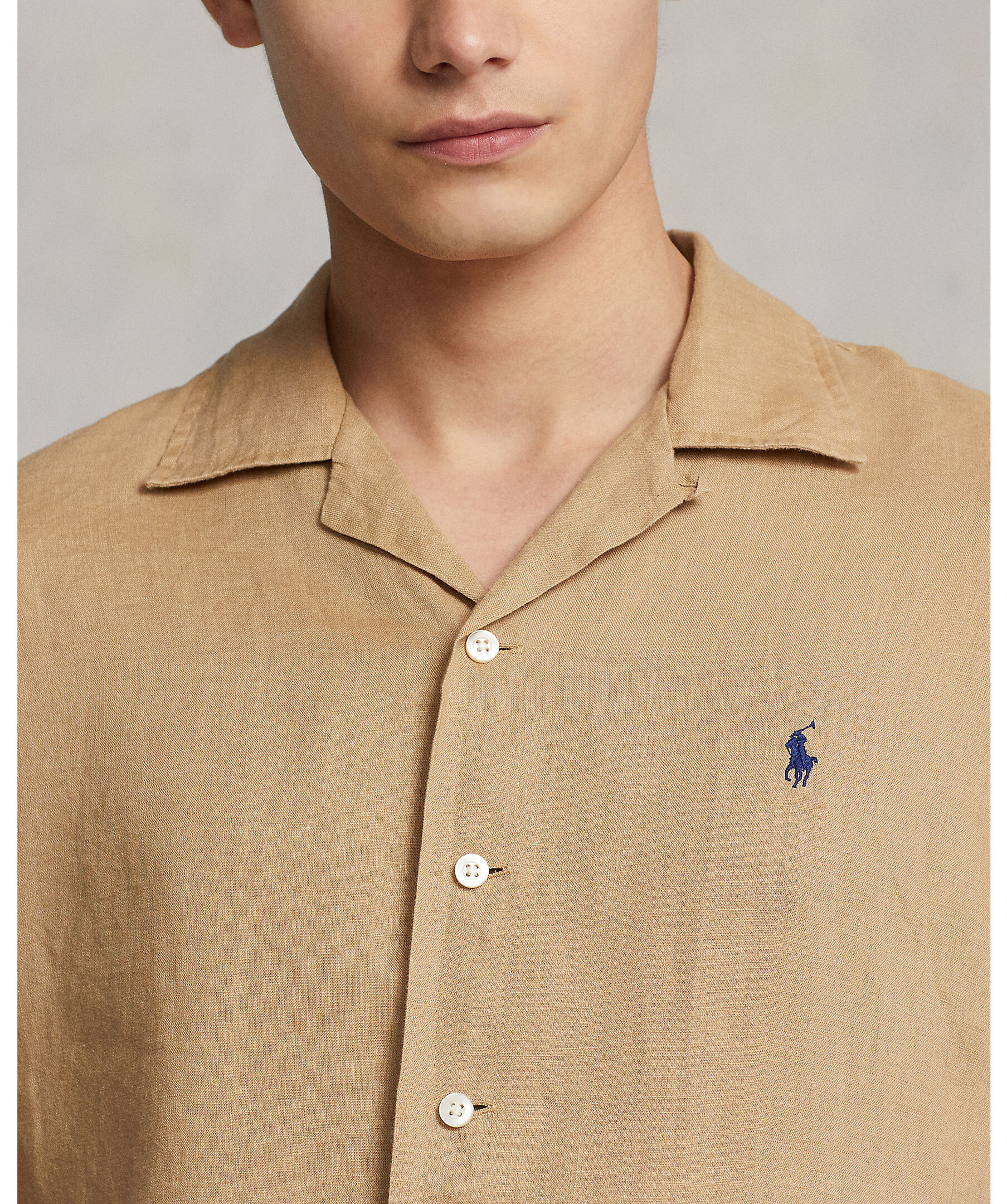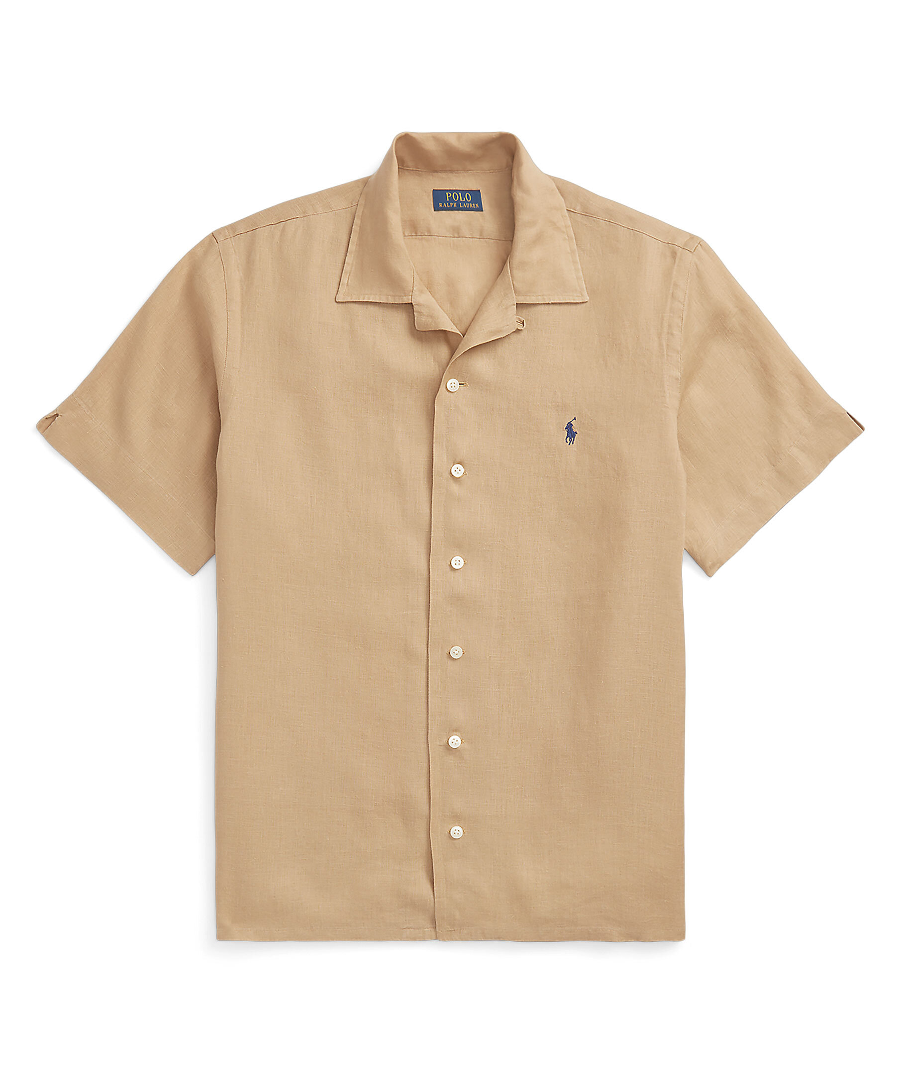 Kamelfärgad, kortärmad skjorta tillverkad i lätt, andningsbart linnetyg från Polo Ralph Lauren. Classic Fit, med en rymlig siluett. Spetsig krage, knappslå, veckat ok bak och rak fåll. Signaturbroderad ponny på vänster bröst.