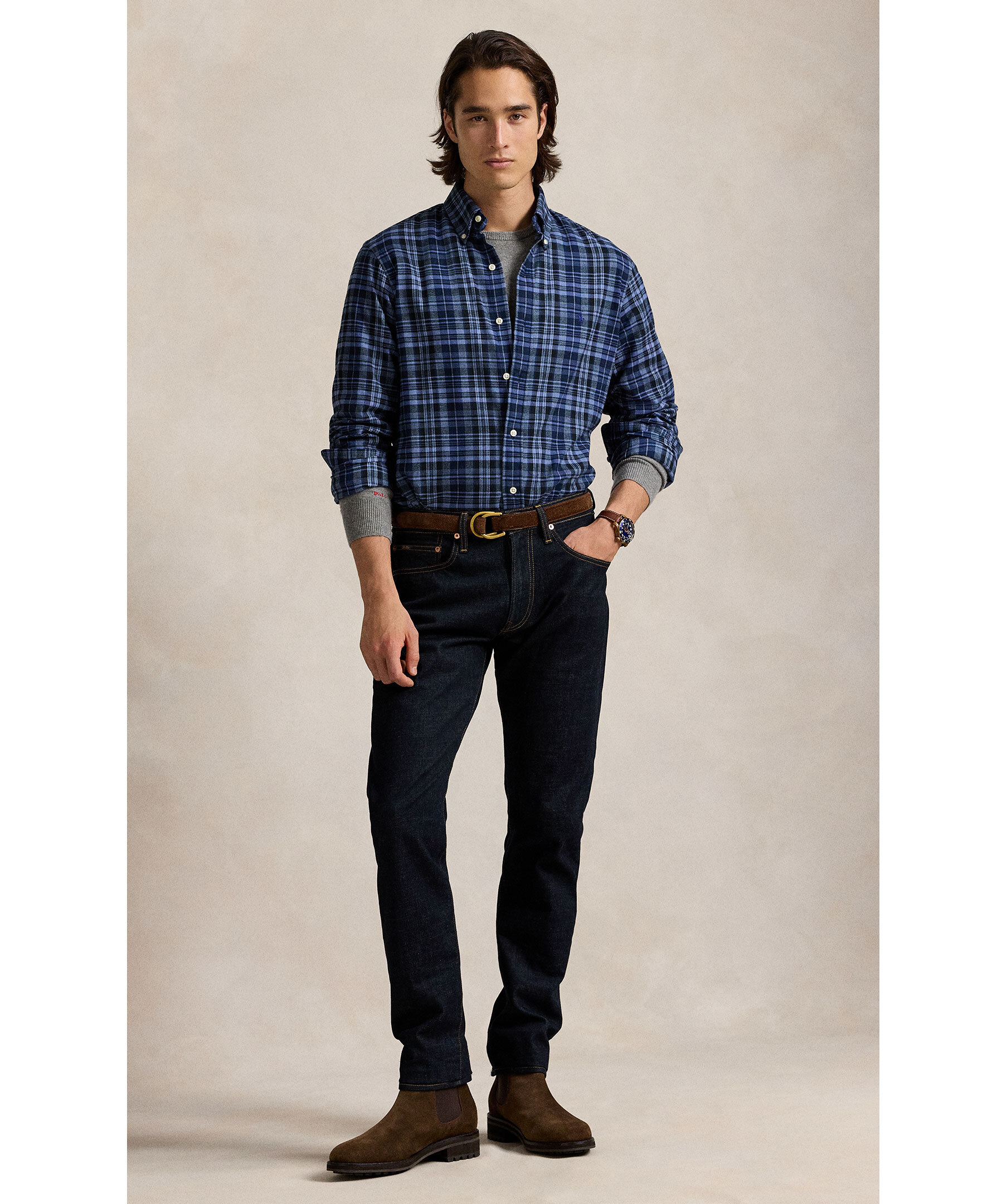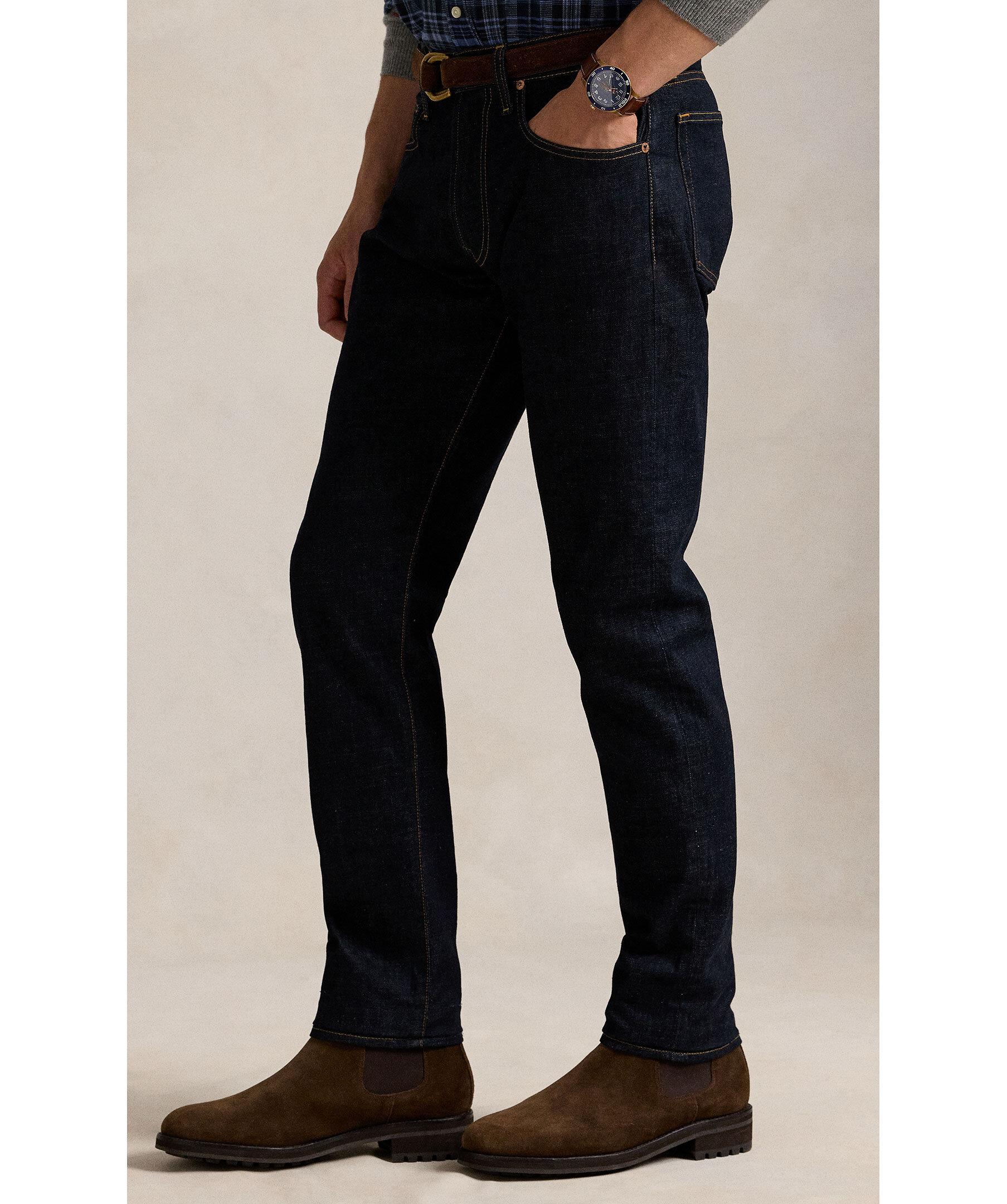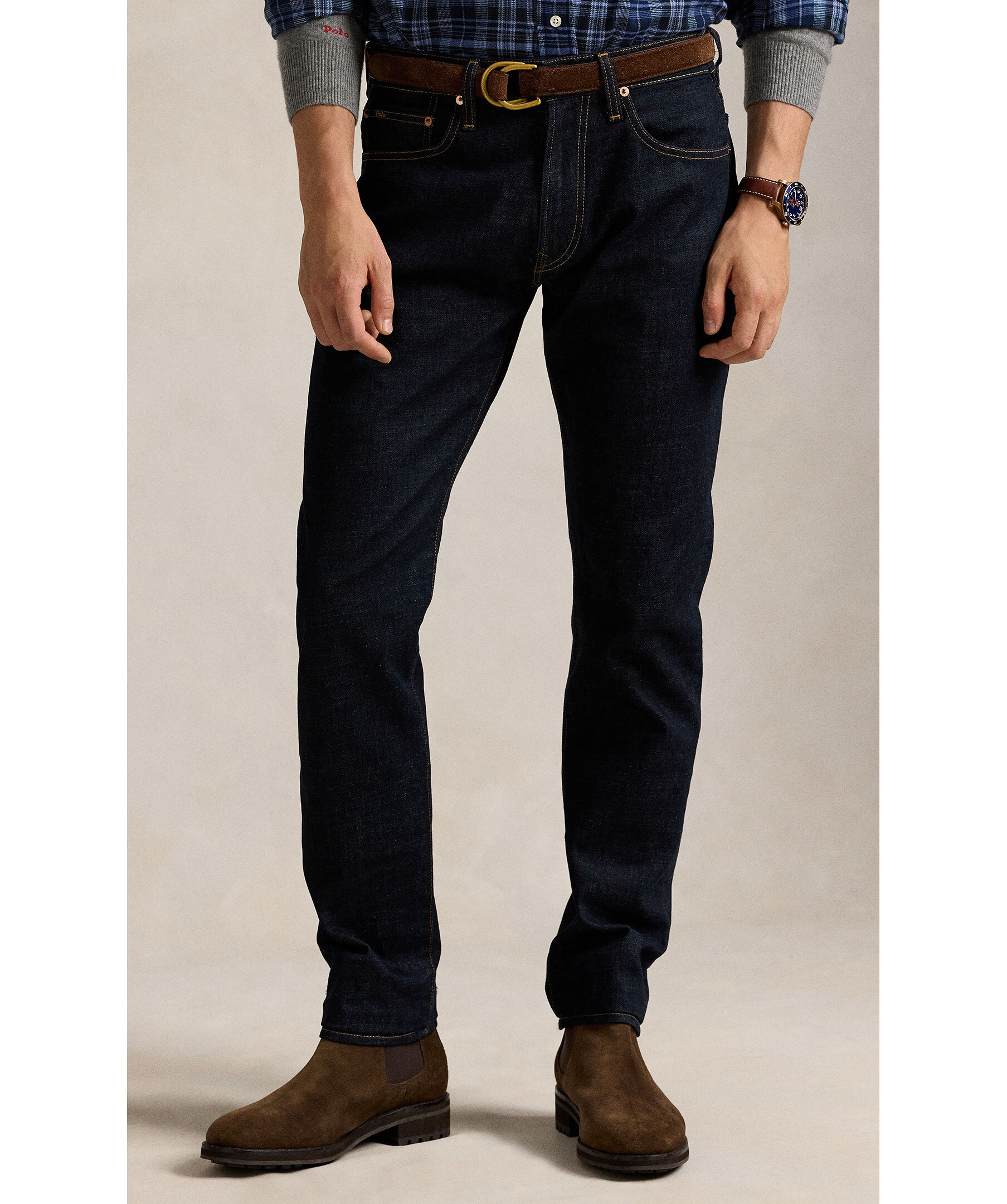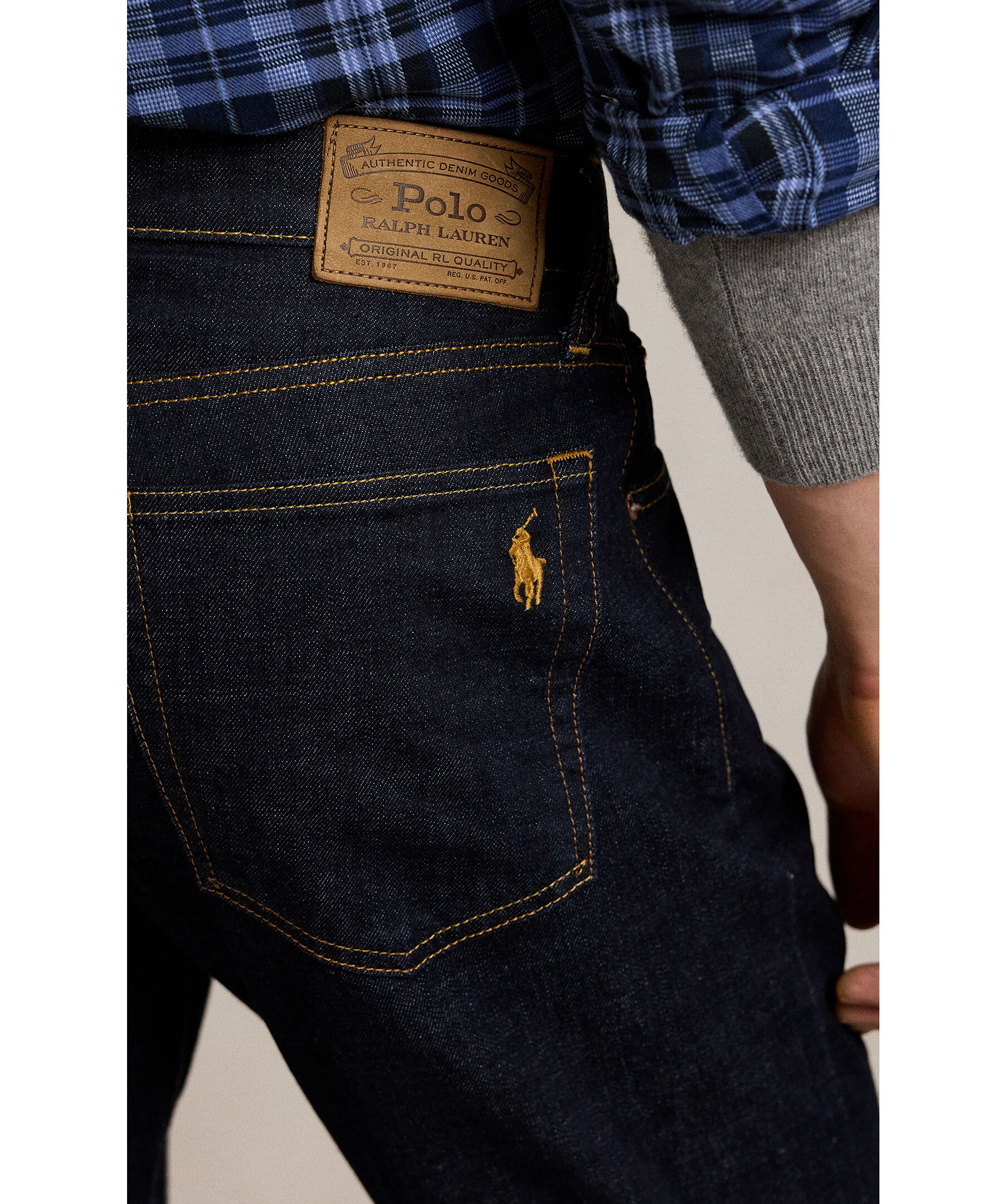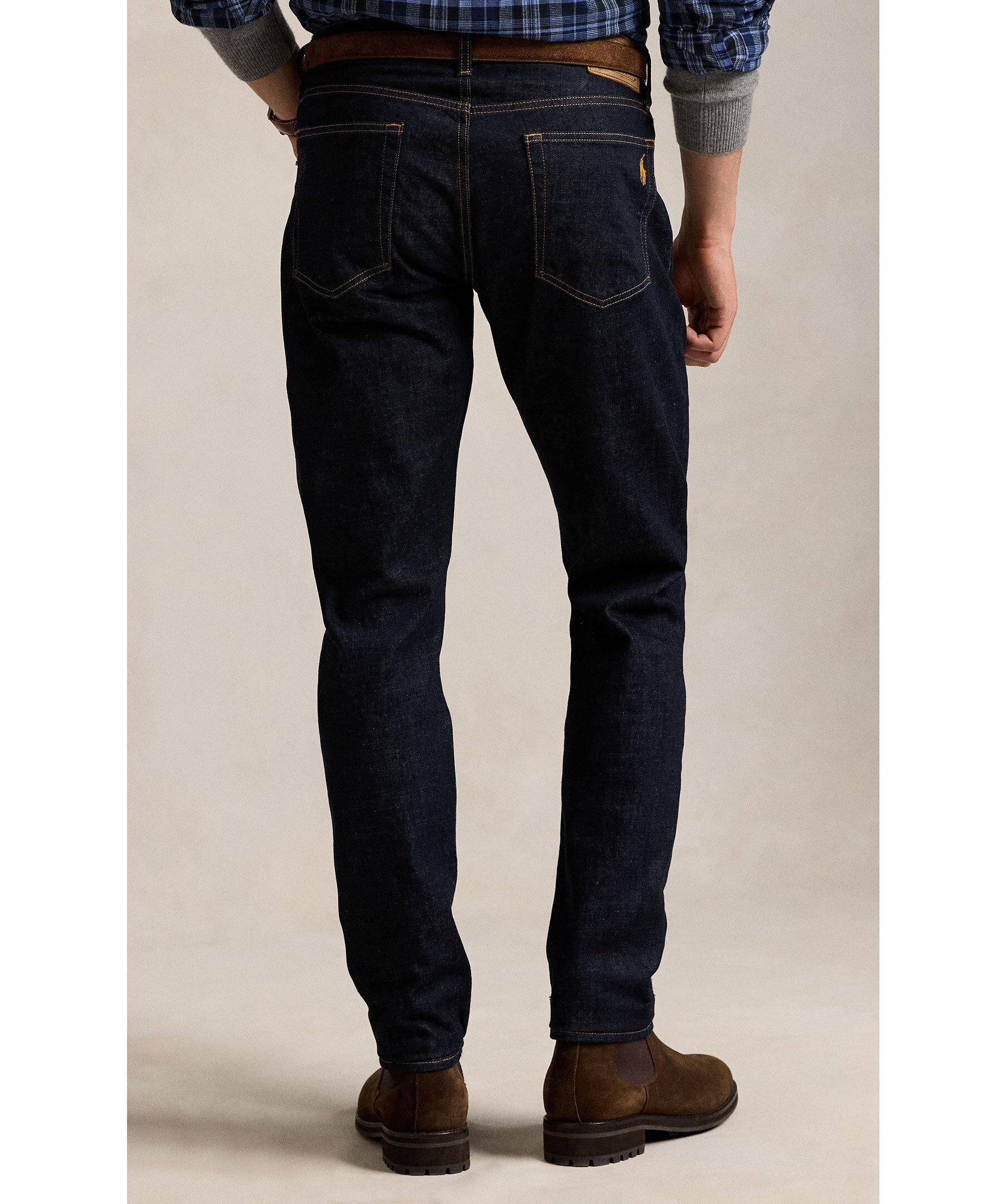 Mörka jeans från Polo Ralph Lauren. Designad för fri rörelse och flexibilitet har Parkside en avsmalnande benpassform med en avslappnad känsla i midjan och låren. Denna stretchmodell är framställd med handslipning och konstnärlig slitageeffekt för en autentisk vintage-look. Modellen är 185cm lång och har på sig strl 32"32.