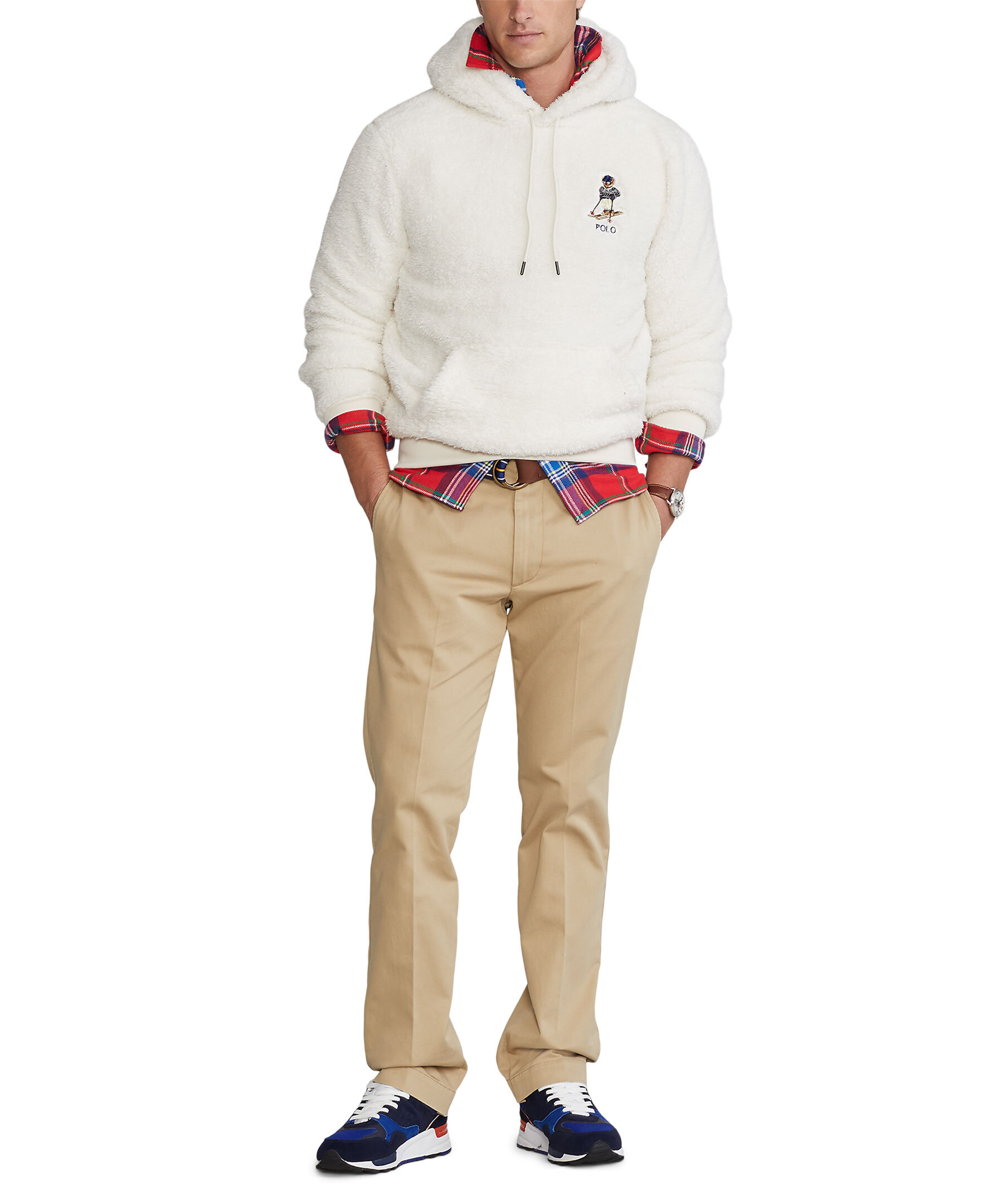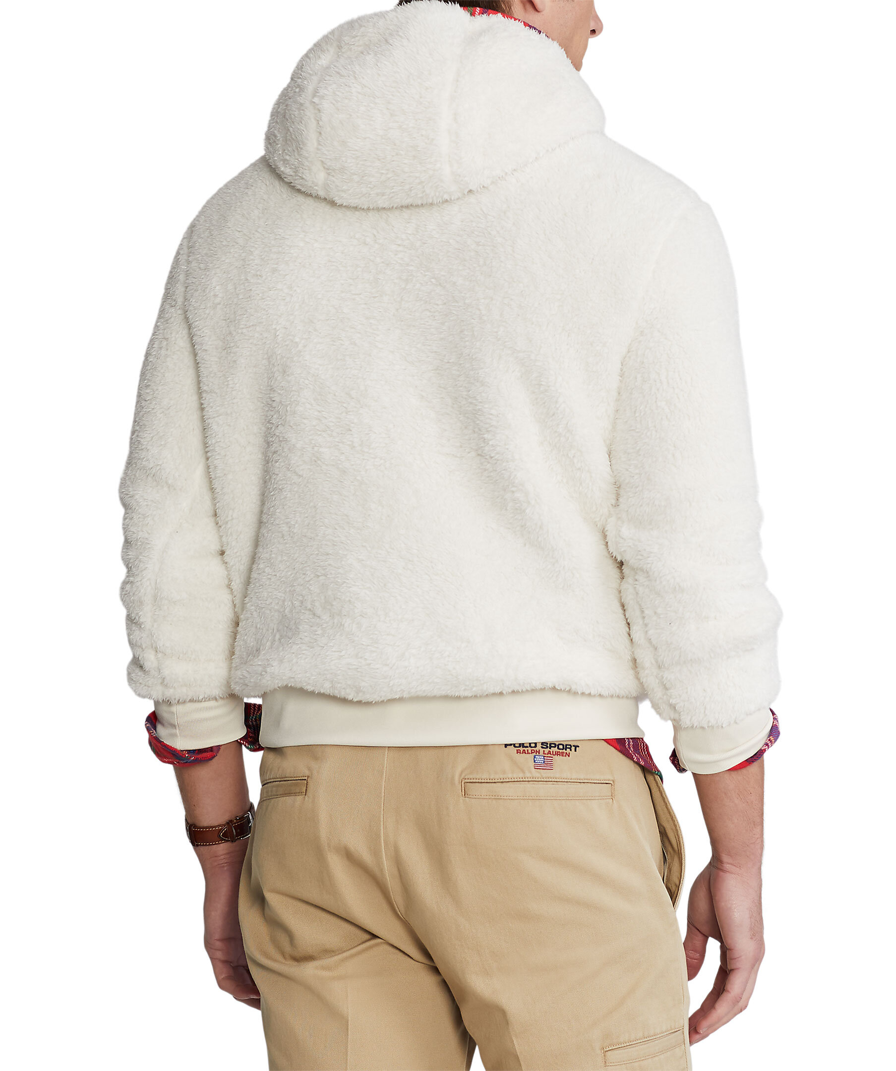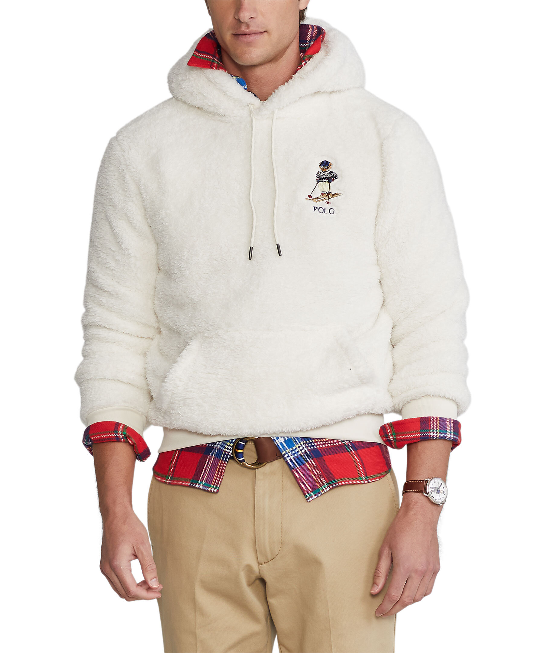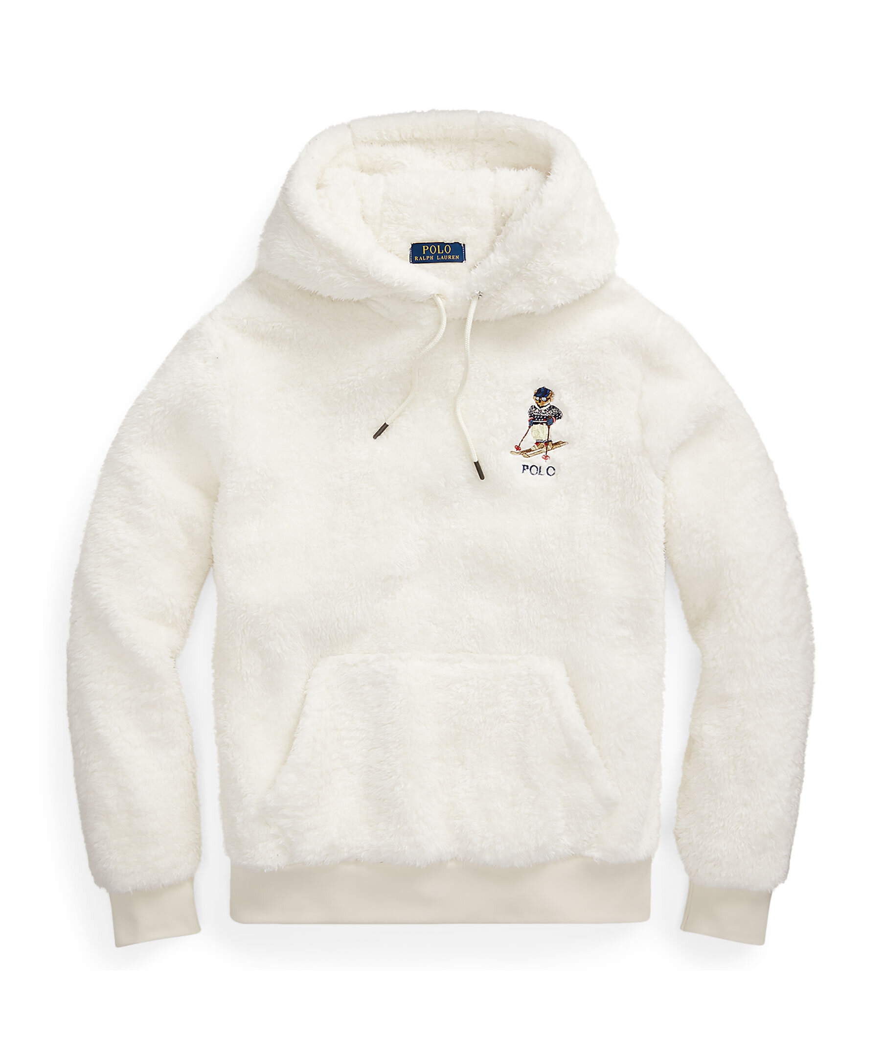Krämvit fleece i hoodie modell från Polo Ralph Lauren. Broderad Polo Bear logotyp på vänster bröst. Känguficka på magen. Luva med dragsko. Ribbstickade muddar.