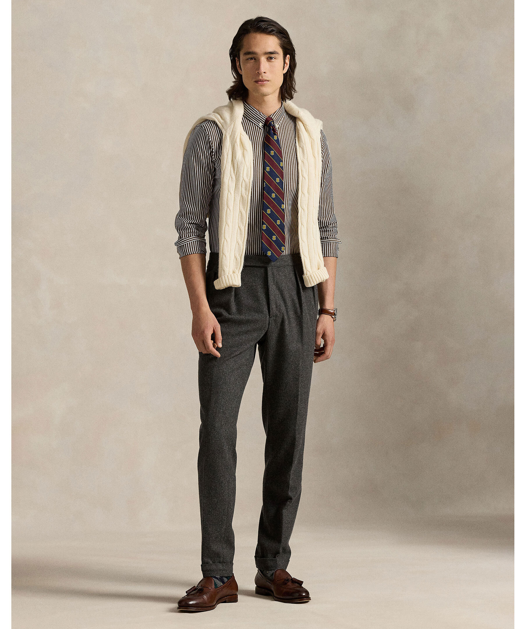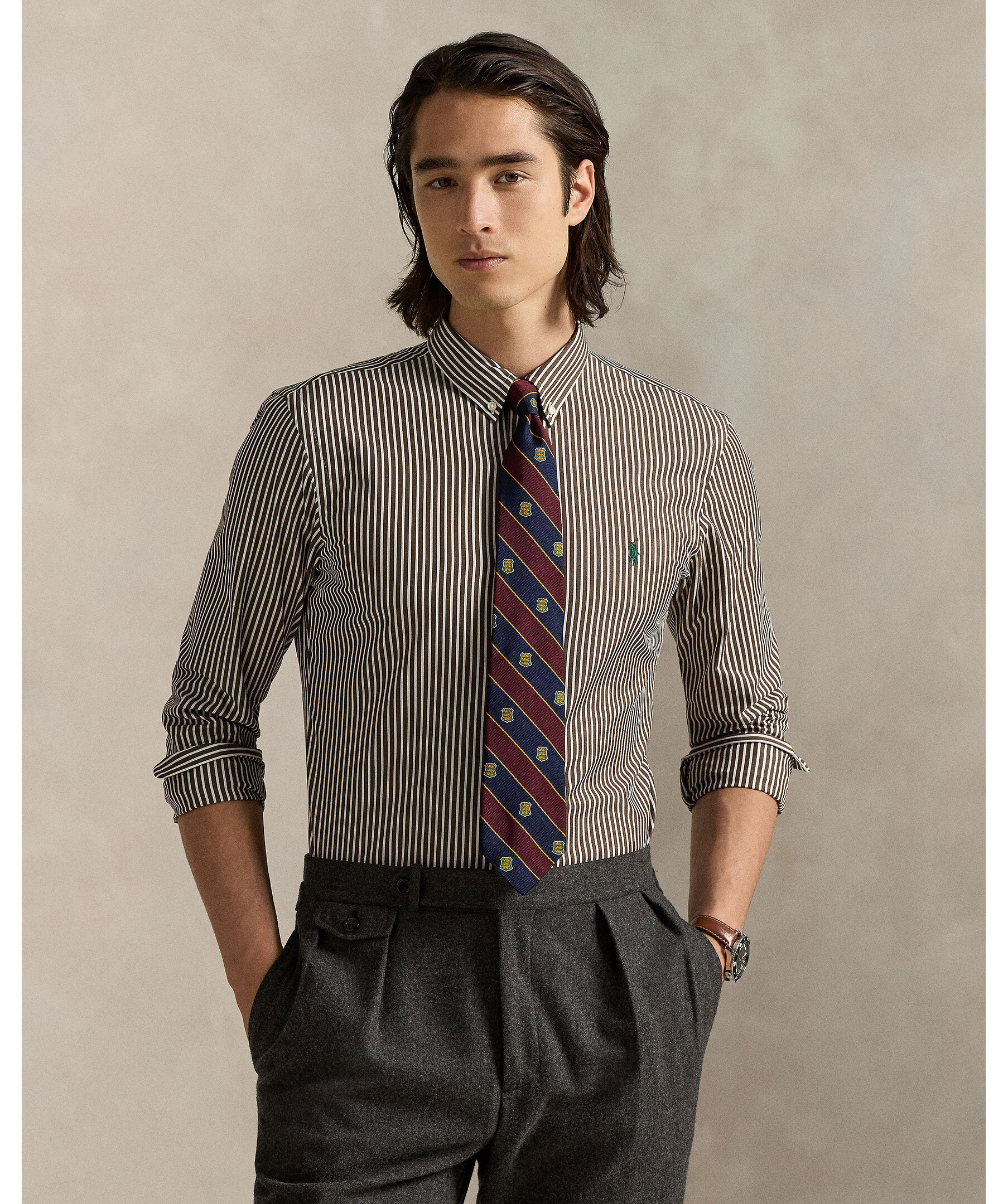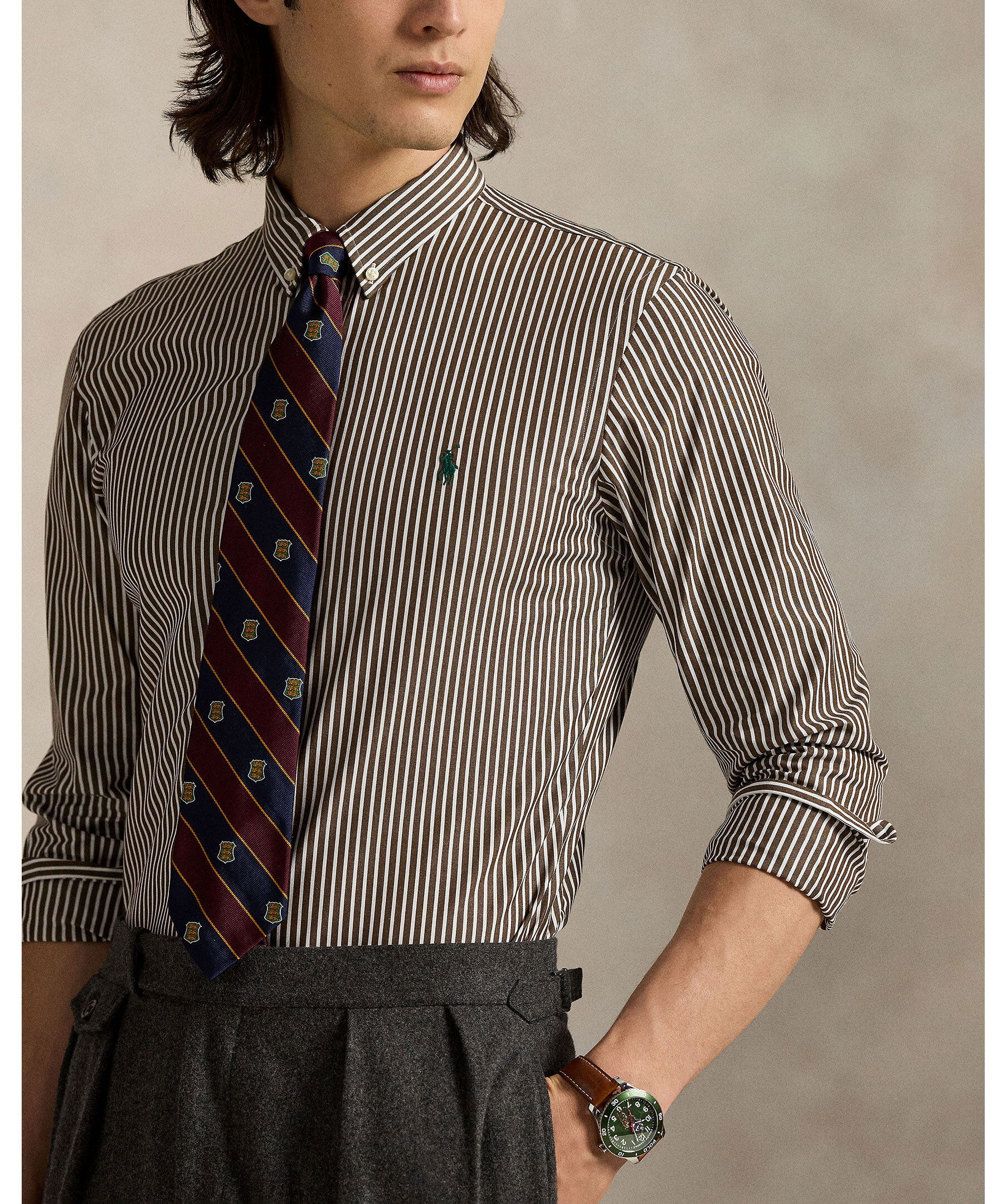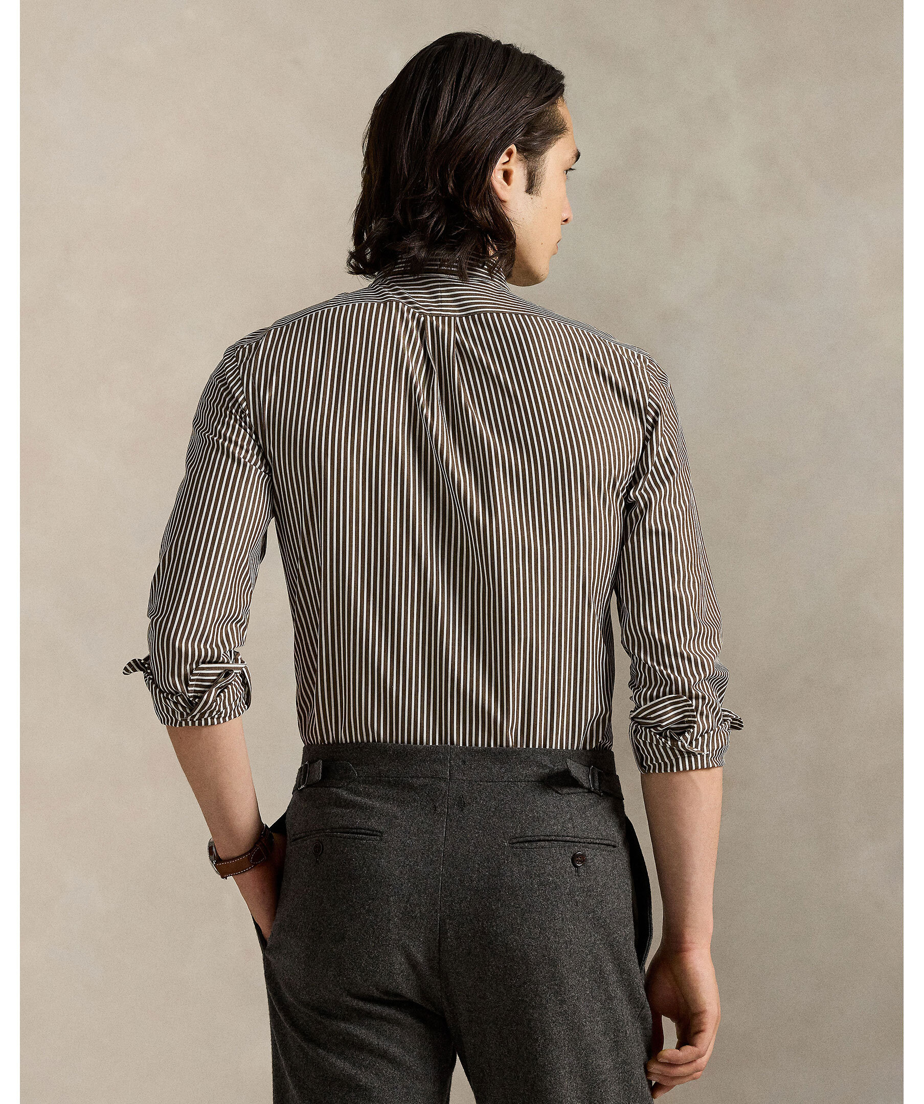 Randig skjorta i brunt och krämvitt från Polo Ralph Lauren. Skjortan är gjord i ett mjukt bomullspoplin med extra stretch för komfort och rörelsefrihet. Custom Fit, skräddad siluett, button-down-krage, hel knäppning och den ikoniska broderade polohästen på bröstet.