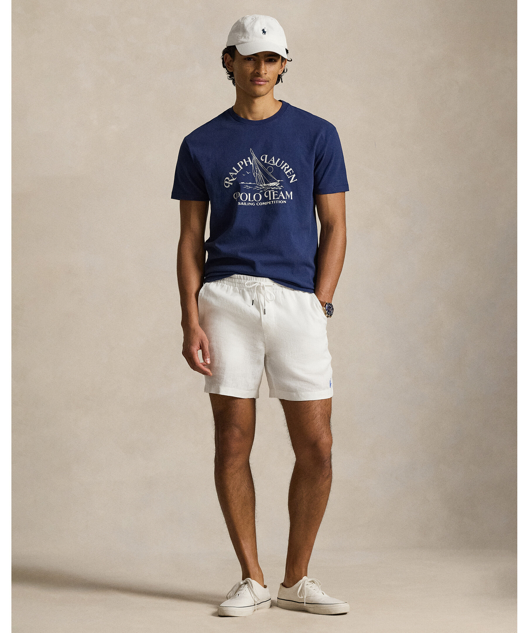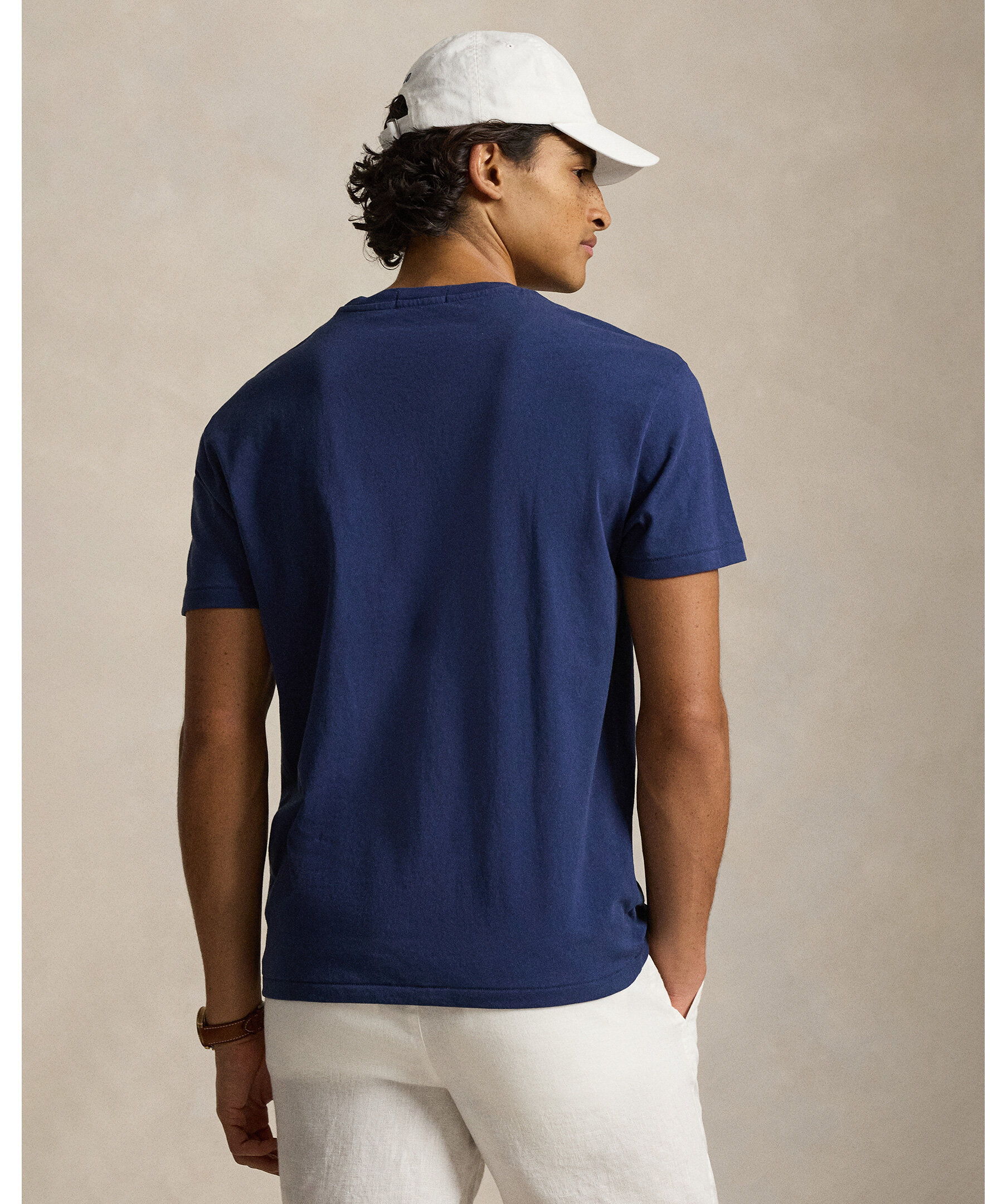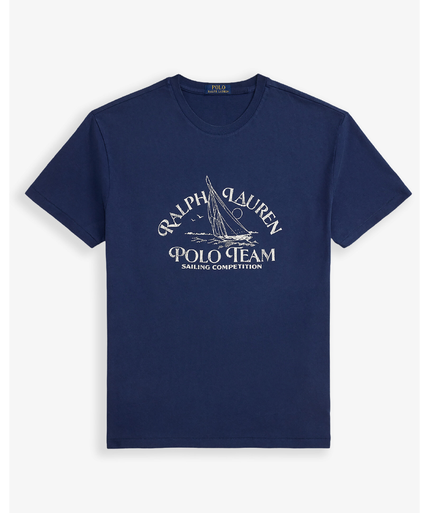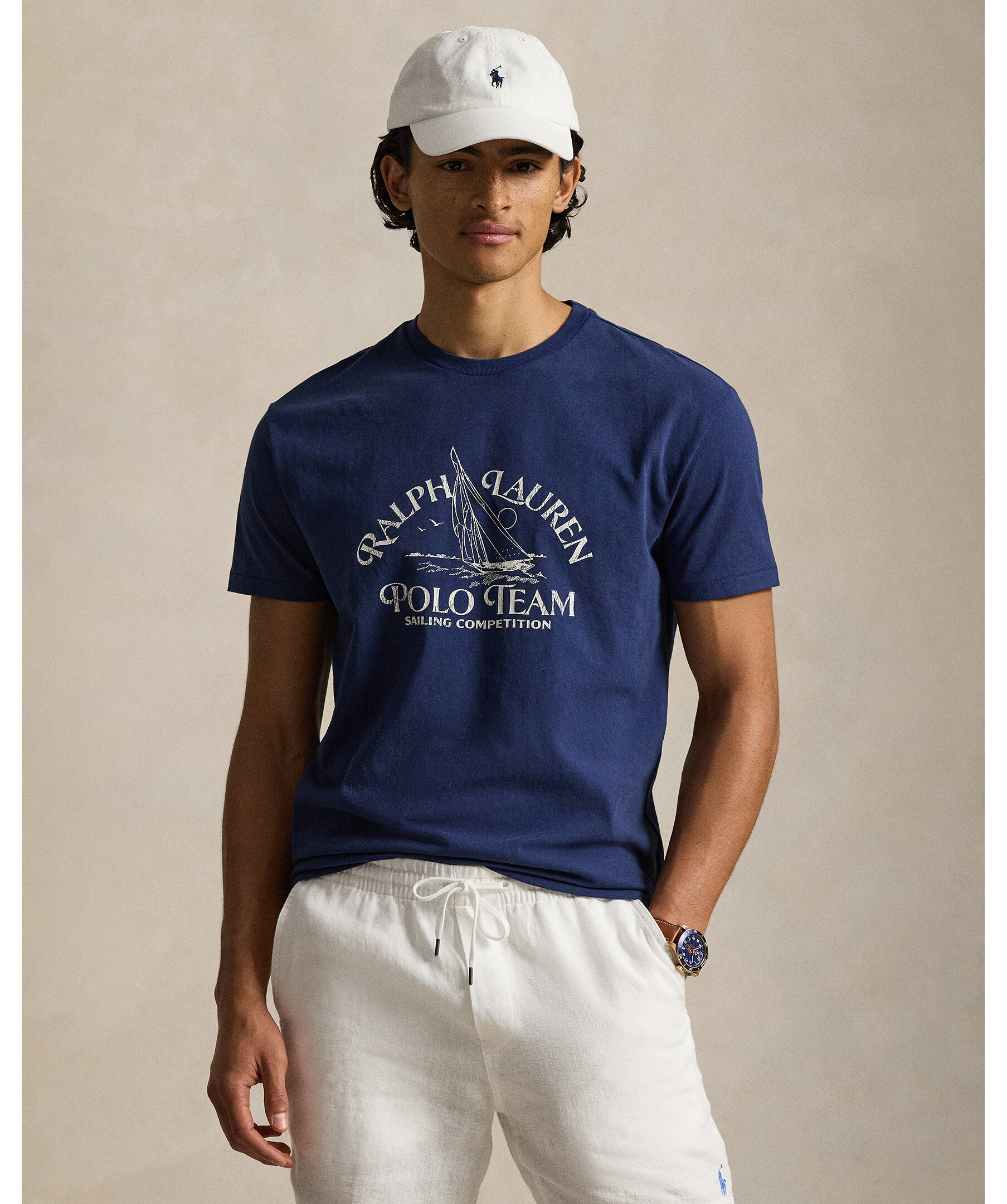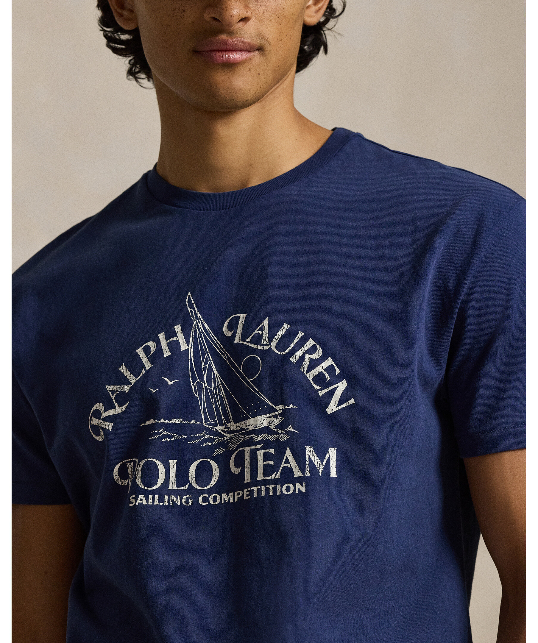 Mörkblå t-shirt från Polo Ralph Lauren. Denna bomulls-T-shirt är en del av säsongens kollektion inspirerad av Karibiens kristallklara vatten och livfulla solnedgångar. Den har en segelgrafik framtill. Den är specialbehandlad för ett solblekt utseende, som om den redan har tillbringat otaliga dagar på havet.
