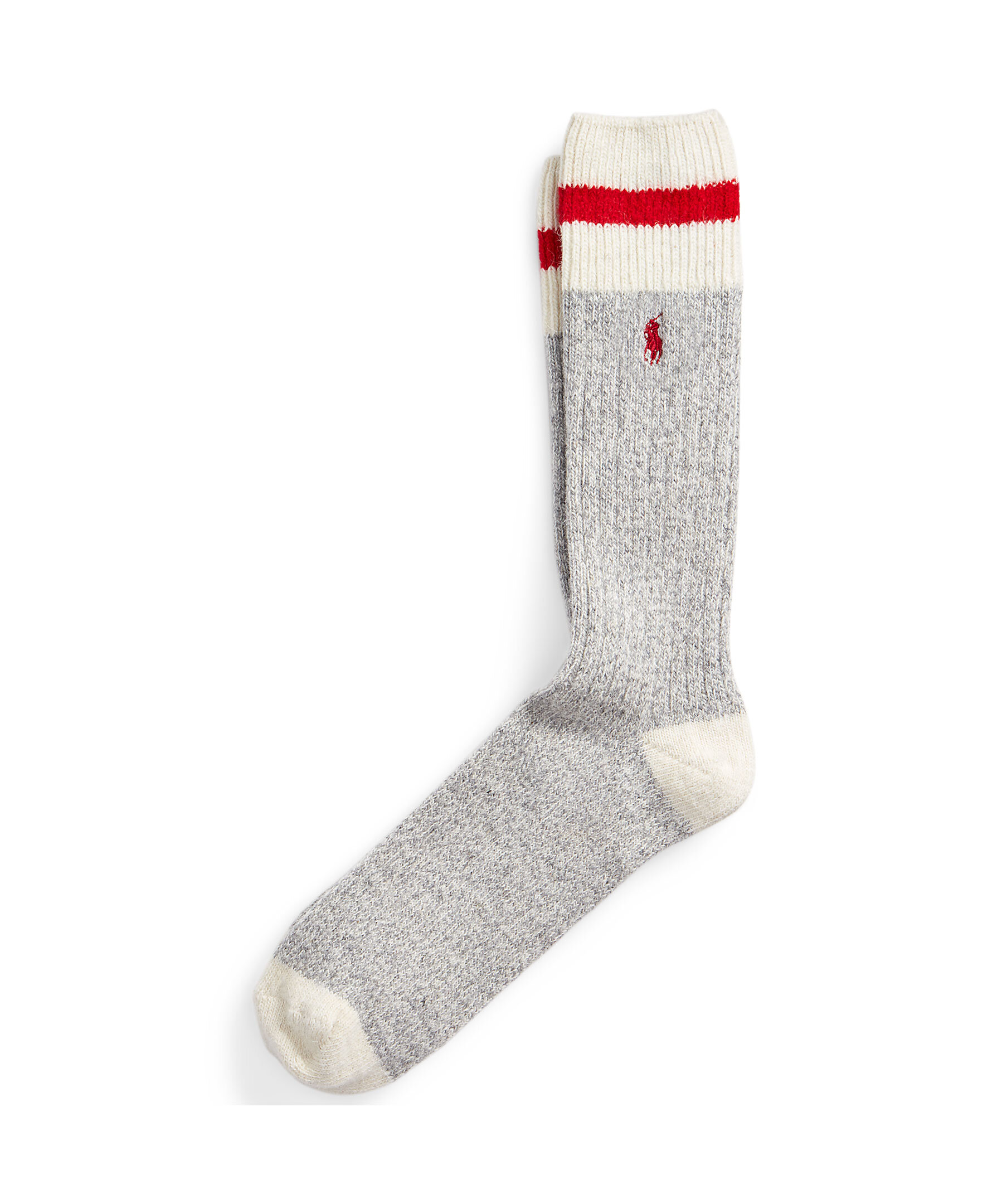 Gråmelerade tjocka raggsockor i ullblandning från Polo Ralph Lauren. Vit och röd randig upp till och röd broderad polohäst.